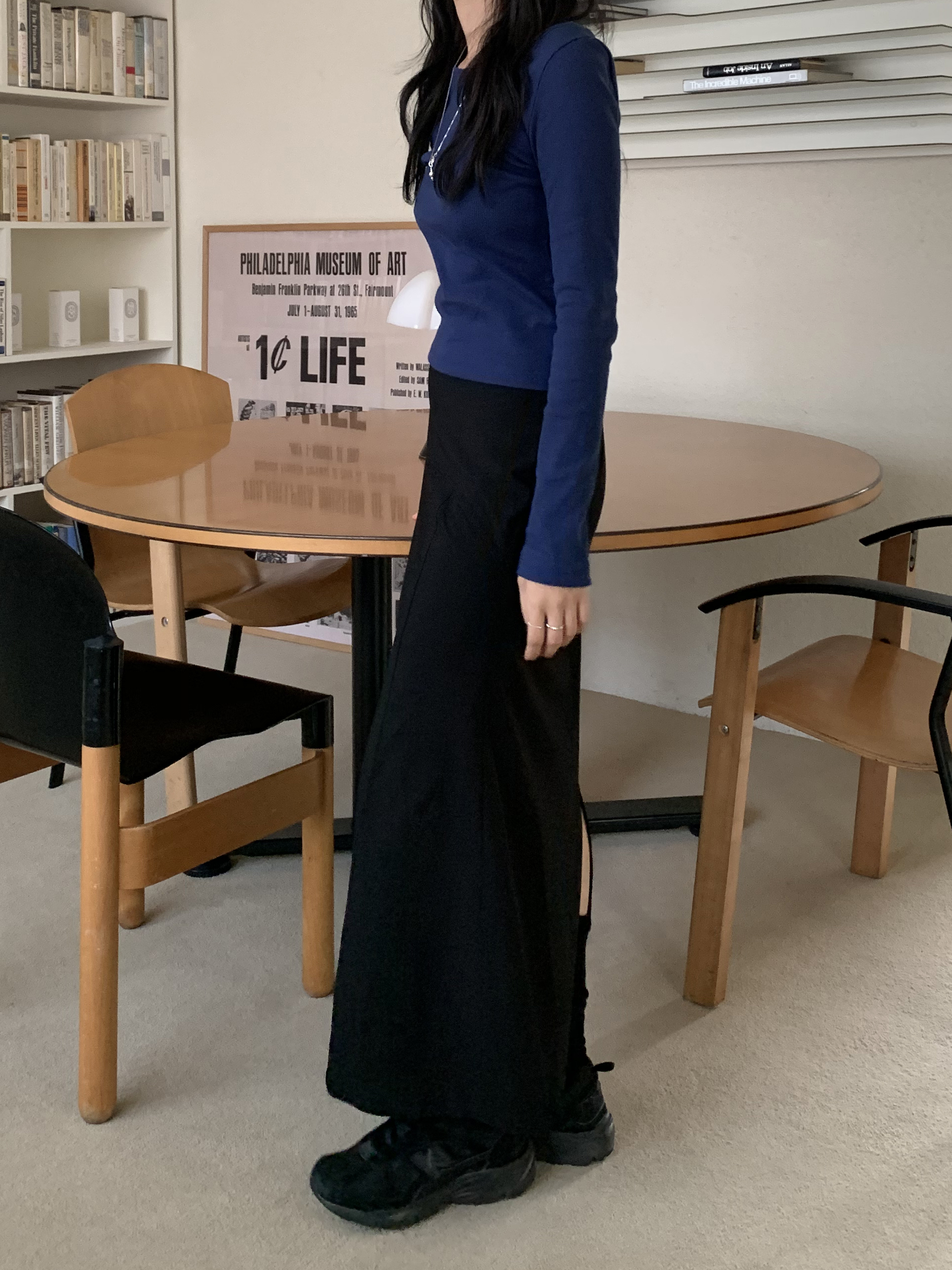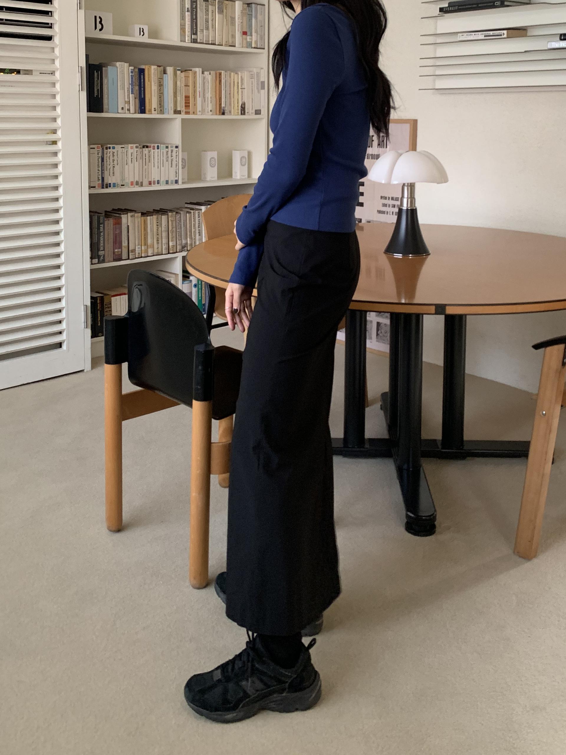 168cm, S 사이즈 기준 발목 아래로 내려오는 맥시한 기장이에요. 트임이 길게 잡혀있어서 전혀 불편하지 않고, 원단 자체도 텐션이 있으면서 골반과 힙부분만 슬림하고 아래로 갈수록 퍼지는 라인이라 편하게 착용가능합니다. 이 점도 마음에 들었던 포인트 !