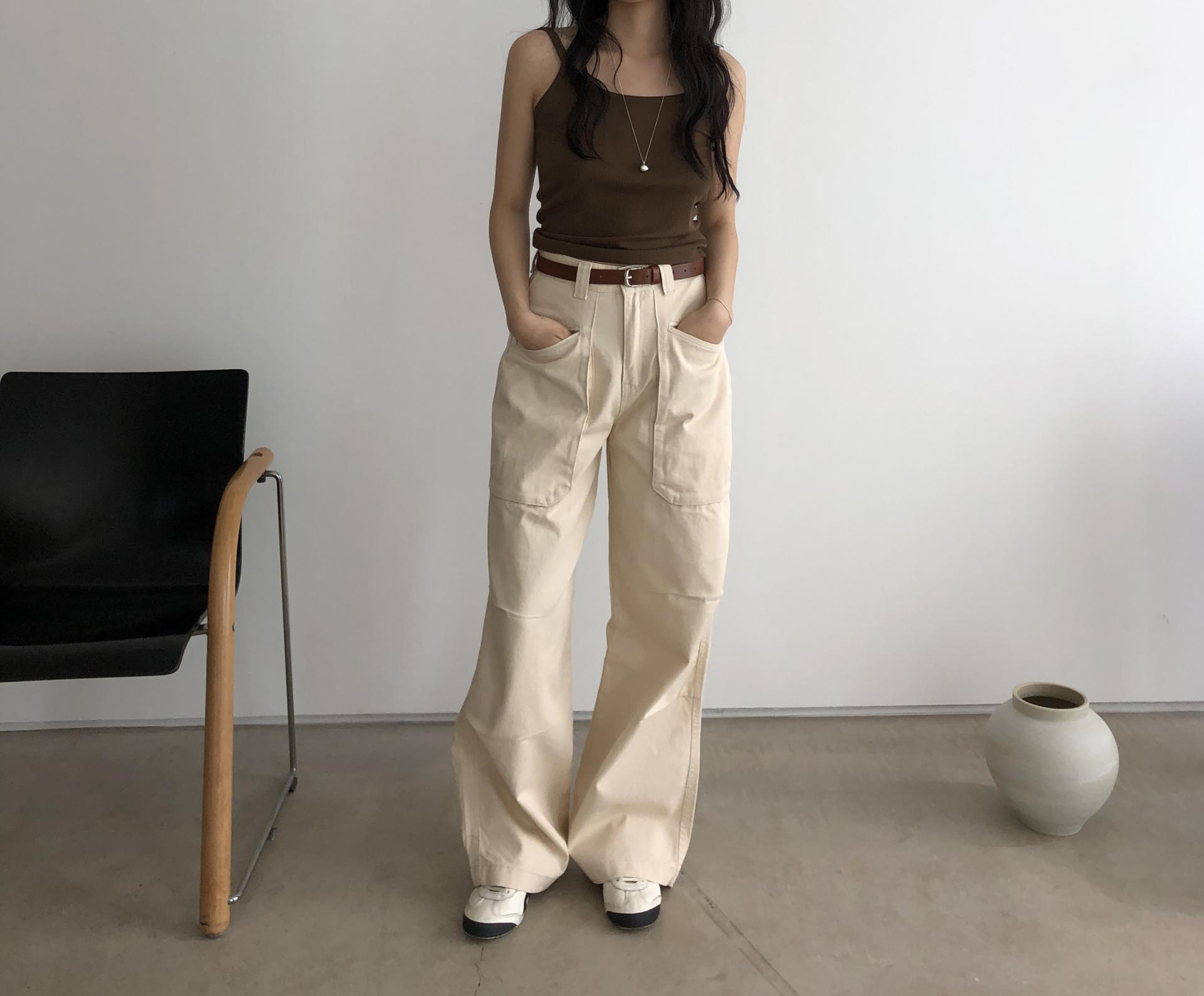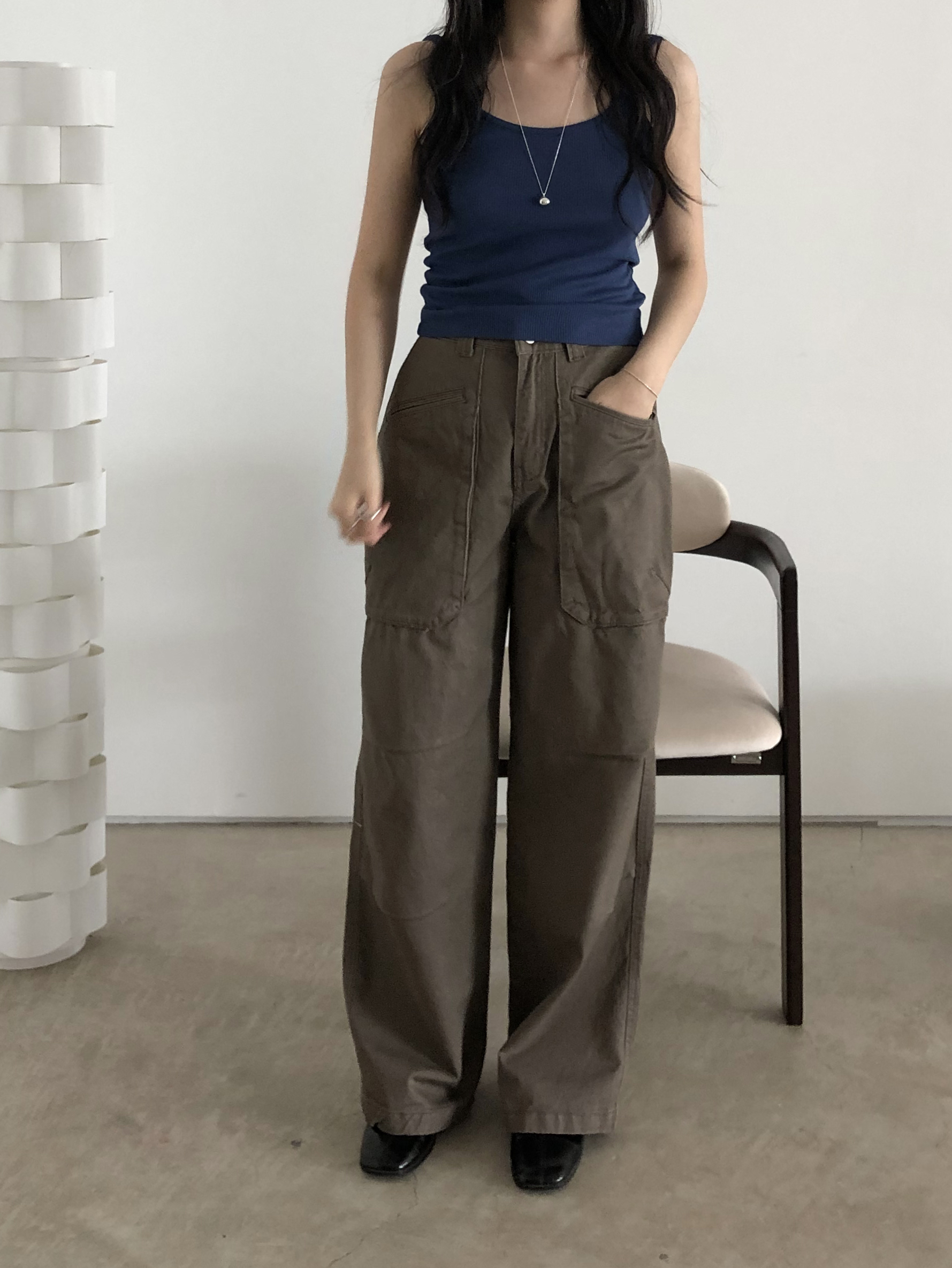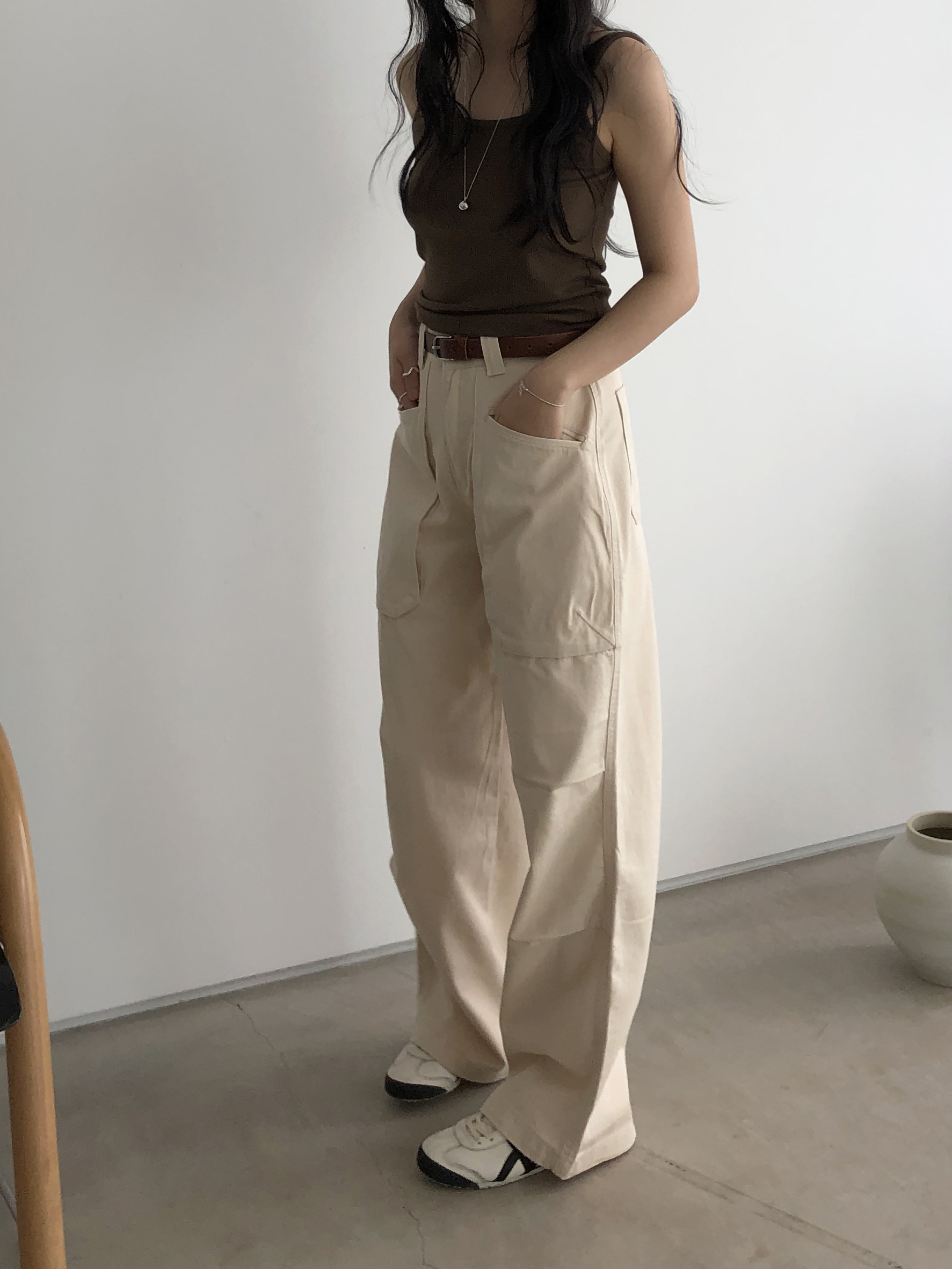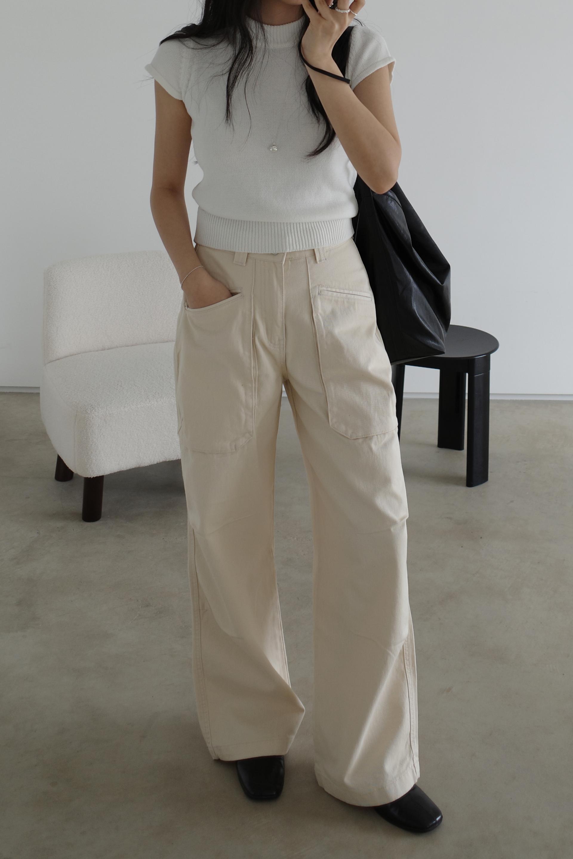 앞쪽에 자리한 입체포켓, 무릎 핀턱 디테일. 말모 말모 .. 빈티지하면서도 트렌디한 무드가 느껴지는 디테일이에요. 팬츠 하나만으로도 굉장히 멋스럽고, 포인트가 되어 상의는 가볍게! 베이직하게 입어주셔도 좋아요. 저는 베이직한 나시에 모카 컬러 행크진 입고 올 여름에 락페 갈 생각에 벌써부터 설레어요ᰔ 어렵지 않게 멋낼 수 있는 아이템이라 정말 추천드리고 싶습니다 .. :)