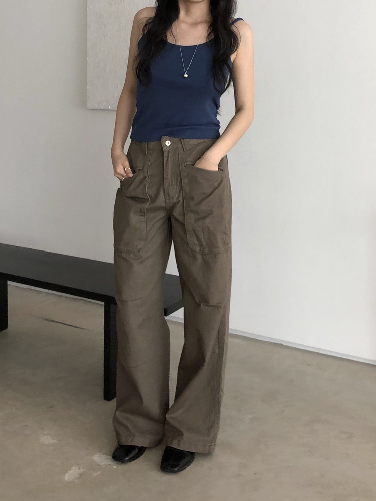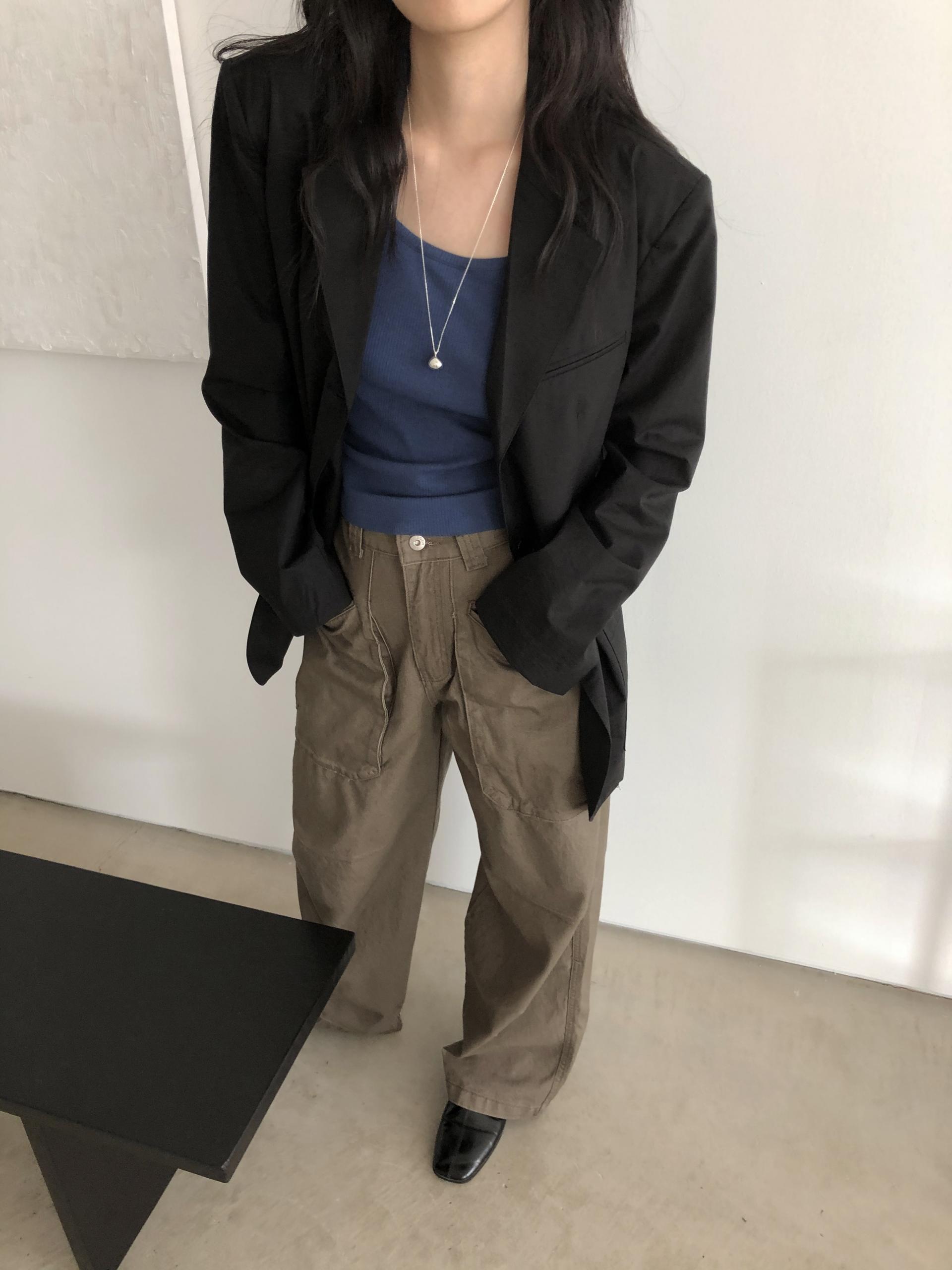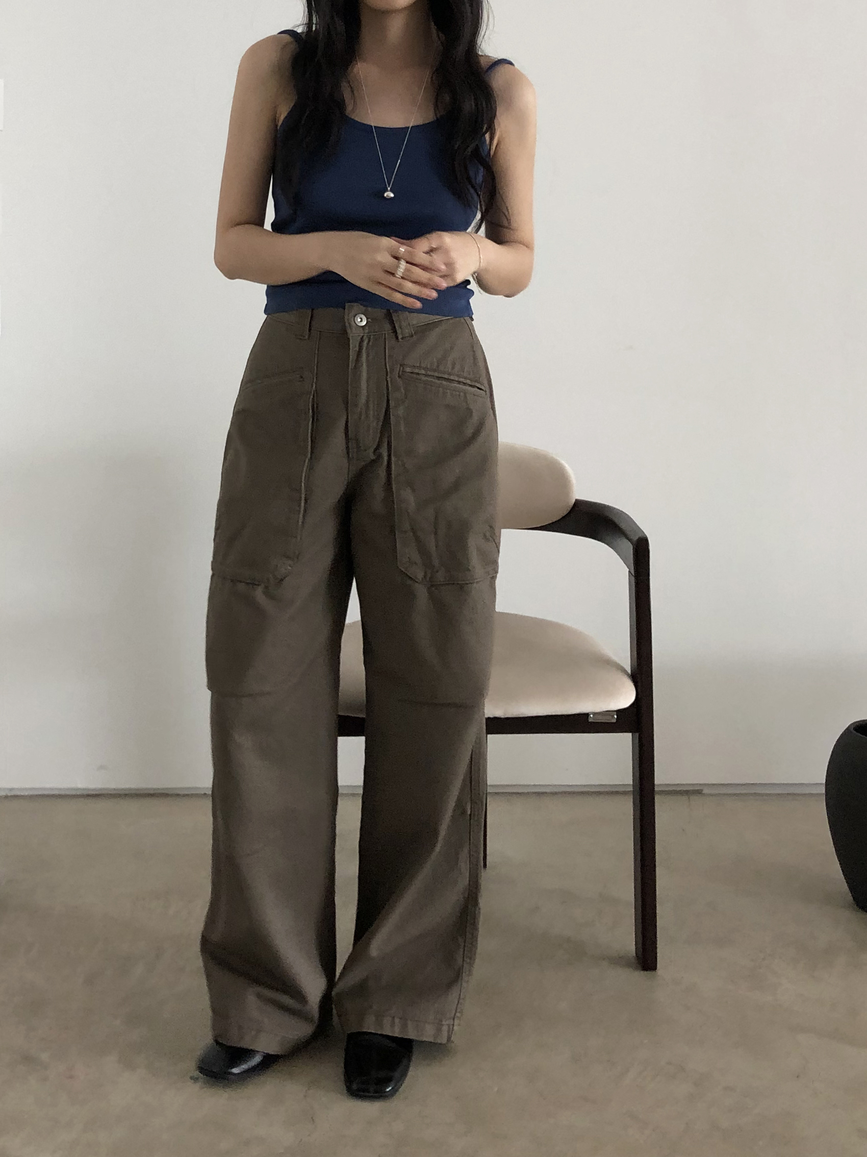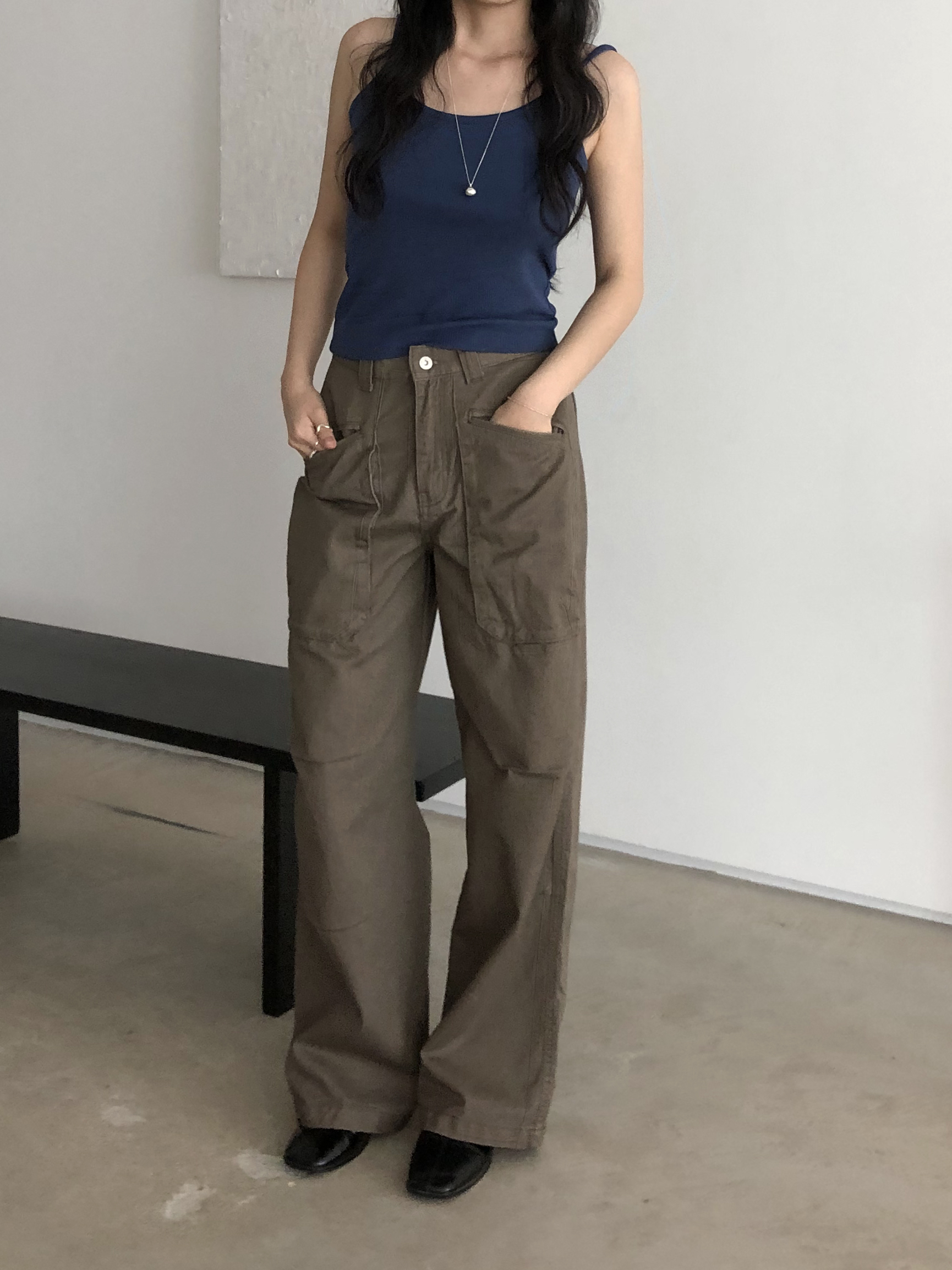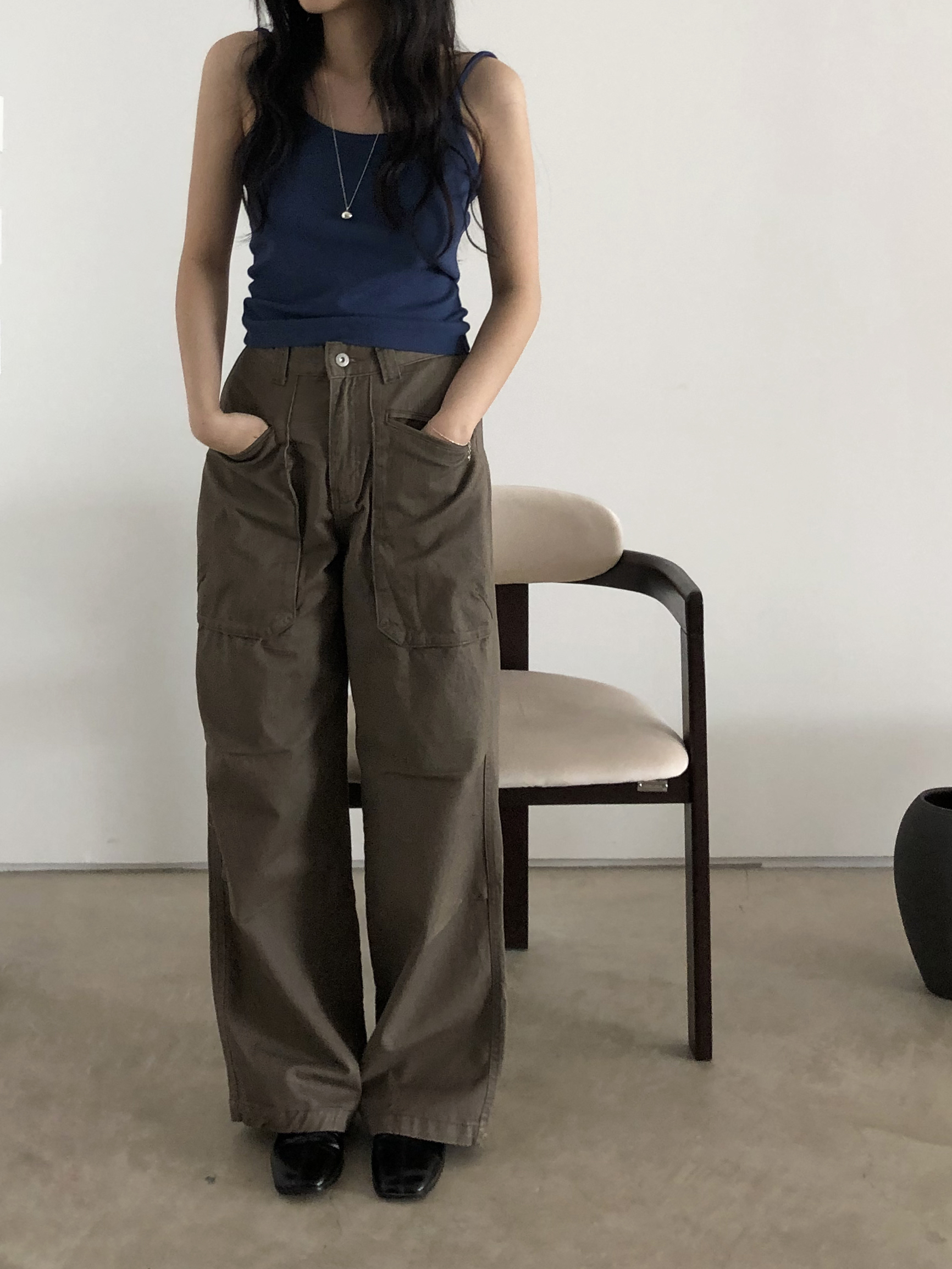 앞쪽에 자리한 입체포켓, 무릎 핀턱 디테일. 말모 말모 .. 빈티지하면서도 트렌디한 무드가 느껴지는 디테일이에요. 팬츠 하나만으로도 굉장히 멋스럽고, 포인트가 되어 상의는 가볍게! 베이직하게 입어주셔도 좋아요. 저는 베이직한 나시에 모카 컬러 행크진 입고 올 여름에 락페 갈 생각에 벌써부터 설레어요ᰔ 어렵지 않게 멋낼 수 있는 아이템이라 정말 추천드리고 싶습니다 .. :)