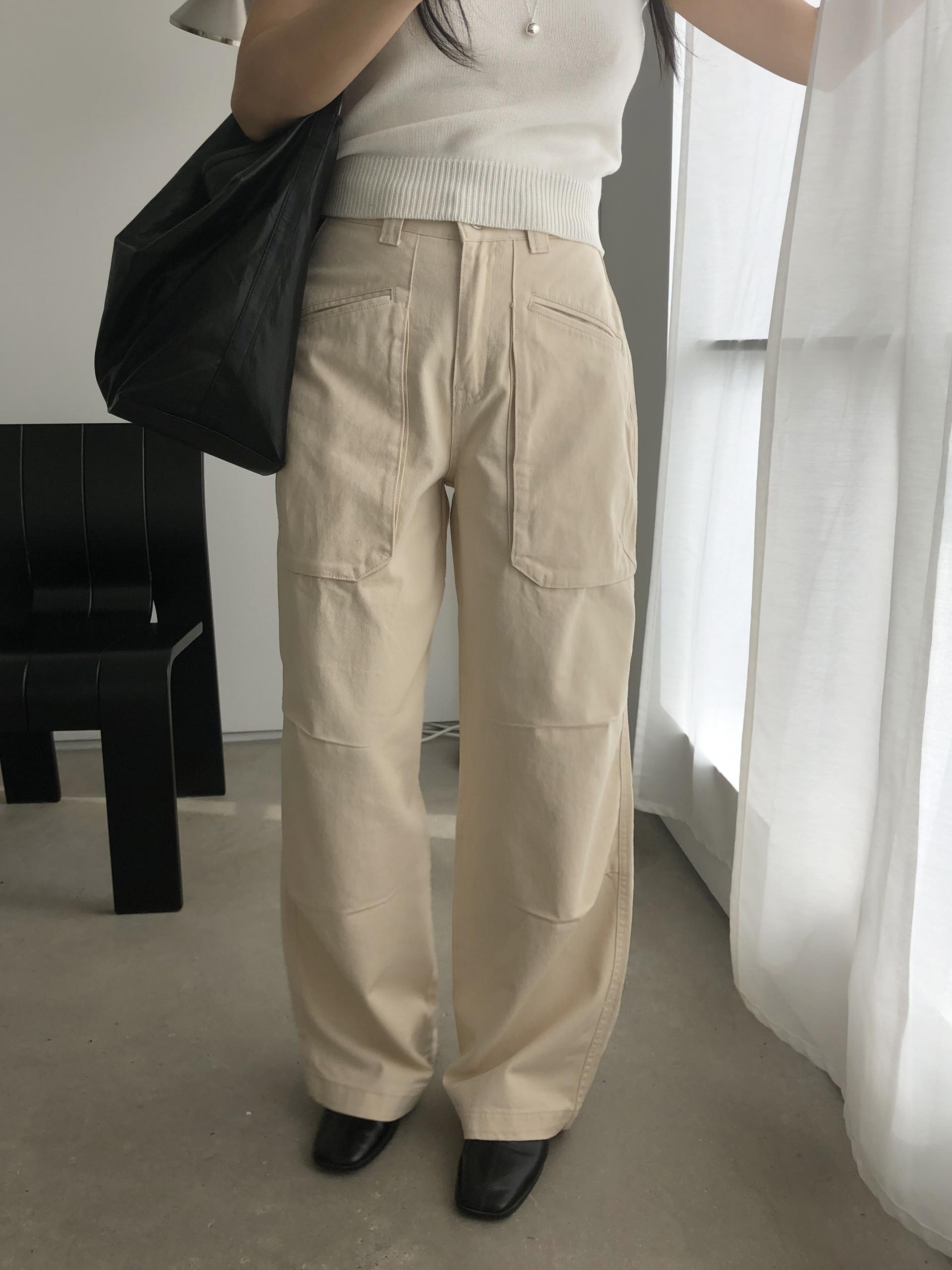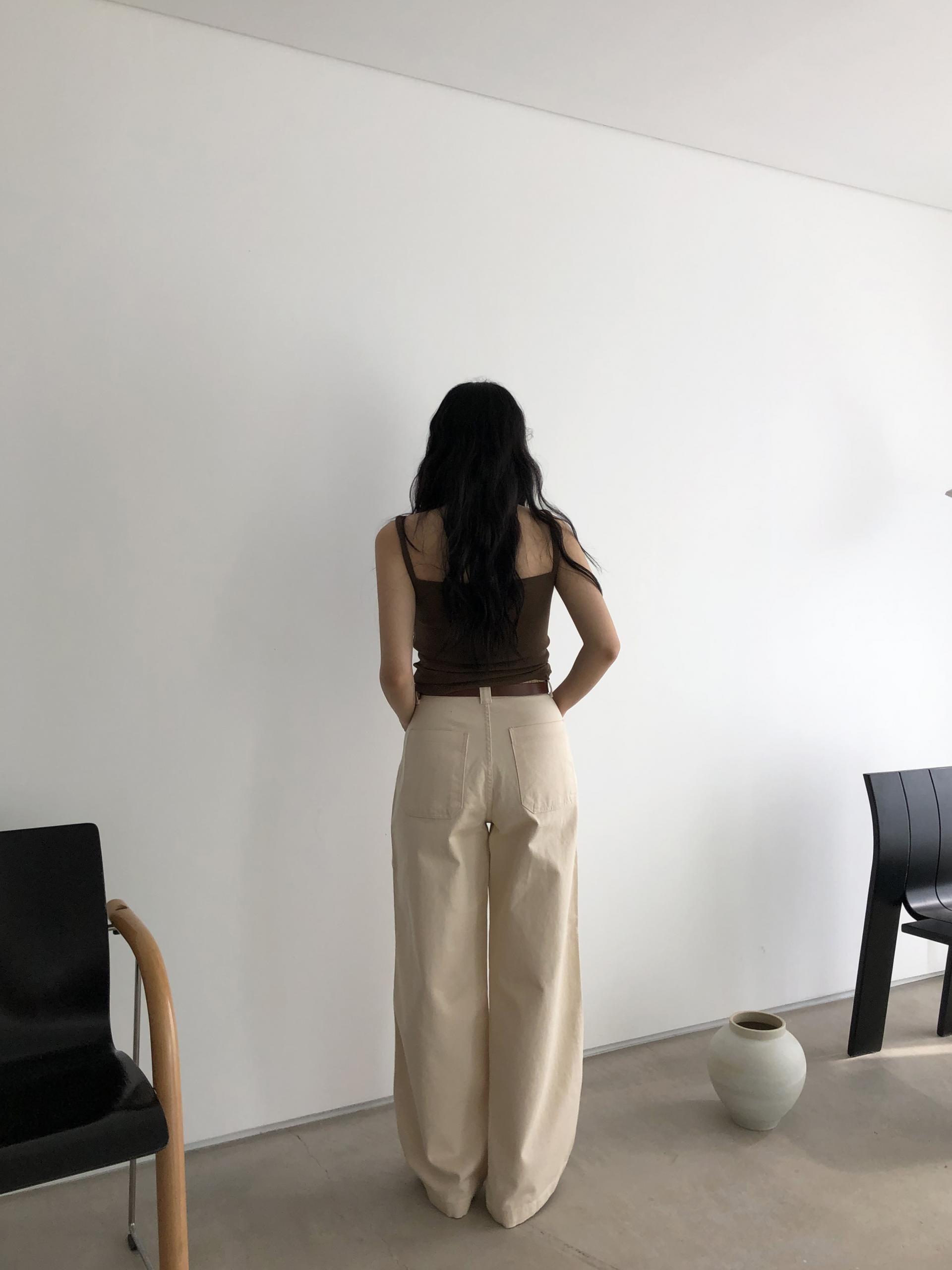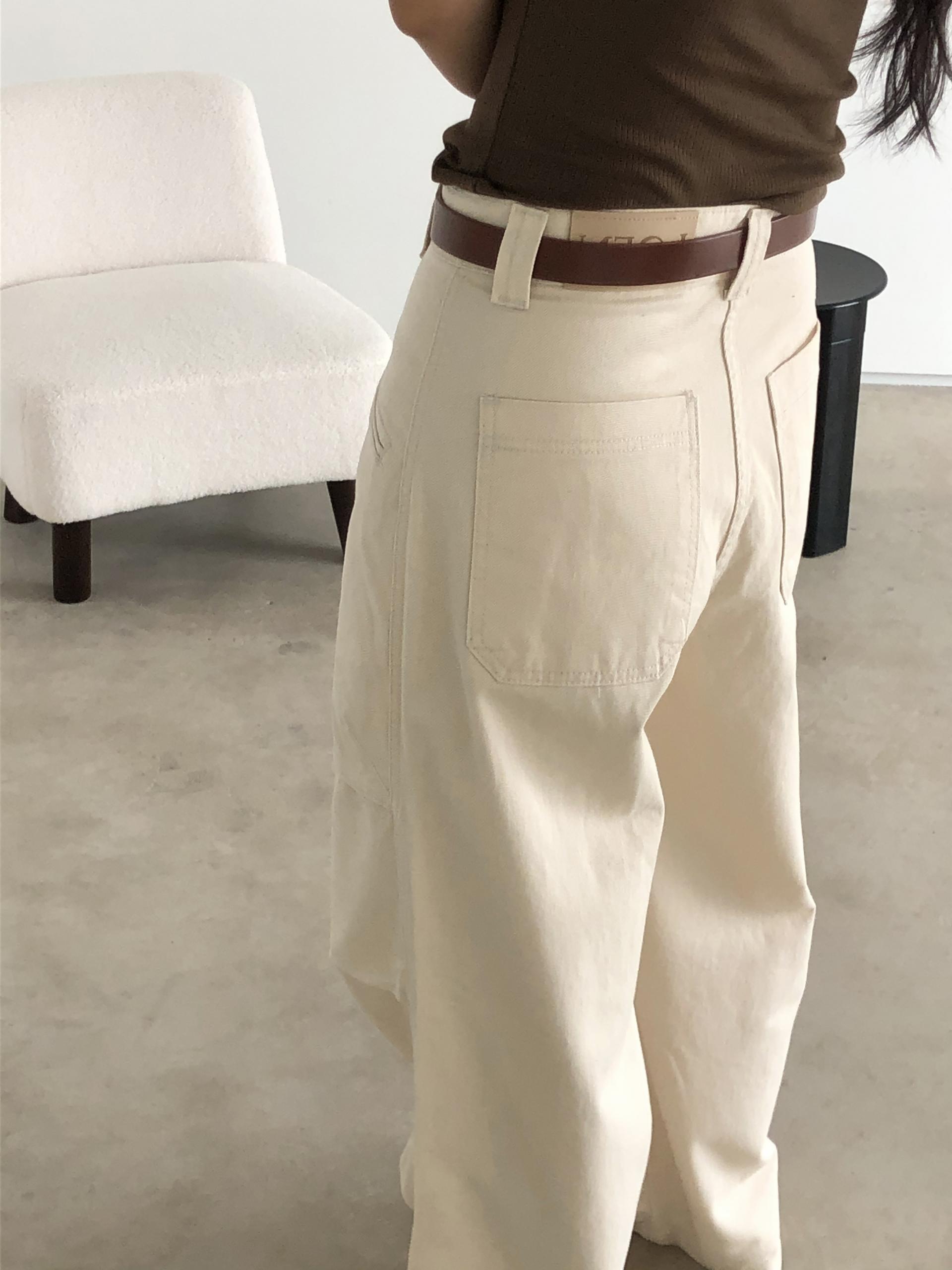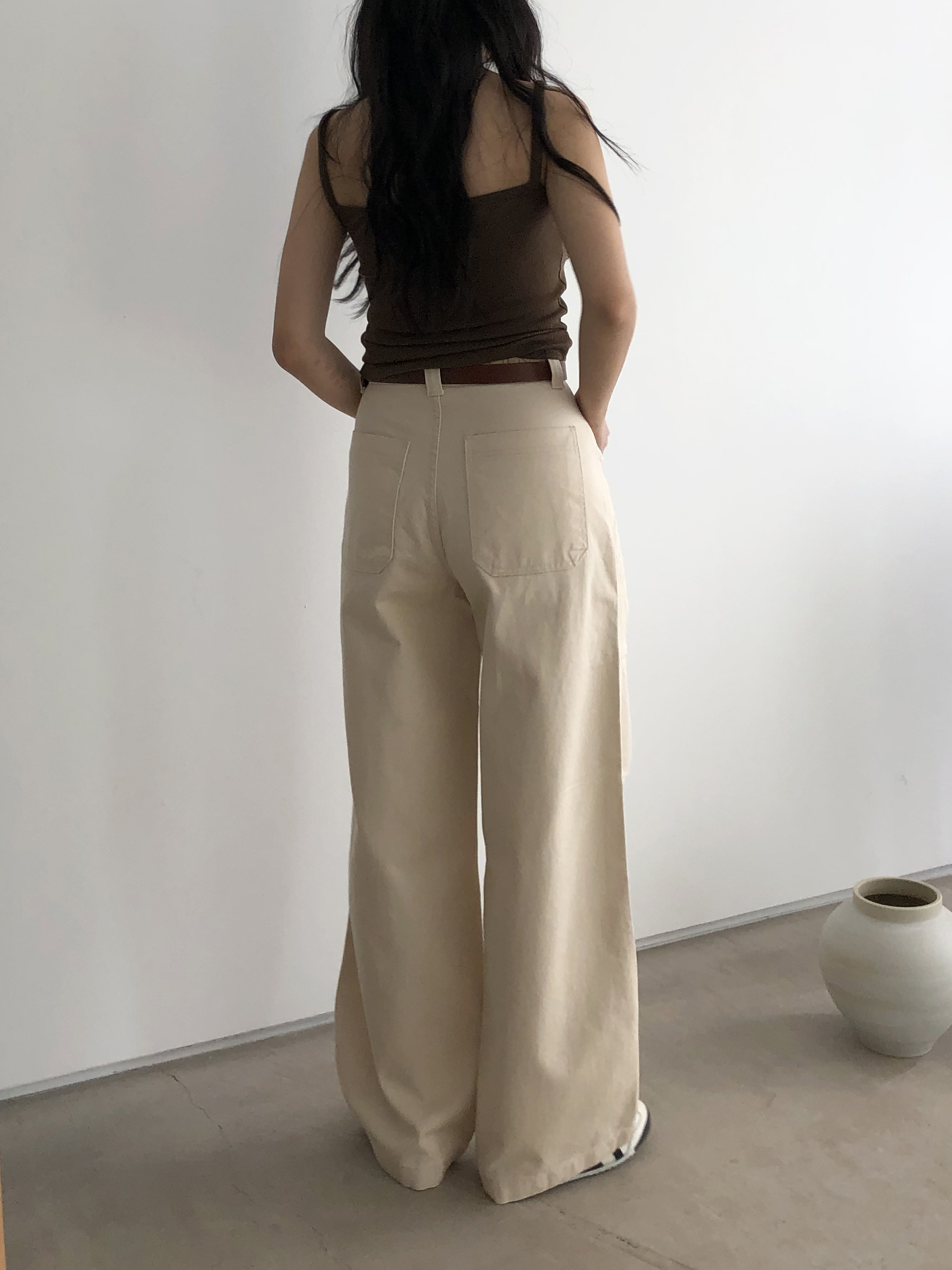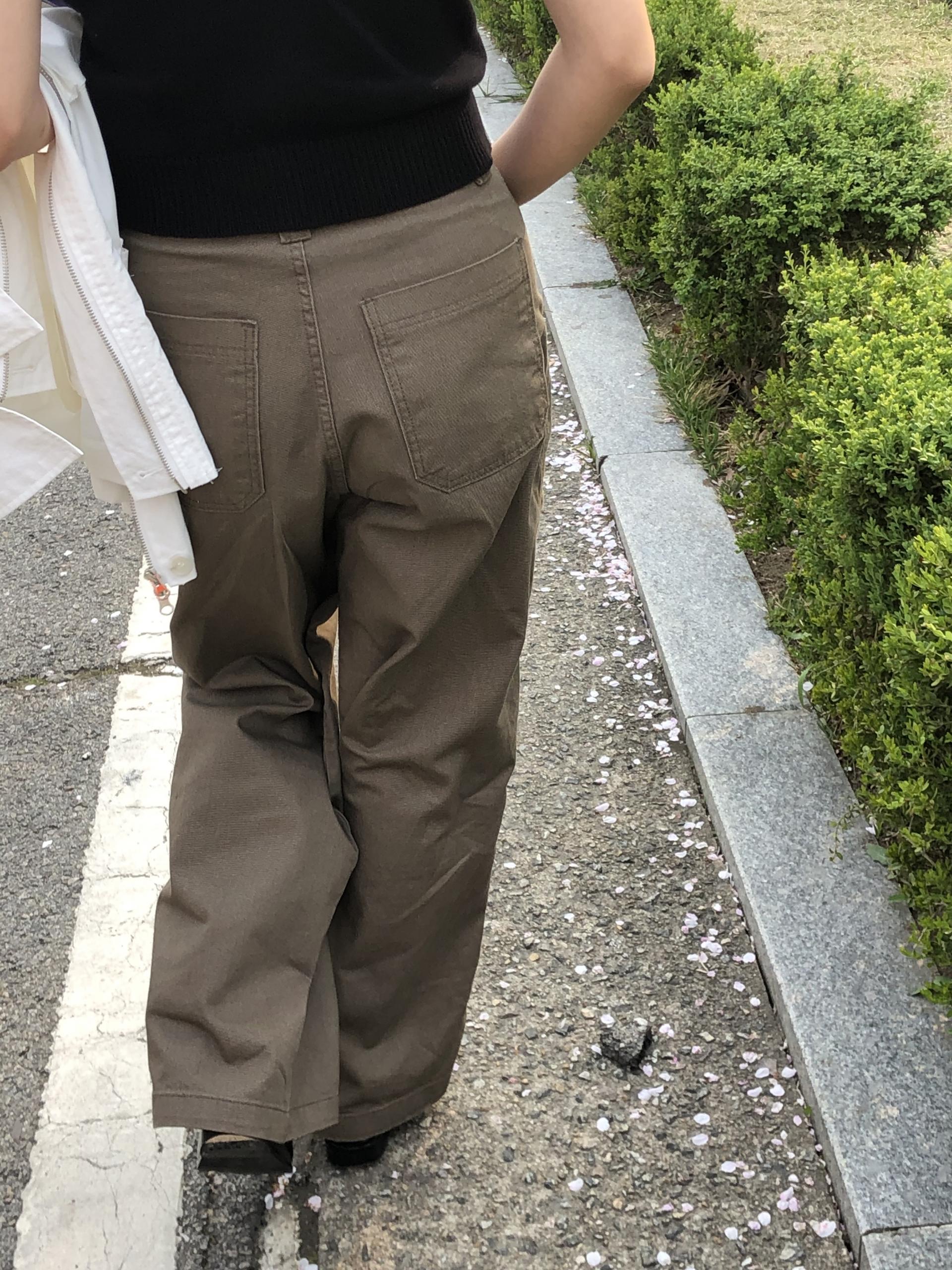 하이웨이스트로 착용되는 팬츠예요. 허리와 골반 깔끔하게 잡아주면서 와이드하게 일자로 떨어지는 핏입니다. 핏은 사진으로 설명이 될 것 같아요! 근래 가장 마음에 드는 핏입니다 :) 그리고 뒷 포켓 ! 꼭 설명드려야 할 부분이에요. 포켓이 큼지막하고 아래부분이 각져있는데, 오묘하게 힙이 업 되어 보이고, 포켓 크기가 커서인지 상대적으로 허리가 잘록해보이더라구요. 앞모습 만큼이나 뒷모습이 예쁜 팬츠입니다. (유독 이 거래처 팬츠는 뒷모습이 정말 ! 만족스러워요.)