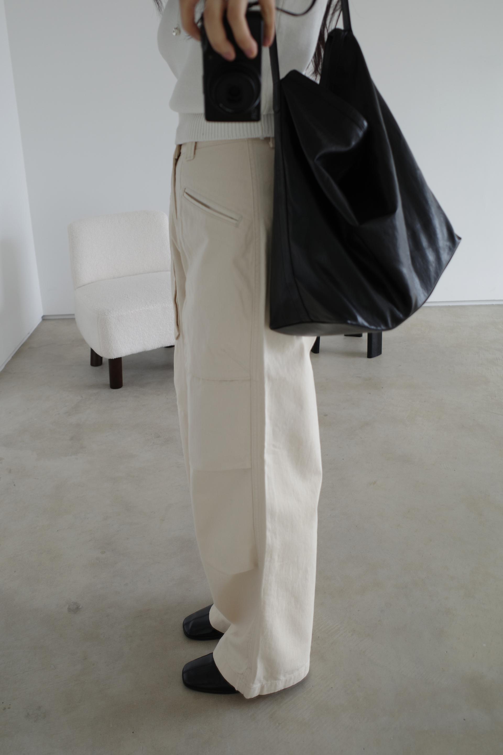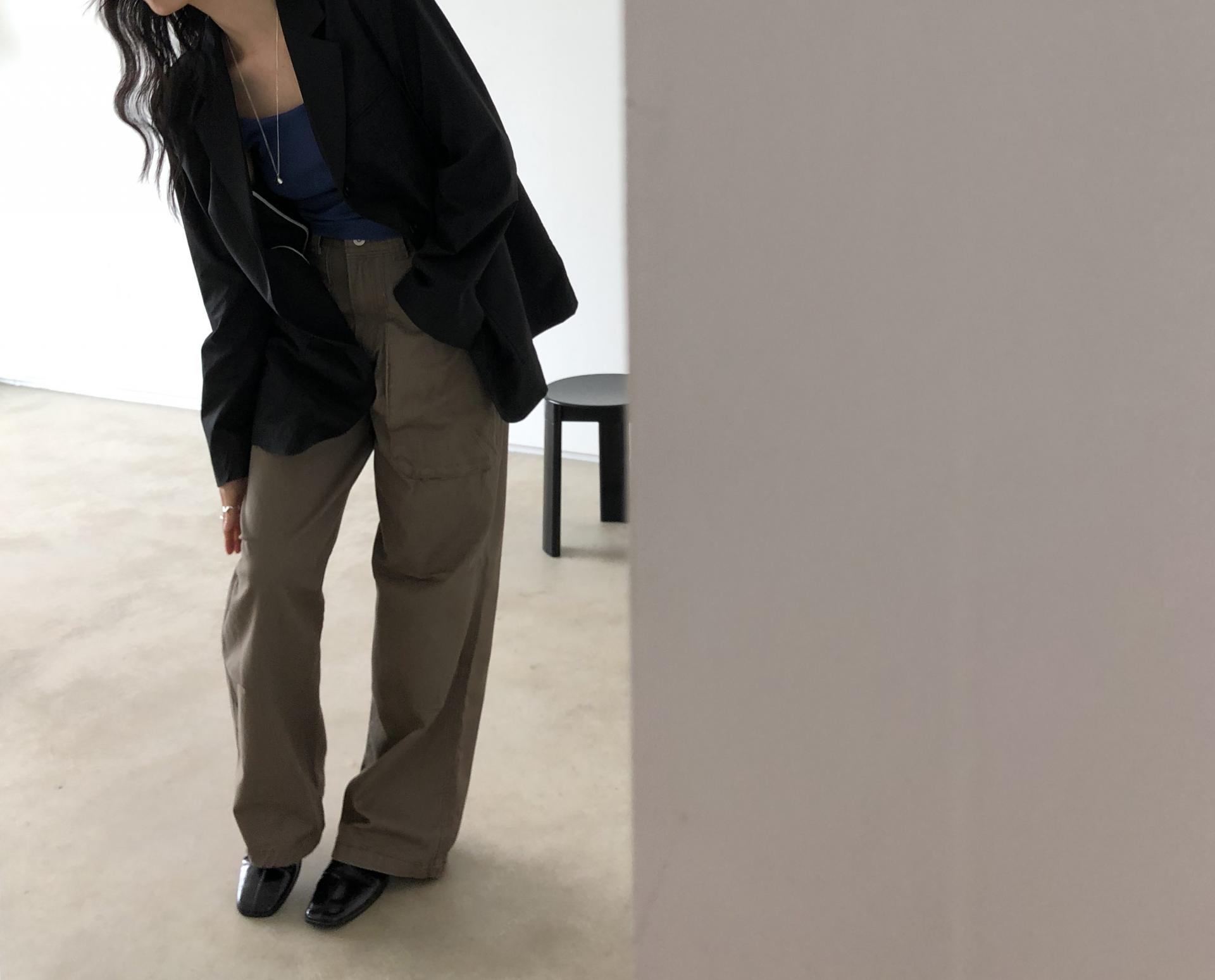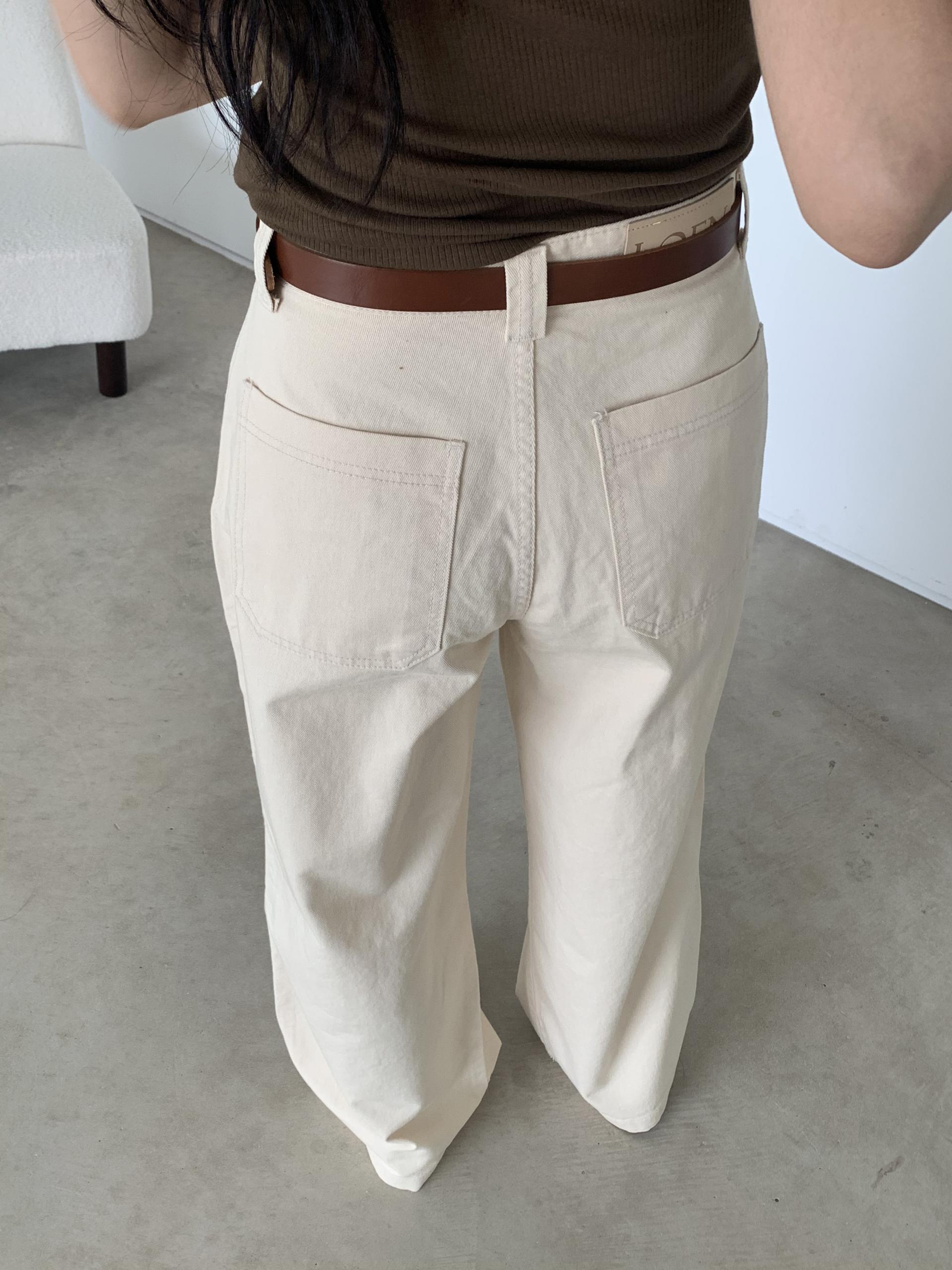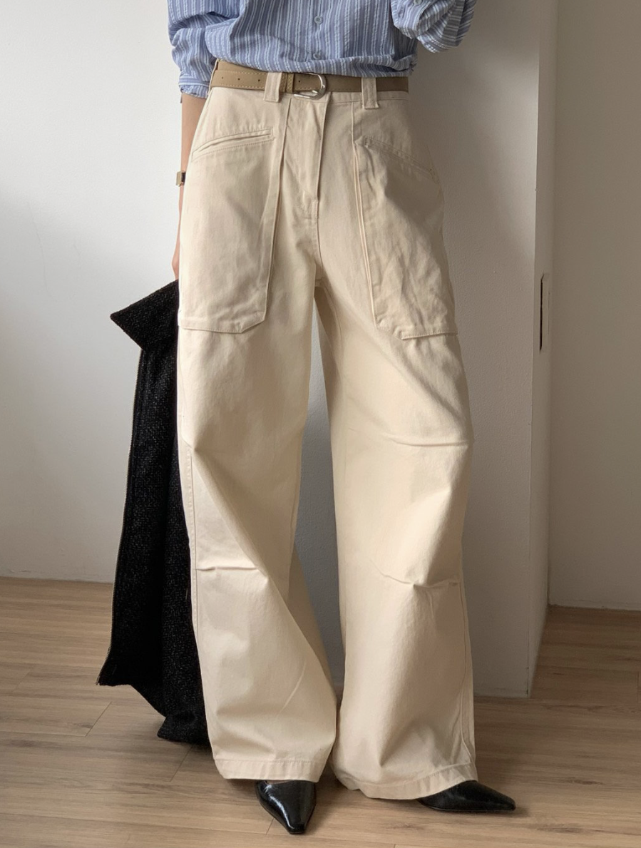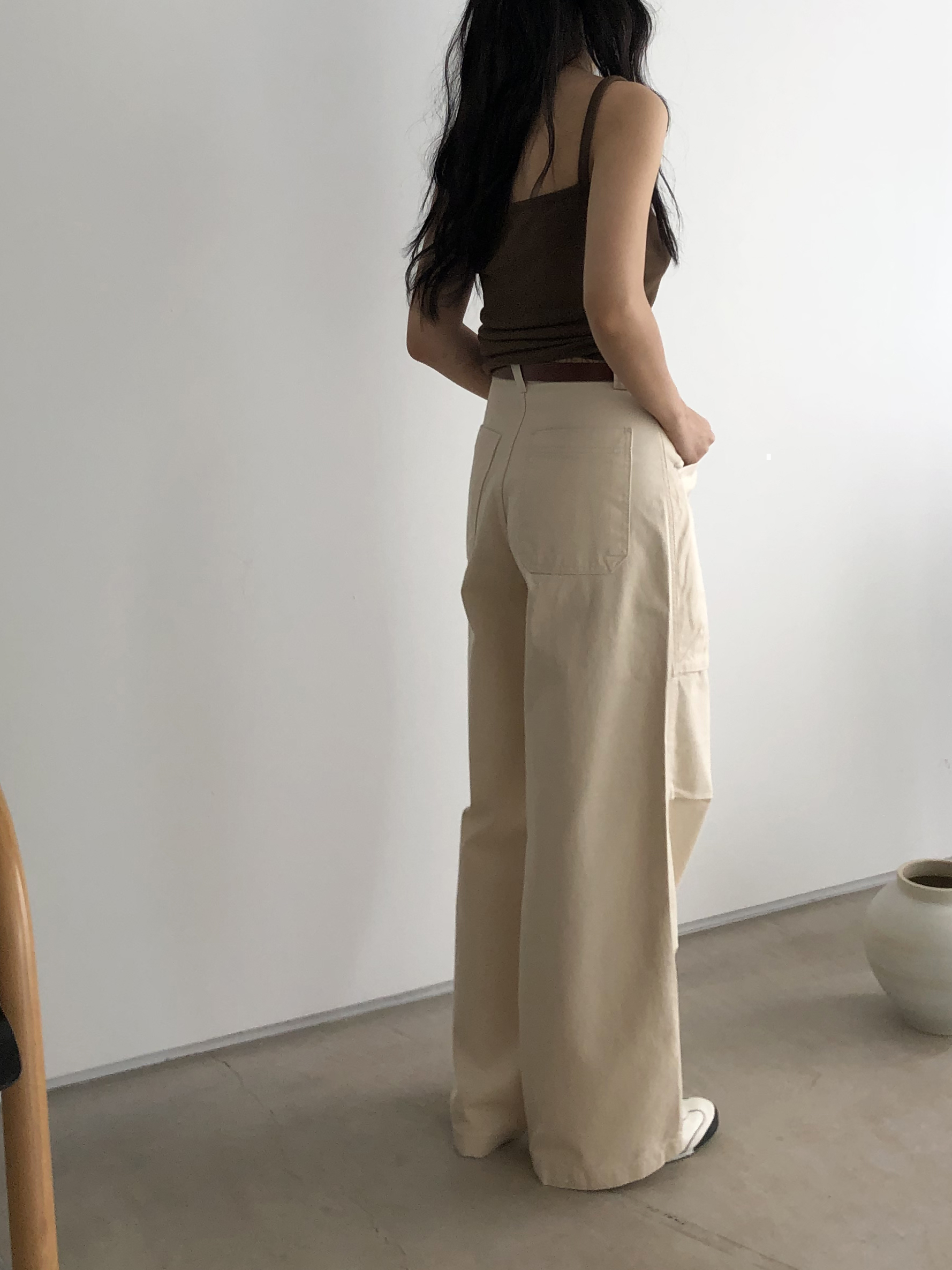 하이웨이스트로 착용되는 팬츠예요. 허리와 골반 깔끔하게 잡아주면서 와이드하게 일자로 떨어지는 핏입니다. 핏은 사진으로 설명이 될 것 같아요! 근래 가장 마음에 드는 핏입니다 :) 그리고 뒷 포켓 ! 꼭 설명드려야 할 부분이에요. 포켓이 큼지막하고 아래부분이 각져있는데, 오묘하게 힙이 업 되어 보이고, 포켓 크기가 커서인지 상대적으로 허리가 잘록해보이더라구요. 앞모습 만큼이나 뒷모습이 예쁜 팬츠입니다. (유독 이 거래처 팬츠는 뒷모습이 정말 ! 만족스러워요.)