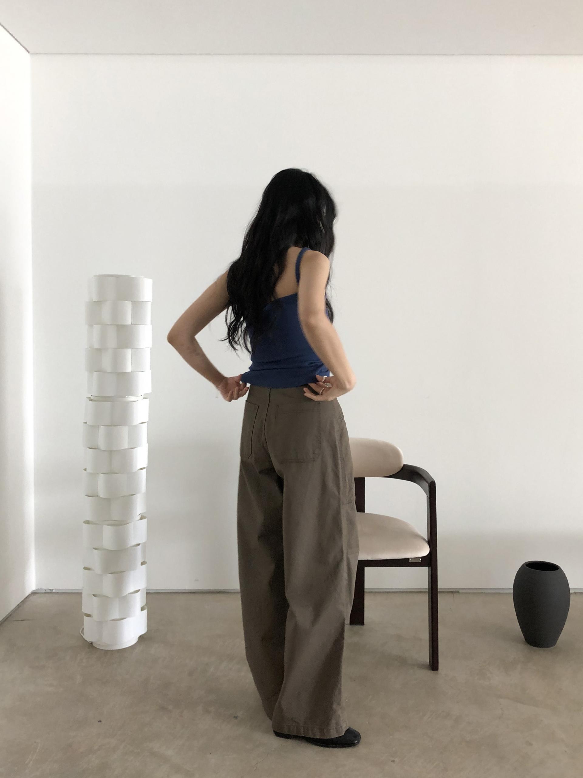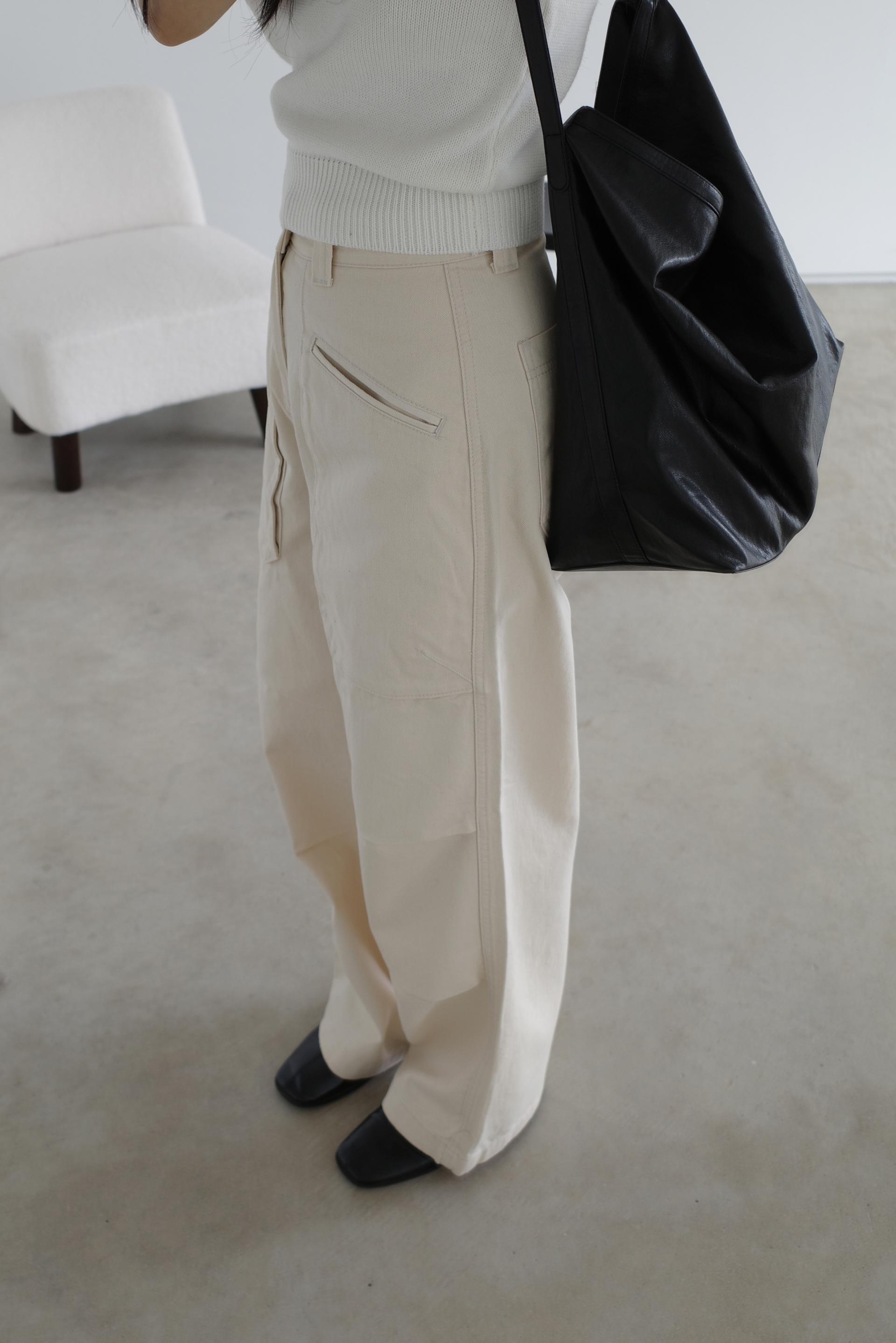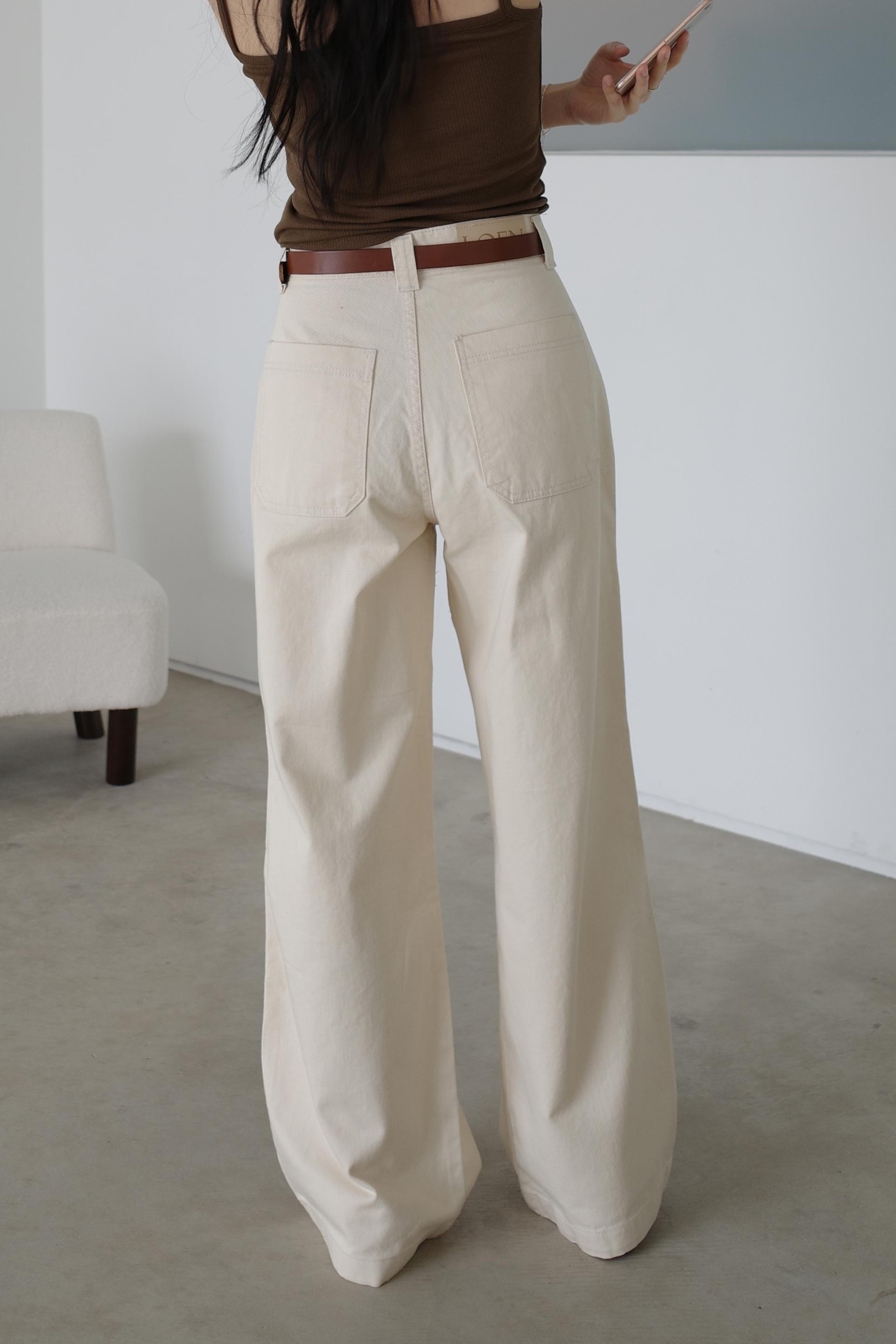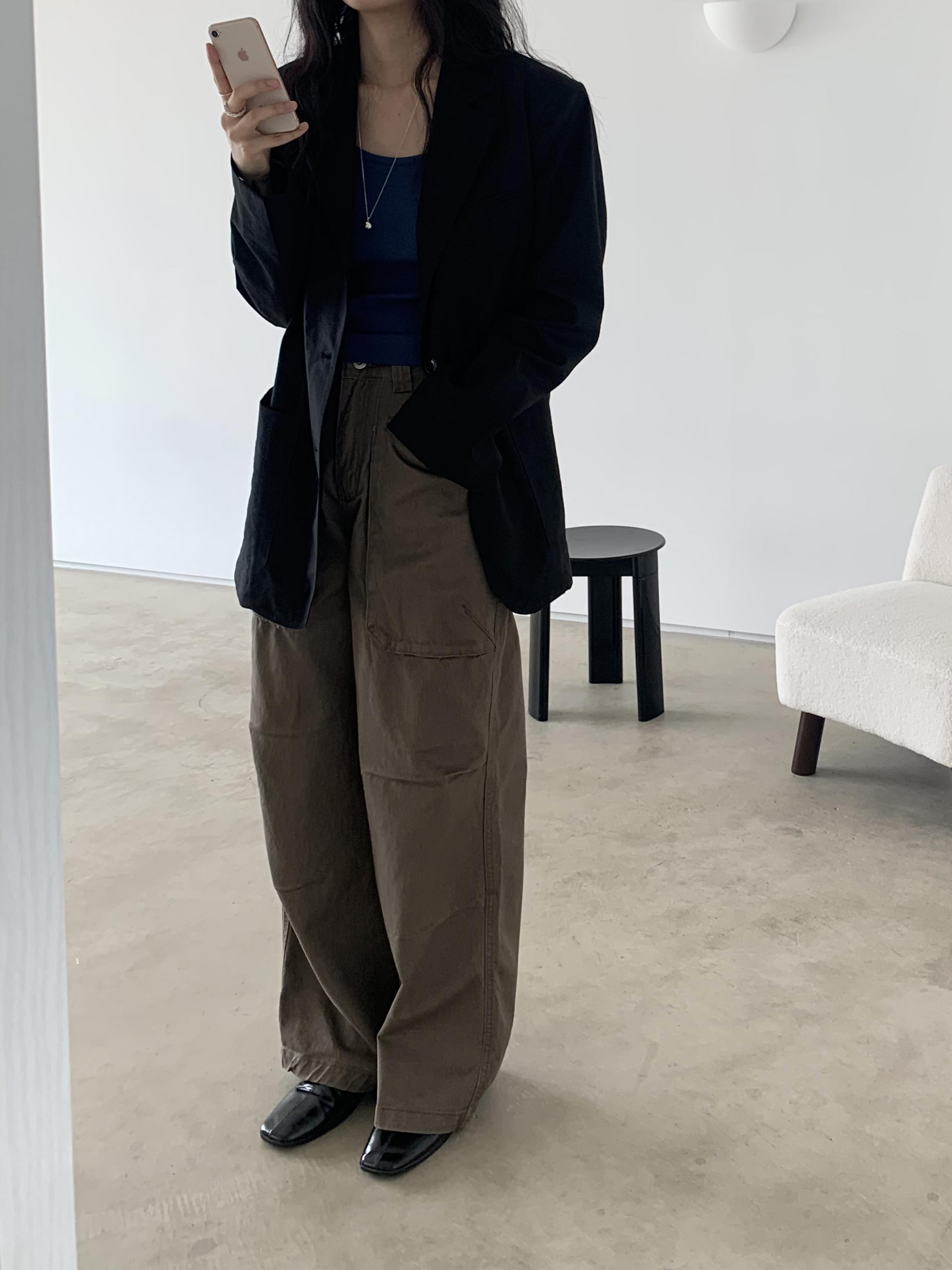 하이웨이스트로 착용되는 팬츠예요. 허리와 골반 깔끔하게 잡아주면서 와이드하게 일자로 떨어지는 핏입니다. 핏은 사진으로 설명이 될 것 같아요! 근래 가장 마음에 드는 핏입니다 :) 그리고 뒷 포켓 ! 꼭 설명드려야 할 부분이에요. 포켓이 큼지막하고 아래부분이 각져있는데, 오묘하게 힙이 업 되어 보이고, 포켓 크기가 커서인지 상대적으로 허리가 잘록해보이더라구요. 앞모습 만큼이나 뒷모습이 예쁜 팬츠입니다. (유독 이 거래처 팬츠는 뒷모습이 정말 ! 만족스러워요.)