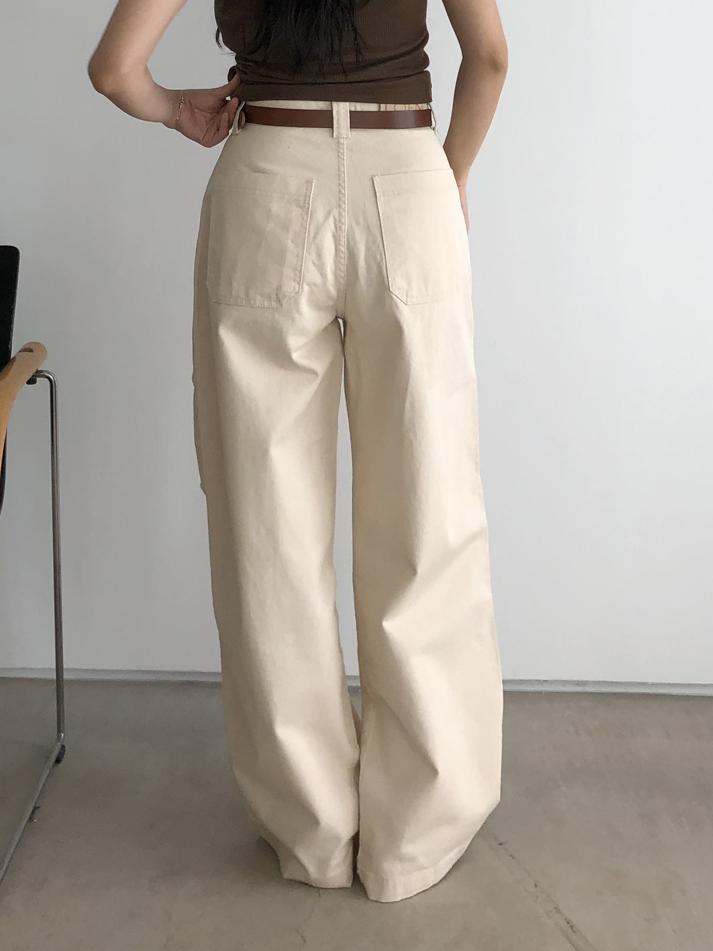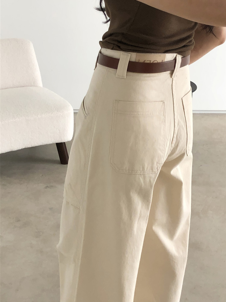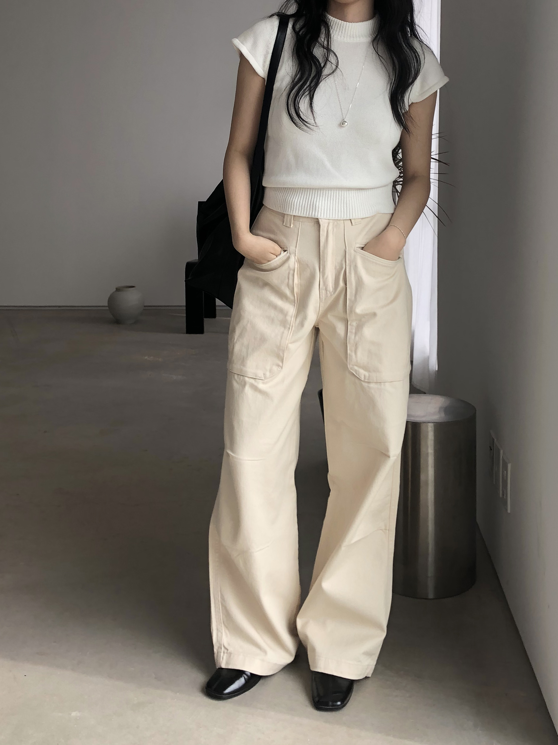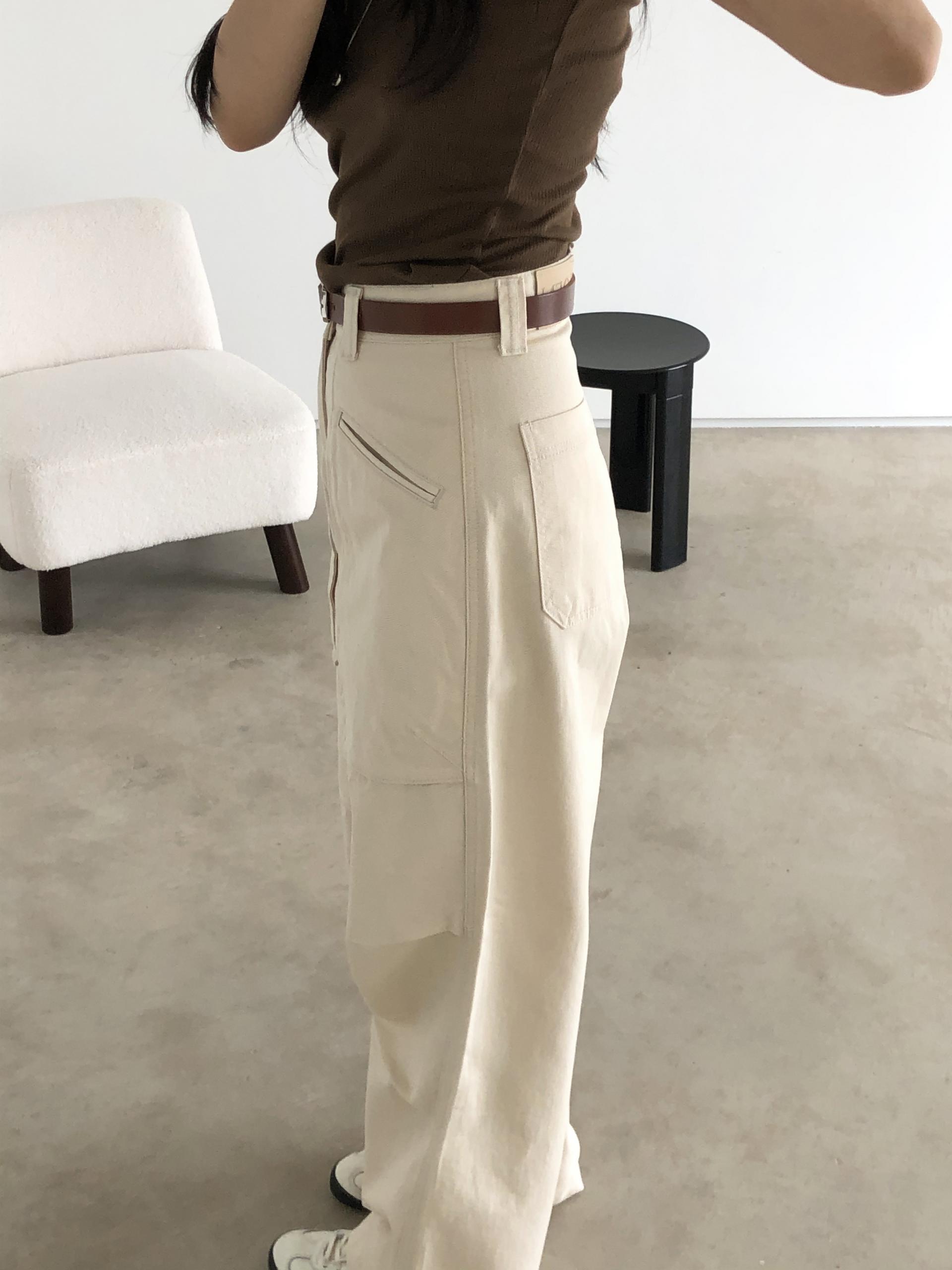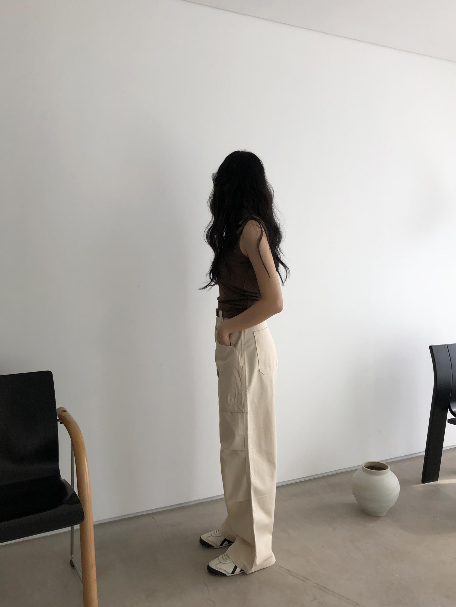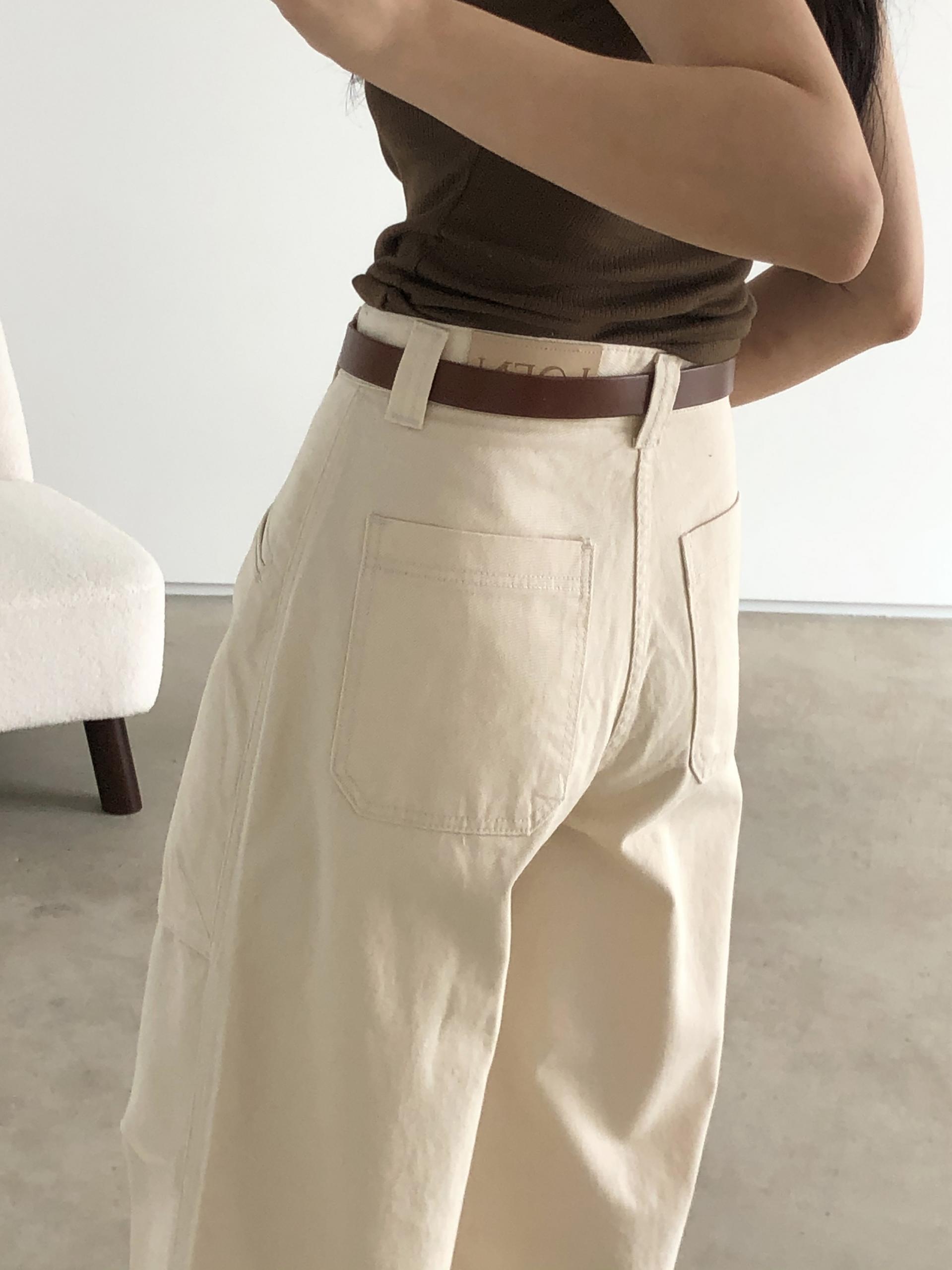 하이웨이스트로 착용되는 팬츠예요. 허리와 골반 깔끔하게 잡아주면서 와이드하게 일자로 떨어지는 핏입니다. 핏은 사진으로 설명이 될 것 같아요! 근래 가장 마음에 드는 핏입니다 :) 그리고 뒷 포켓 ! 꼭 설명드려야 할 부분이에요. 포켓이 큼지막하고 아래부분이 각져있는데, 오묘하게 힙이 업 되어 보이고, 포켓 크기가 커서인지 상대적으로 허리가 잘록해보이더라구요. 앞모습 만큼이나 뒷모습이 예쁜 팬츠입니다. (유독 이 거래처 팬츠는 뒷모습이 정말 ! 만족스러워요.)