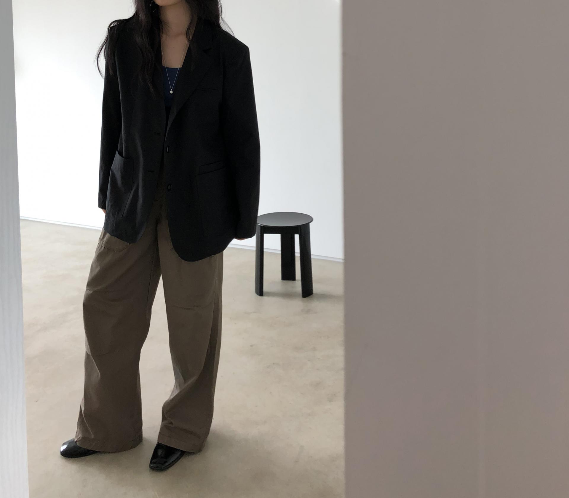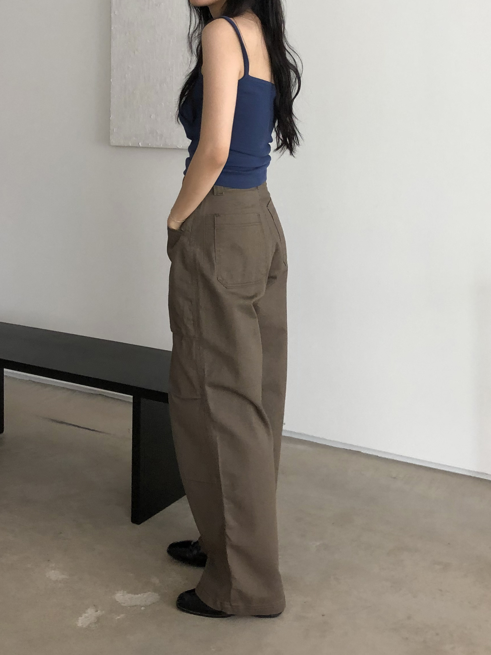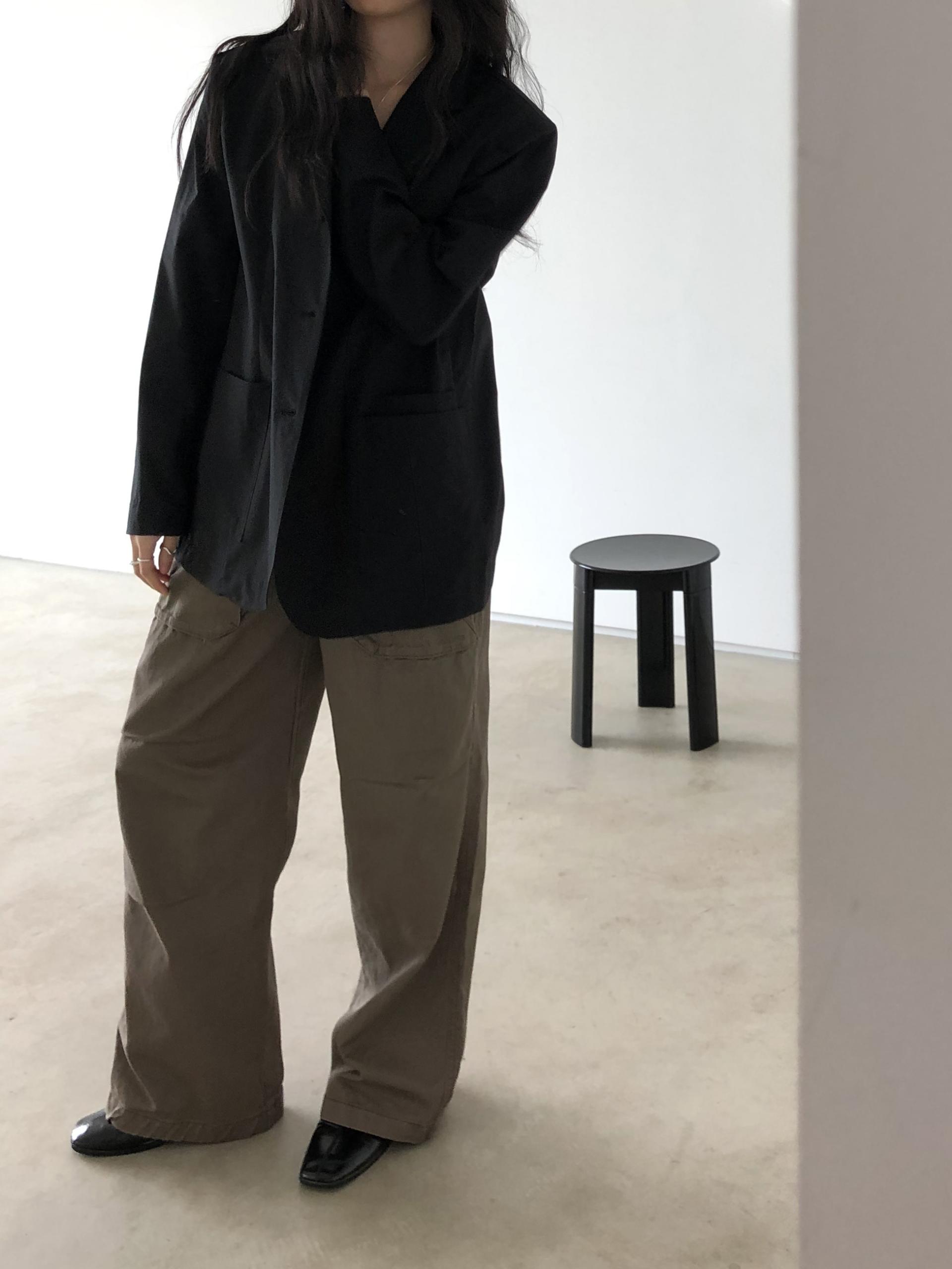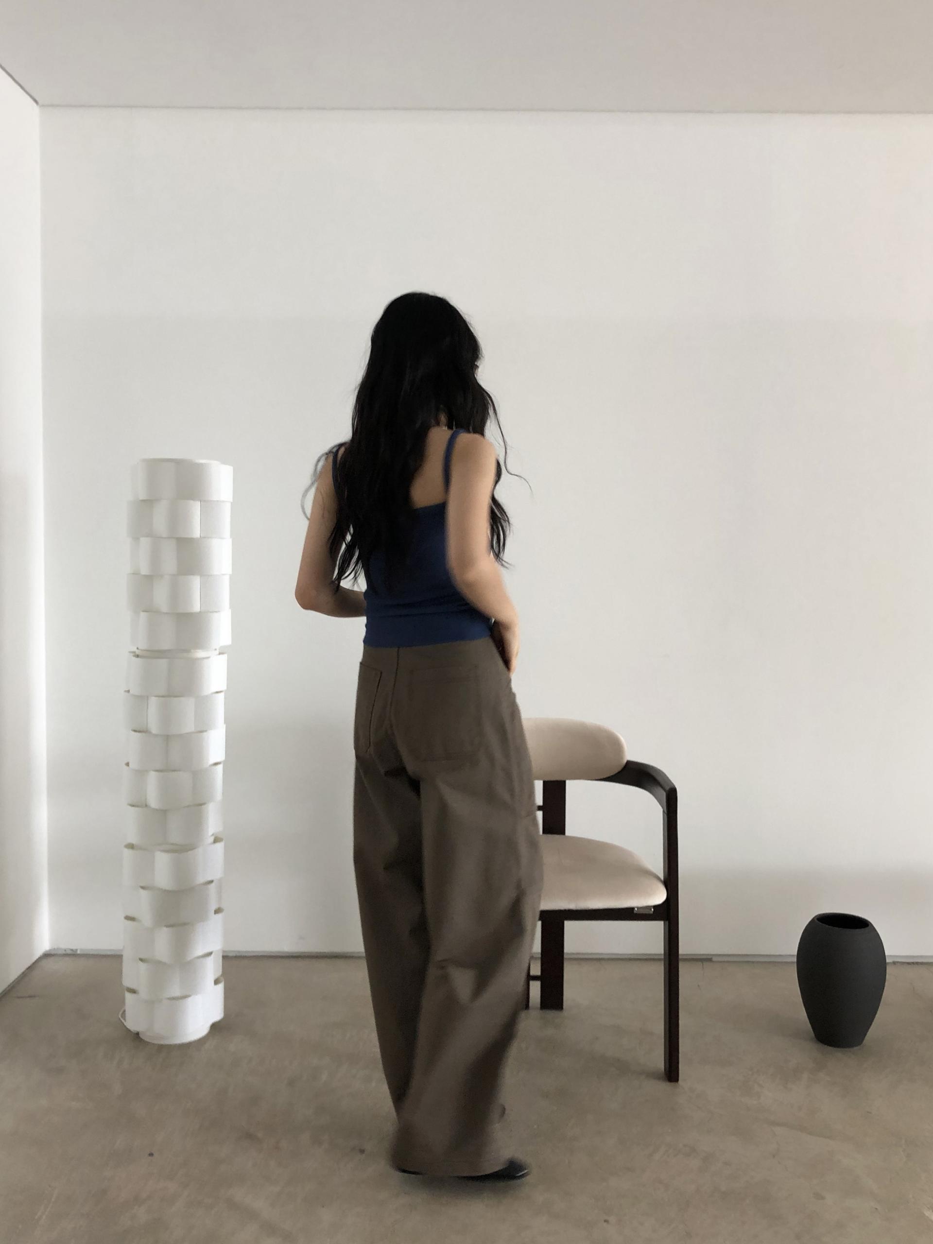 하이웨이스트로 착용되는 팬츠예요. 허리와 골반 깔끔하게 잡아주면서 와이드하게 일자로 떨어지는 핏입니다. 핏은 사진으로 설명이 될 것 같아요! 근래 가장 마음에 드는 핏입니다 :) 그리고 뒷 포켓 ! 꼭 설명드려야 할 부분이에요. 포켓이 큼지막하고 아래부분이 각져있는데, 오묘하게 힙이 업 되어 보이고, 포켓 크기가 커서인지 상대적으로 허리가 잘록해보이더라구요. 앞모습 만큼이나 뒷모습이 예쁜 팬츠입니다. (유독 이 거래처 팬츠는 뒷모습이 정말 ! 만족스러워요.)