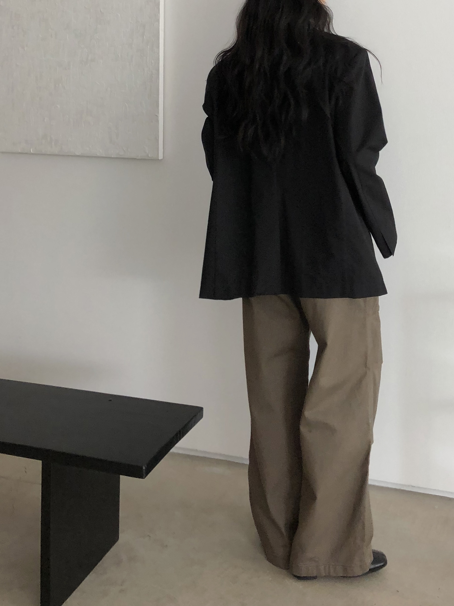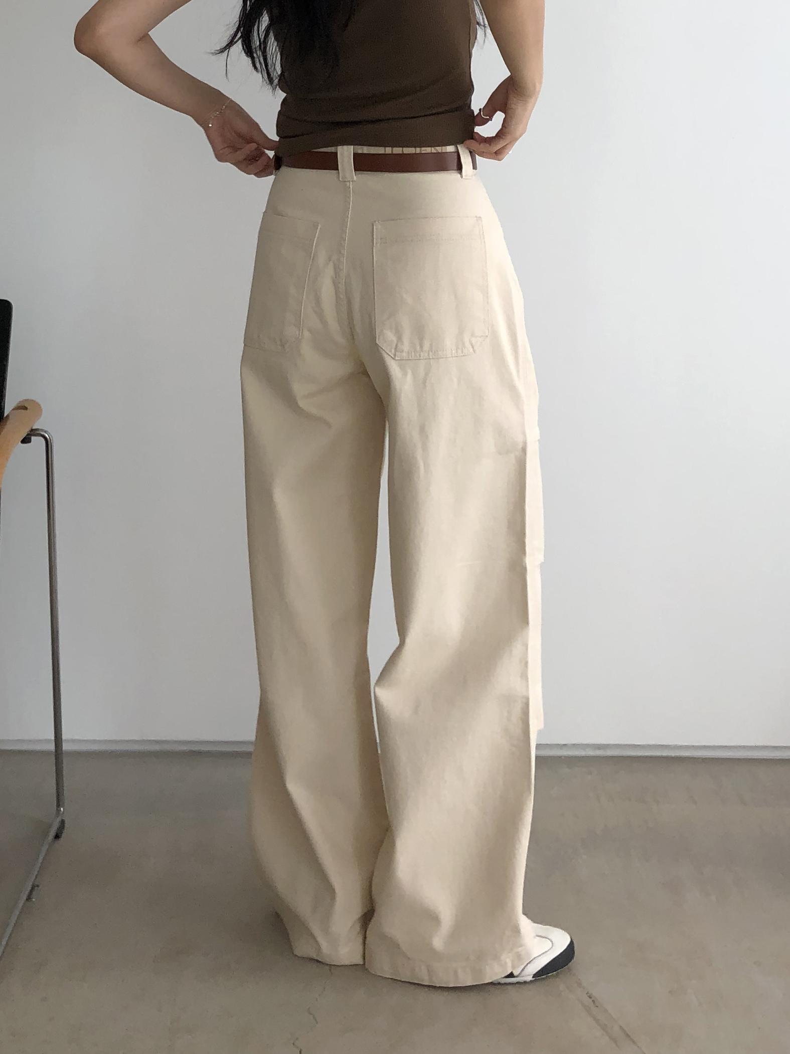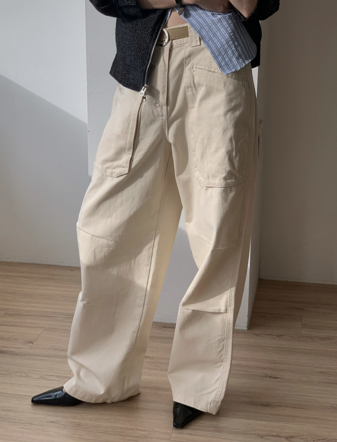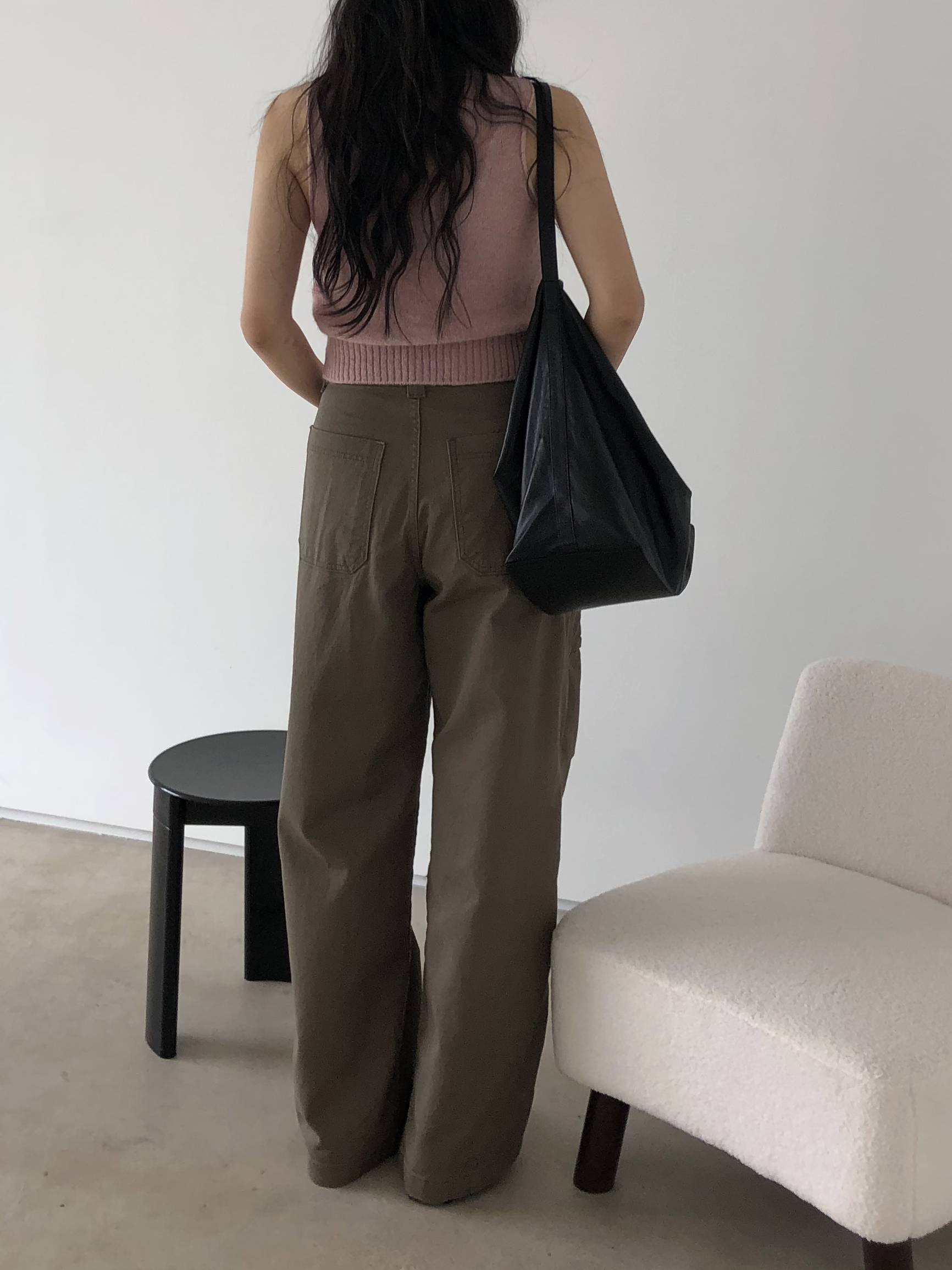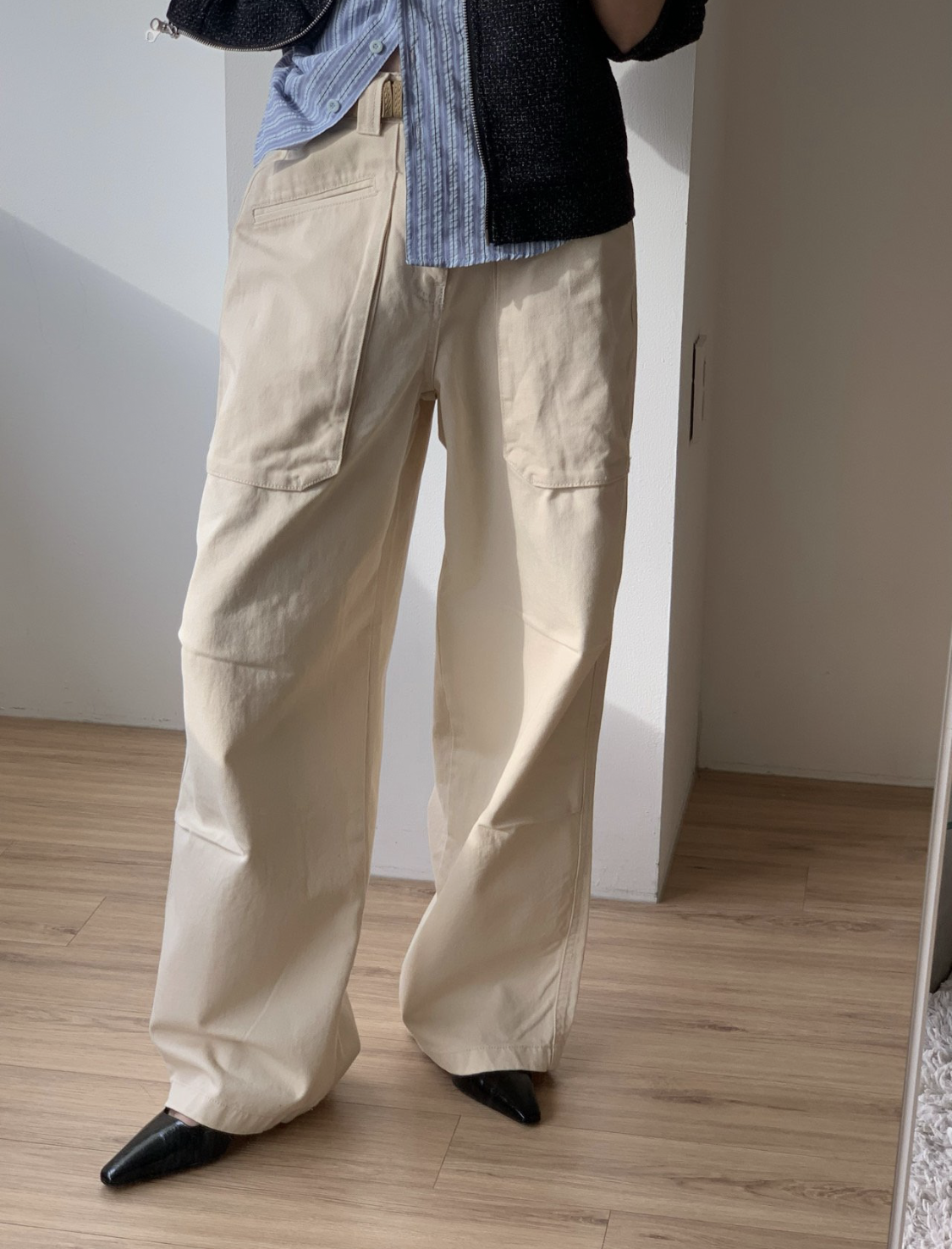 하이웨이스트로 착용되는 팬츠예요. 허리와 골반 깔끔하게 잡아주면서 와이드하게 일자로 떨어지는 핏입니다. 핏은 사진으로 설명이 될 것 같아요! 근래 가장 마음에 드는 핏입니다 :) 그리고 뒷 포켓 ! 꼭 설명드려야 할 부분이에요. 포켓이 큼지막하고 아래부분이 각져있는데, 오묘하게 힙이 업 되어 보이고, 포켓 크기가 커서인지 상대적으로 허리가 잘록해보이더라구요. 앞모습 만큼이나 뒷모습이 예쁜 팬츠입니다. (유독 이 거래처 팬츠는 뒷모습이 정말 ! 만족스러워요.)