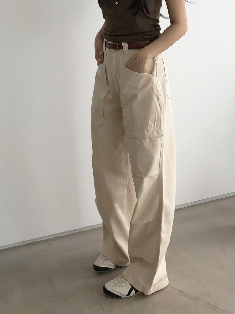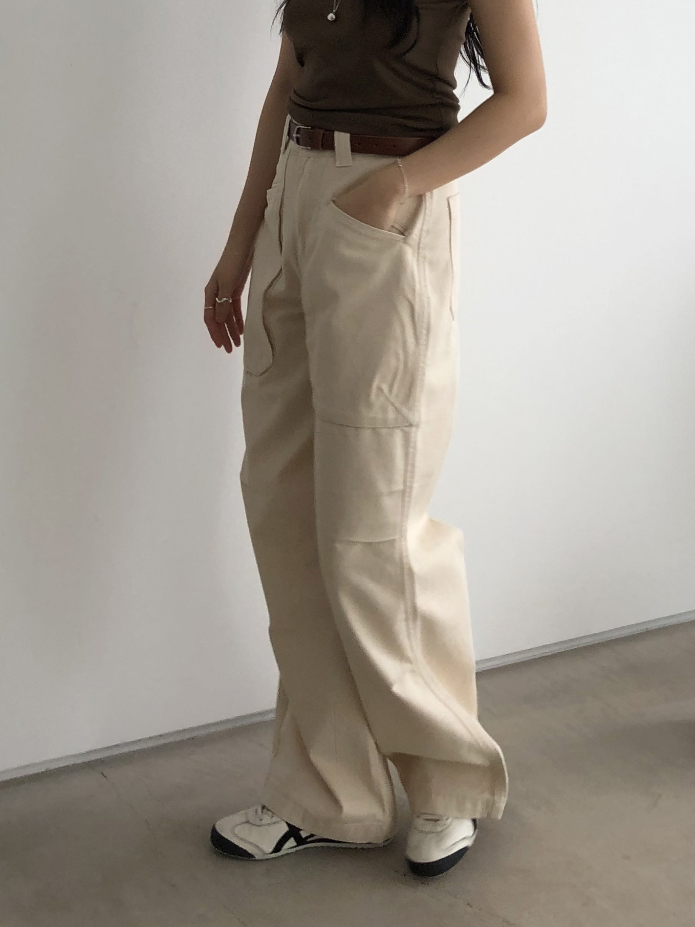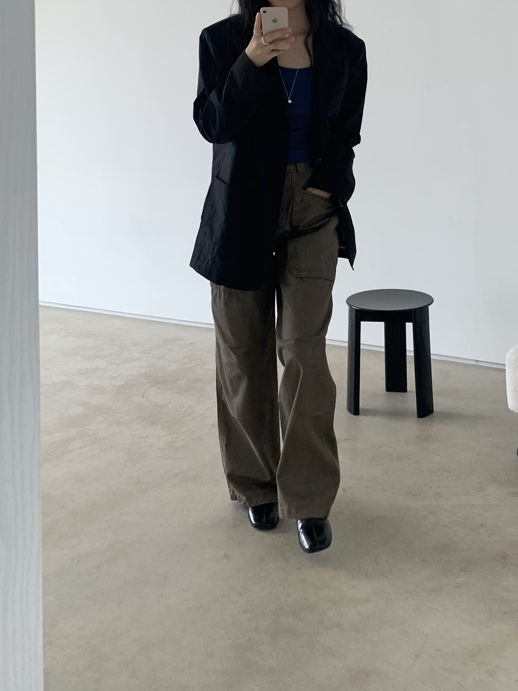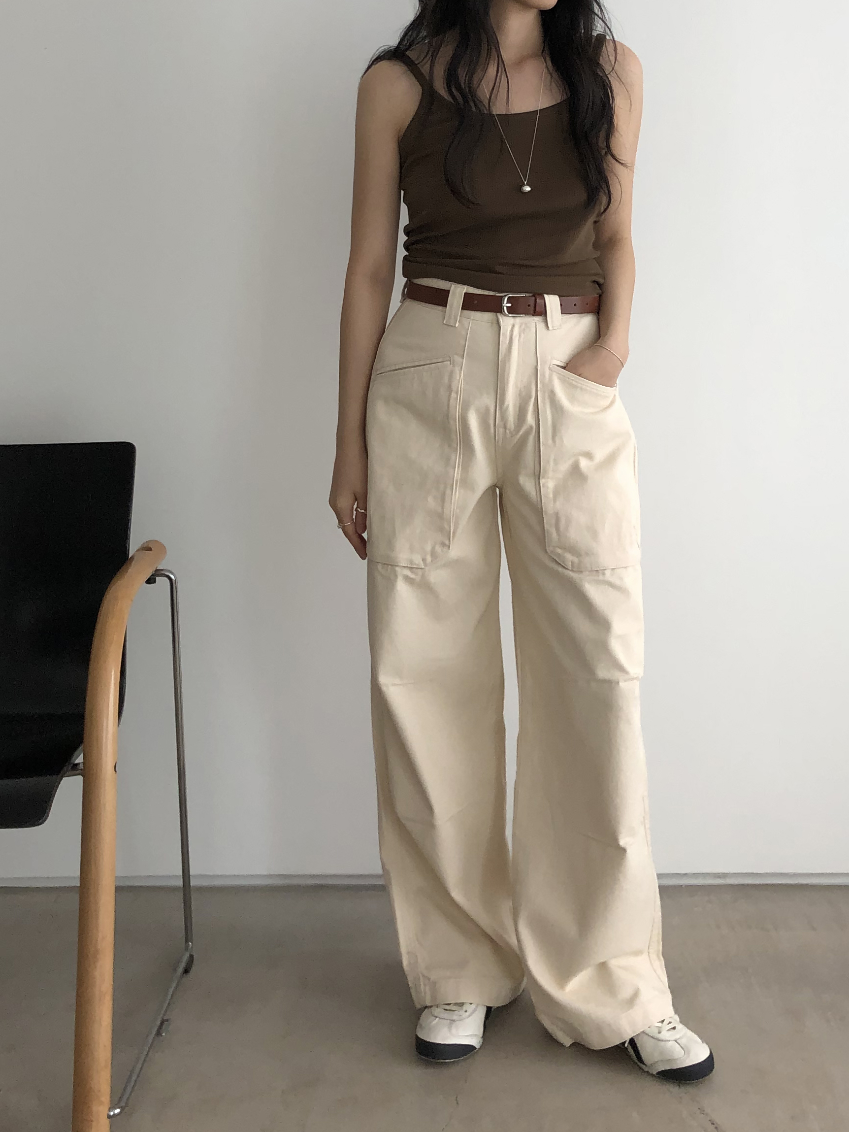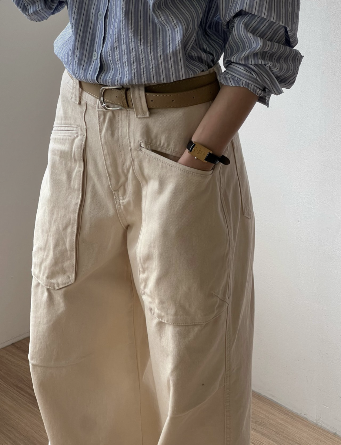 하이웨이스트로 착용되는 팬츠예요. 허리와 골반 깔끔하게 잡아주면서 와이드하게 일자로 떨어지는 핏입니다. 핏은 사진으로 설명이 될 것 같아요! 근래 가장 마음에 드는 핏입니다 :) 그리고 뒷 포켓 ! 꼭 설명드려야 할 부분이에요. 포켓이 큼지막하고 아래부분이 각져있는데, 오묘하게 힙이 업 되어 보이고, 포켓 크기가 커서인지 상대적으로 허리가 잘록해보이더라구요. 앞모습 만큼이나 뒷모습이 예쁜 팬츠입니다. (유독 이 거래처 팬츠는 뒷모습이 정말 ! 만족스러워요.)