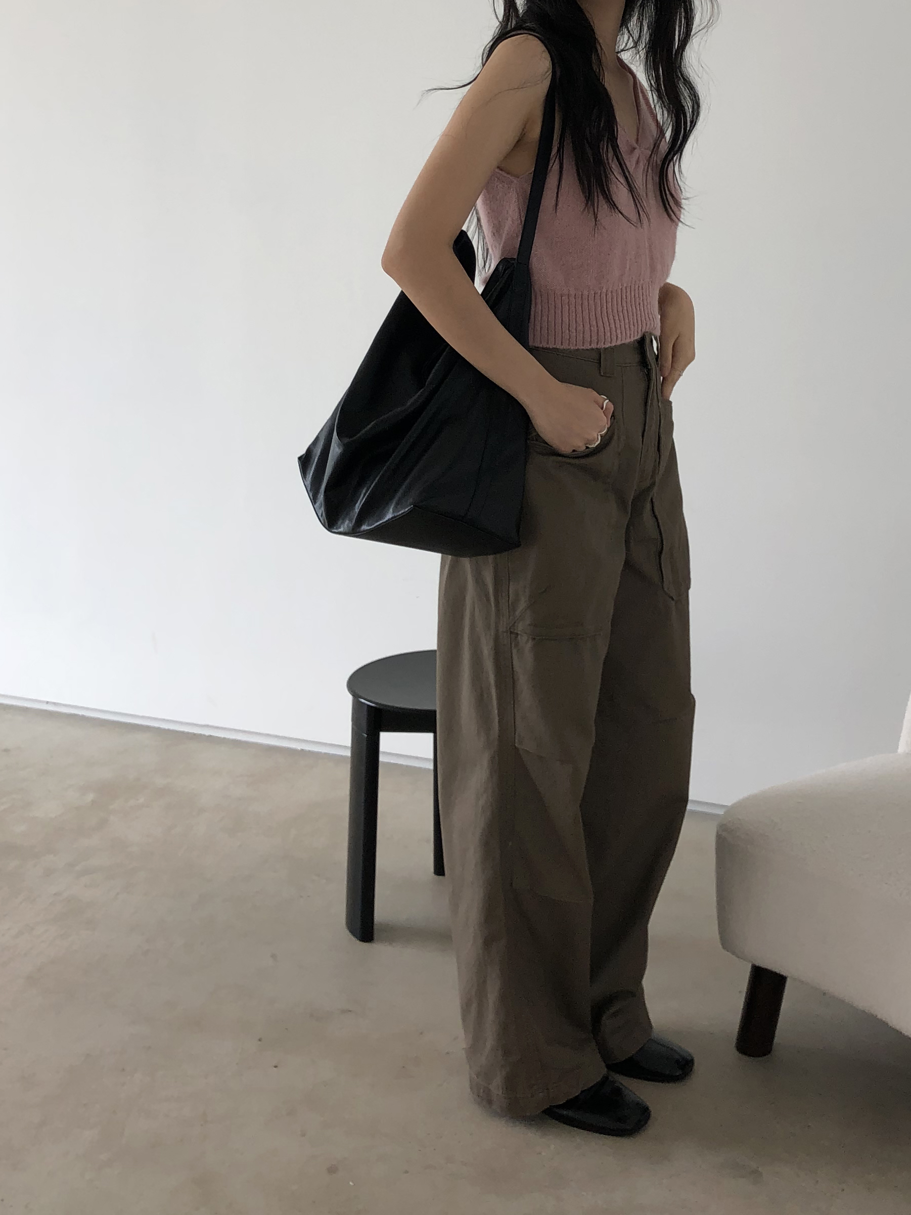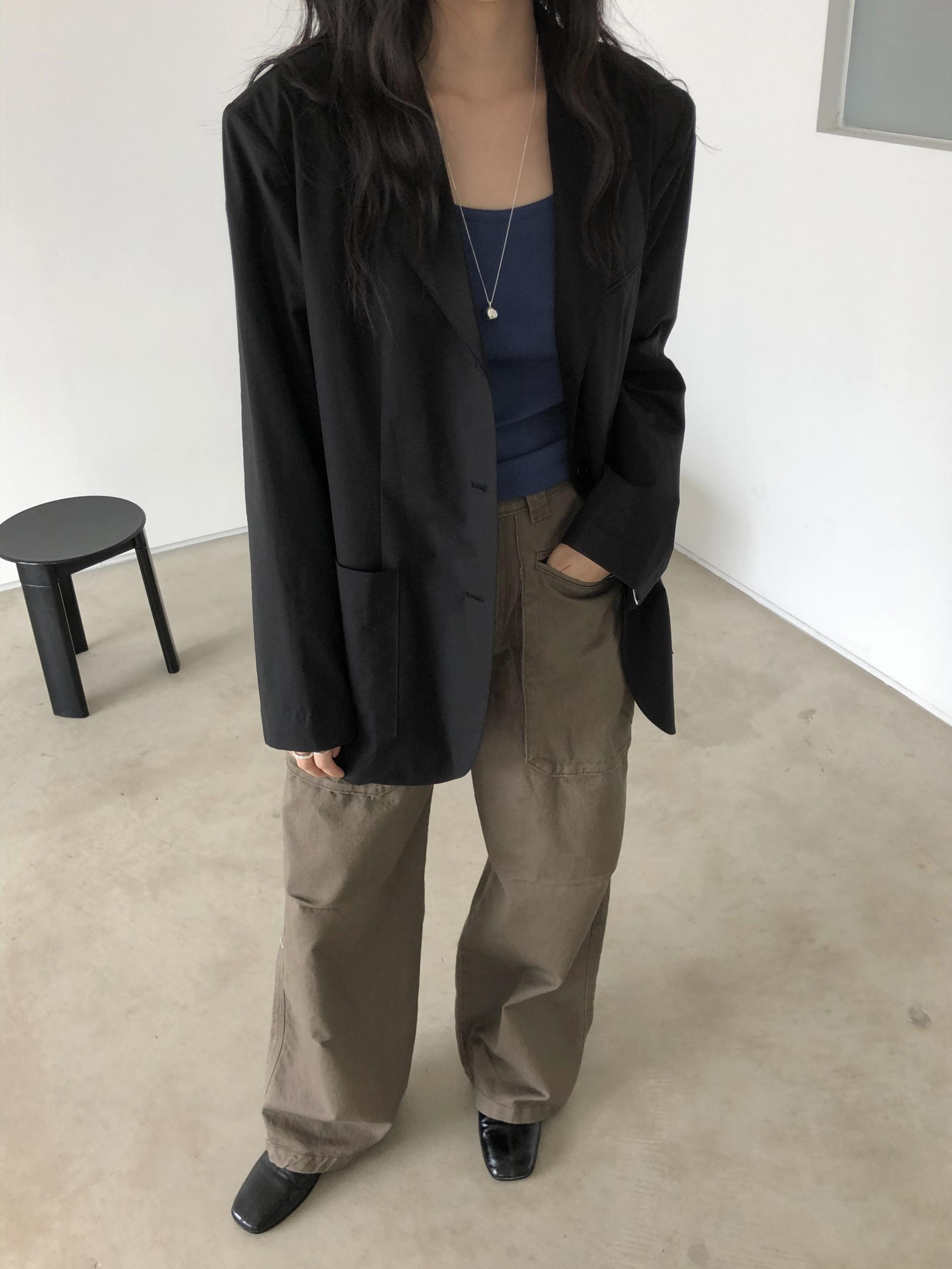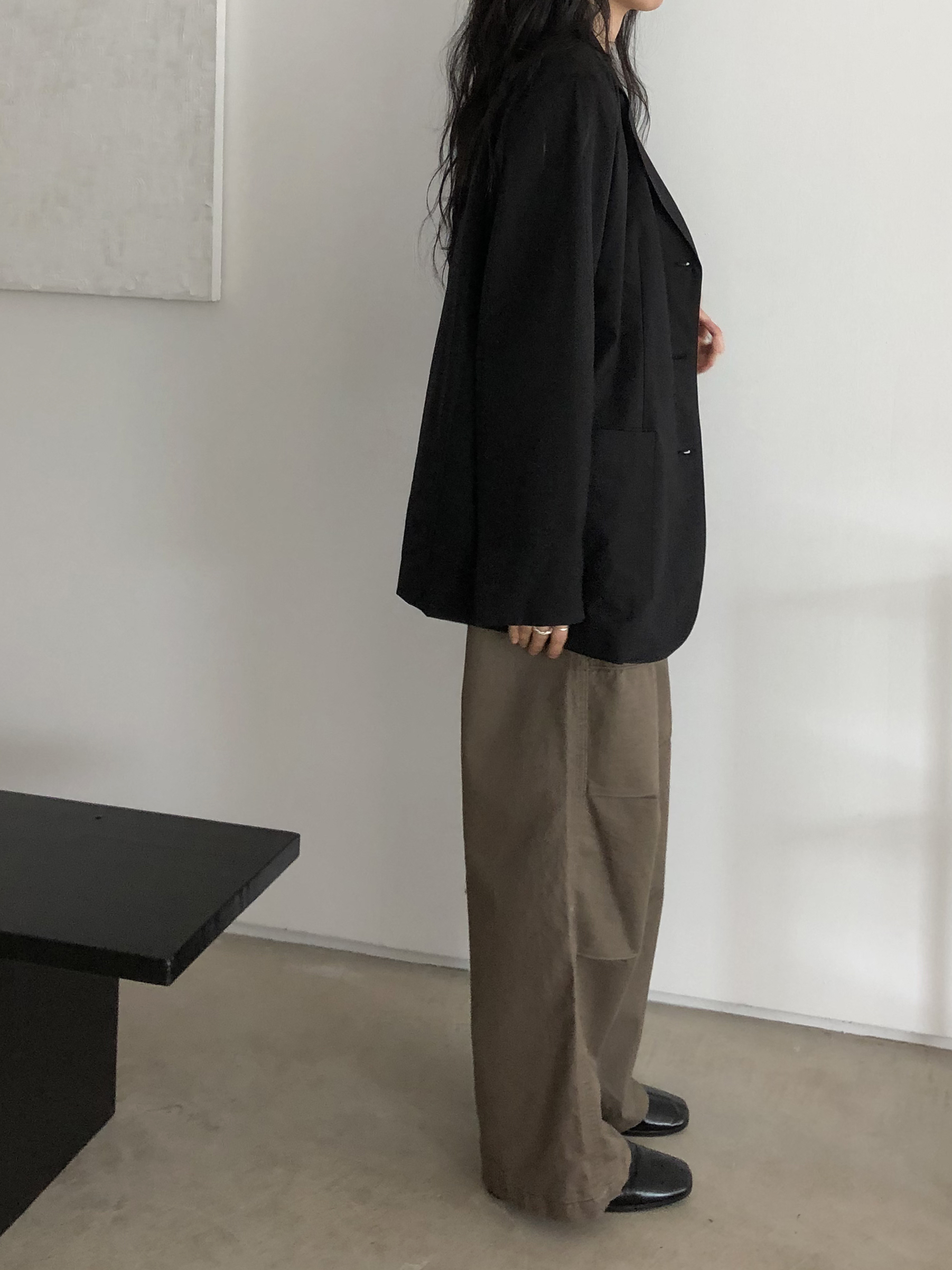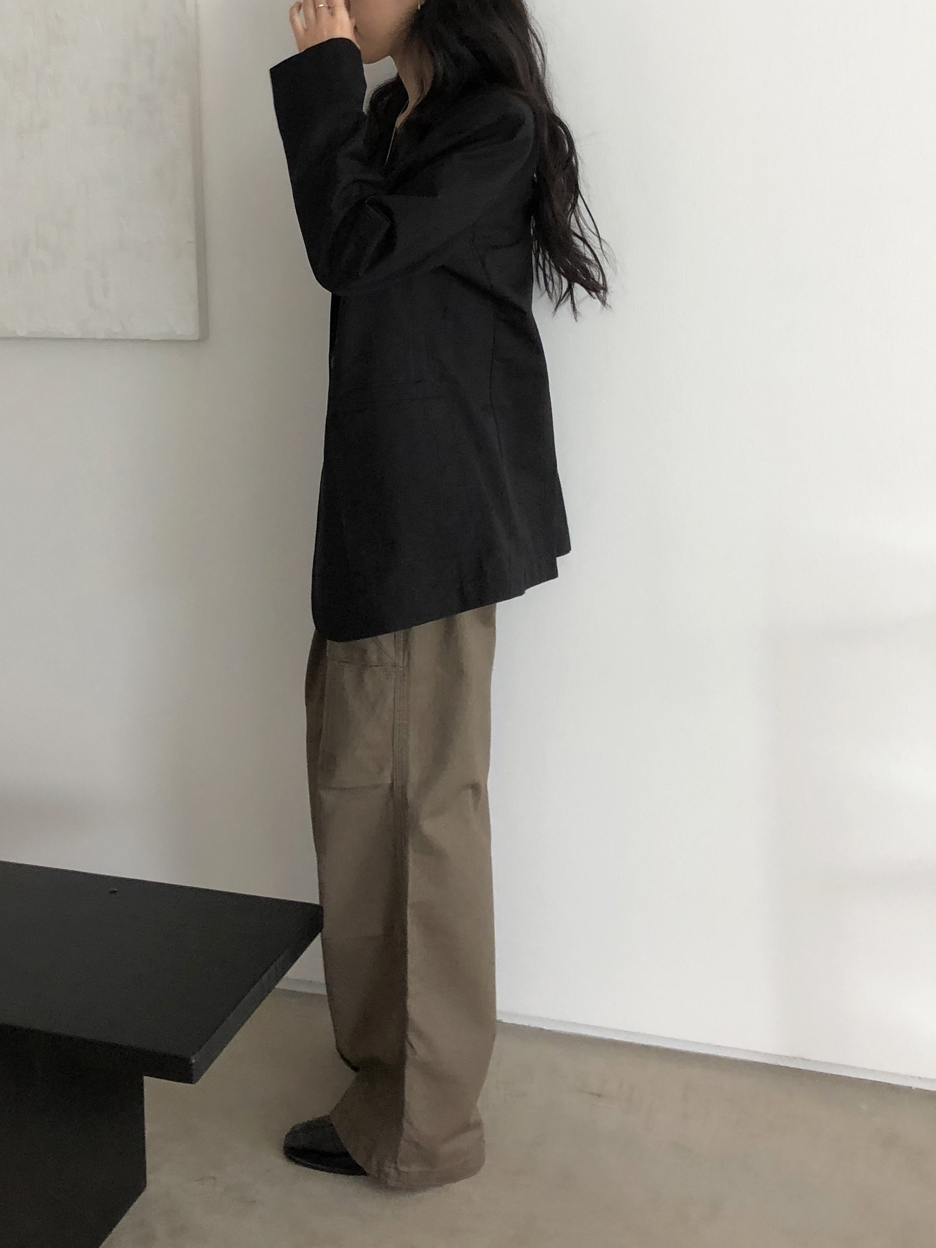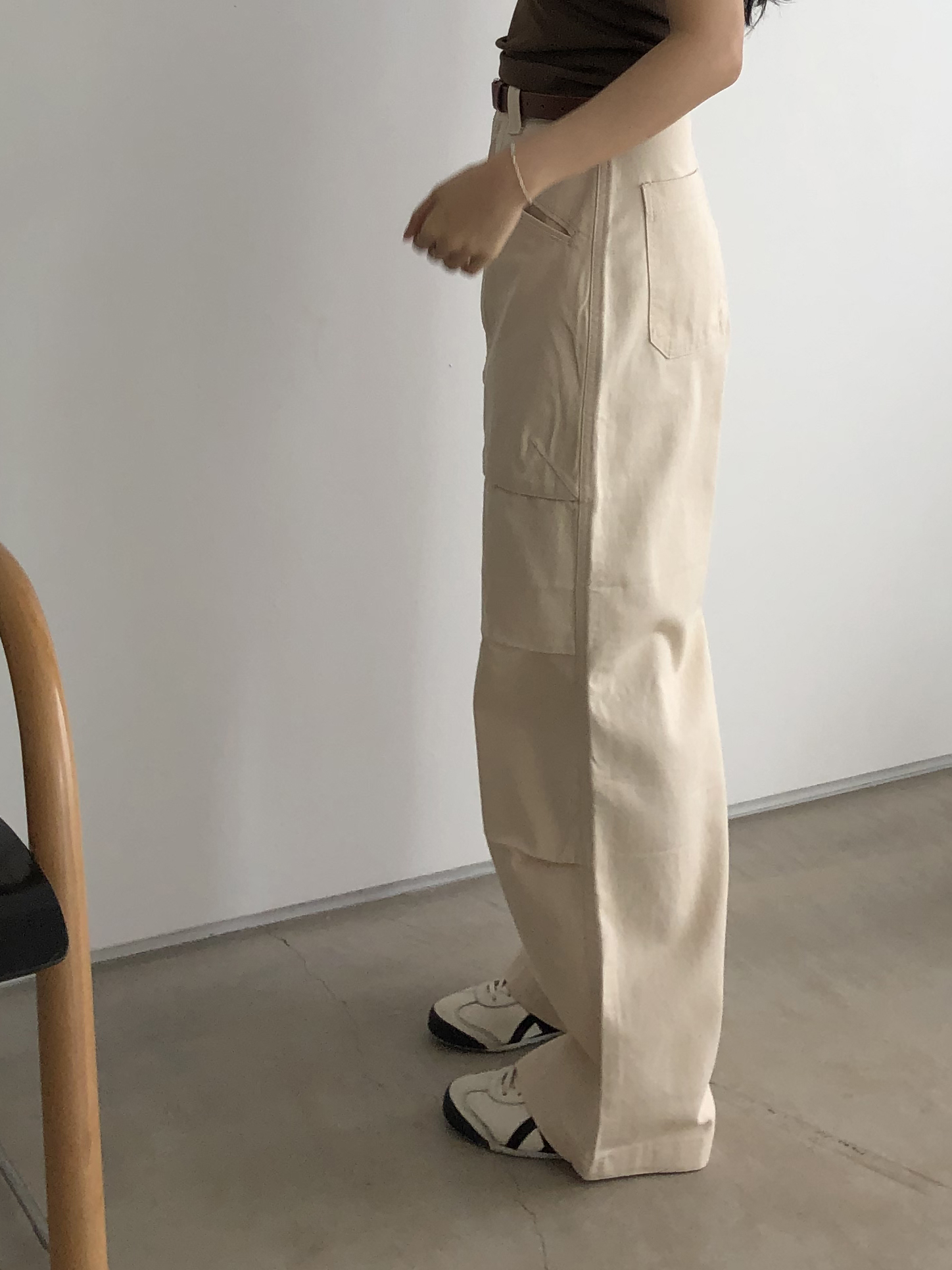 하이웨이스트로 착용되는 팬츠예요. 허리와 골반 깔끔하게 잡아주면서 와이드하게 일자로 떨어지는 핏입니다. 핏은 사진으로 설명이 될 것 같아요! 근래 가장 마음에 드는 핏입니다 :) 그리고 뒷 포켓 ! 꼭 설명드려야 할 부분이에요. 포켓이 큼지막하고 아래부분이 각져있는데, 오묘하게 힙이 업 되어 보이고, 포켓 크기가 커서인지 상대적으로 허리가 잘록해보이더라구요. 앞모습 만큼이나 뒷모습이 예쁜 팬츠입니다. (유독 이 거래처 팬츠는 뒷모습이 정말 ! 만족스러워요.)