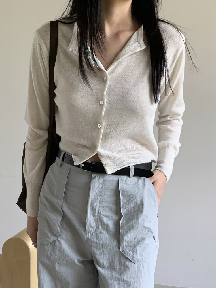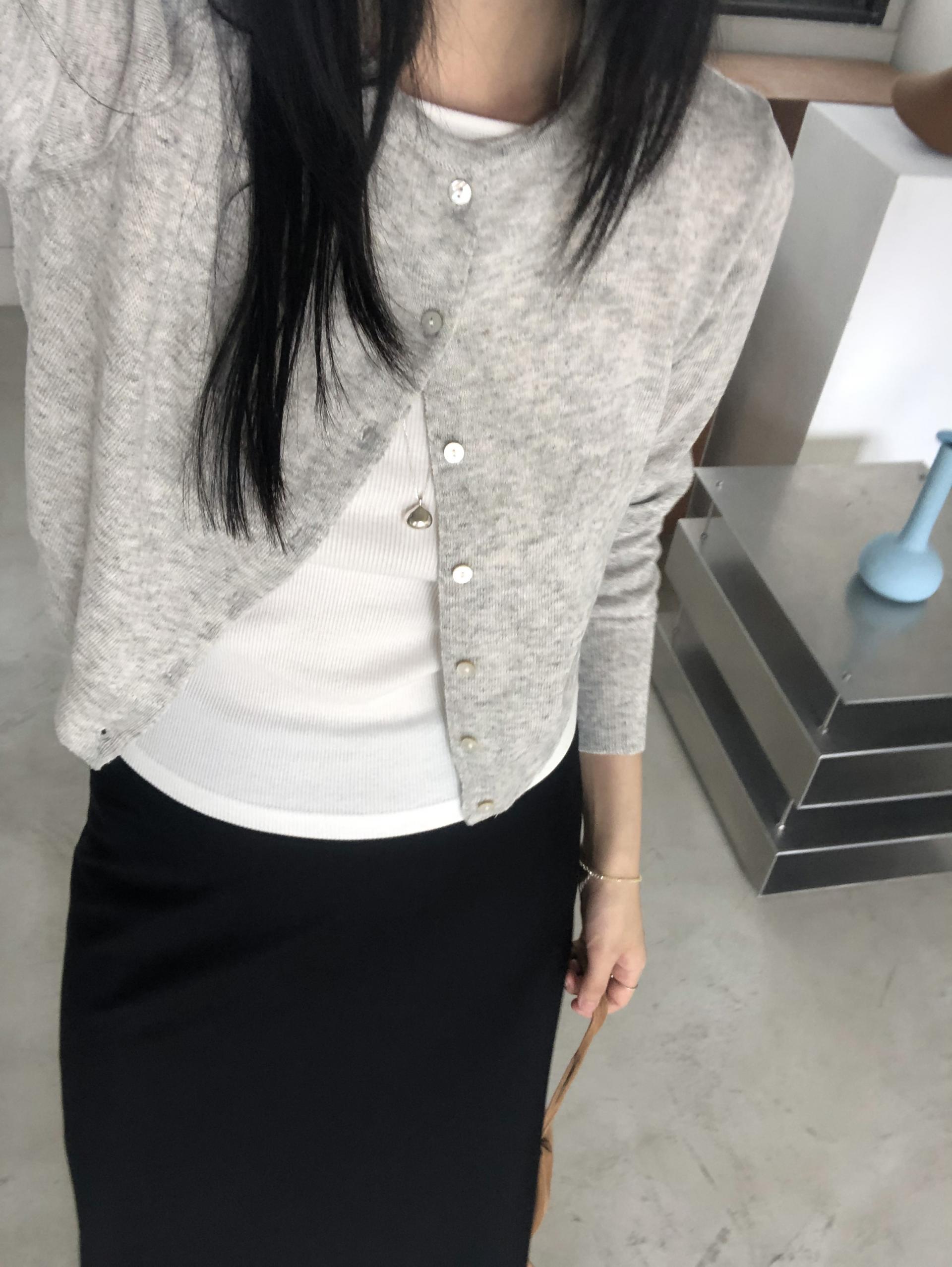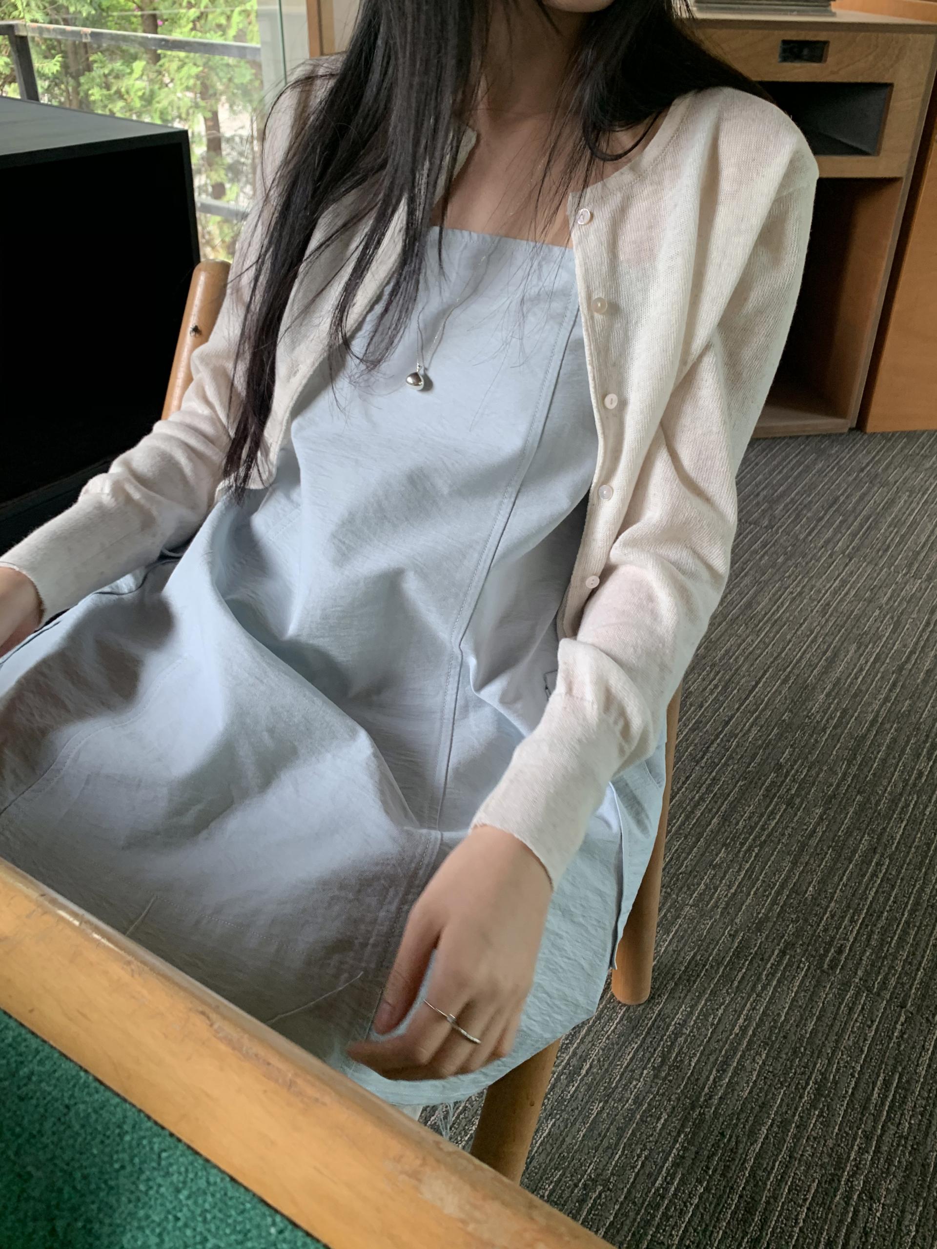 린넨이 함유된 혼방소재로 얇고 가벼워 더운 여름날에도 들고 다니기 편하고 적당히 크롭된 기장이라 단독 썸머 니트웨어처럼 입기에도 좋습니다.