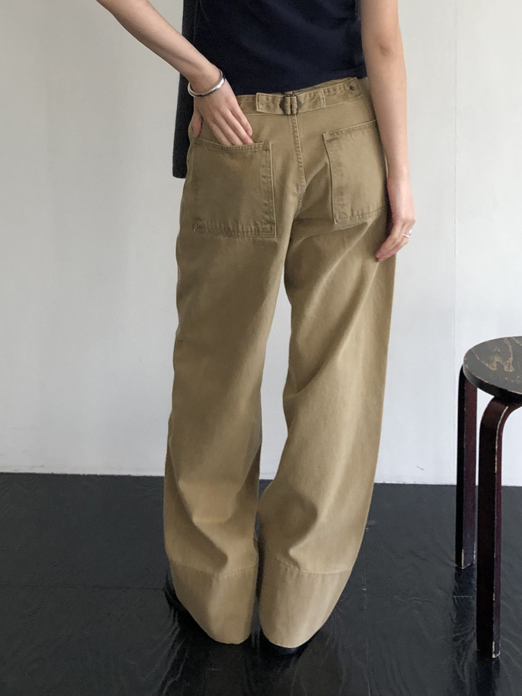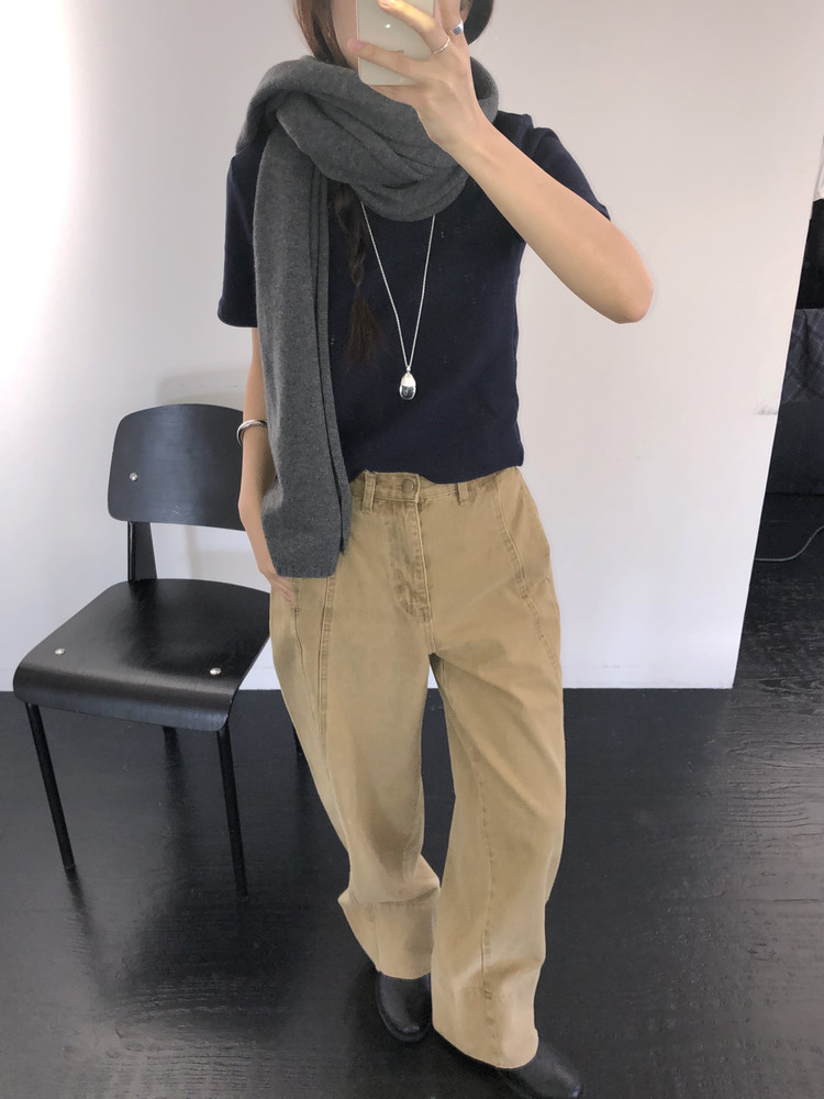 일자로 여유로이 떨어지면서 살짝 커브진 트렌디한 핏이 연출됩니다. 특히 밑단이 넓게 디자인되어 사이즈업해 롤업 스타일링을 해도 좋아요.