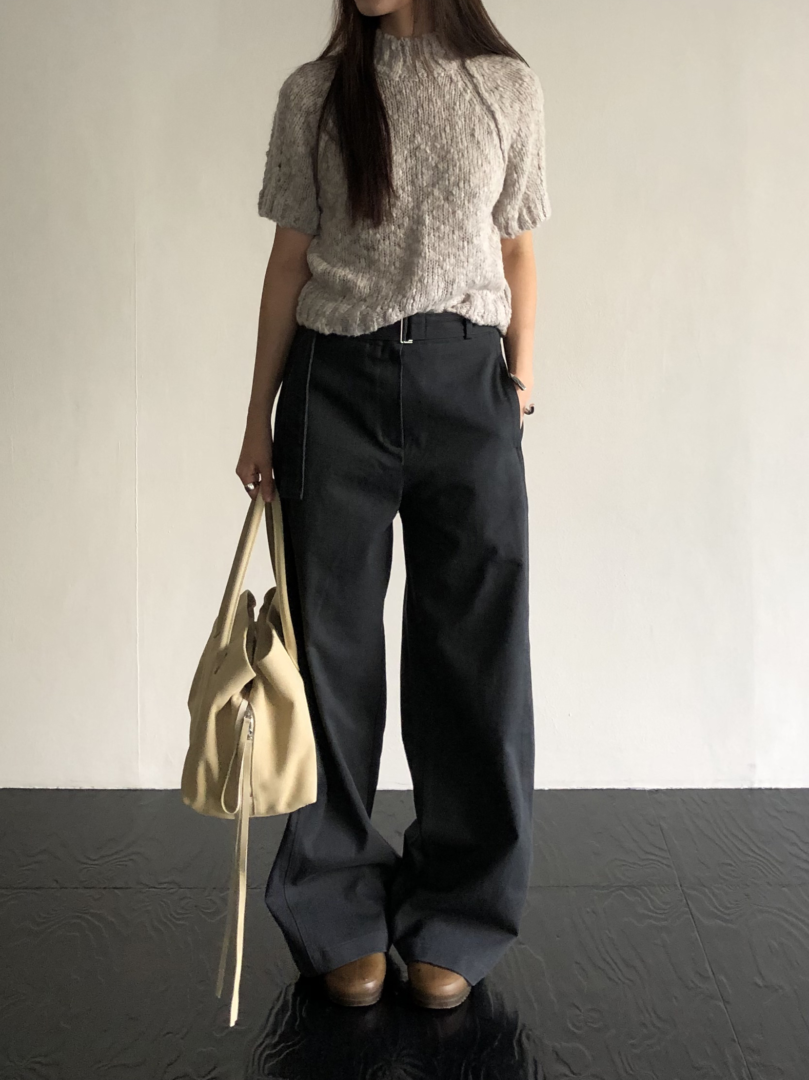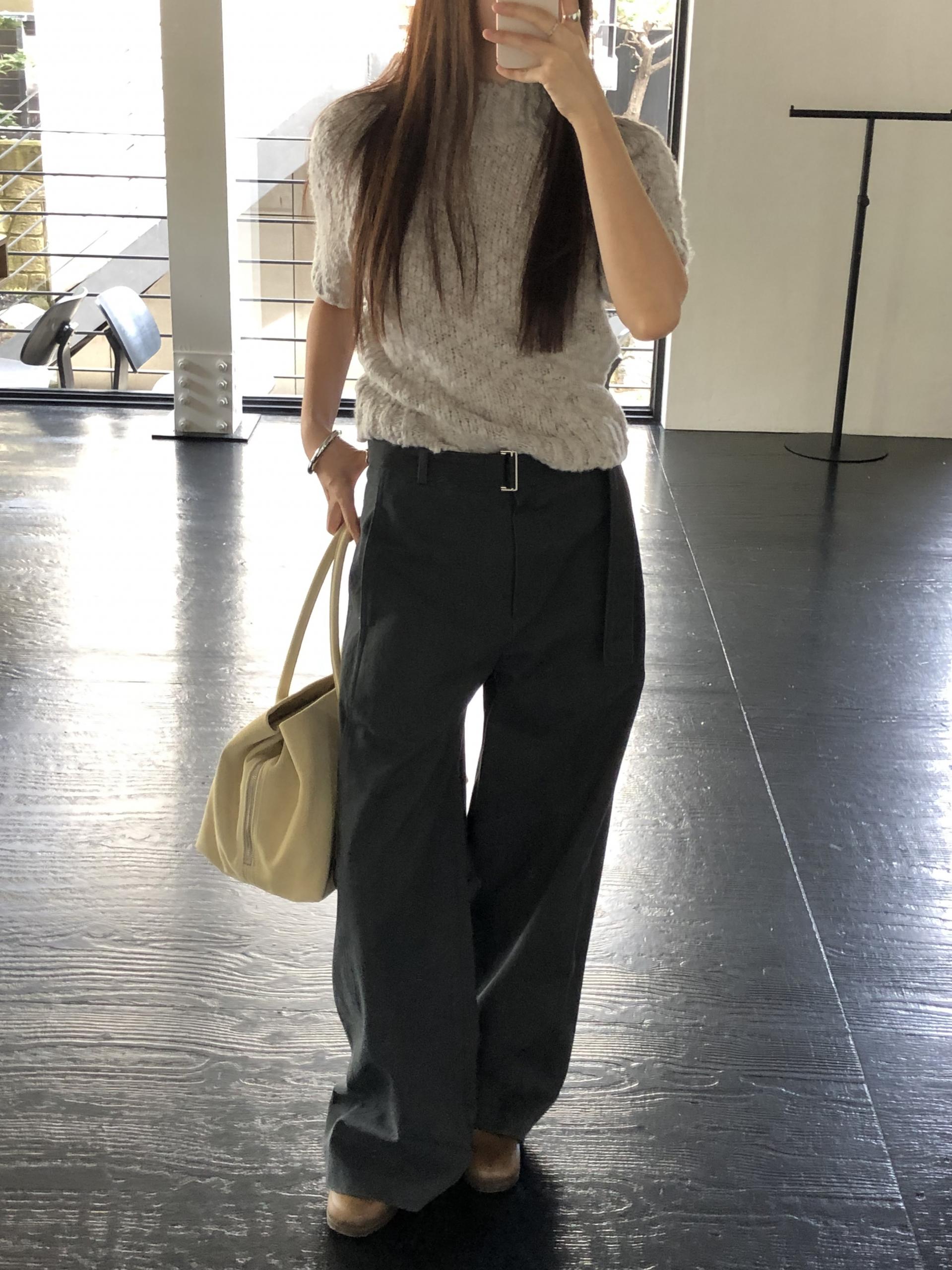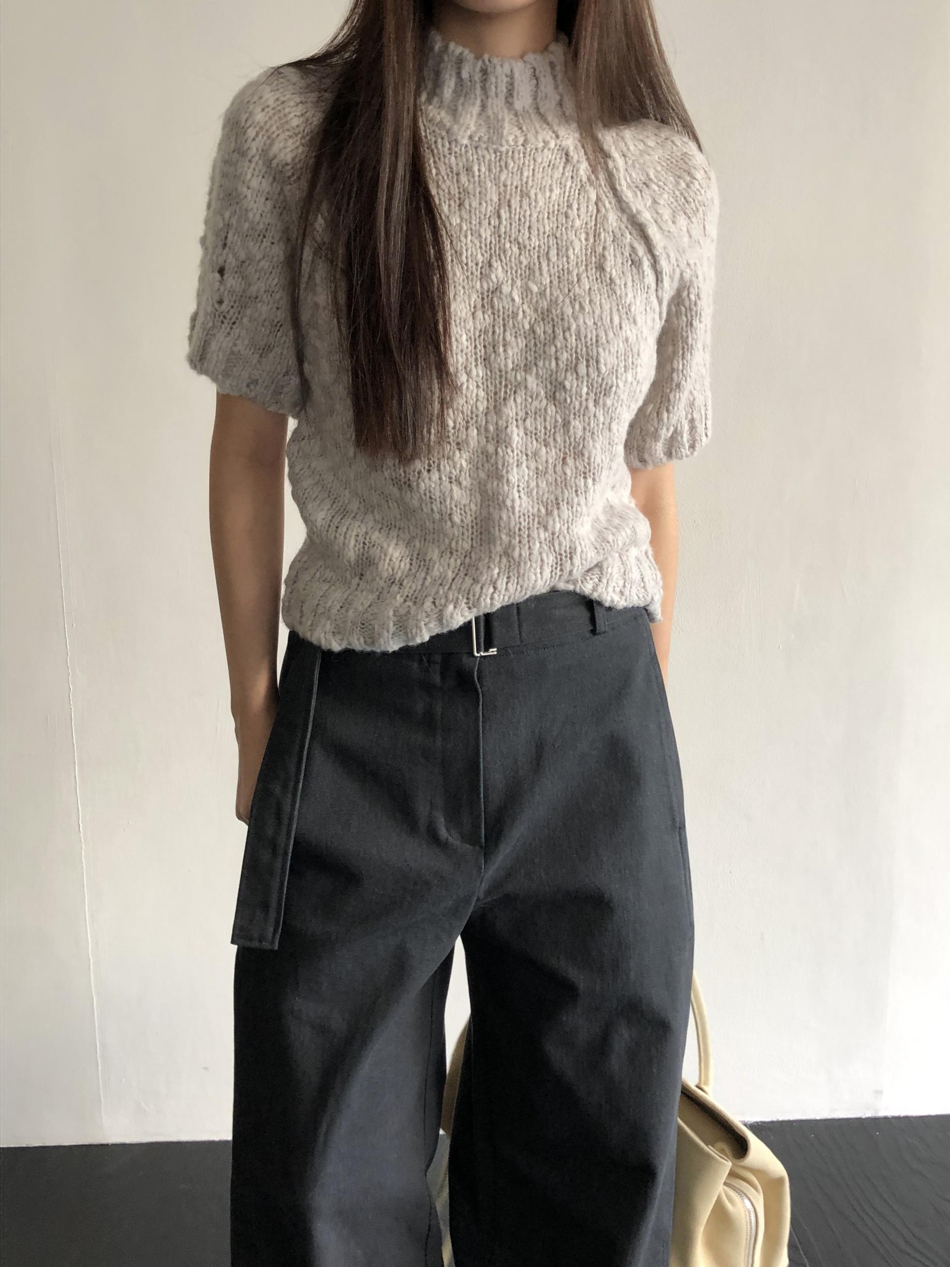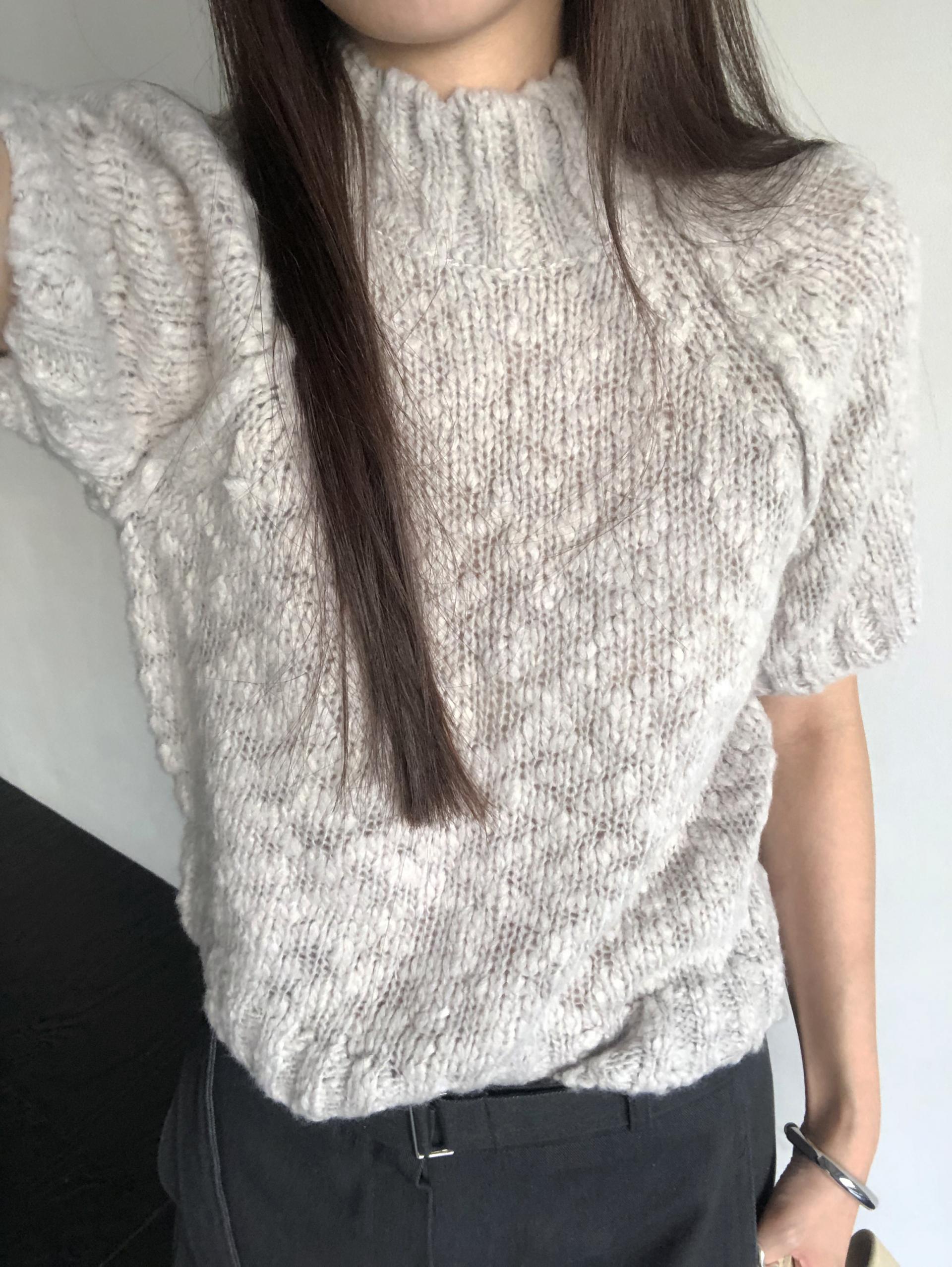 은은하게 살아있는 원사의 굴곡이 주는 텍스쳐가 단조롭지 않고, 포인트가 되어줍니다. 전체적으로는 클래식한 반하이넥의 반소매 니트 형태를 띄지만 몽글몽글 소재와 이에 맞는 내추럴한 컬러감이 더해져 매력적이에요.