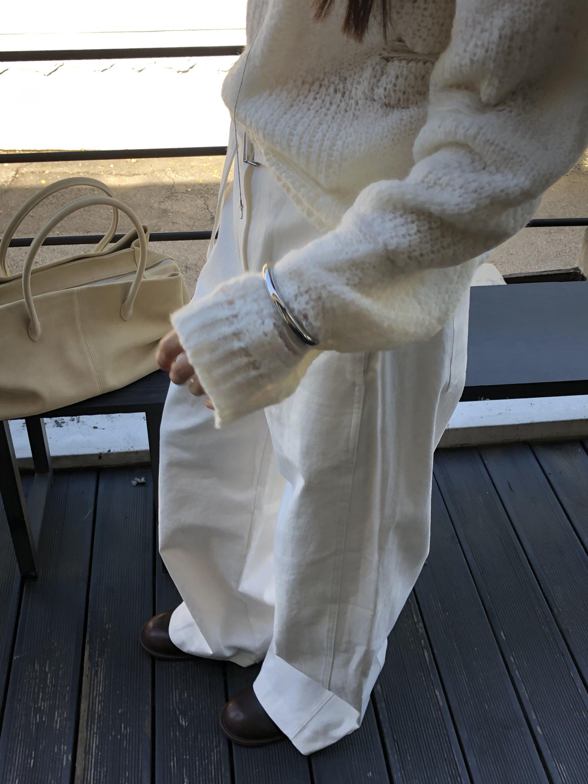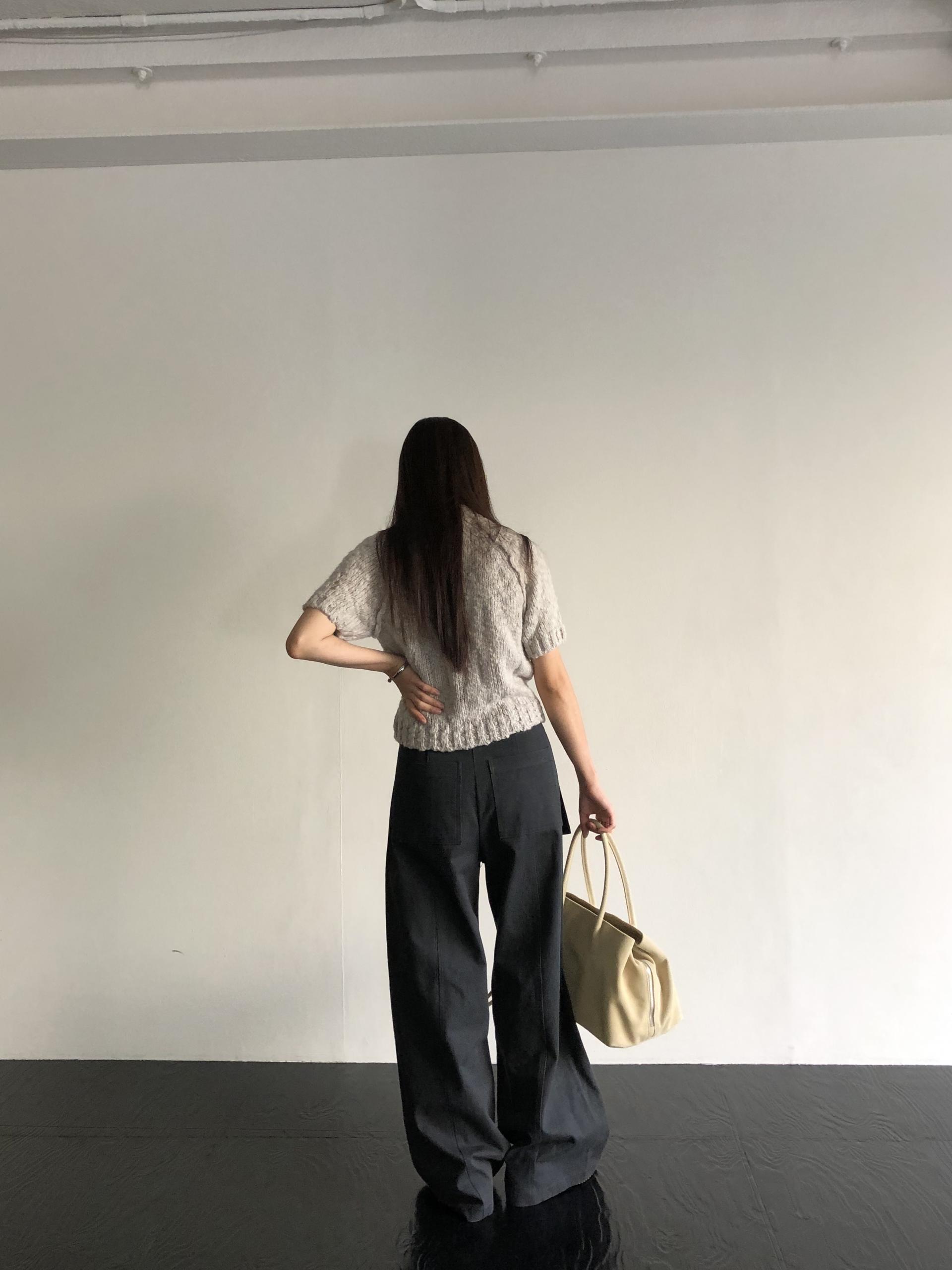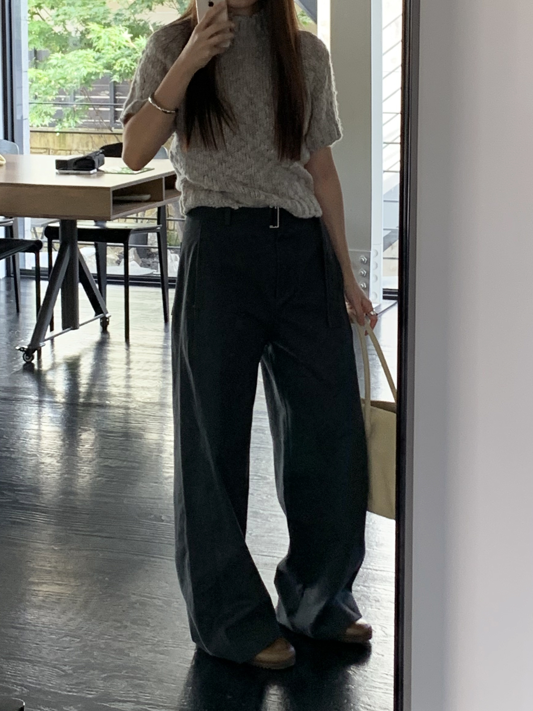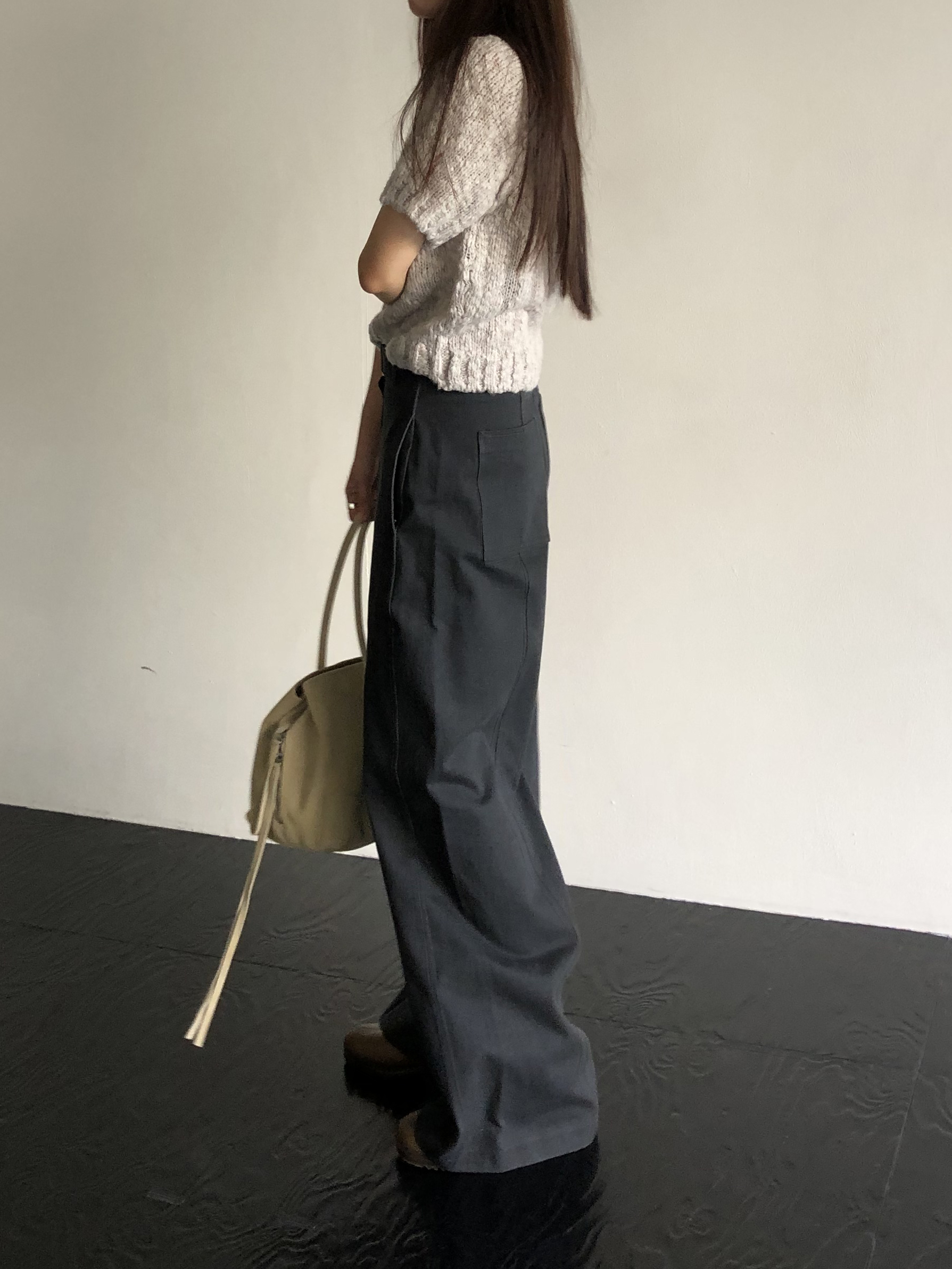 프론트에 절개선이 들어가 자연스러운 구조감이 느껴지면서, 와이드한 핏이 투박하지 않고 예쁘게 연출됩니다. 뒷라인 역시 큼직한 포켓을 따라 길게 떨어지는 절개 라인으로 다리가 더욱 곧고 길어보이며 깔끔해요.