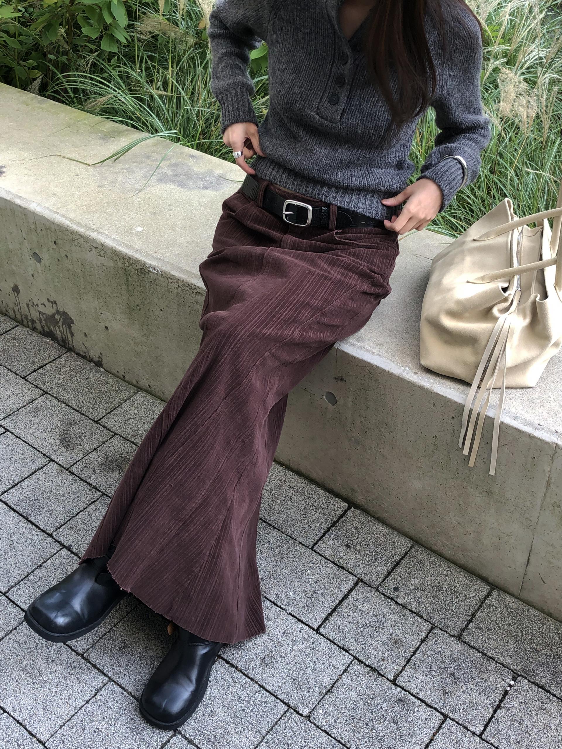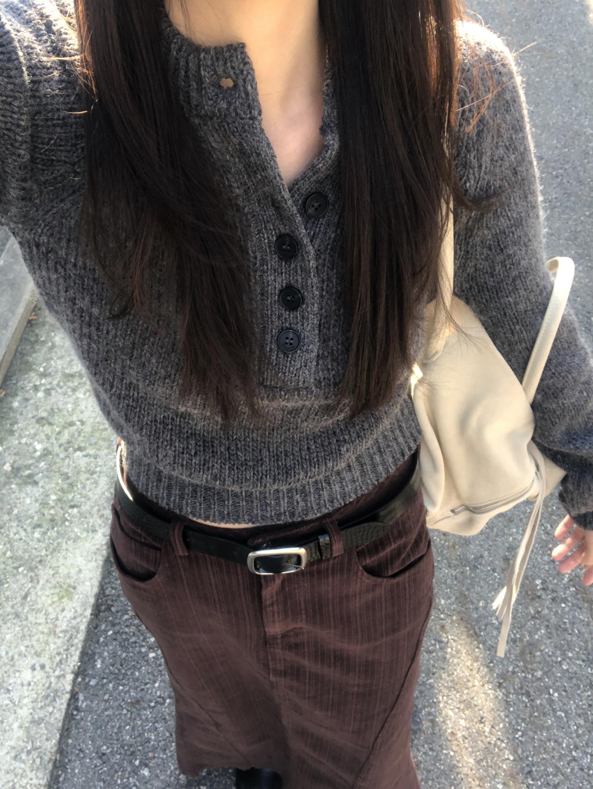 단추가 꽤나 깊게 디자인 되었기 때문에 단추를 어떻게 연출하느냐에 따라 달라지는 스타일링의 재미를 느낄 수 있어요. 레이어드 할 때는, 너무 두꺼운 아이템을 매치하는 것보다는 얇은 블라우스나 탑을 매치해 은근한 디테일을 더한 룩을 추천드립니다 -!