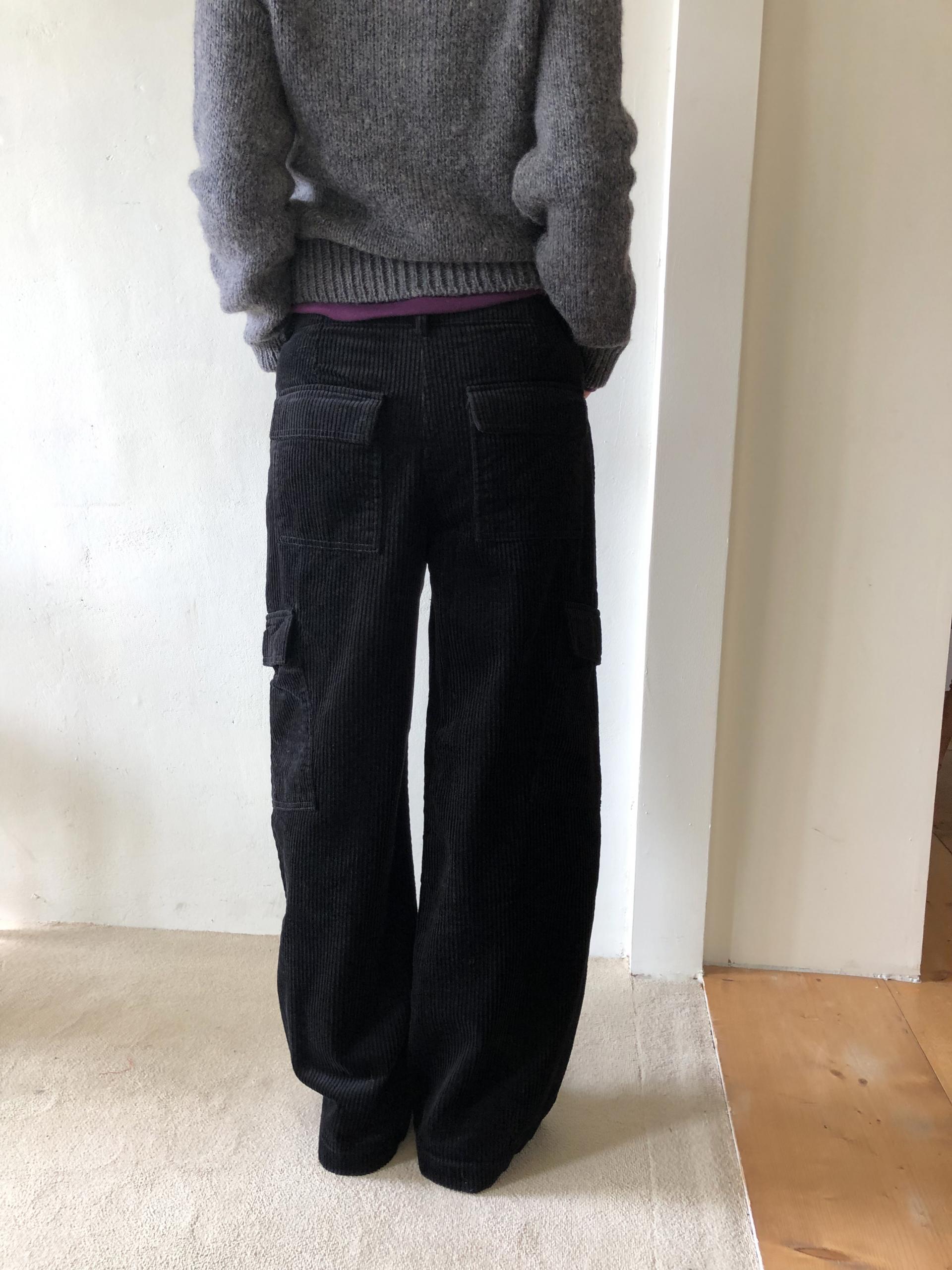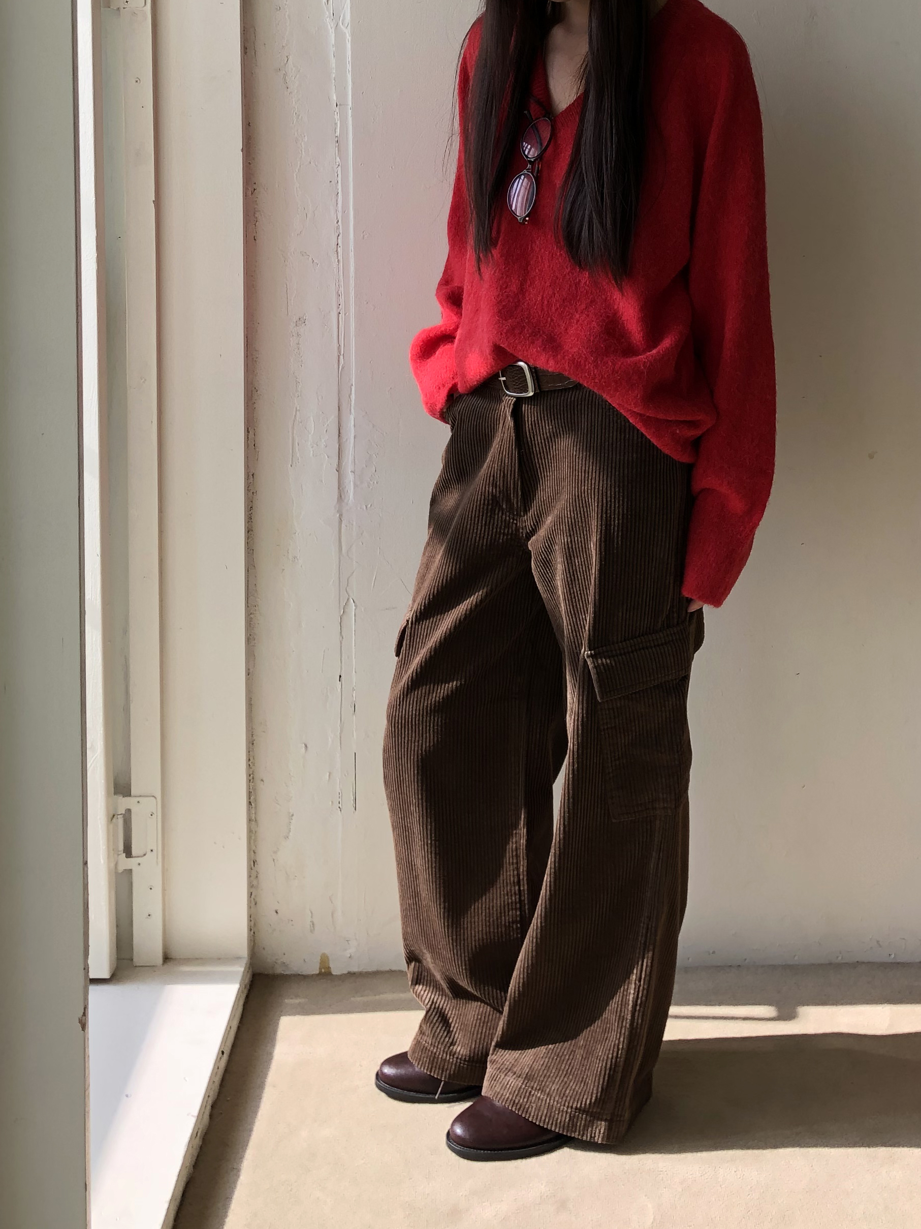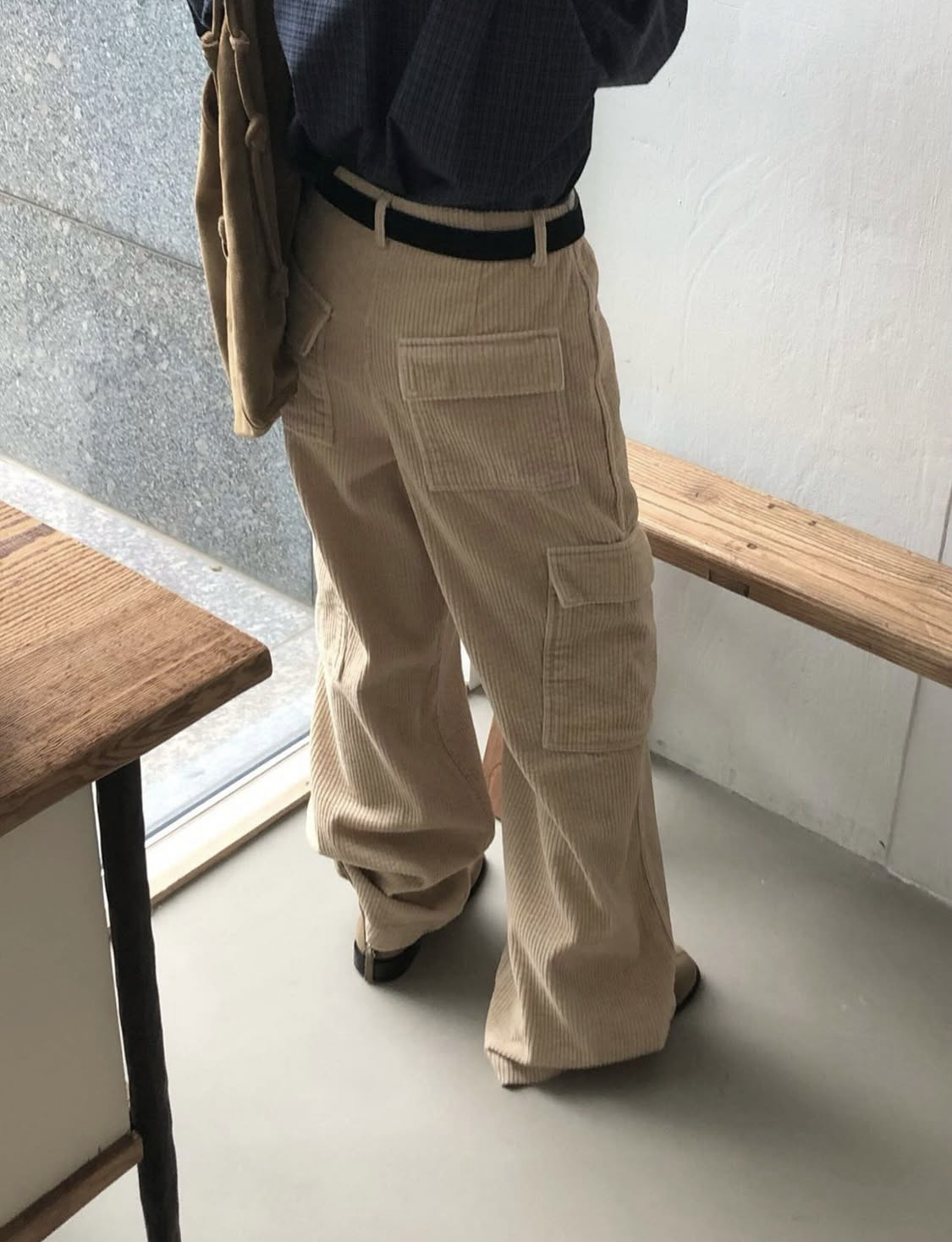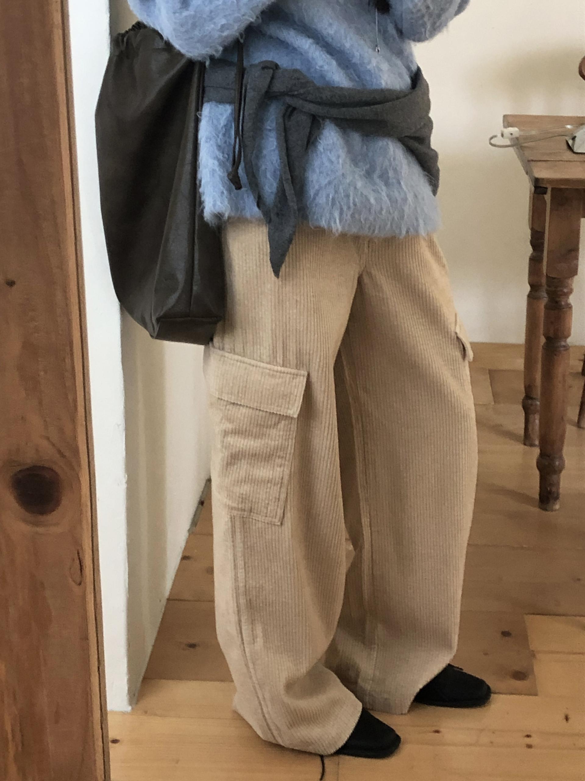 팬츠의 질감이 만드는 포근함에 더해진 카고 포켓 디자인이 팬츠의 무드를 한층 더 쿨하게 만들어줍니다. 볼드한 포켓 디테일이 돋보여요.