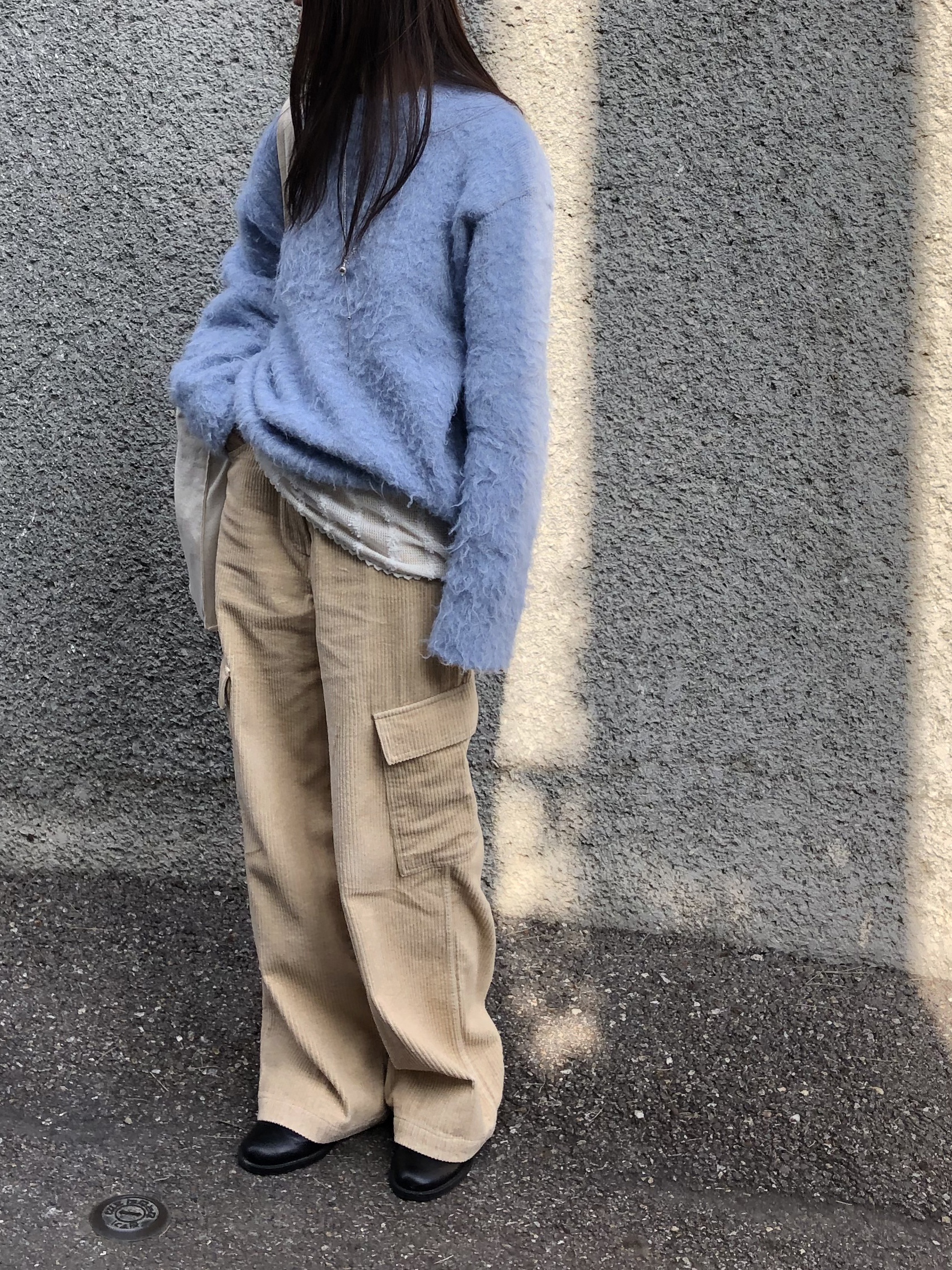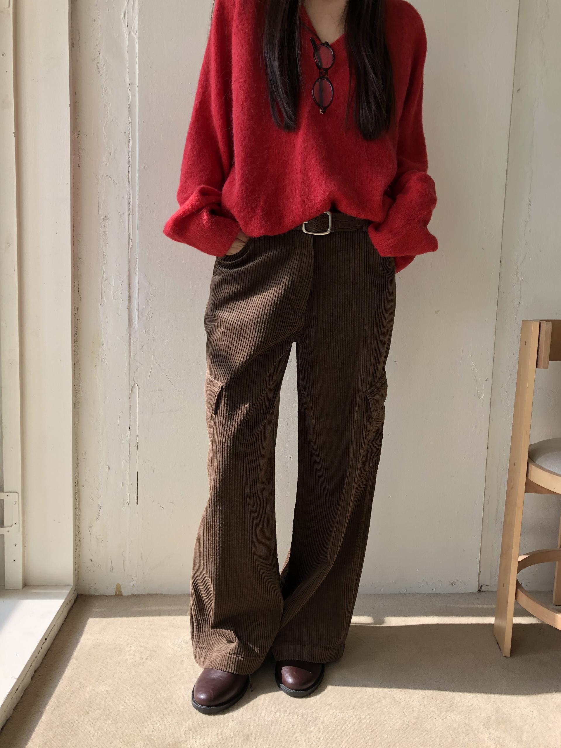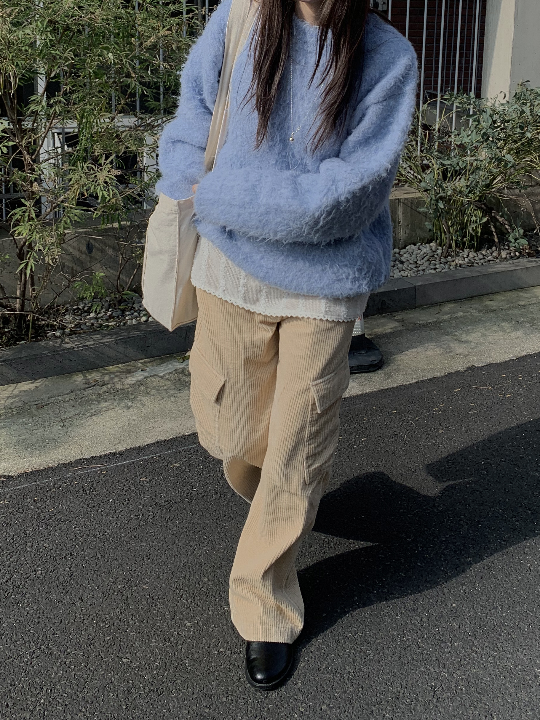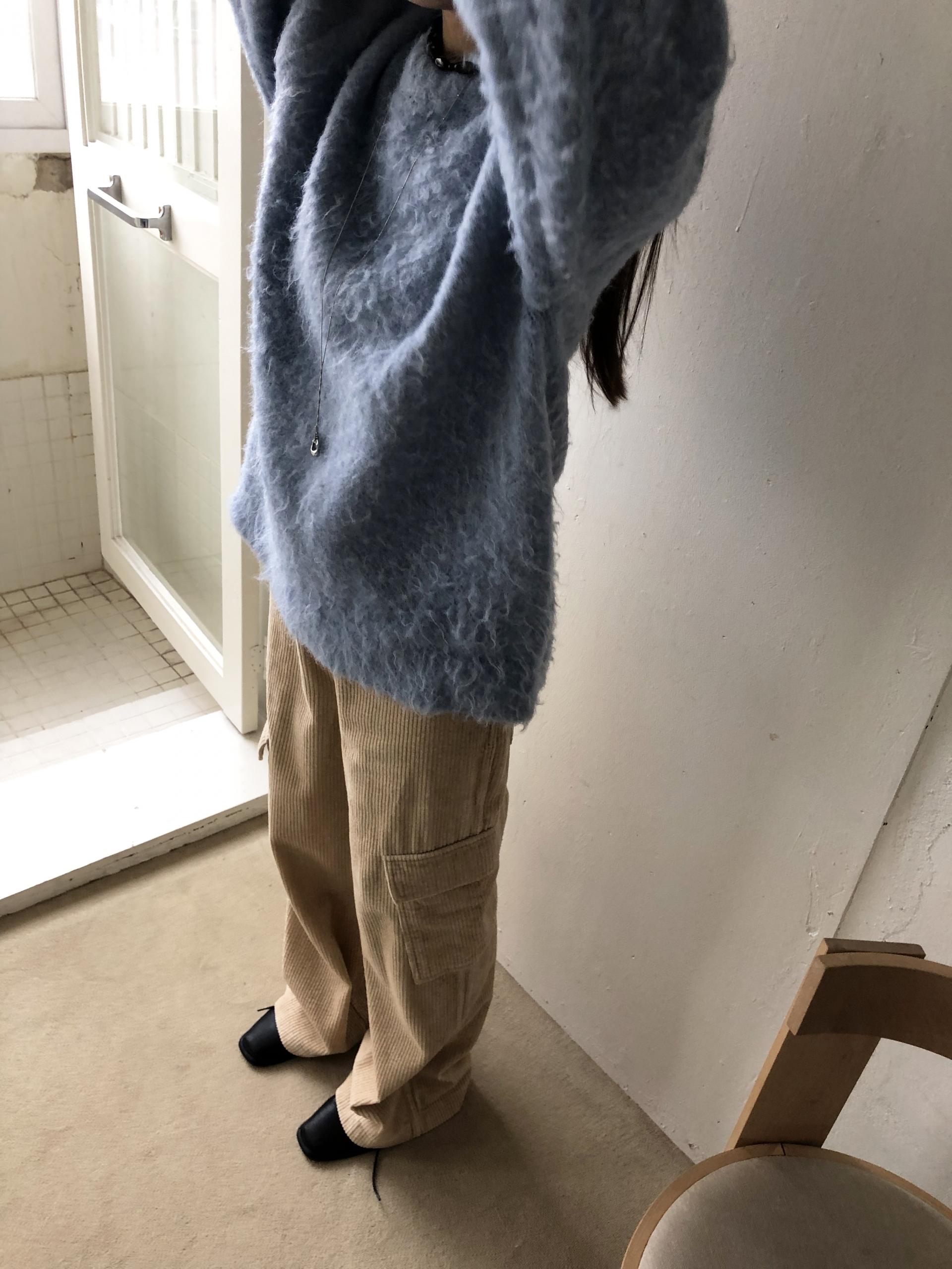 팬츠의 질감이 만드는 포근함에 더해진 카고 포켓 디자인이 팬츠의 무드를 한층 더 쿨하게 만들어줍니다. 볼드한 포켓 디테일이 돋보여요.