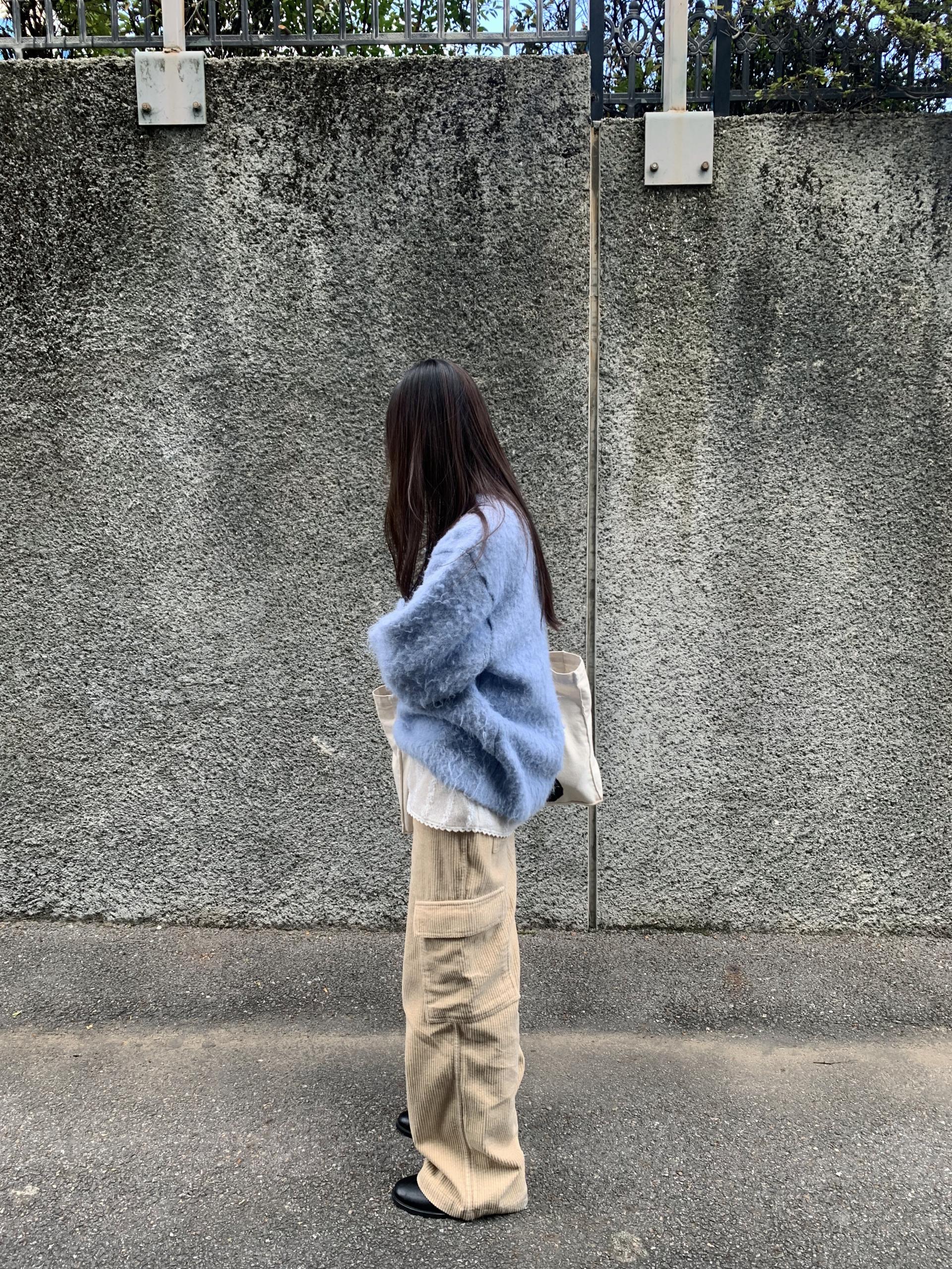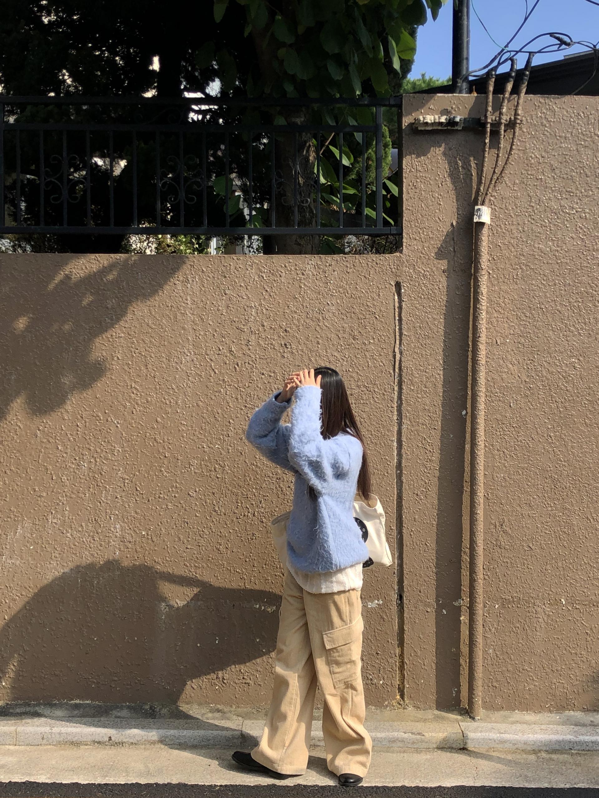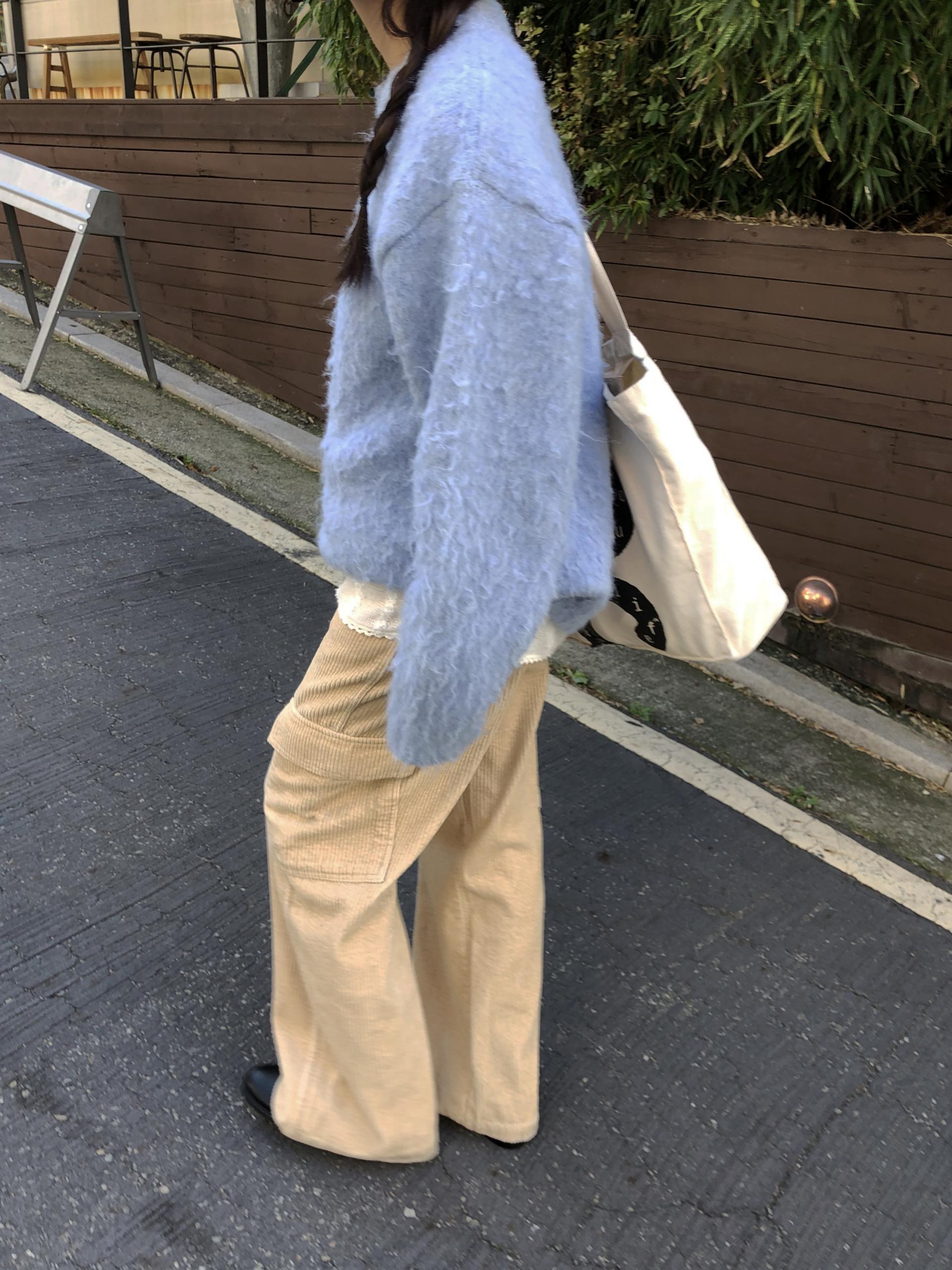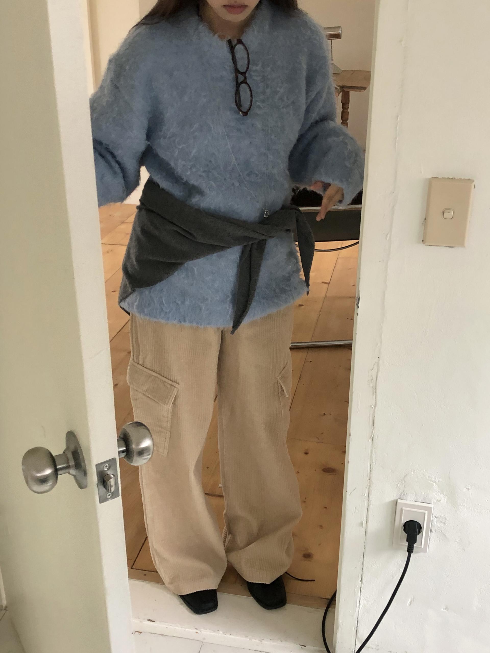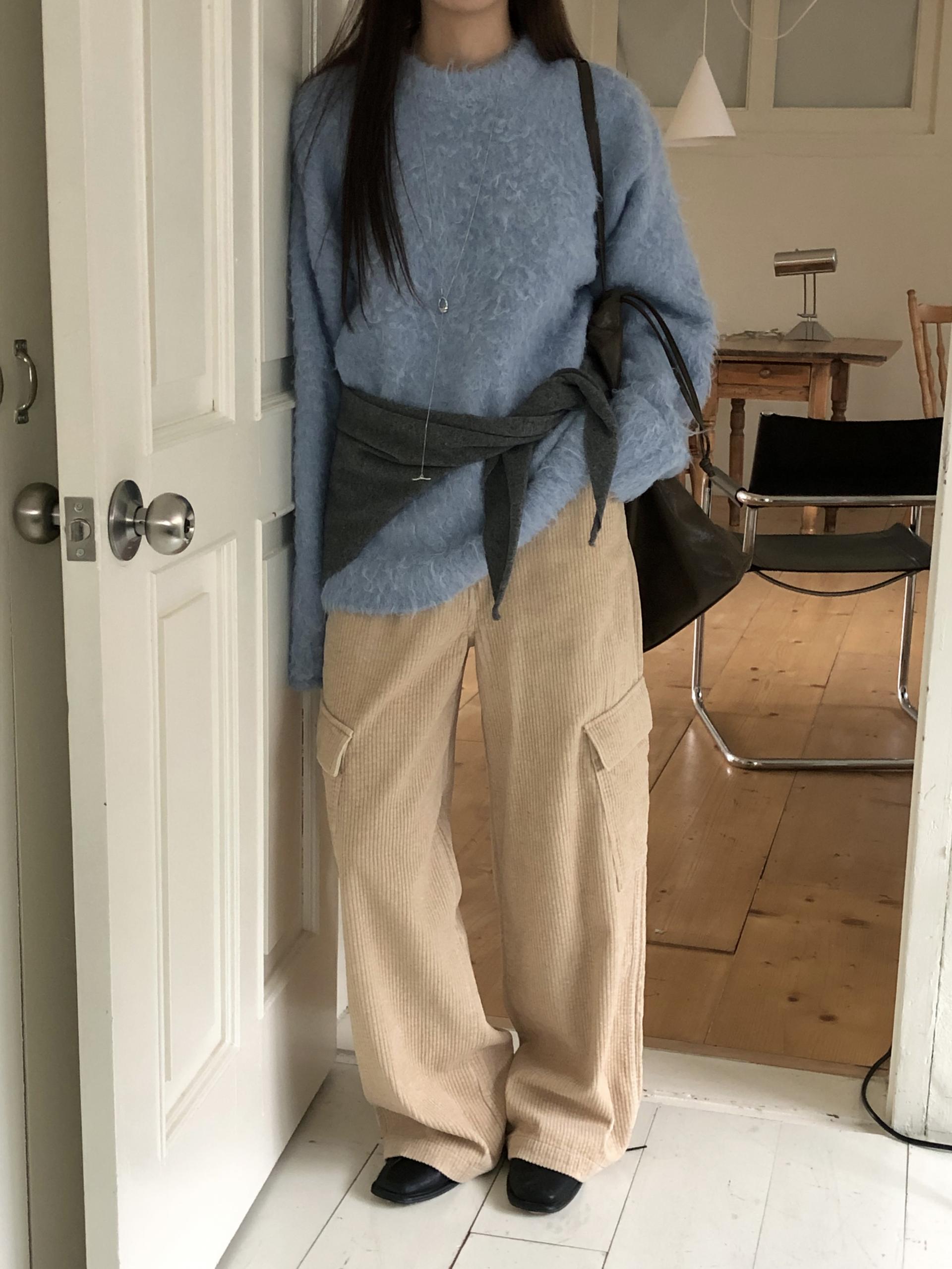 팬츠의 질감이 만드는 포근함에 더해진 카고 포켓 디자인이 팬츠의 무드를 한층 더 쿨하게 만들어줍니다. 볼드한 포켓 디테일이 돋보여요.