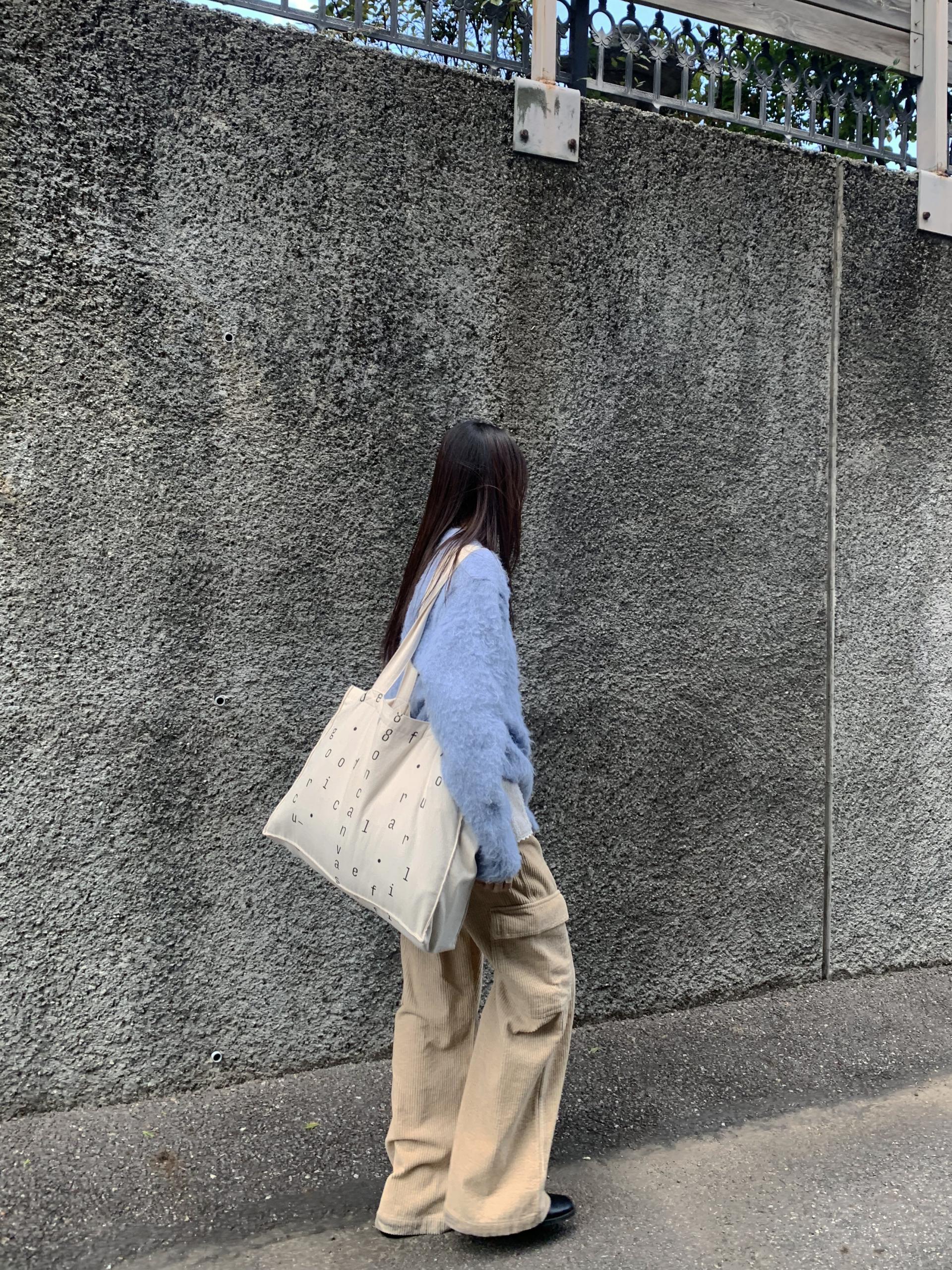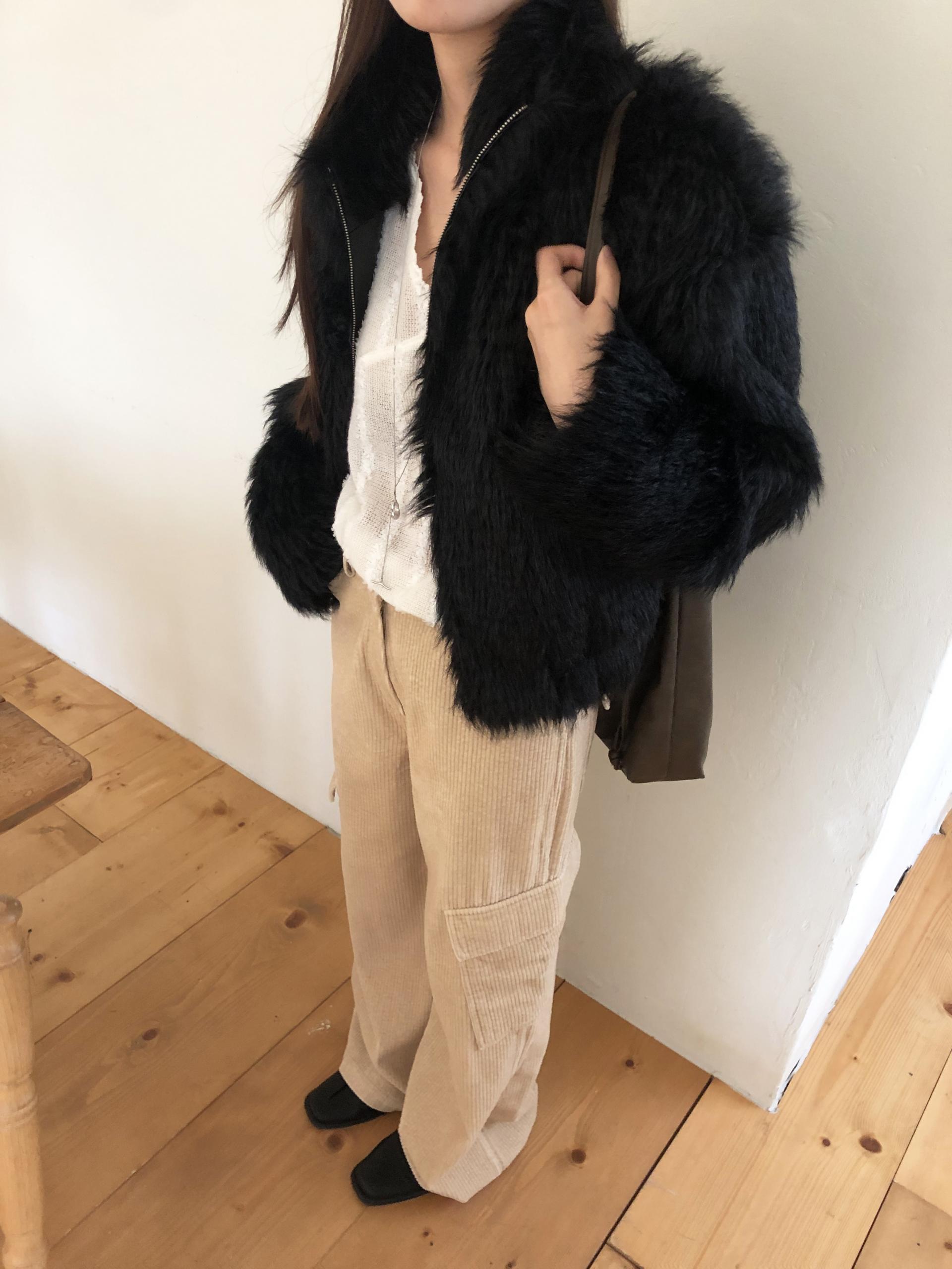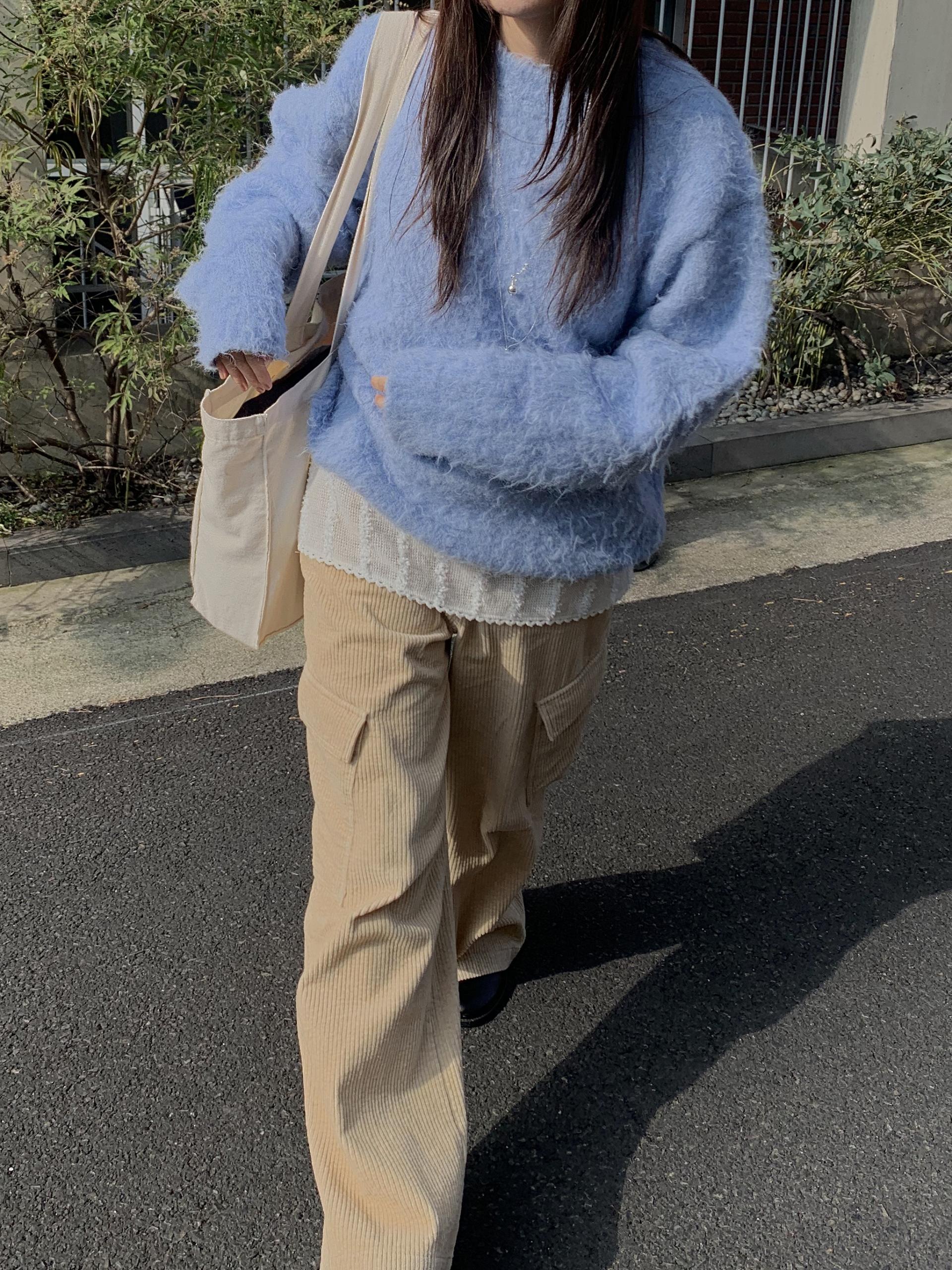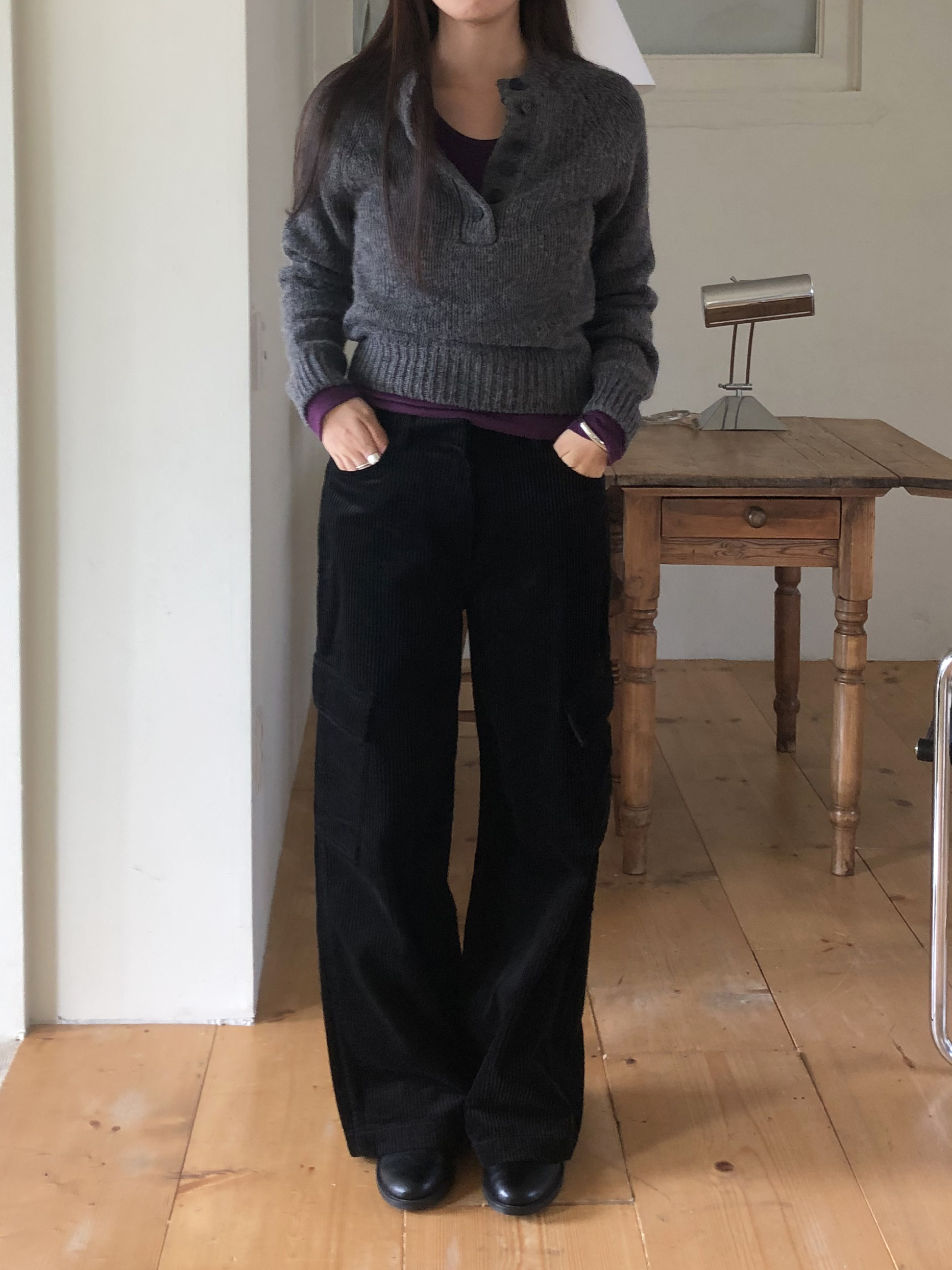 팬츠의 질감이 만드는 포근함에 더해진 카고 포켓 디자인이 팬츠의 무드를 한층 더 쿨하게 만들어줍니다. 볼드한 포켓 디테일이 돋보여요.