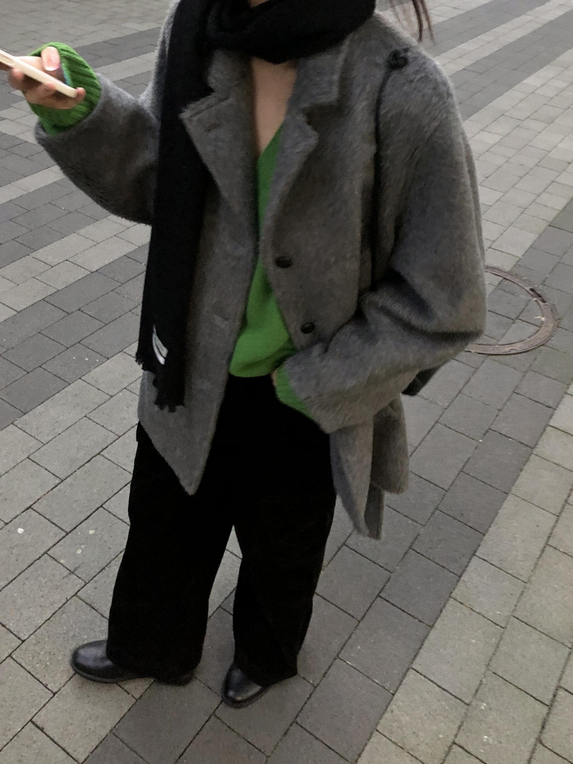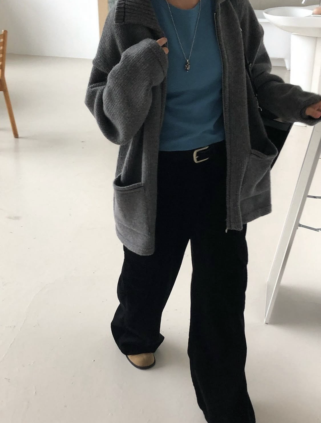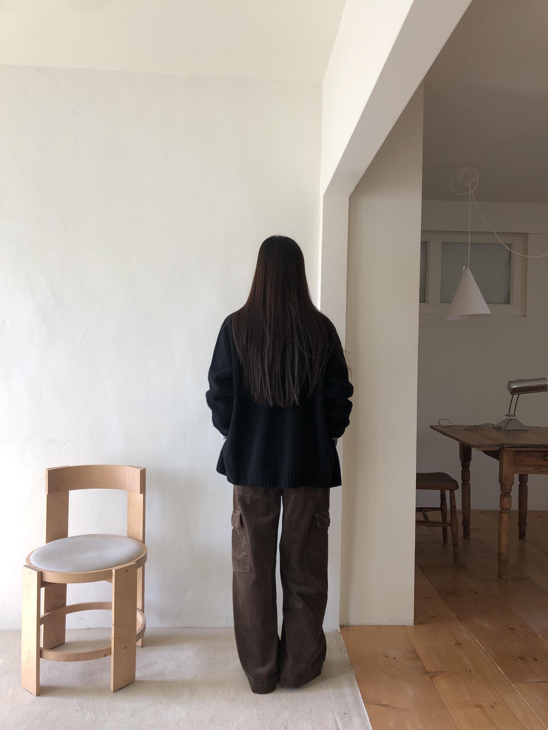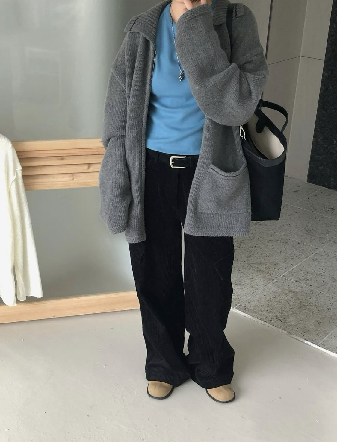 전체적으로 툭 떨어지는 실루엣에 루즈한 핏으로 여유롭게 입기 좋습니다. 도톰한 코듀로이의 골 짜임이 느껴져요. 두께감도 도톰한 편이라 한겨울까지 문제 없을 거예요.
