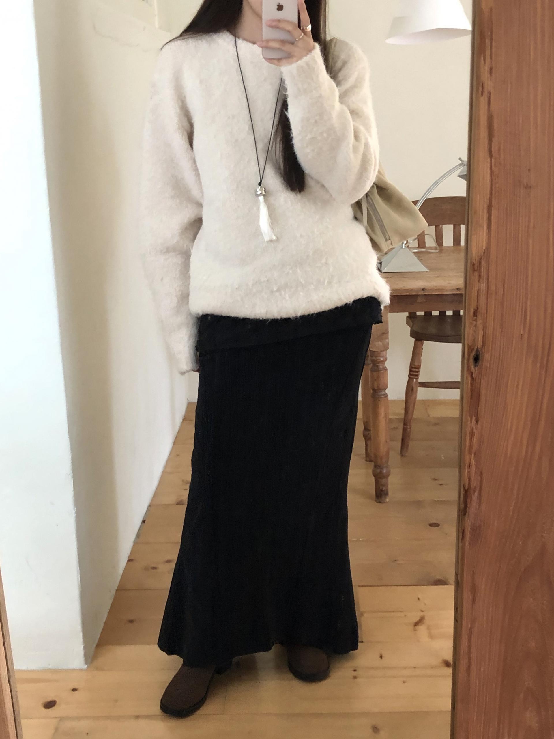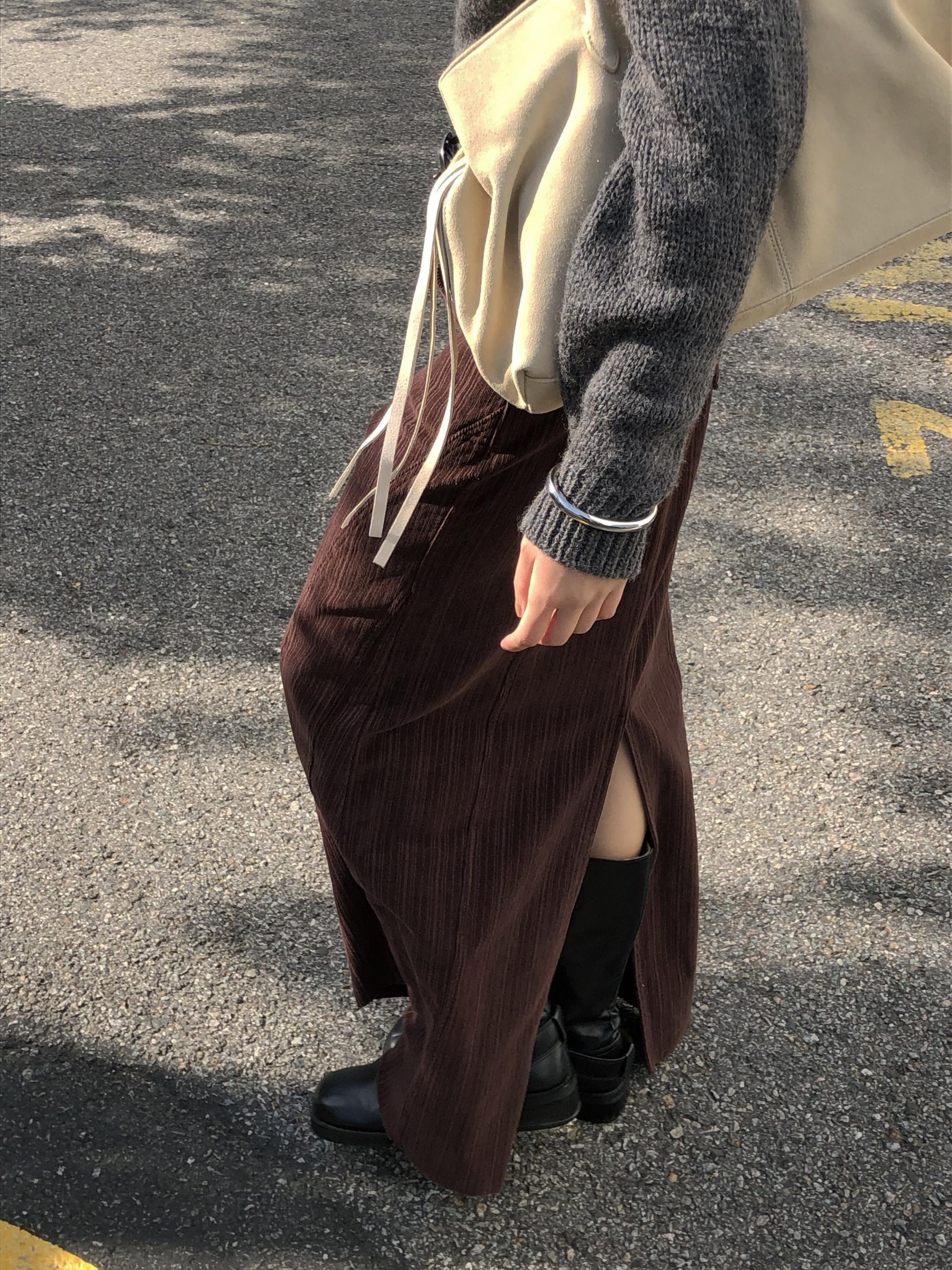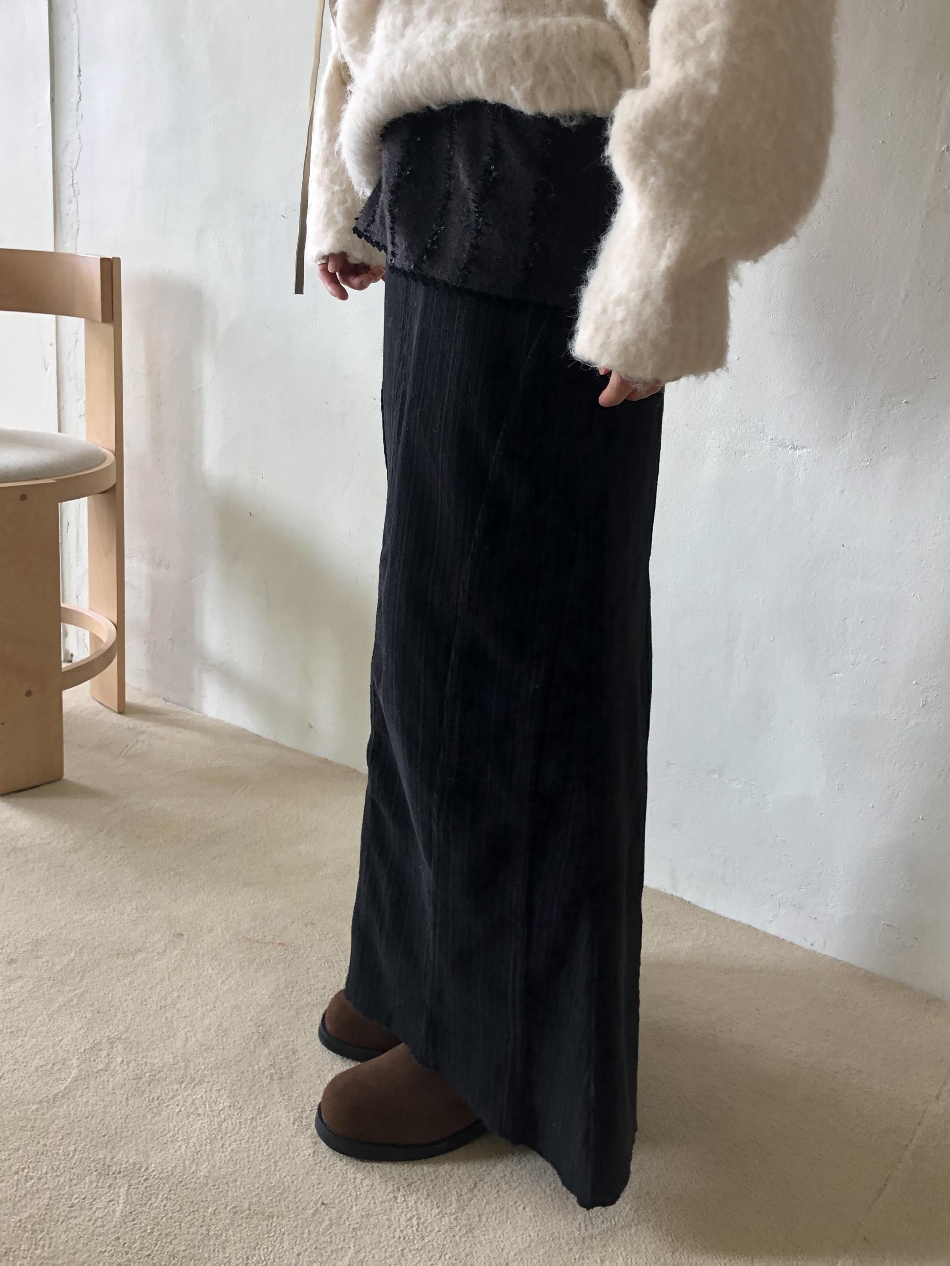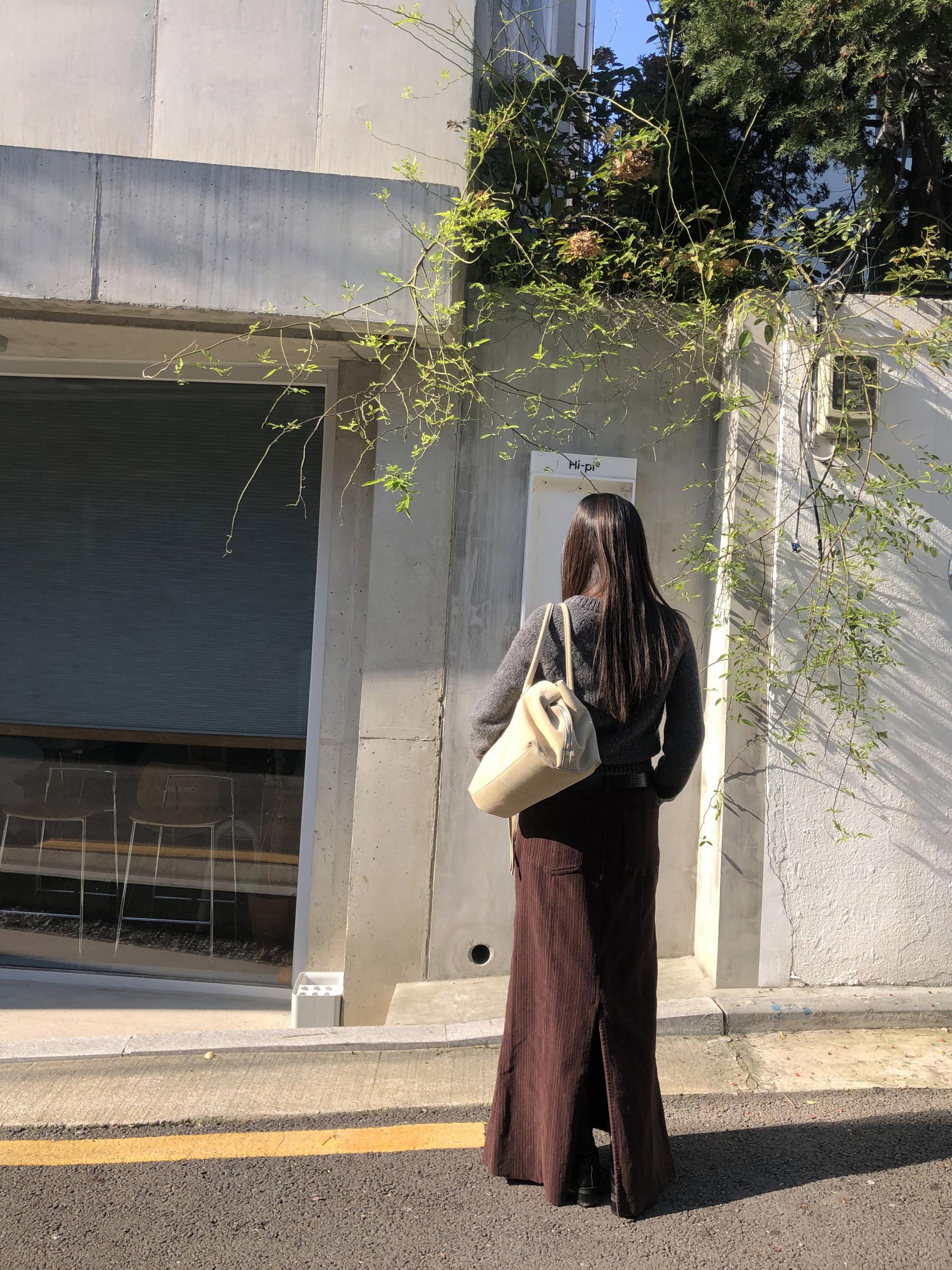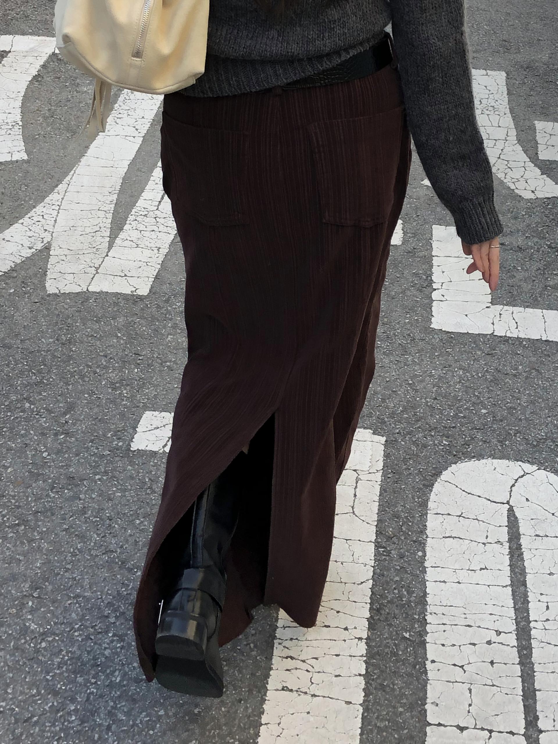 도톰하고 신축성 좋은 원단을 사용했어요. 롱 스커트일수록 원단이 뻣뻣하면 걷는 게 일인데, 뒷트임까지 있어서 편하게 착용 가능합니다.
