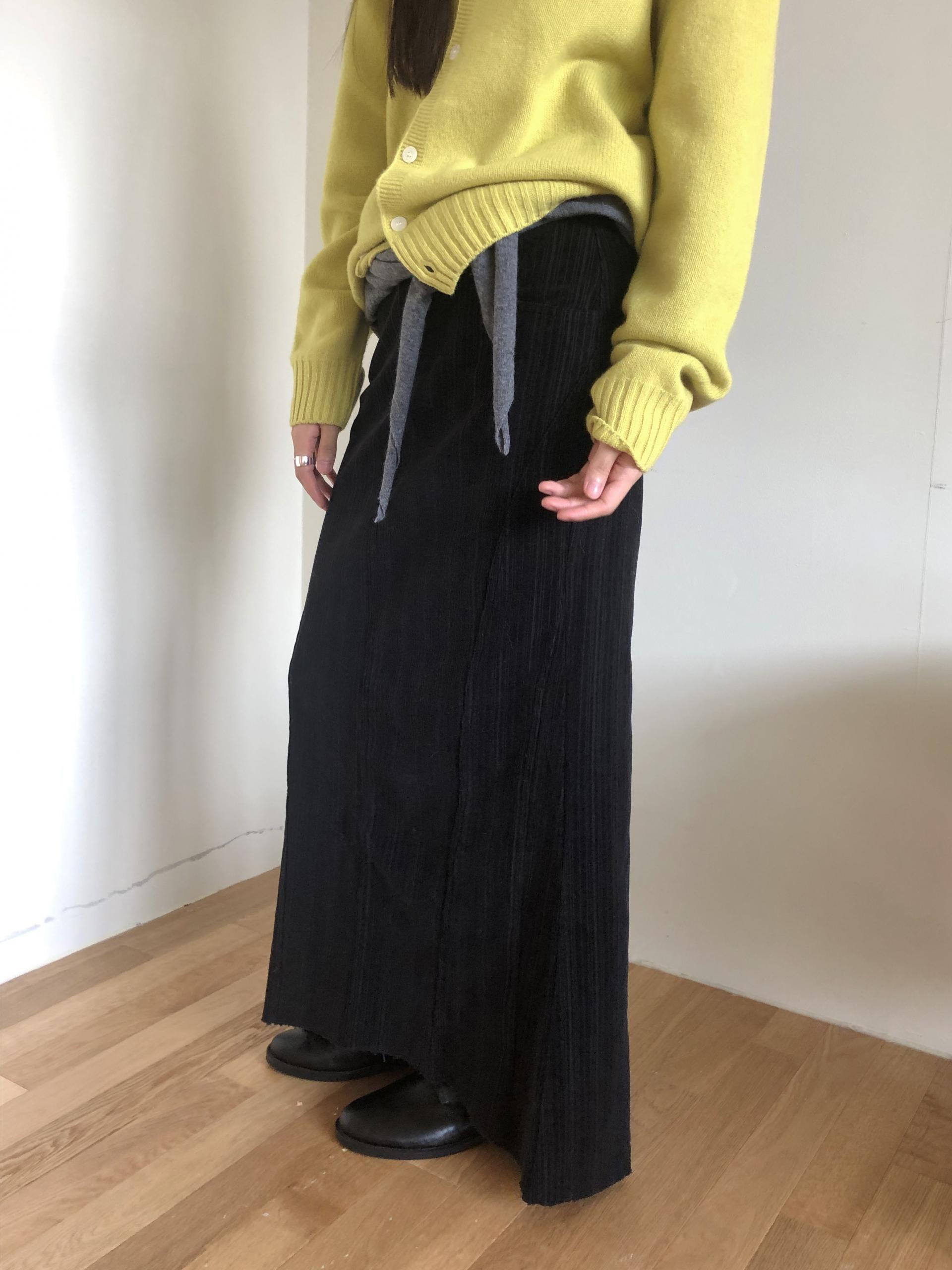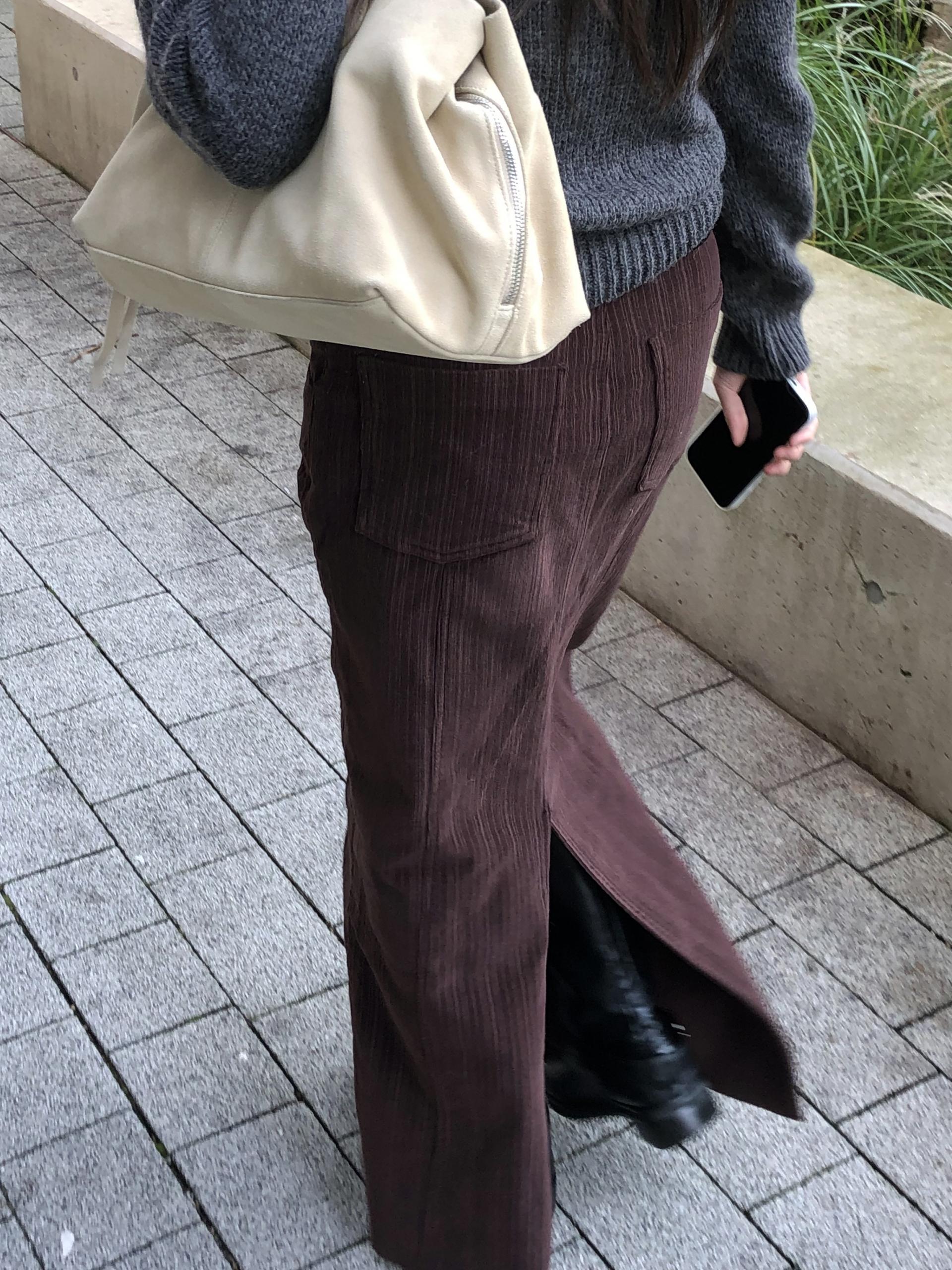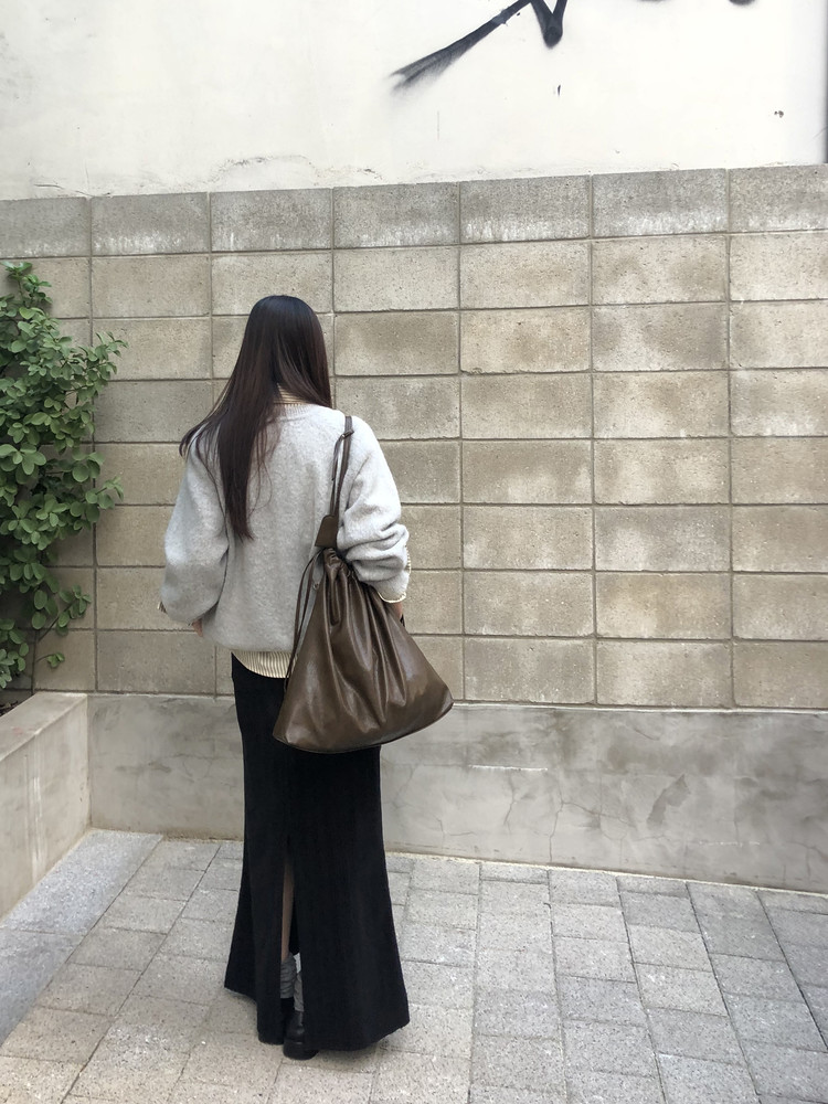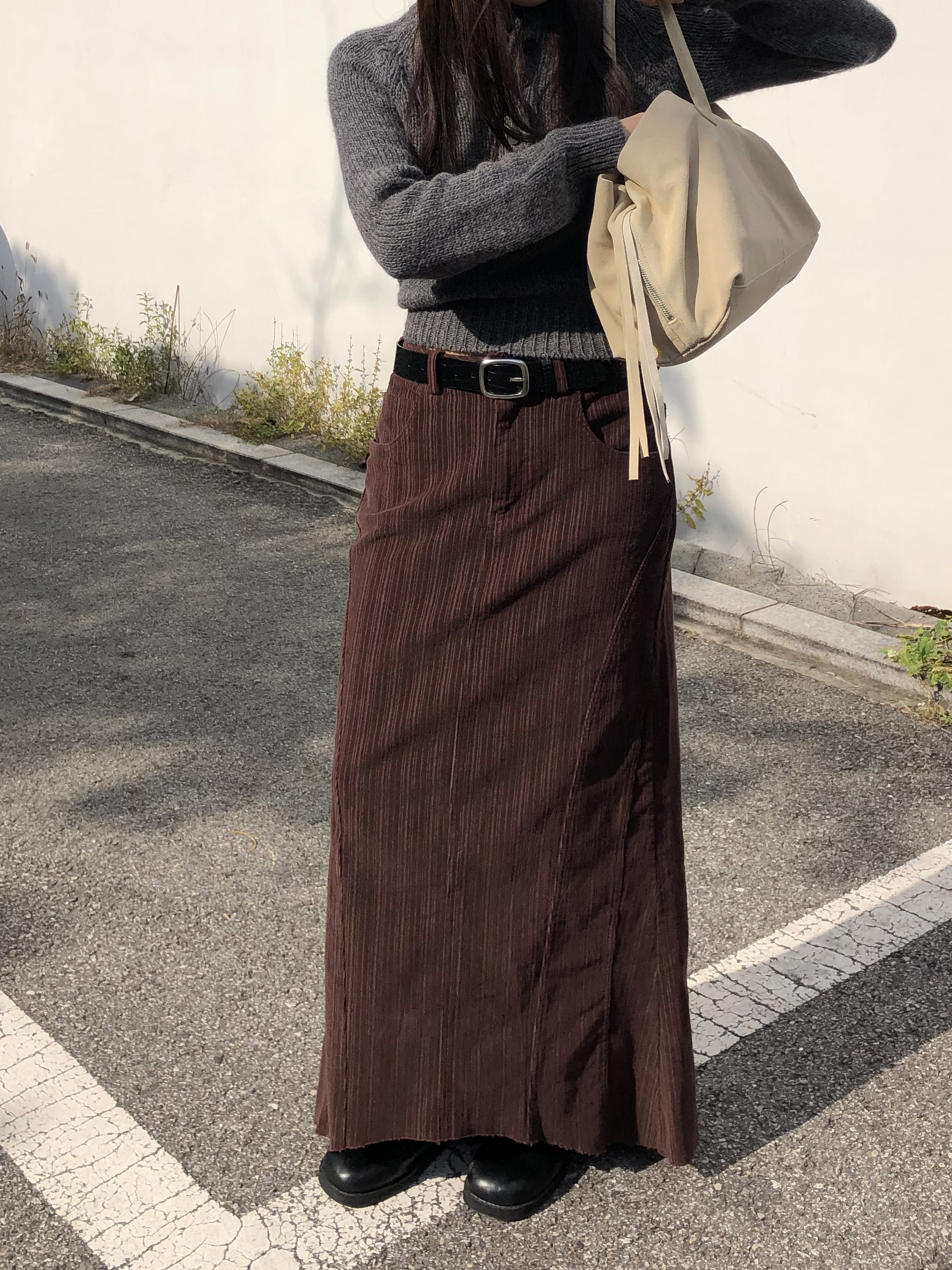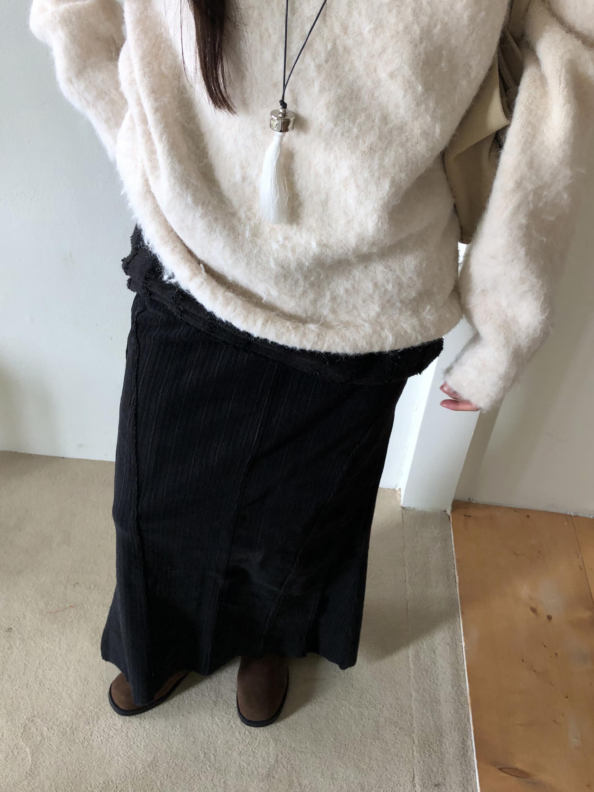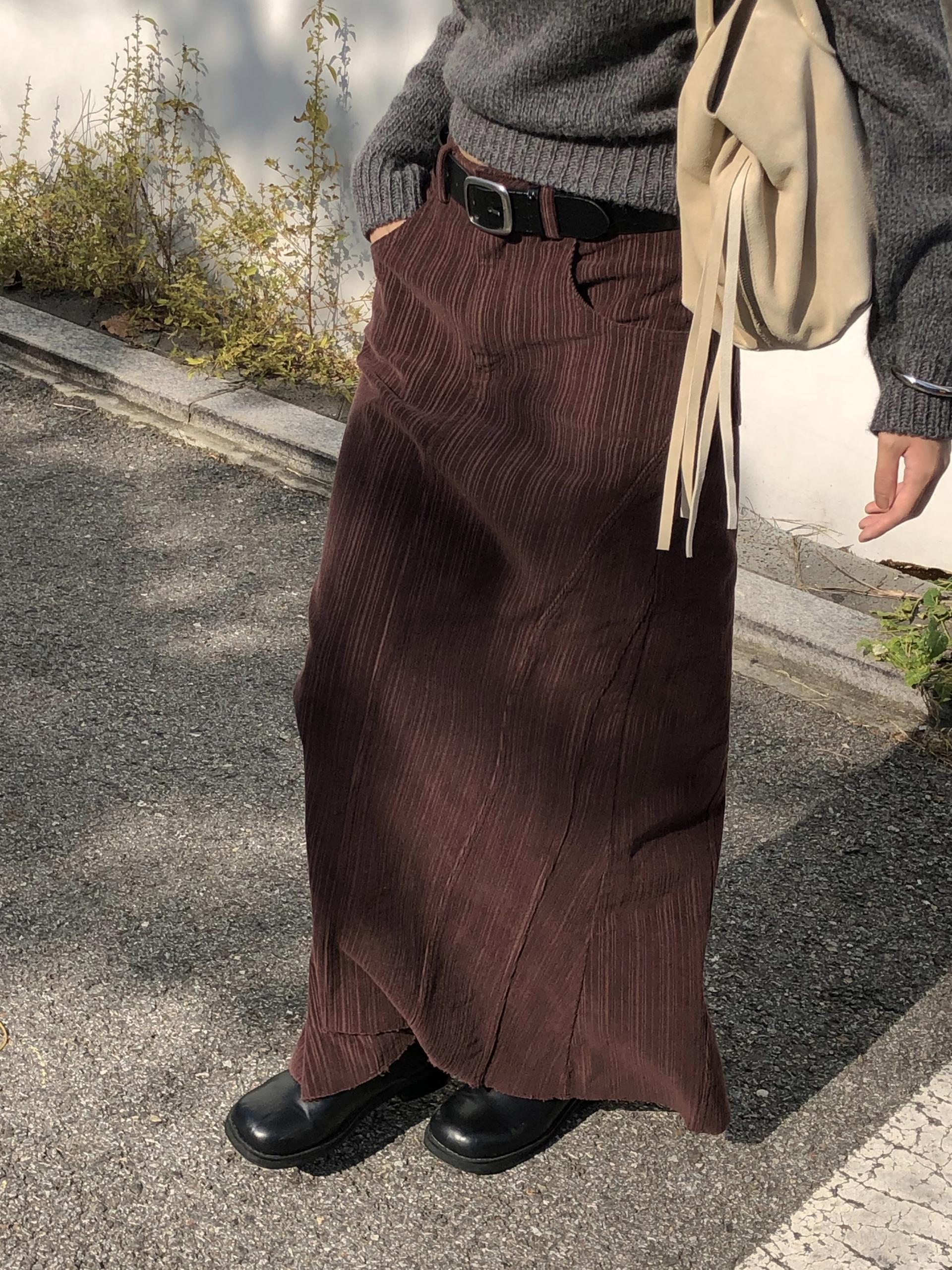 도톰하고 신축성 좋은 원단을 사용했어요. 롱 스커트일수록 원단이 뻣뻣하면 걷는 게 일인데, 뒷트임까지 있어서 편하게 착용 가능합니다.