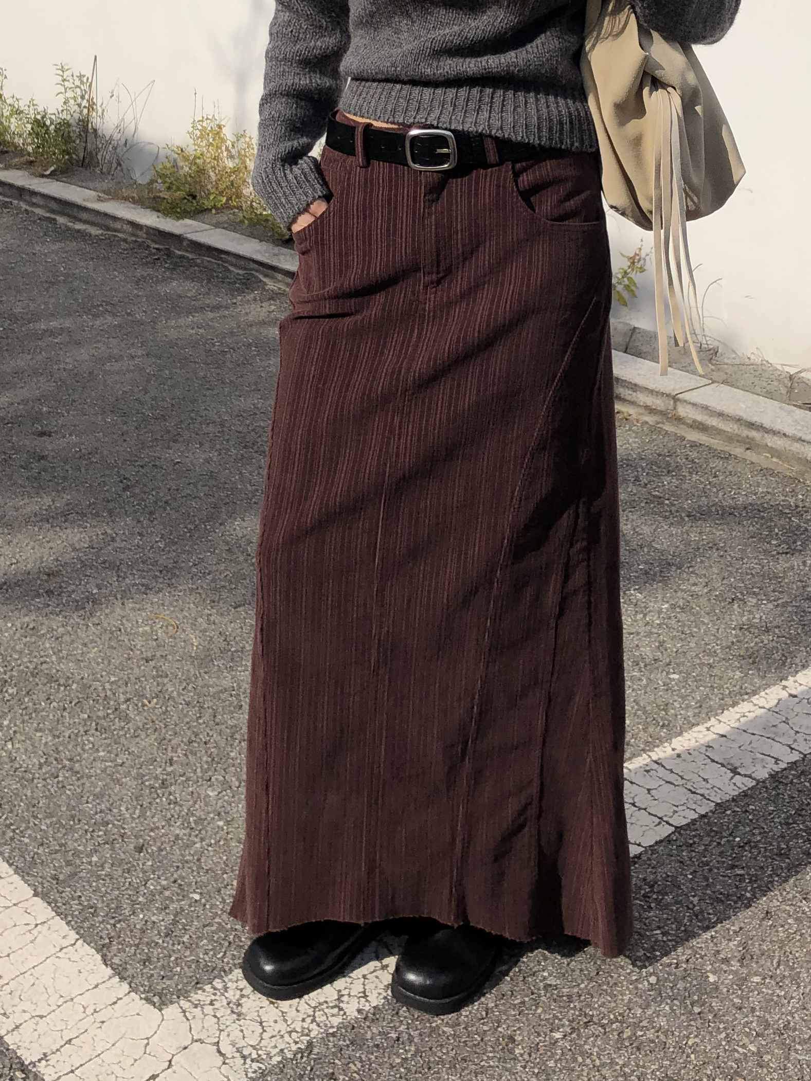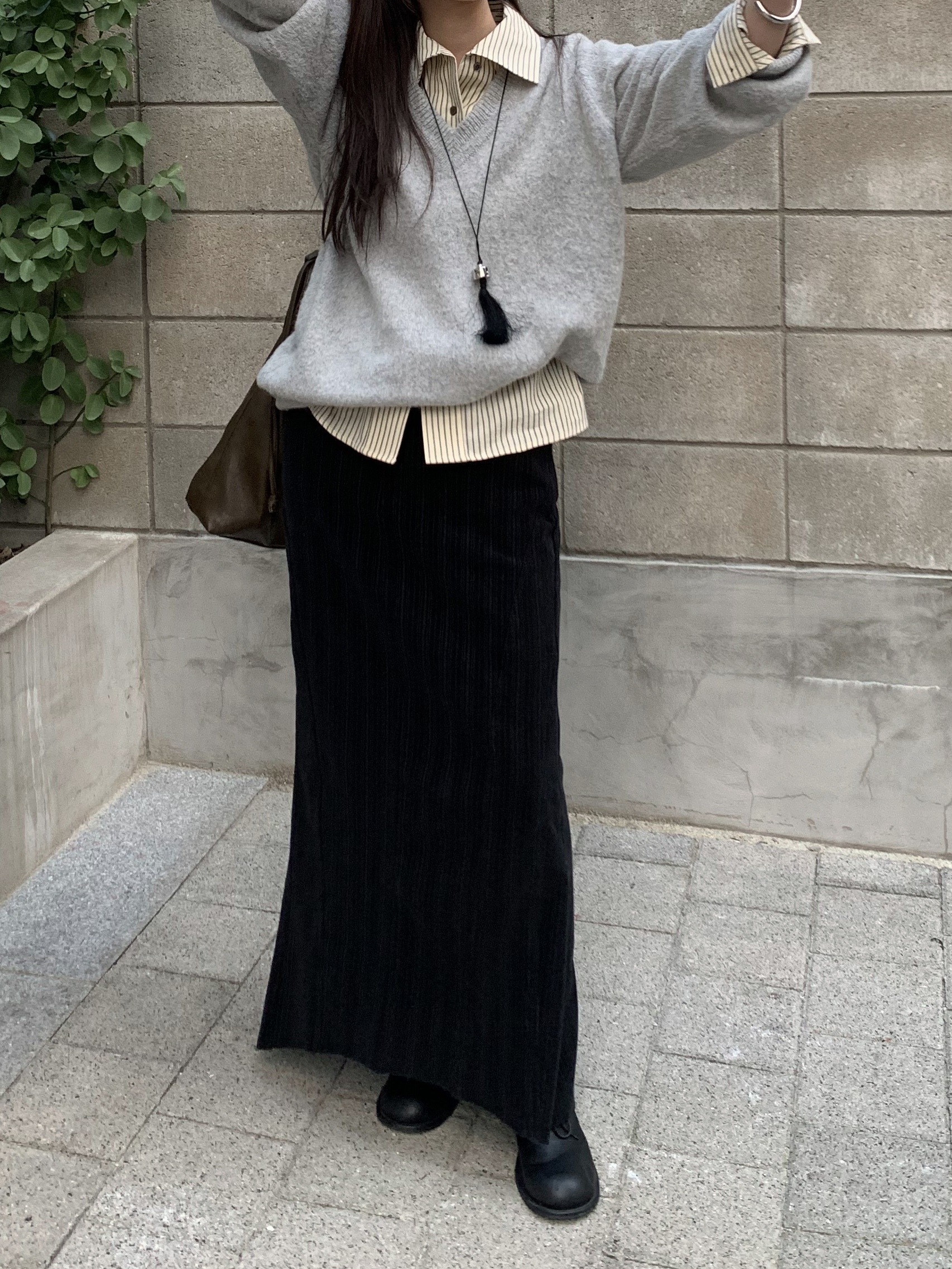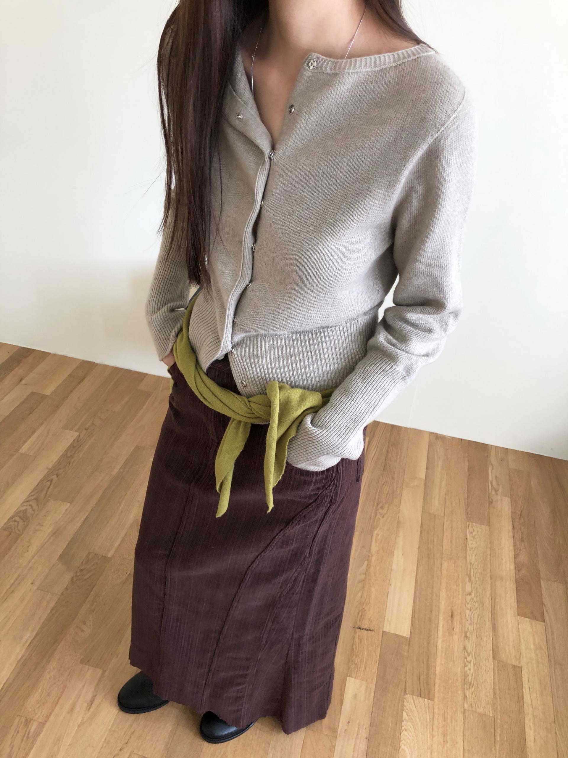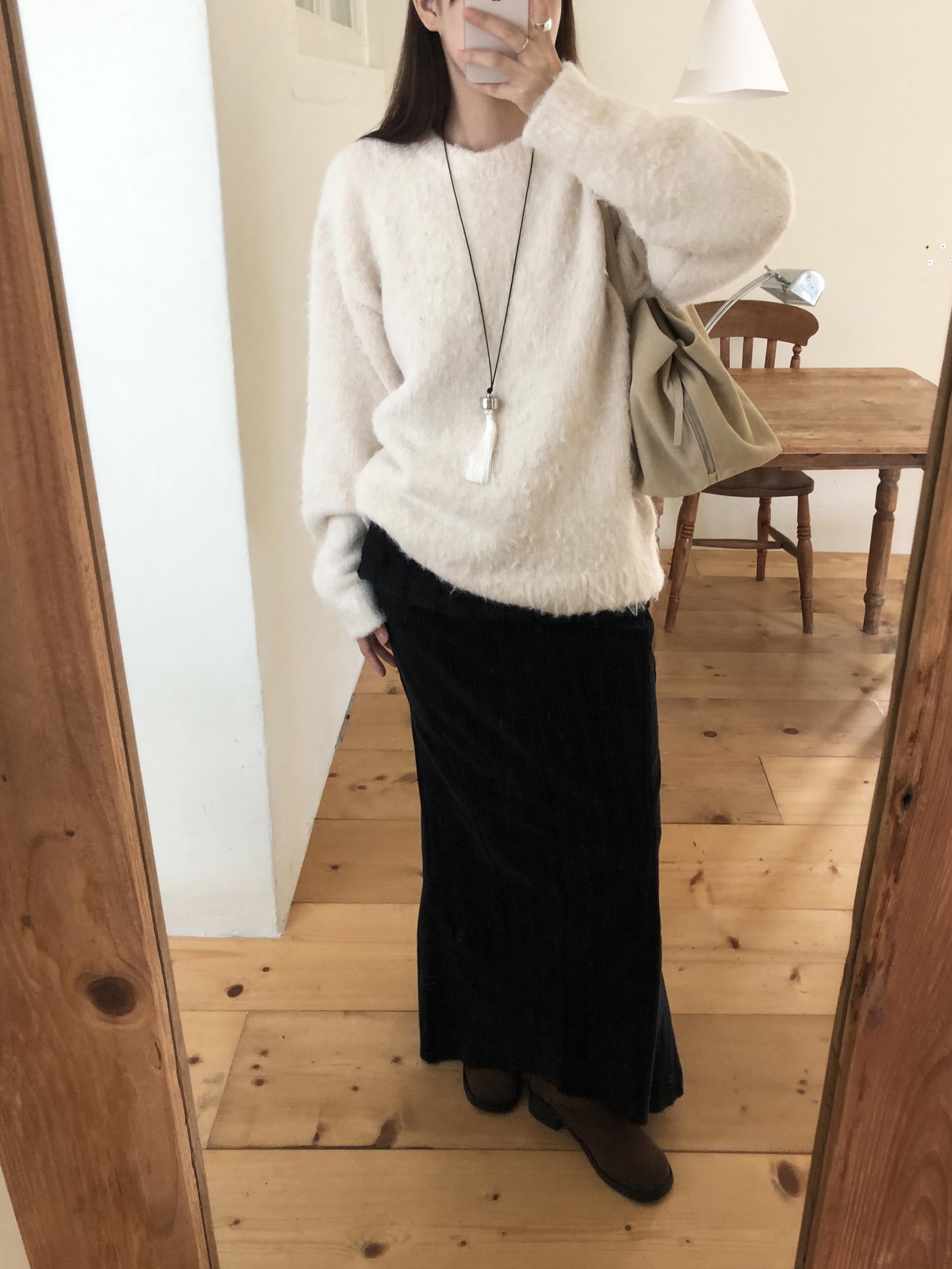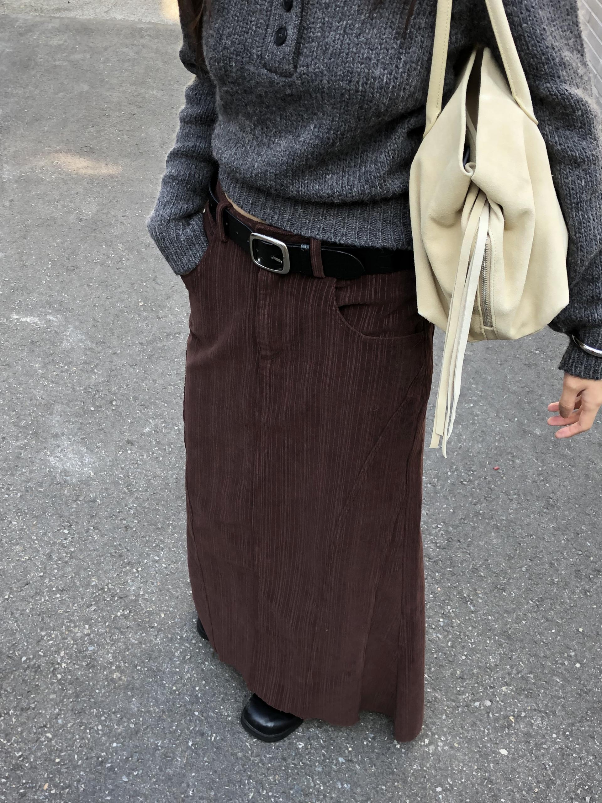 도톰하고 신축성 좋은 원단을 사용했어요. 롱 스커트일수록 원단이 뻣뻣하면 걷는 게 일인데, 뒷트임까지 있어서 편하게 착용 가능합니다.