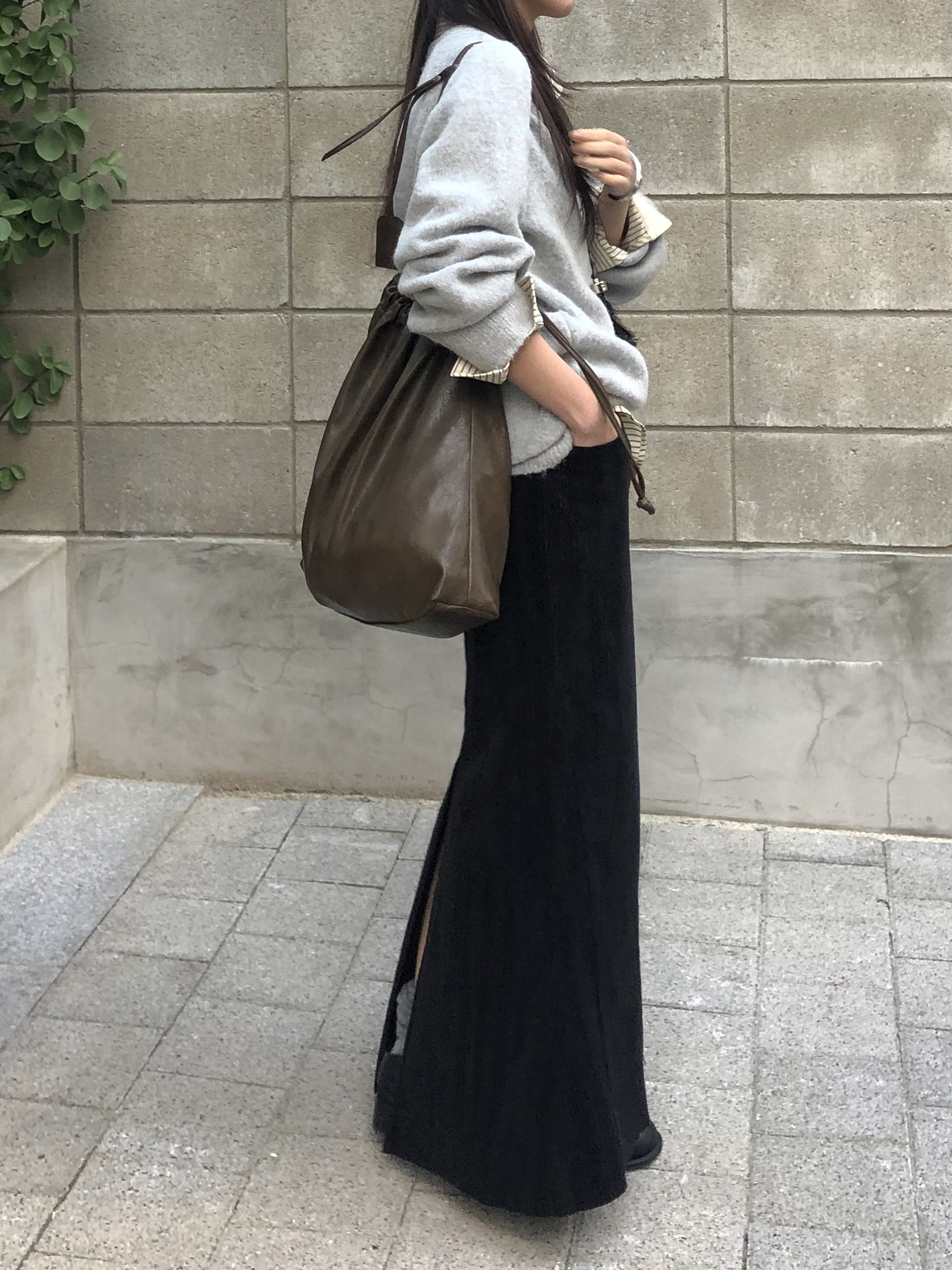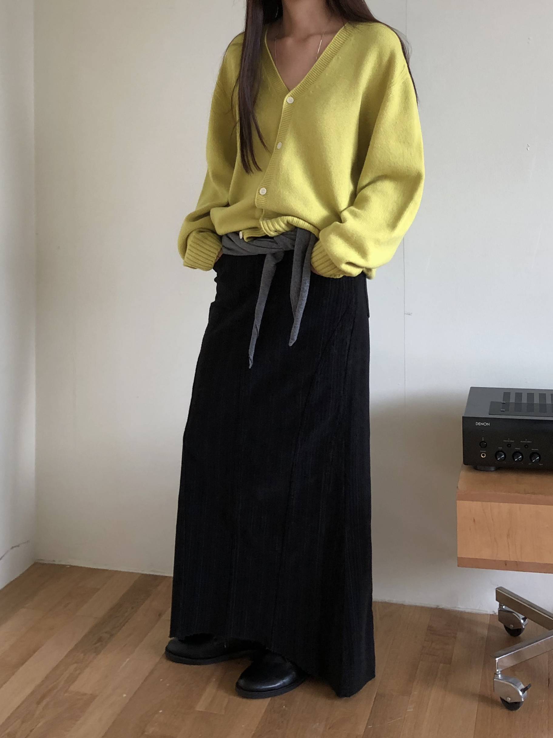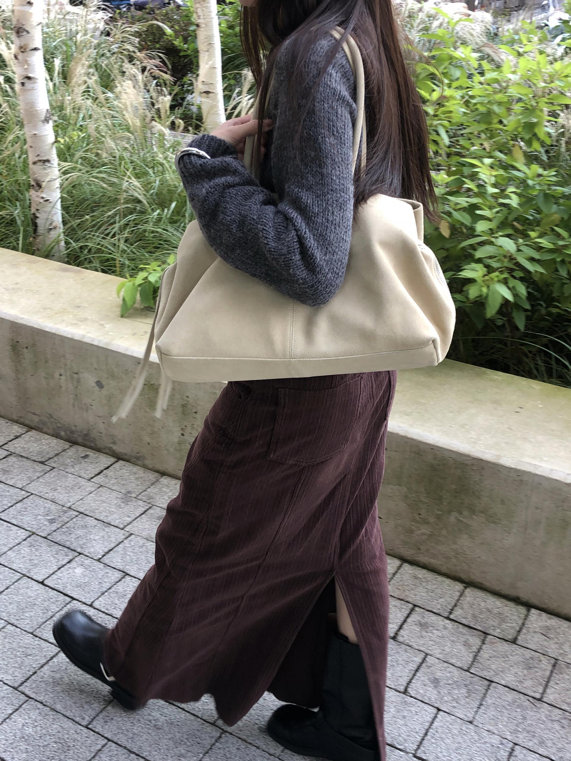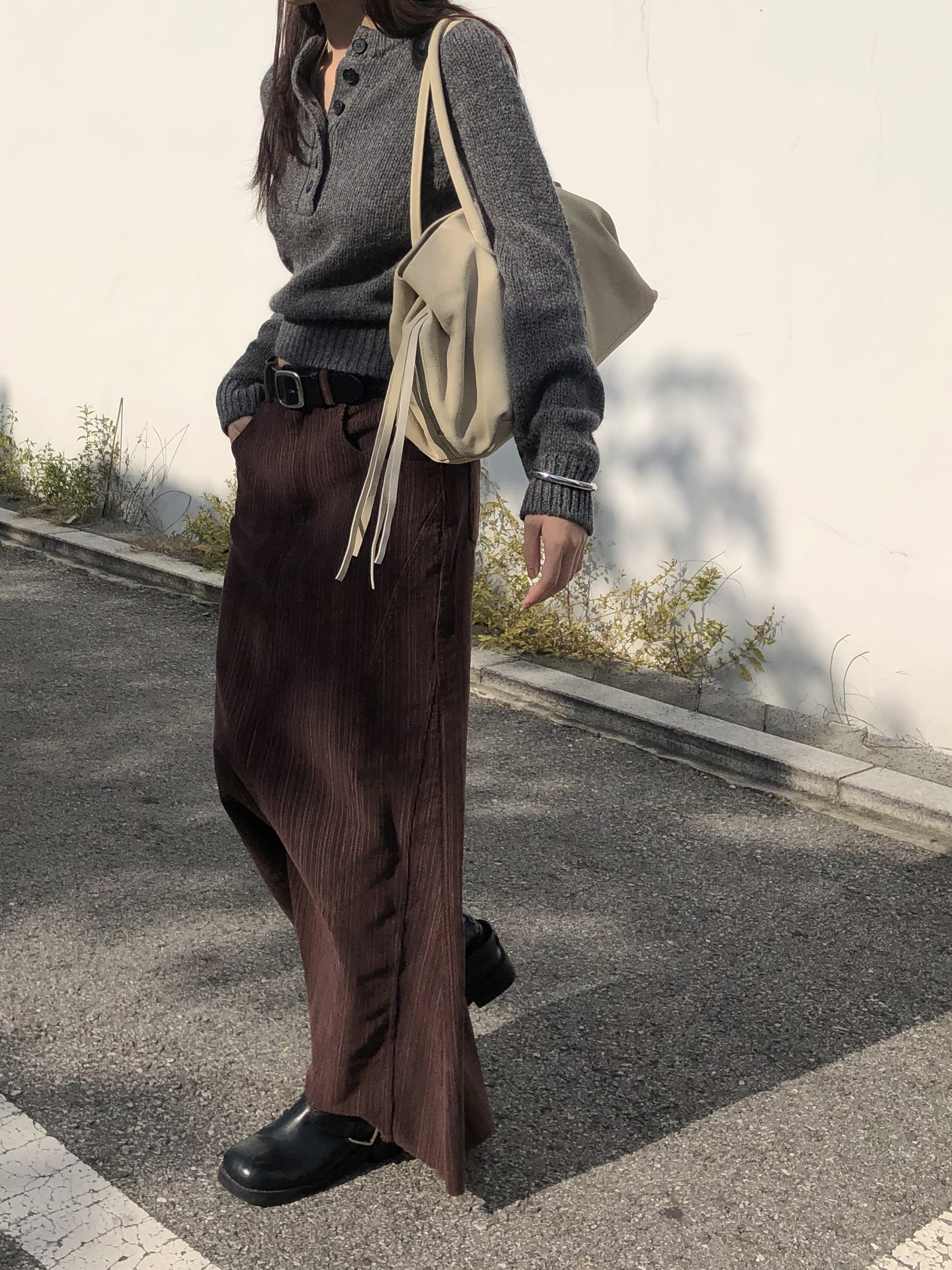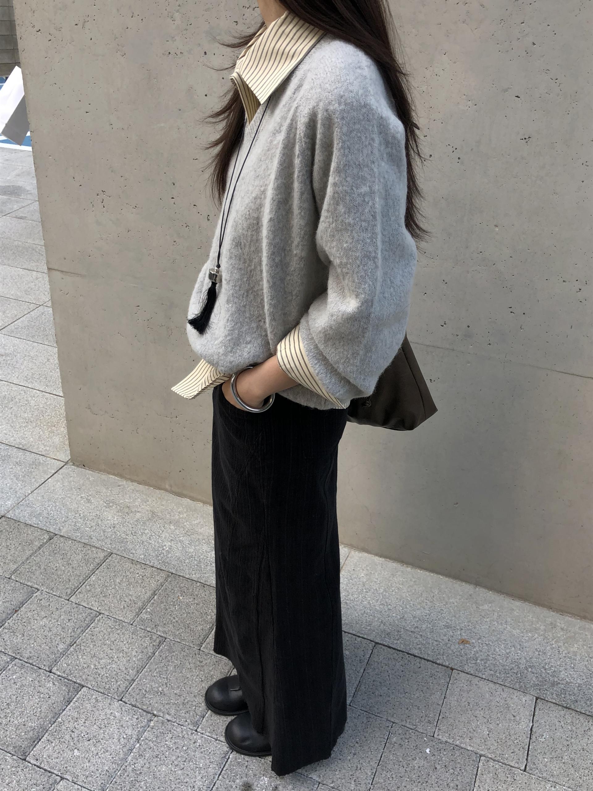 도톰하고 신축성 좋은 원단을 사용했어요. 롱 스커트일수록 원단이 뻣뻣하면 걷는 게 일인데, 뒷트임까지 있어서 편하게 착용 가능합니다.