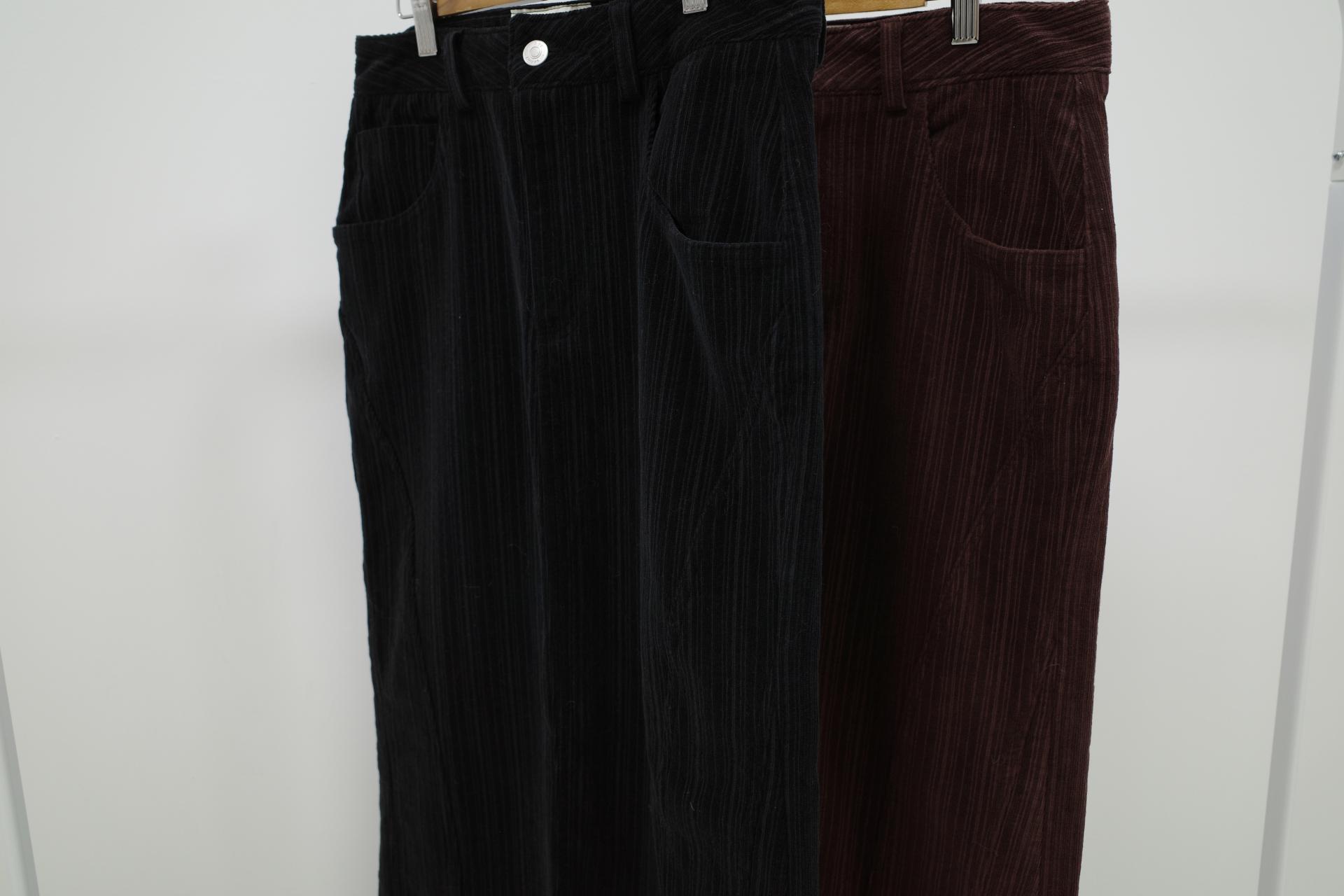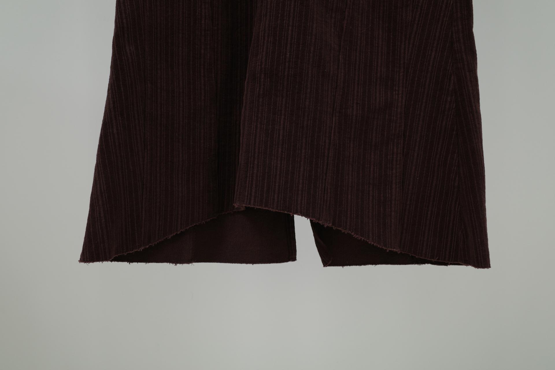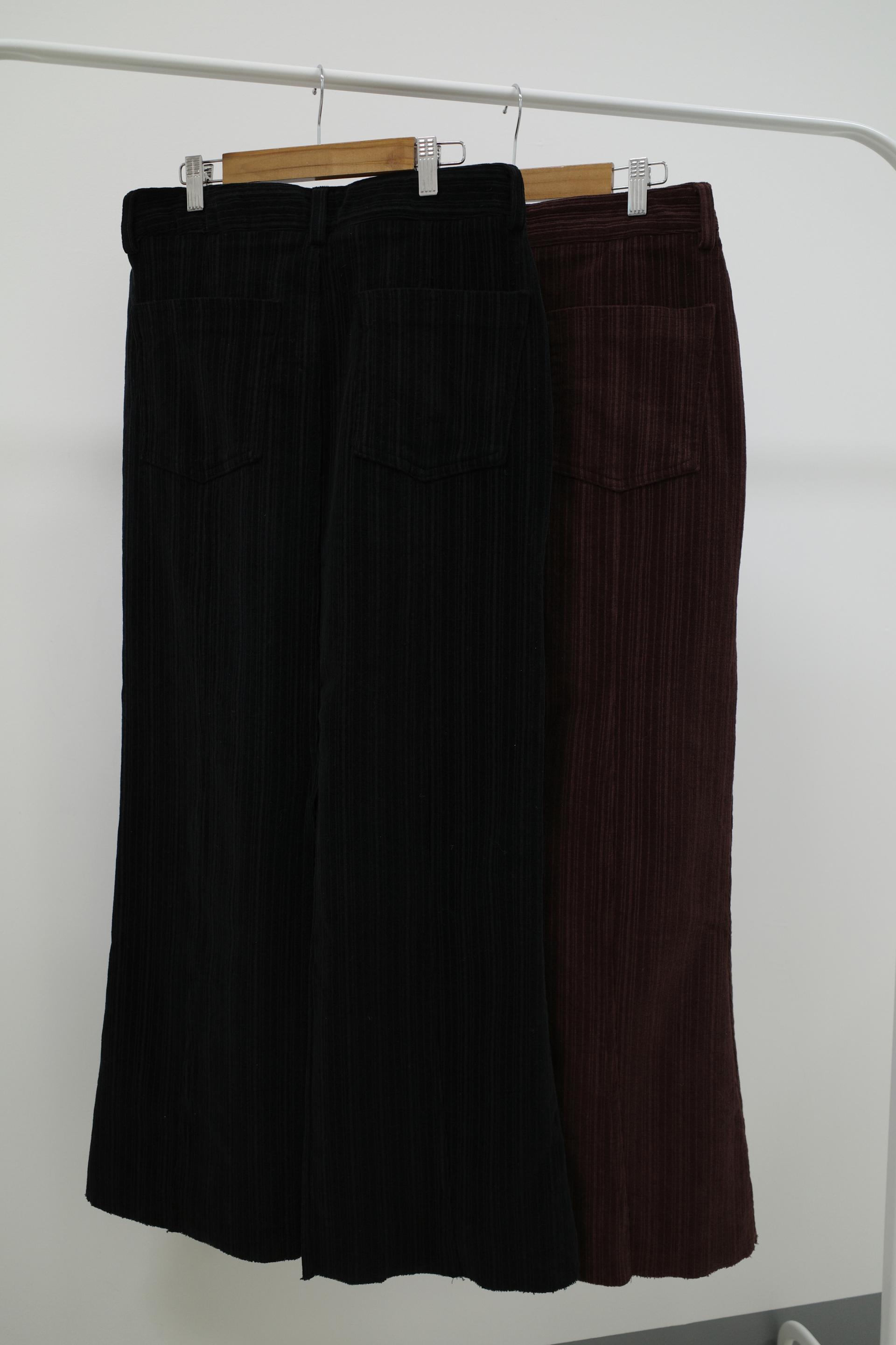 지난 버전과 달리 스트라이프 패턴이 있는 코듀 원단이에요. 좀 더 매력적입니다. 밑단은 역시 러프하게 커팅 처리해 빈티지한 무드를 더해주었어요.
