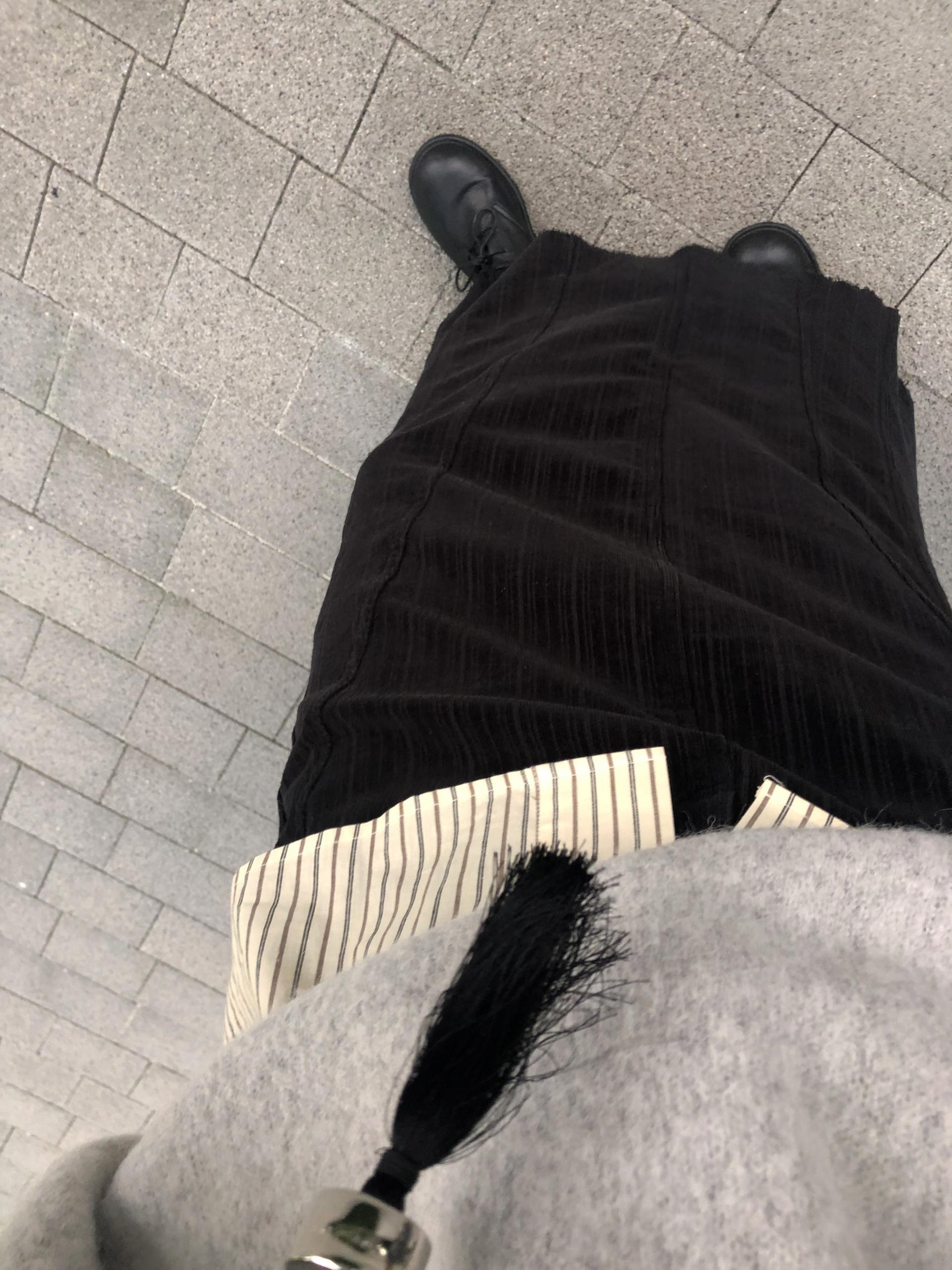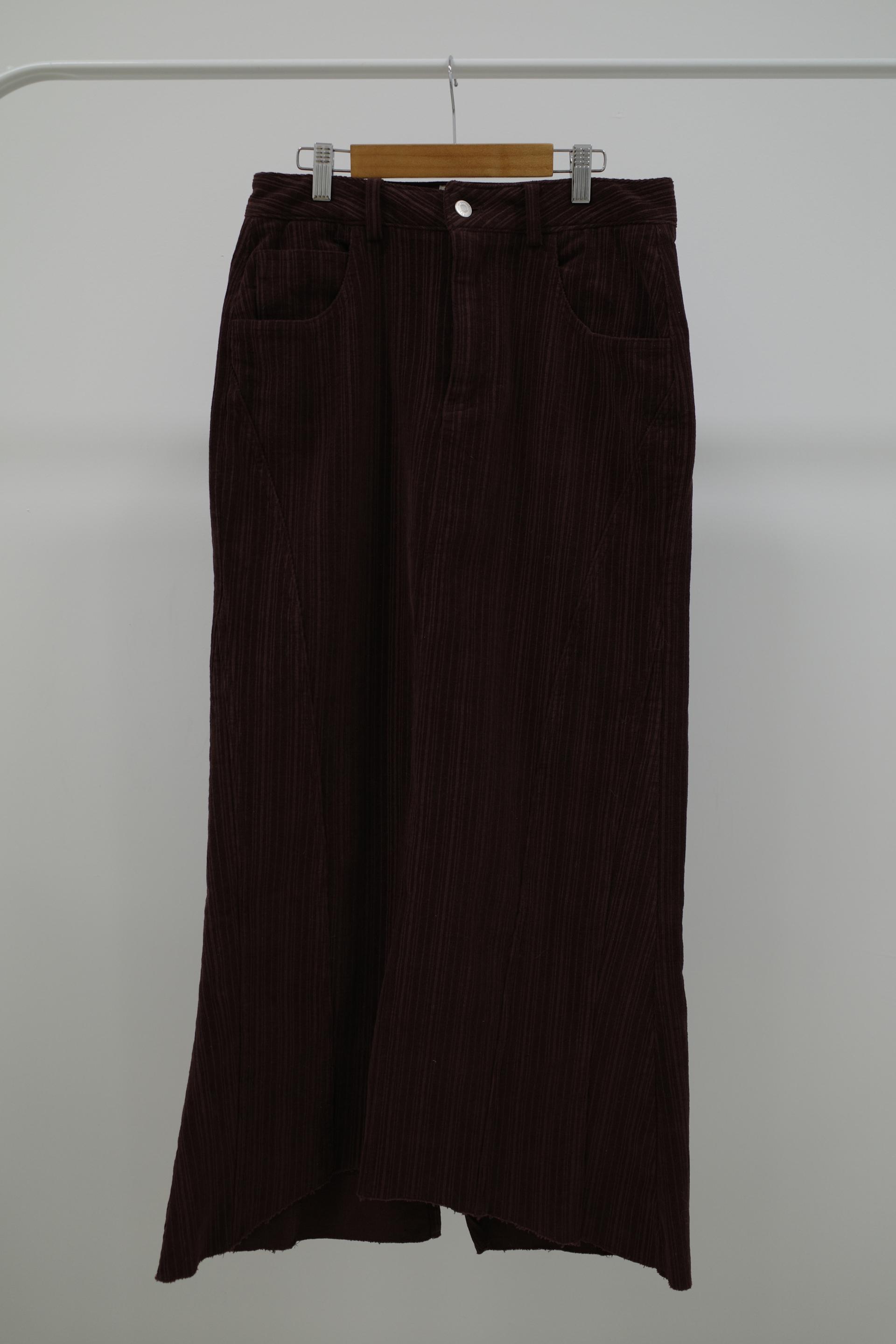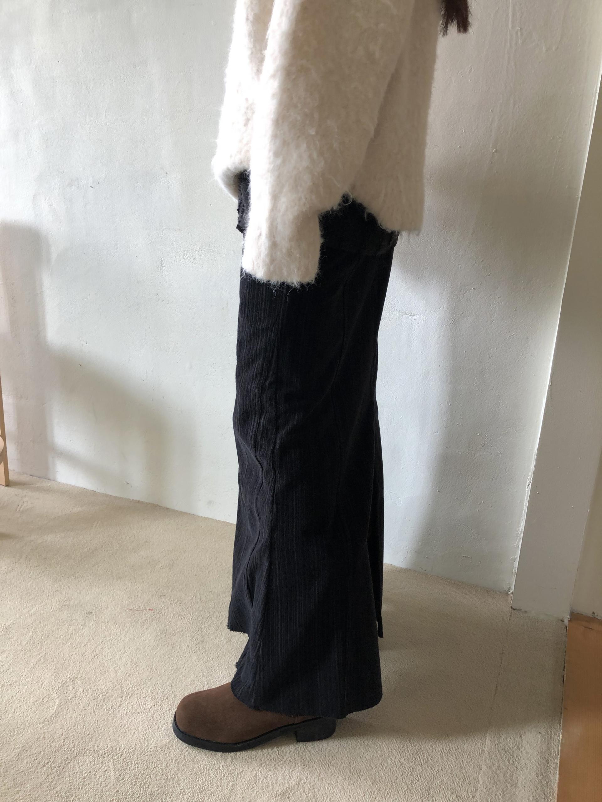 지난 버전과 달리 스트라이프 패턴이 있는 코듀 원단이에요. 좀 더 매력적입니다. 밑단은 역시 러프하게 커팅 처리해 빈티지한 무드를 더해주었어요.