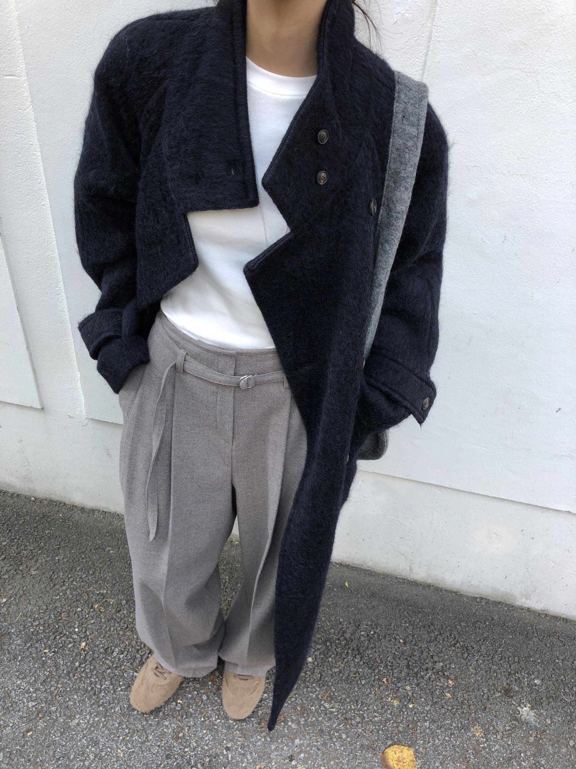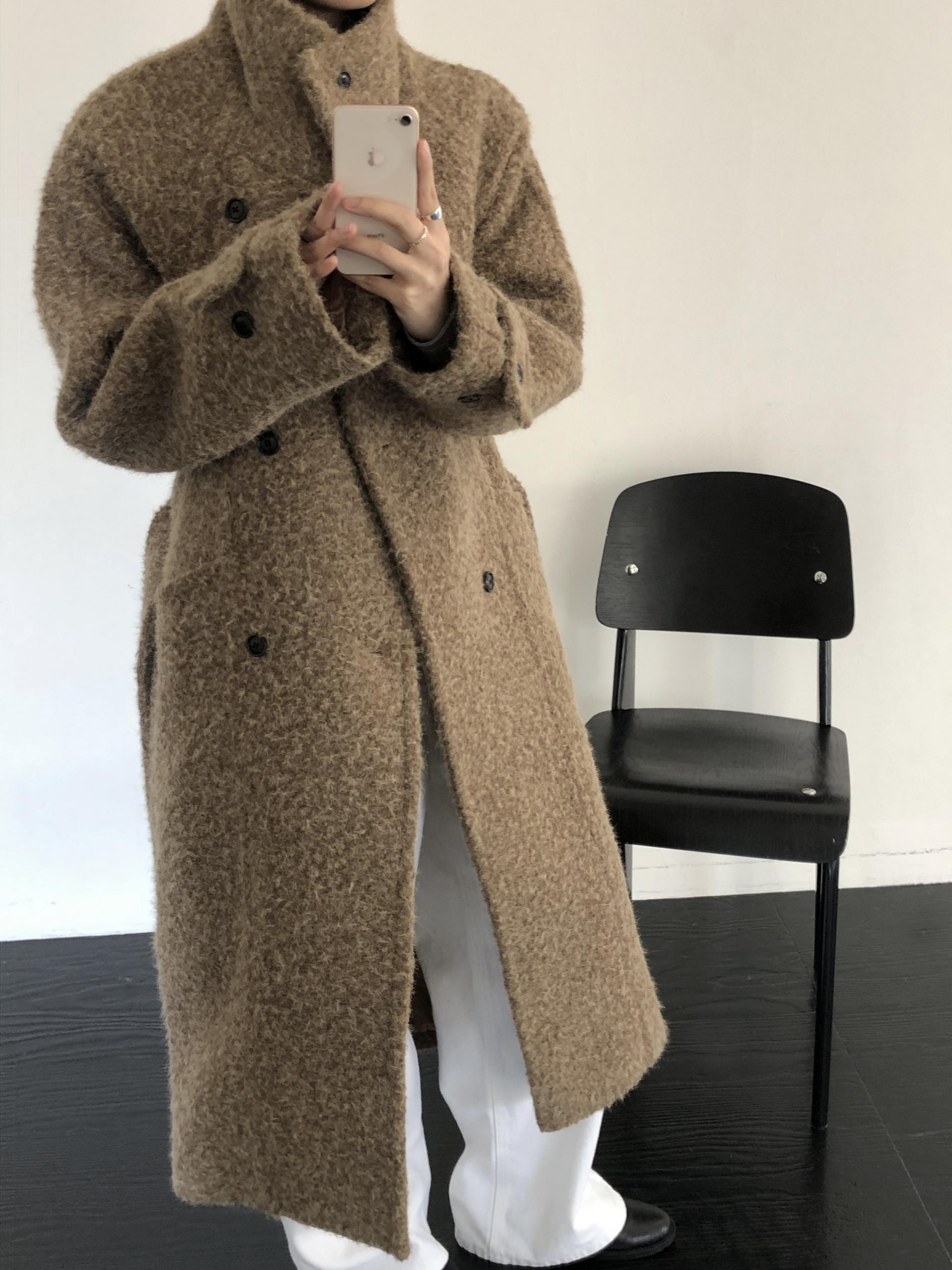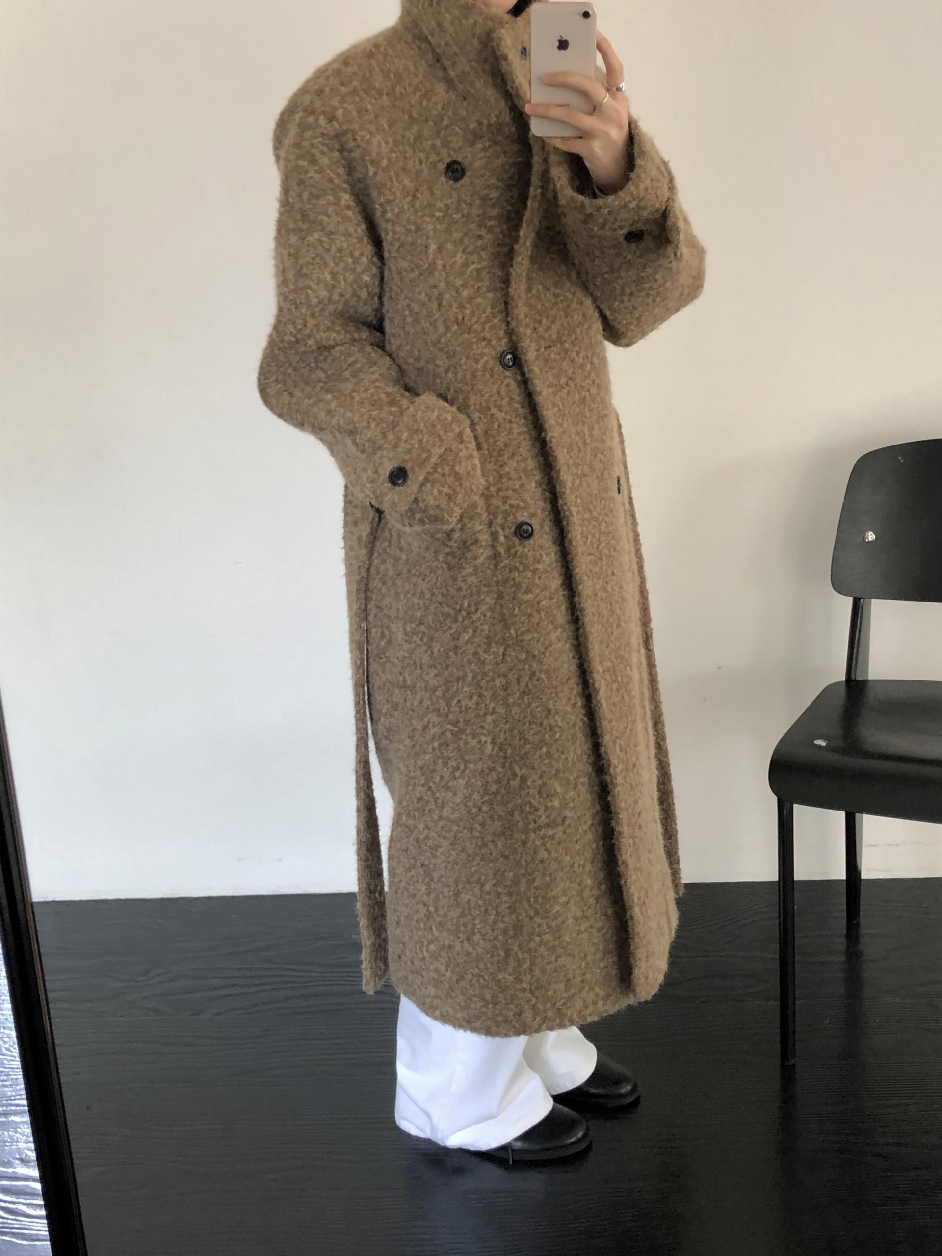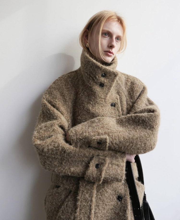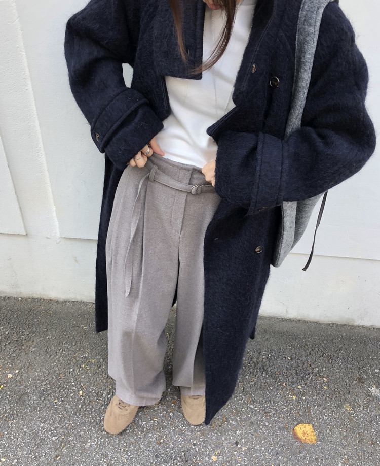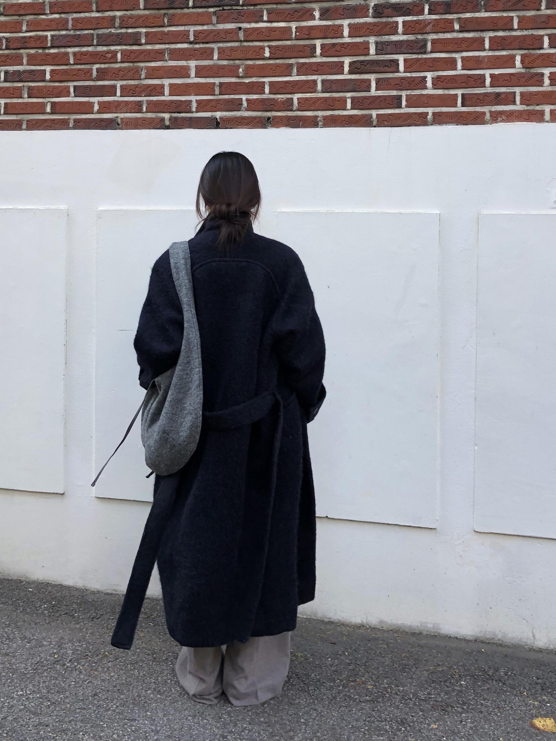 넉넉한 오버핏과 볼드하게 연출되는 하이넥 디자인으로 보온성은 물론 도시적인 분위기가 느껴집니다. 롱~맥시 중간의 꽤나 긴 기장으로 실루엣에서 오는 드라마틱함이 있어요. 여기에 더해진 벨티드 디테일로 오픈했을 때와 또 다른 분위기를 연출합니다.