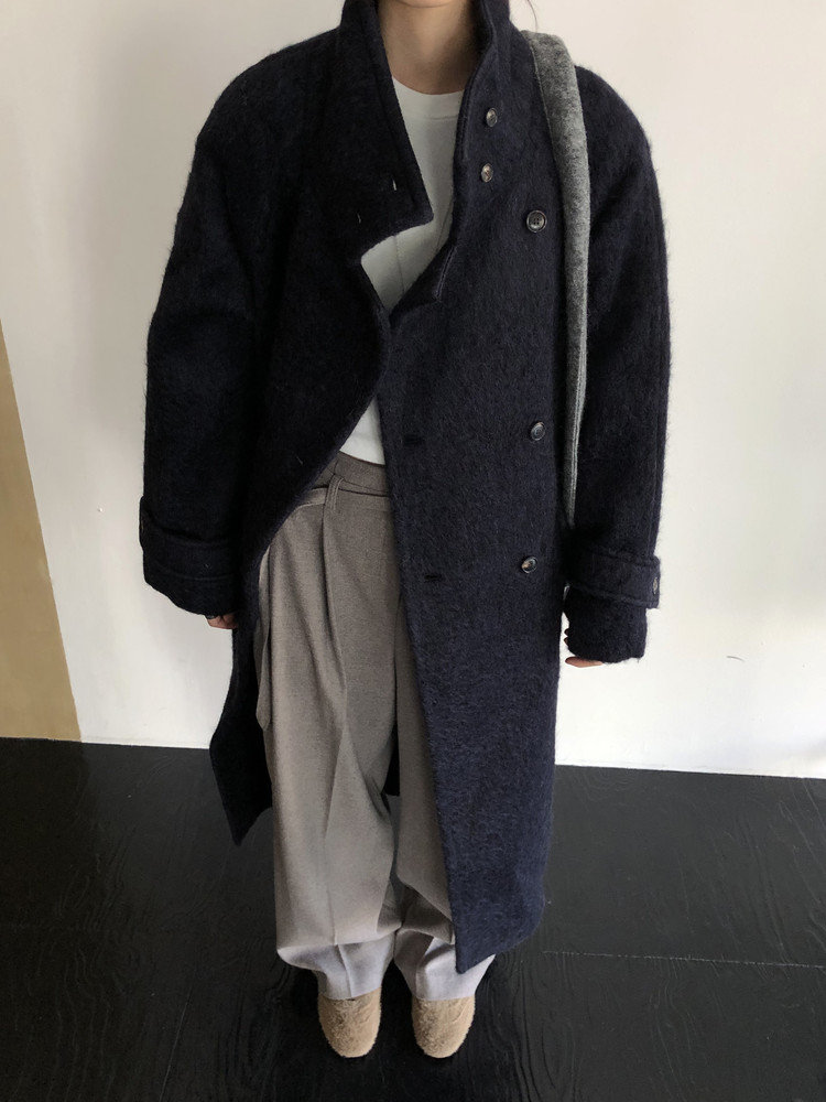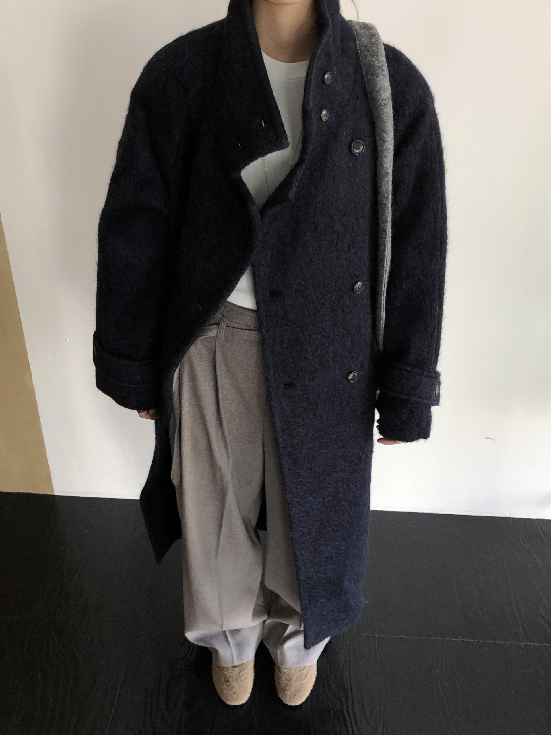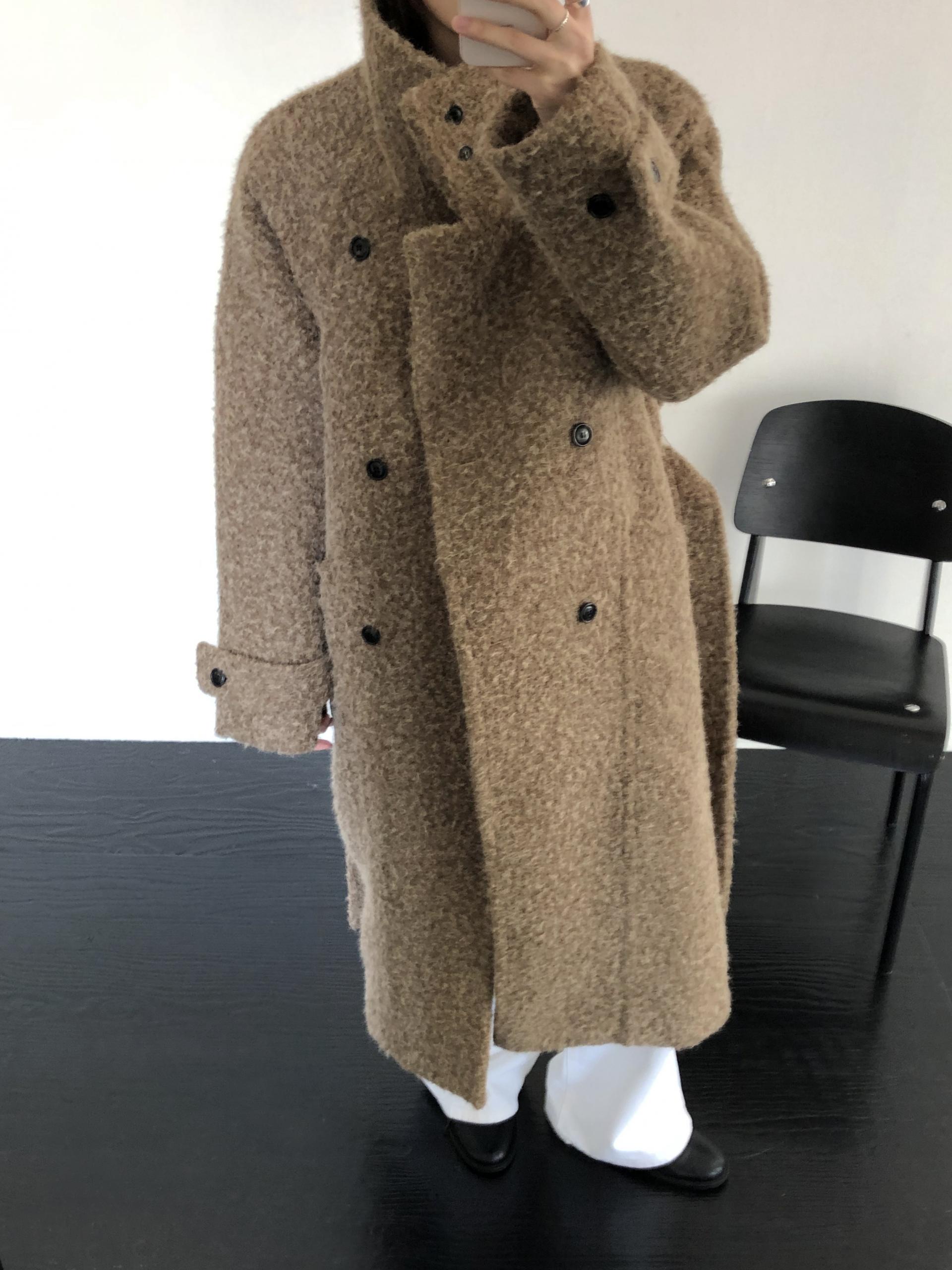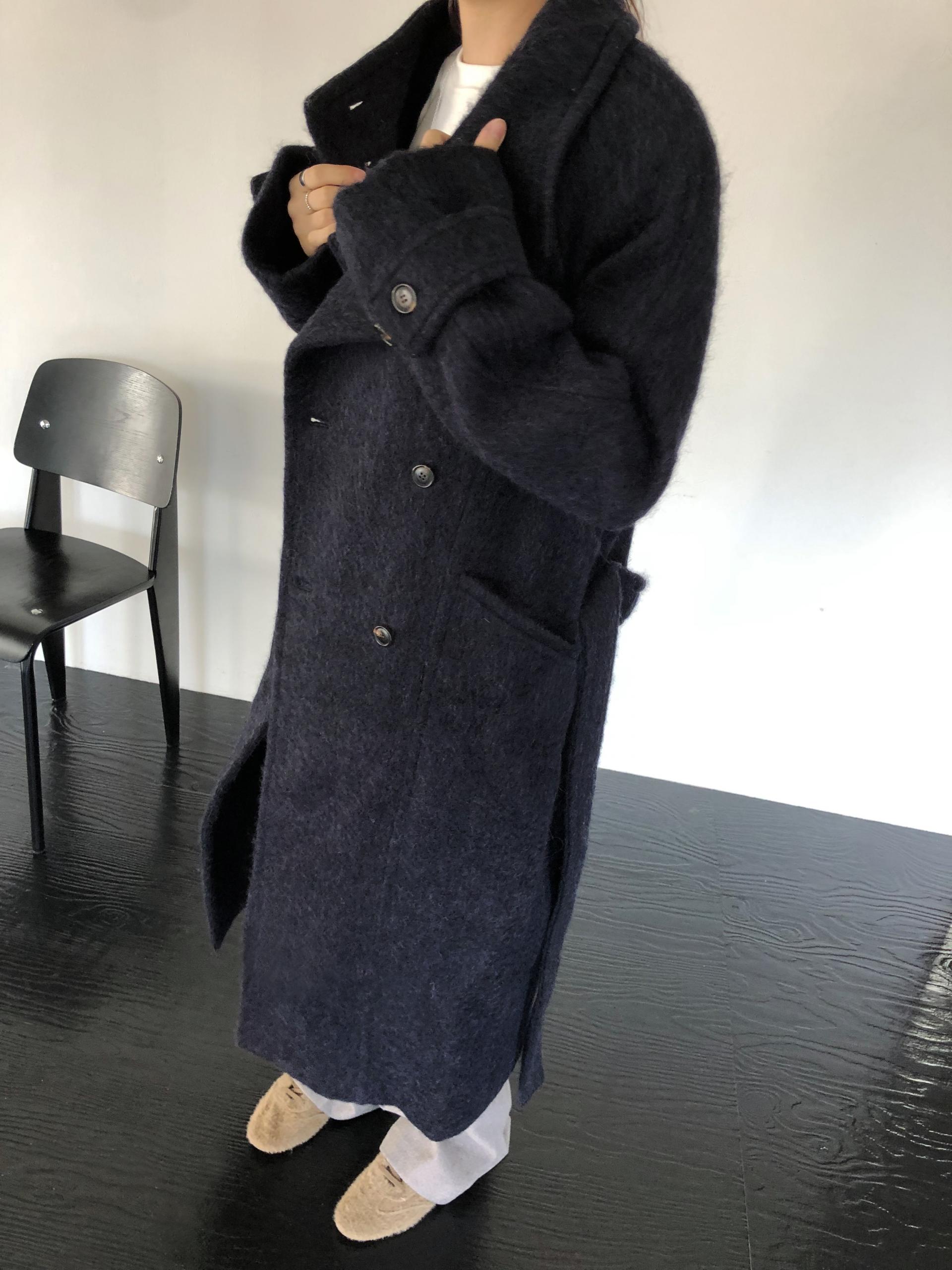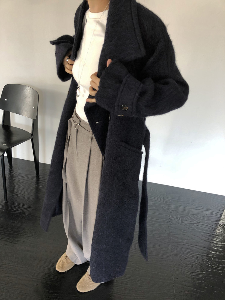 넉넉한 오버핏과 볼드하게 연출되는 하이넥 디자인으로 보온성은 물론 도시적인 분위기가 느껴집니다. 롱~맥시 중간의 꽤나 긴 기장으로 실루엣에서 오는 드라마틱함이 있어요. 여기에 더해진 벨티드 디테일로 오픈했을 때와 또 다른 분위기를 연출합니다.