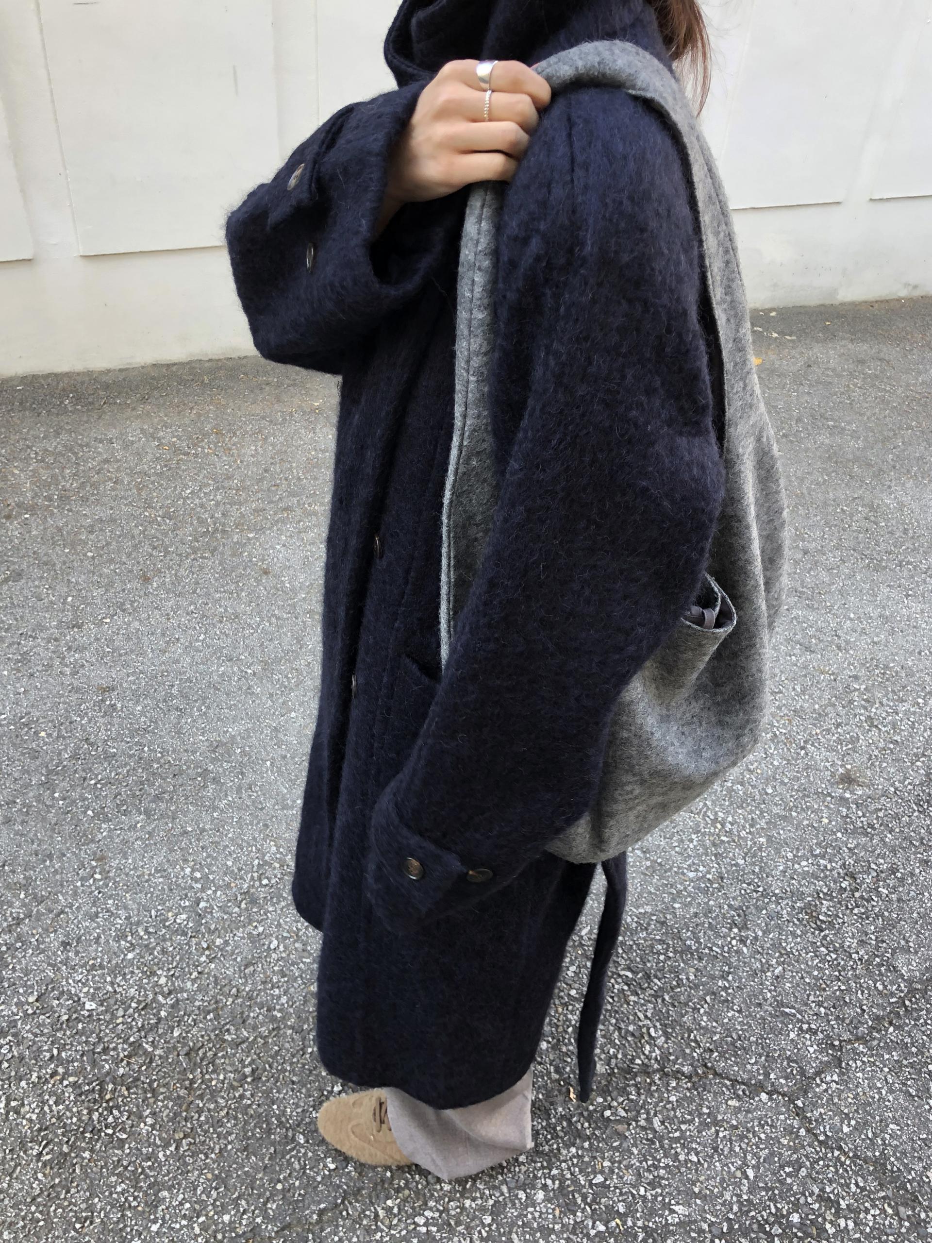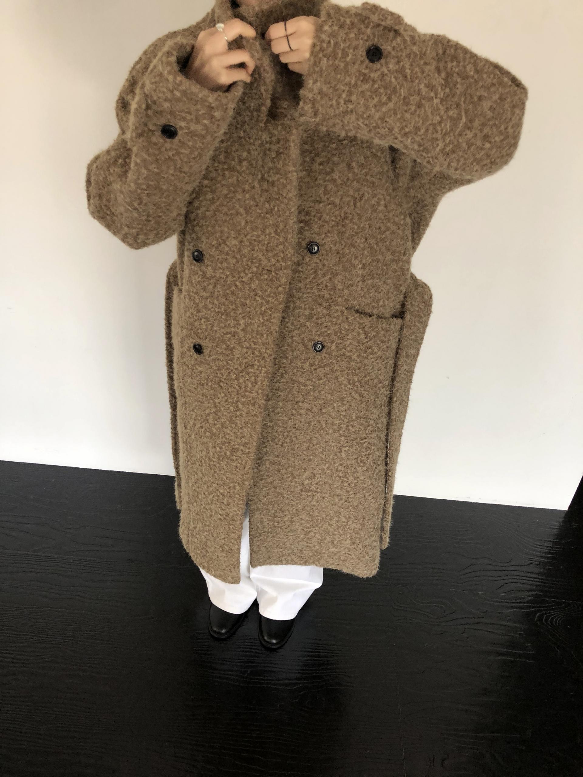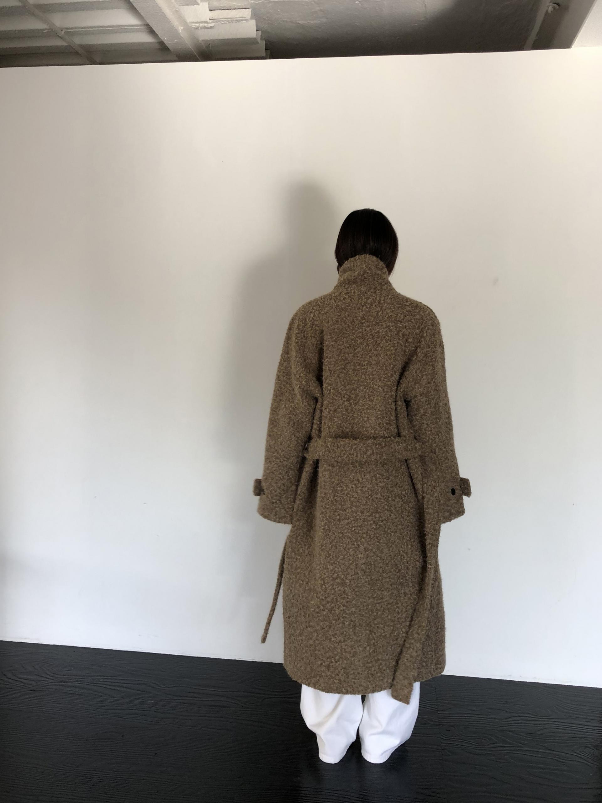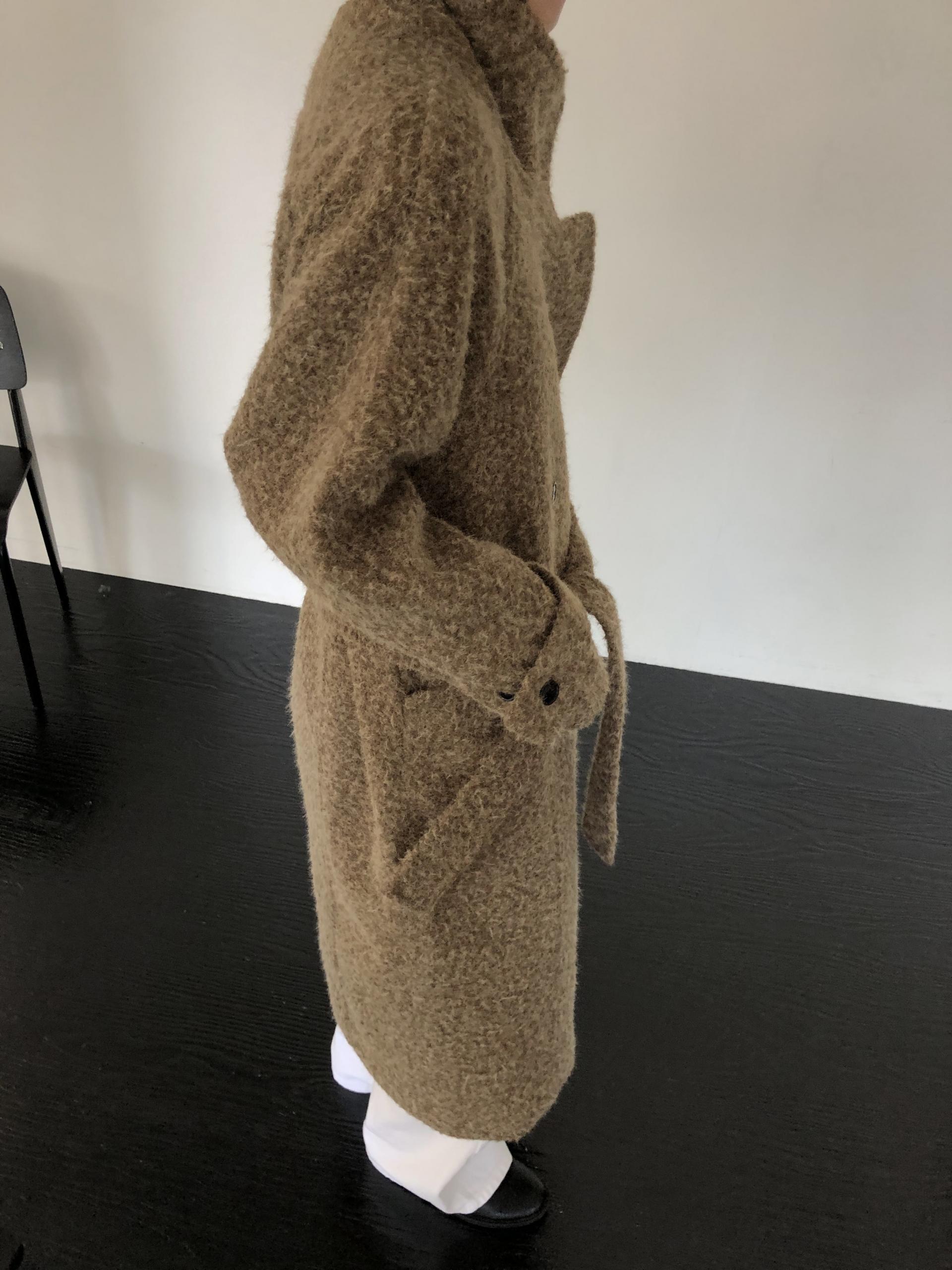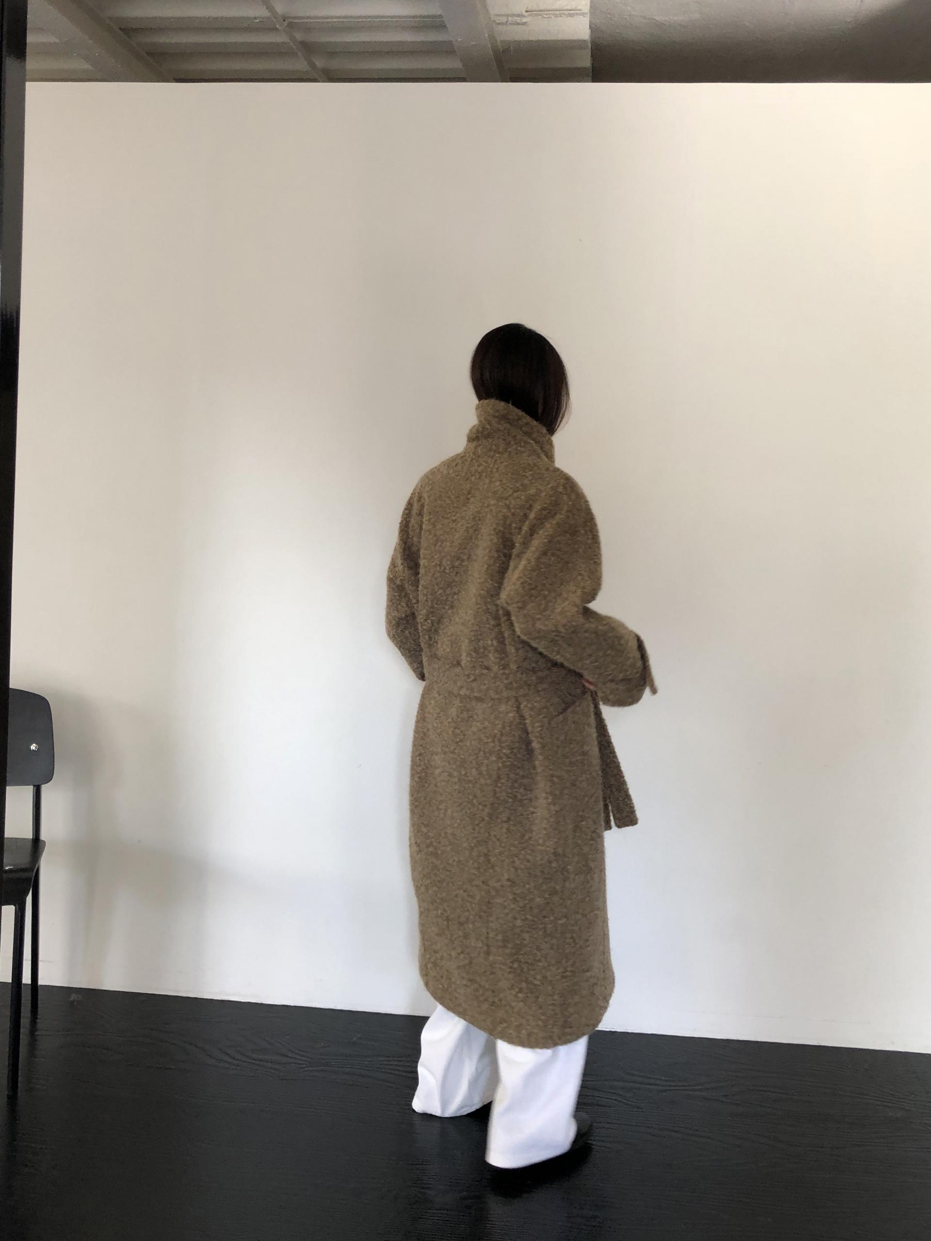넉넉한 오버핏과 볼드하게 연출되는 하이넥 디자인으로 보온성은 물론 도시적인 분위기가 느껴집니다. 롱~맥시 중간의 꽤나 긴 기장으로 실루엣에서 오는 드라마틱함이 있어요. 여기에 더해진 벨티드 디테일로 오픈했을 때와 또 다른 분위기를 연출합니다.
