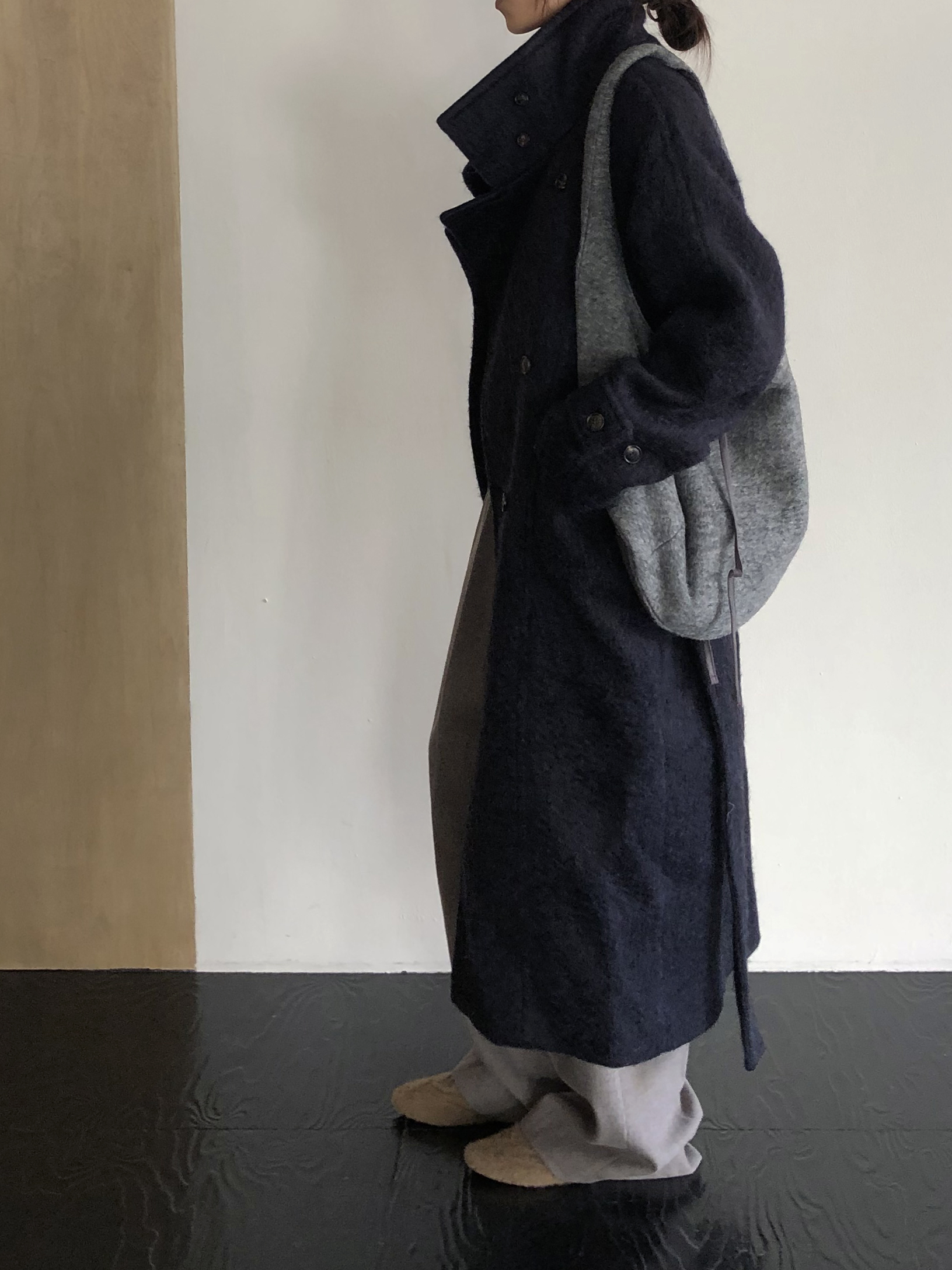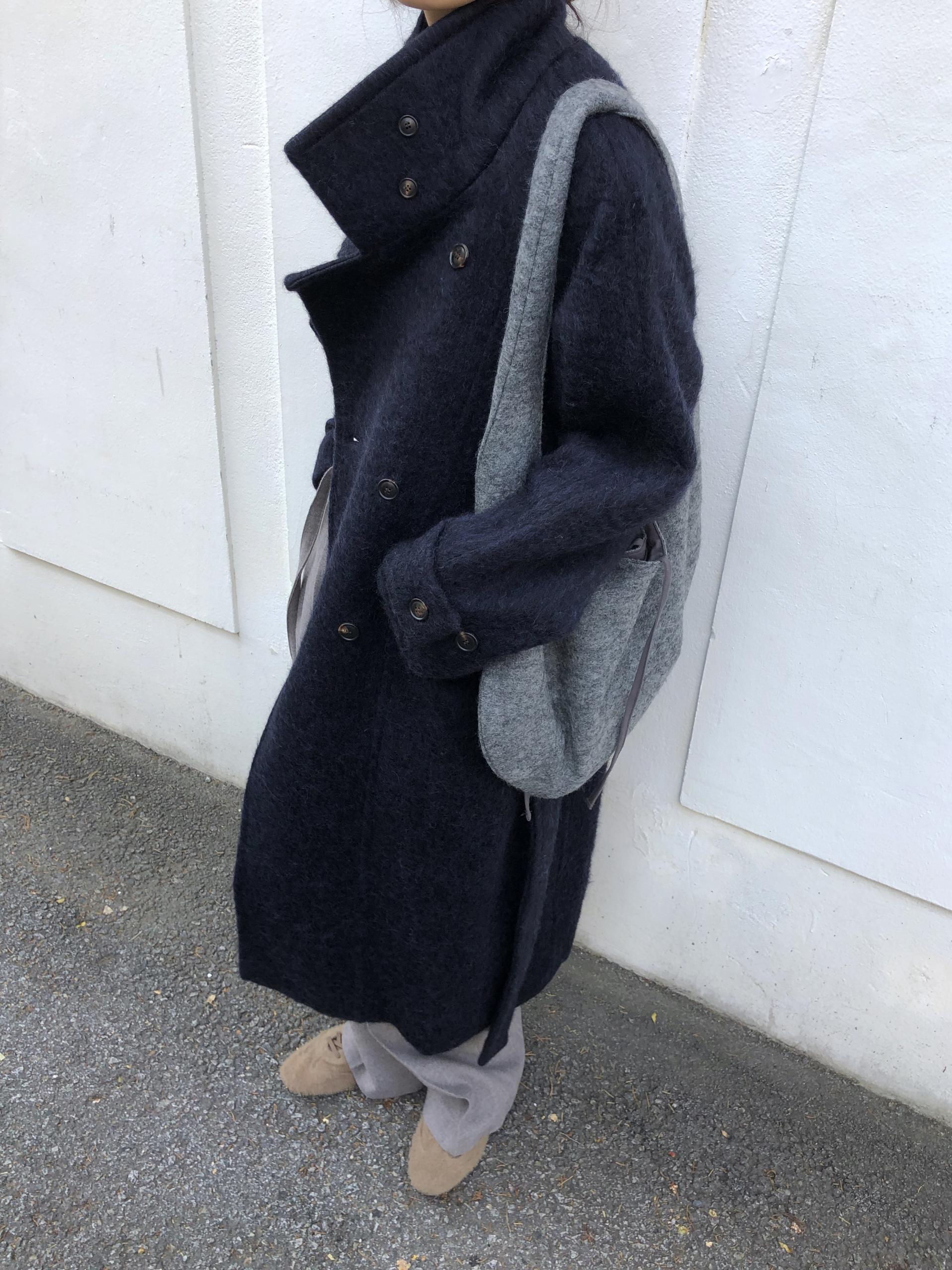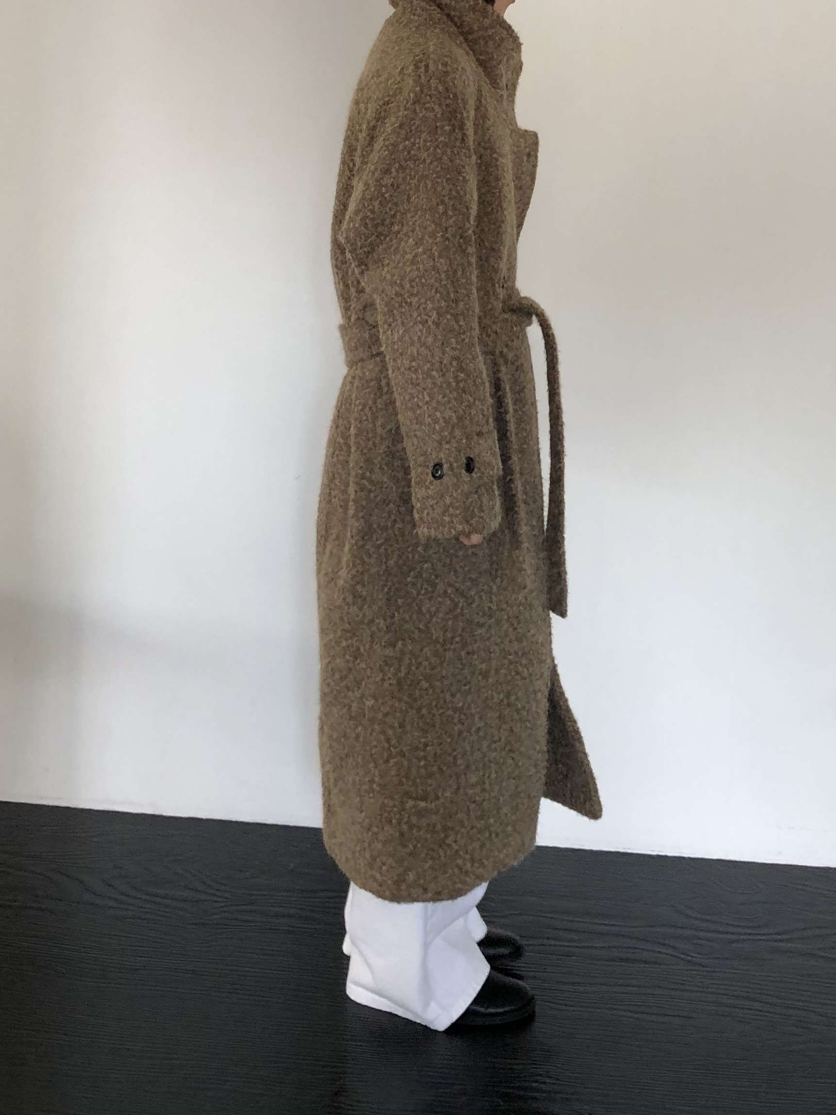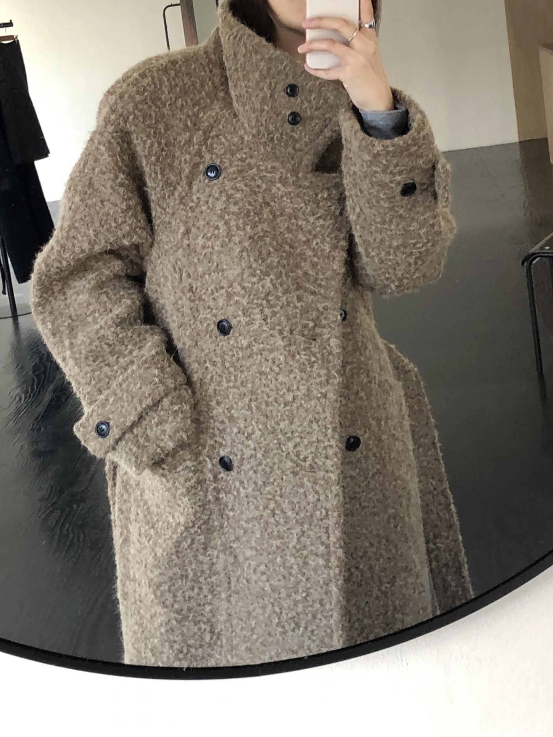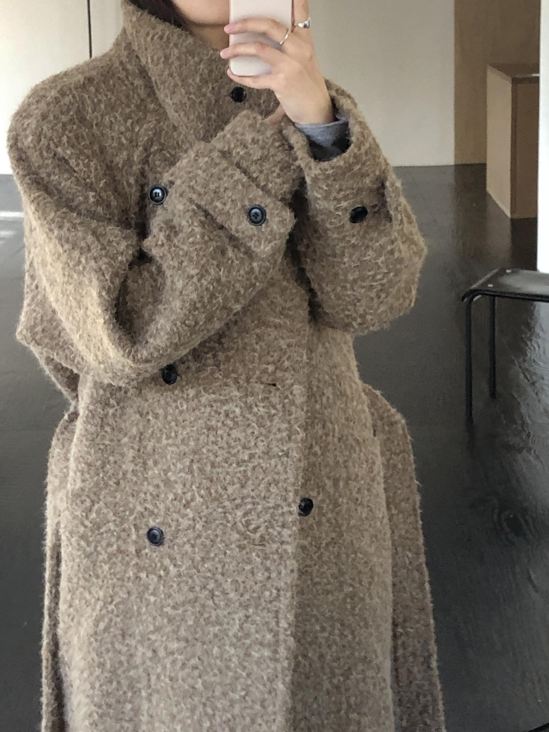 넉넉한 오버핏과 볼드하게 연출되는 하이넥 디자인으로 보온성은 물론 도시적인 분위기가 느껴집니다. 롱~맥시 중간의 꽤나 긴 기장으로 실루엣에서 오는 드라마틱함이 있어요. 여기에 더해진 벨티드 디테일로 오픈했을 때와 또 다른 분위기를 연출합니다.