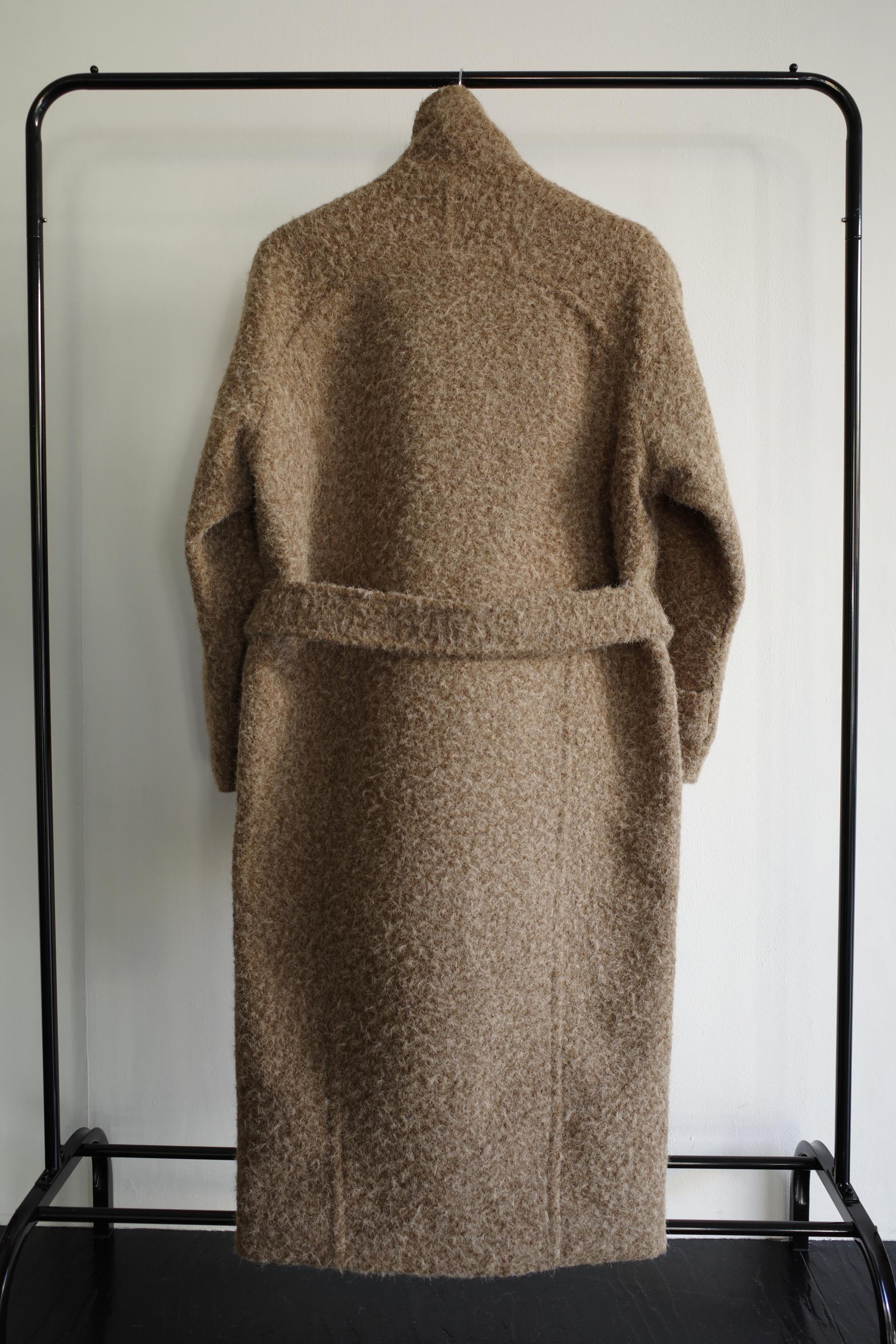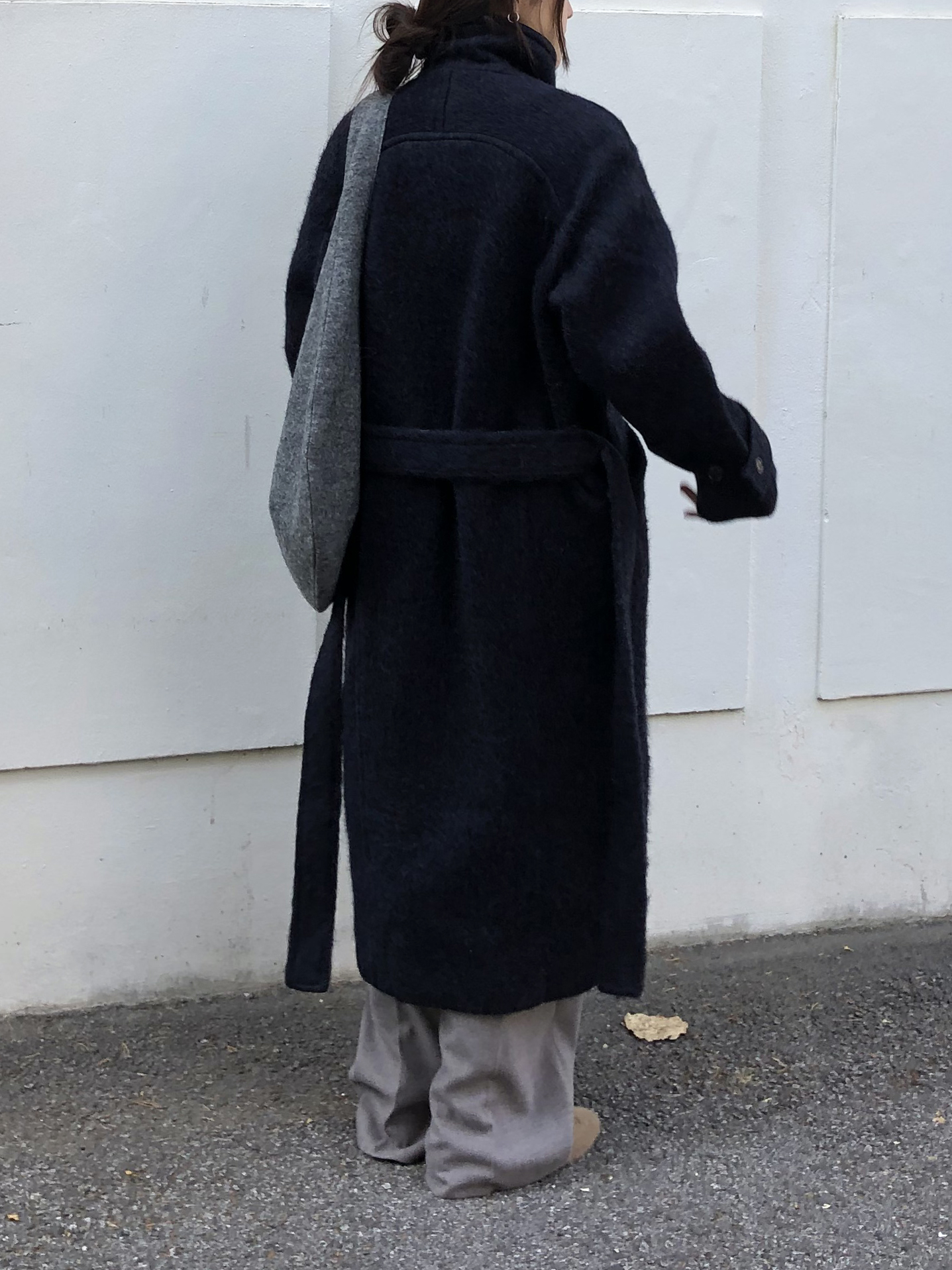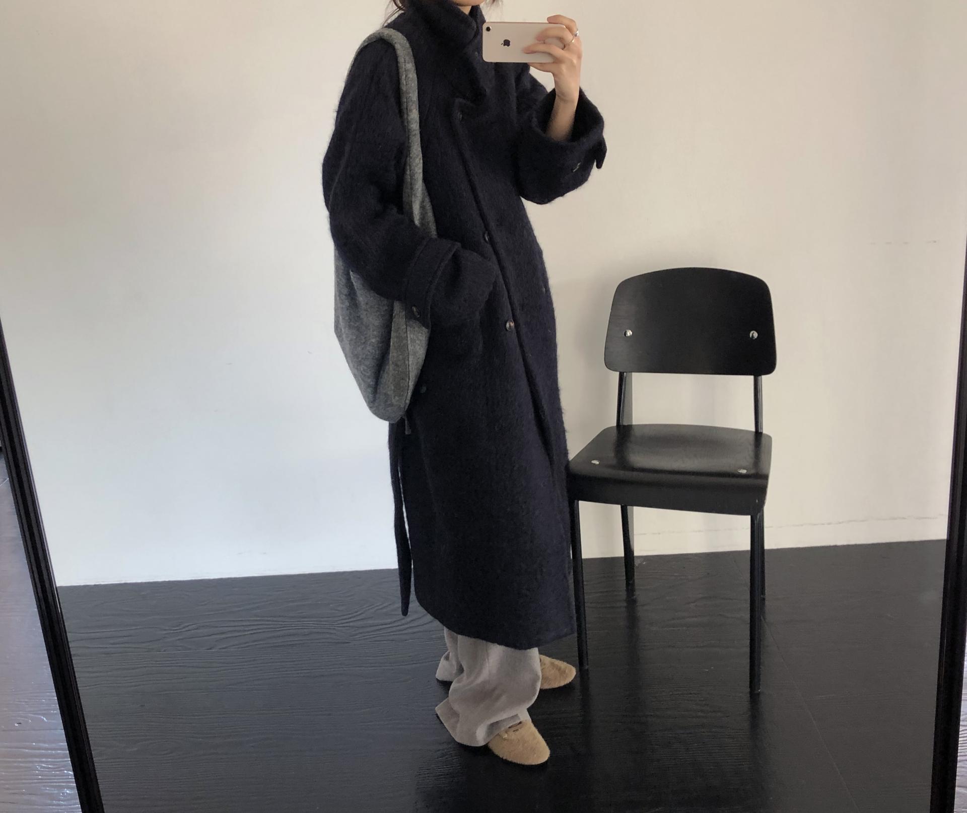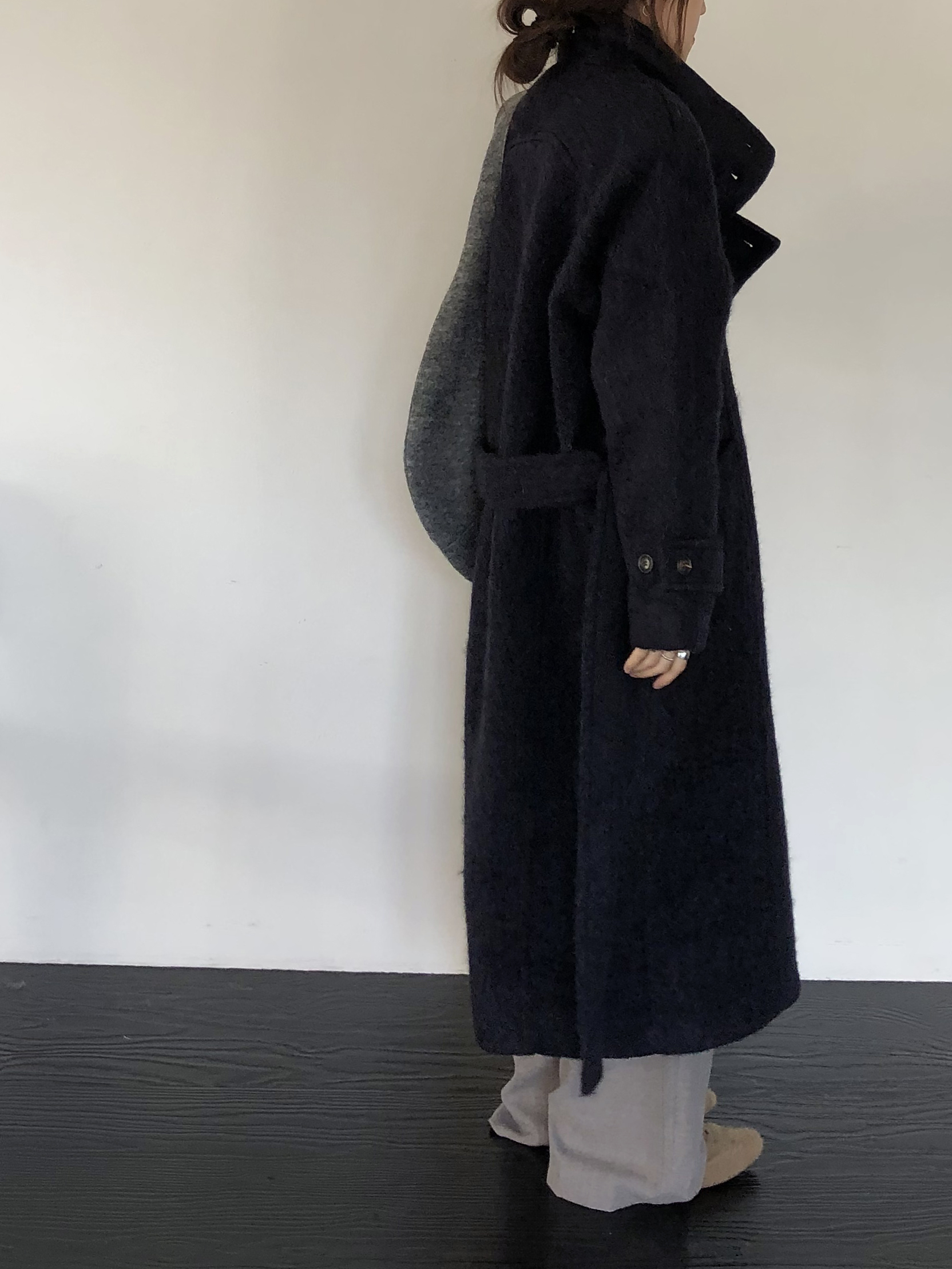넉넉한 오버핏과 볼드하게 연출되는 하이넥 디자인으로 보온성은 물론 도시적인 분위기가 느껴집니다. 롱~맥시 중간의 꽤나 긴 기장으로 실루엣에서 오는 드라마틱함이 있어요. 여기에 더해진 벨티드 디테일로 오픈했을 때와 또 다른 분위기를 연출합니다.
