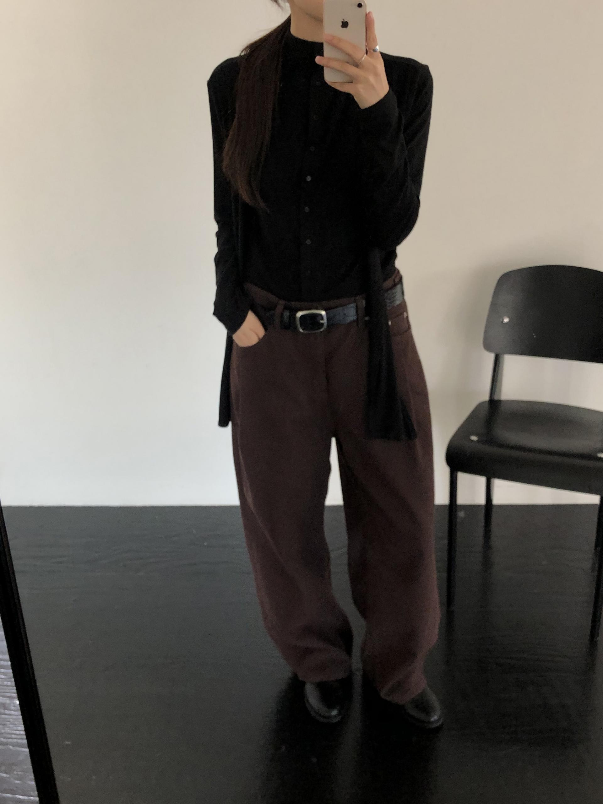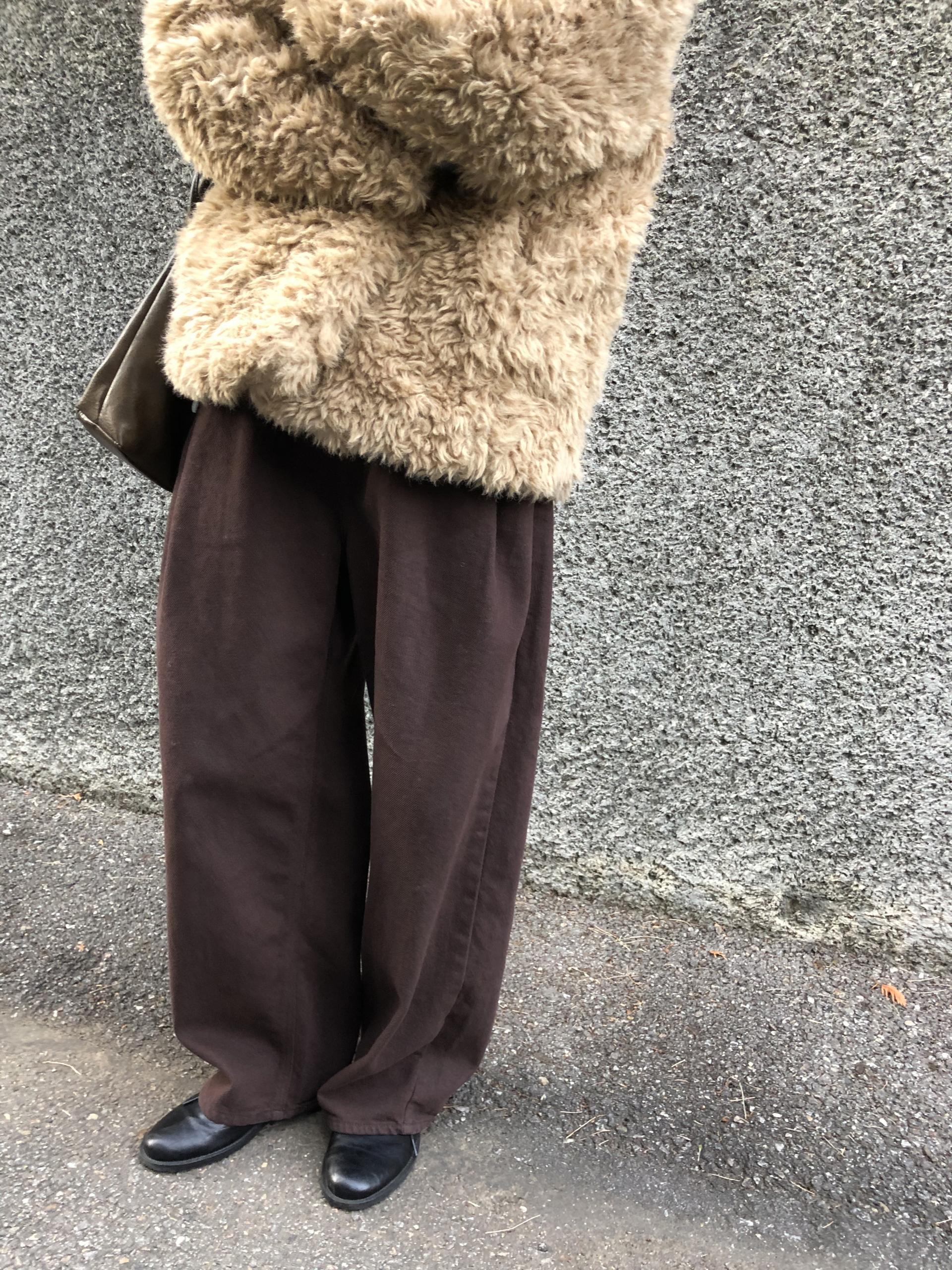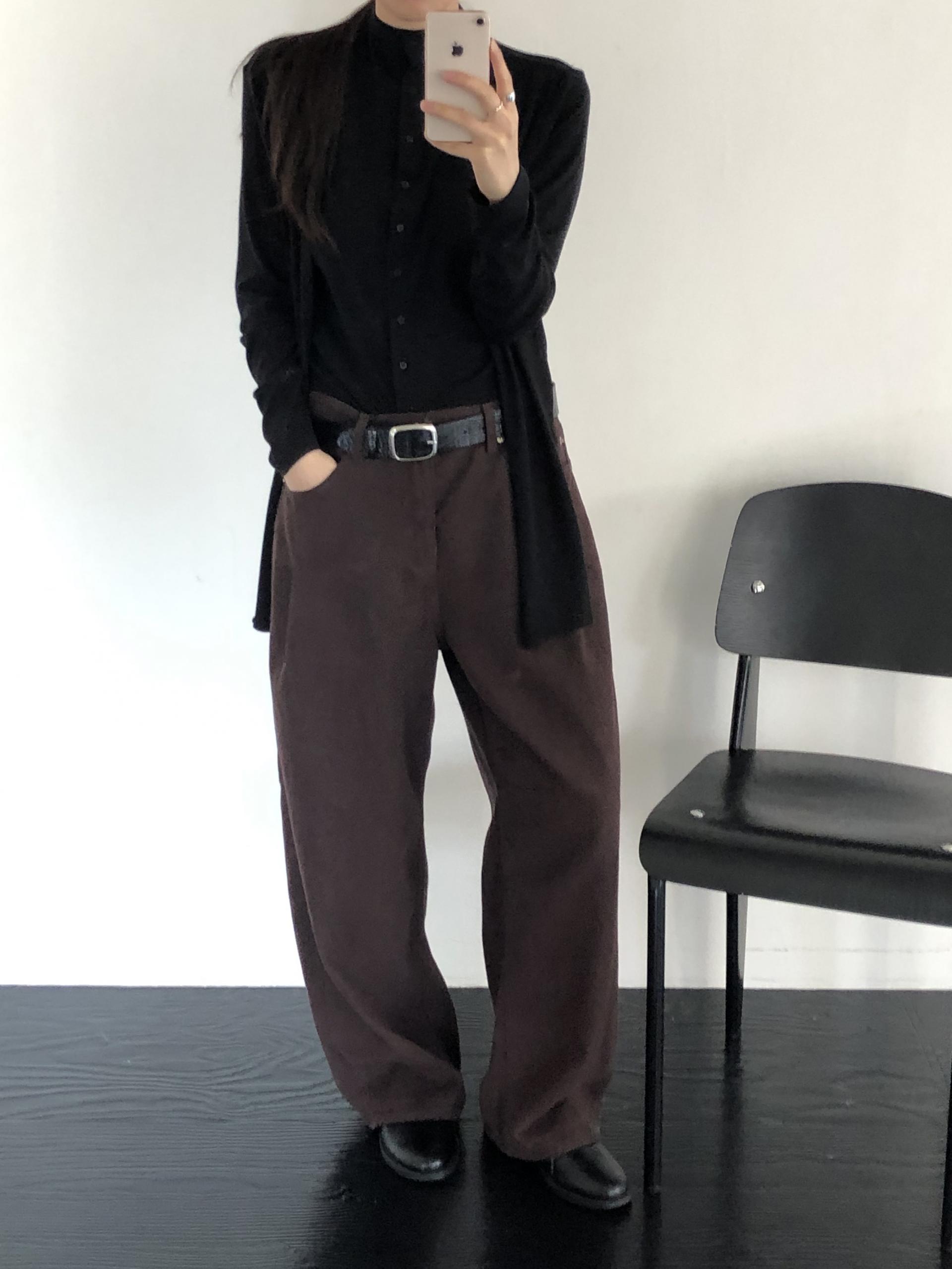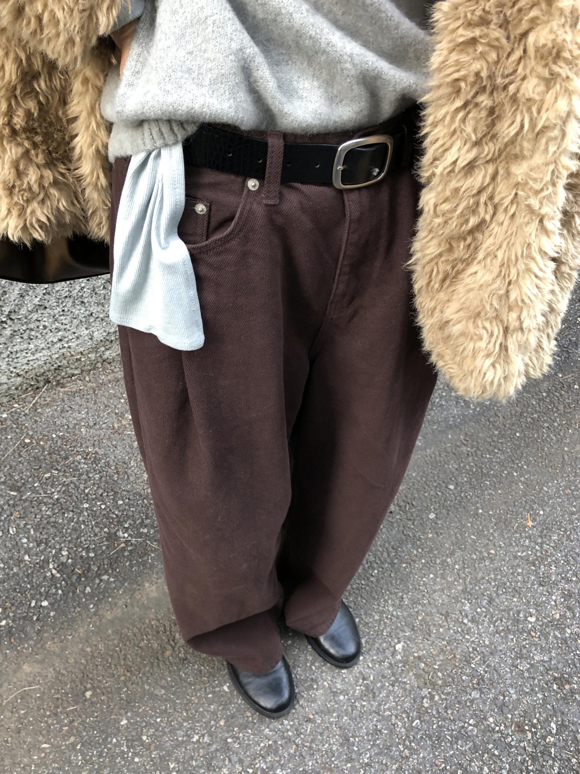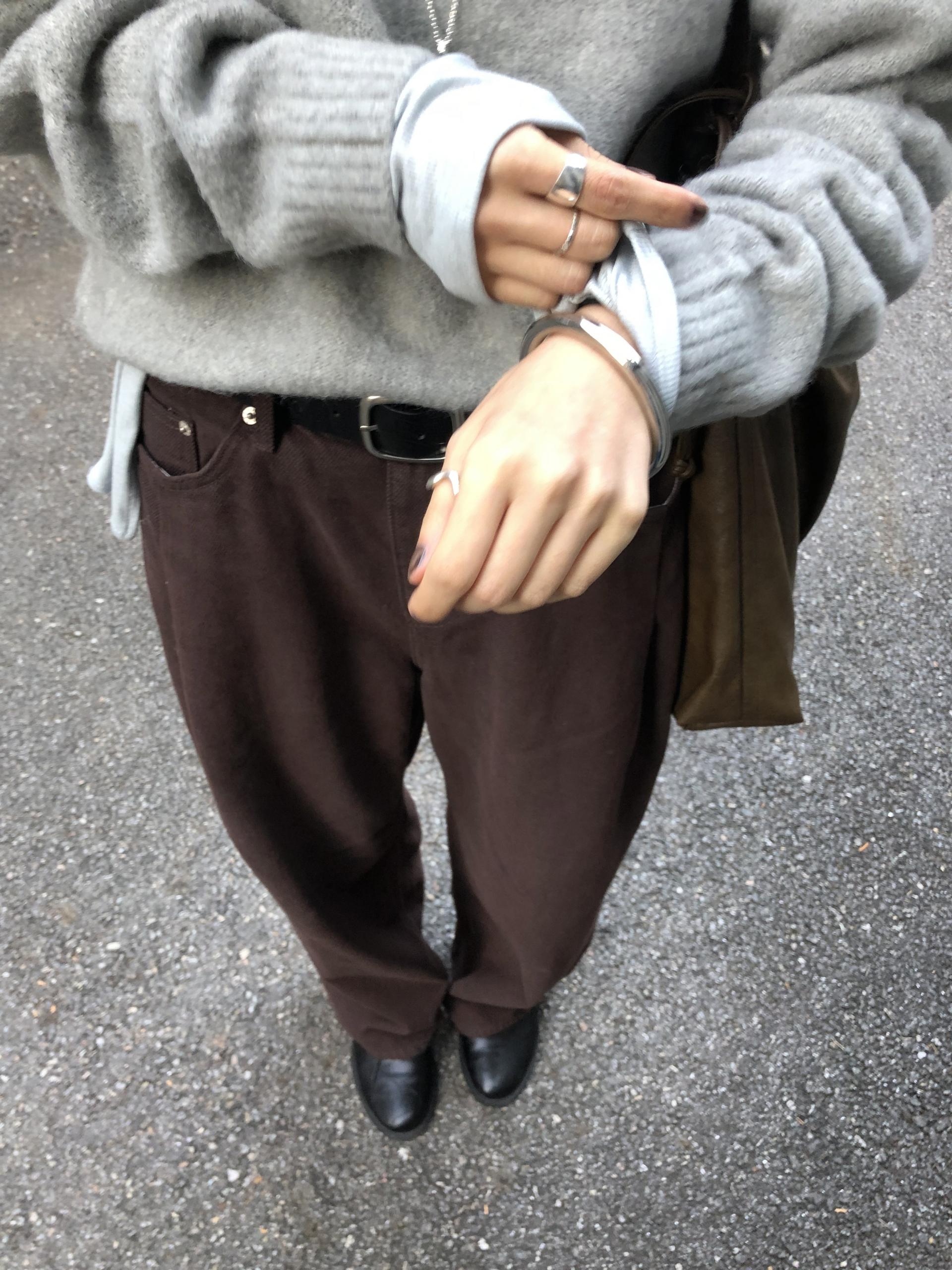 와이드하게 떨어지는 라운드 핏으로 멋스러운 실루엣을 가졌어요. 안쪽이 기모 처리되어 부드럽고 유연합니다. 추울 때는 차갑고 딱딱한 텍스쳐의 팬츠는 눈길도 가지 않는 저로서는,, 겨울내내 참 잘 입게 될 것 같아요.