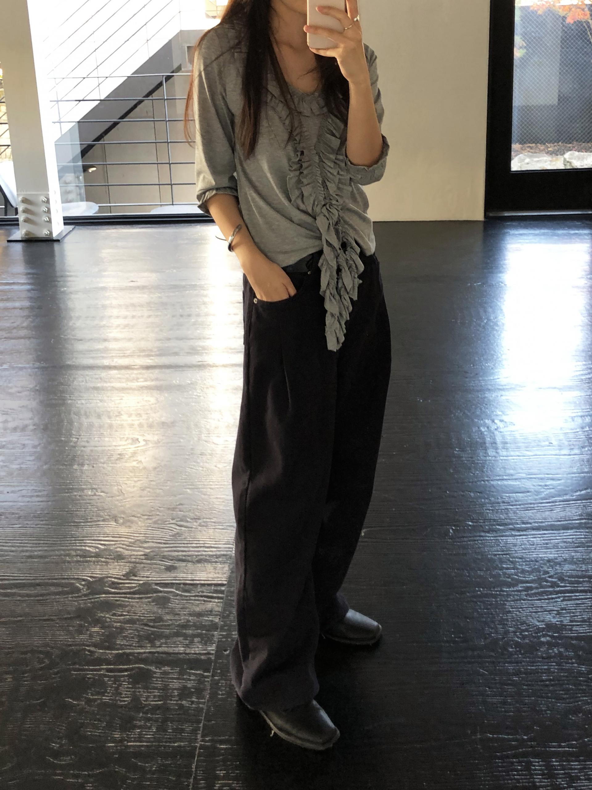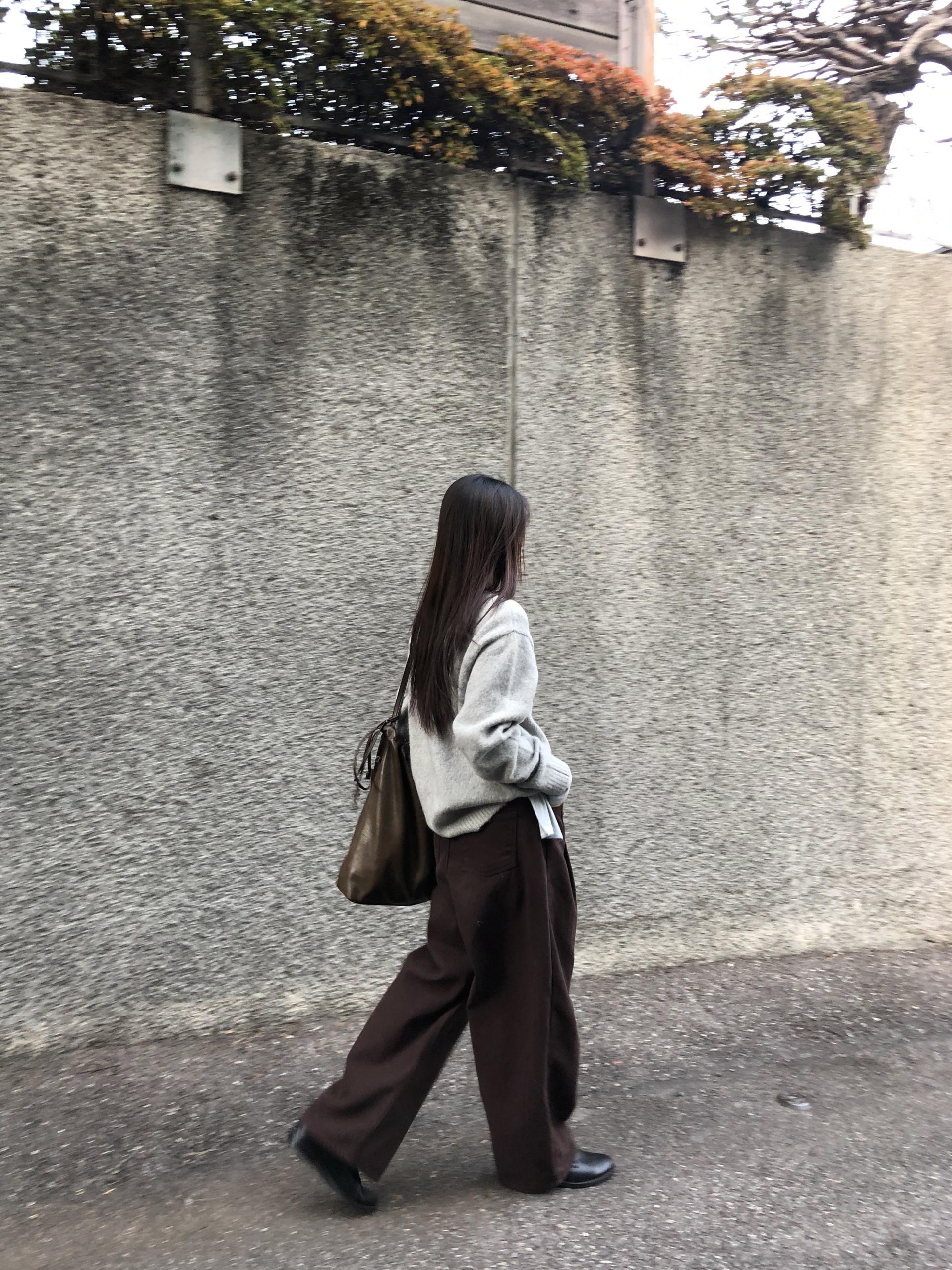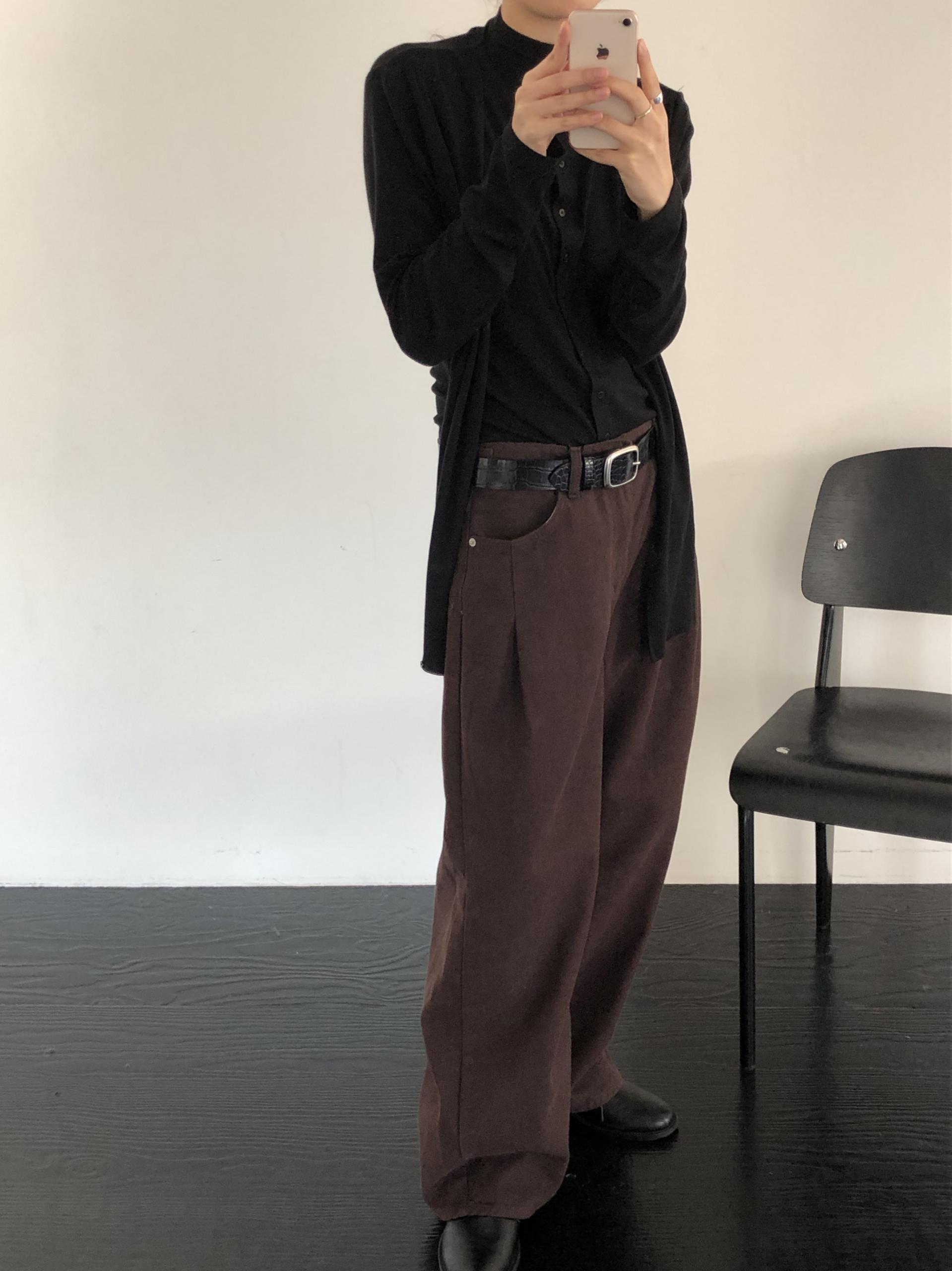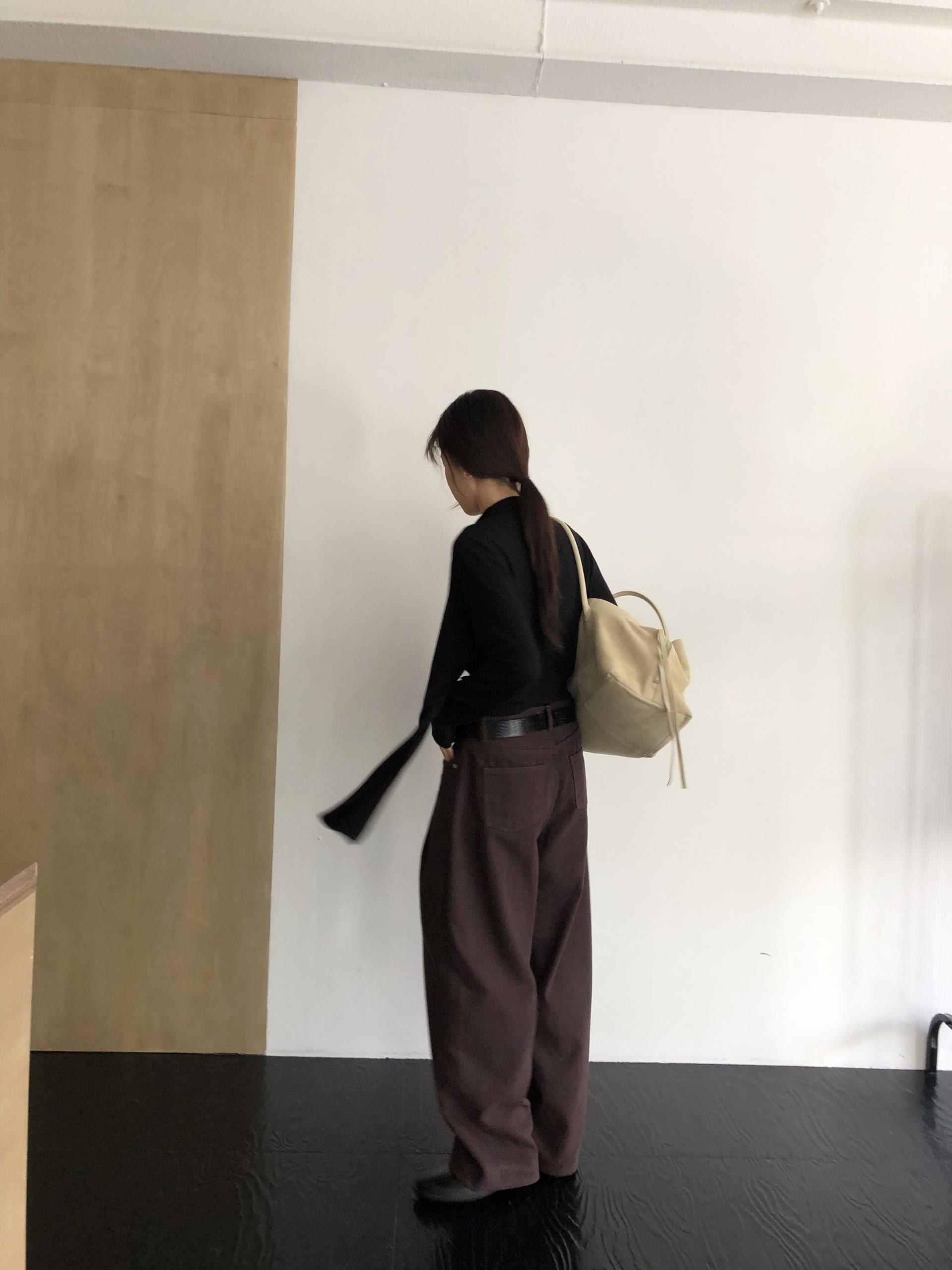 와이드하게 떨어지는 라운드 핏으로 멋스러운 실루엣을 가졌어요. 안쪽이 기모 처리되어 부드럽고 유연합니다. 추울 때는 차갑고 딱딱한 텍스쳐의 팬츠는 눈길도 가지 않는 저로서는,, 겨울내내 참 잘 입게 될 것 같아요.