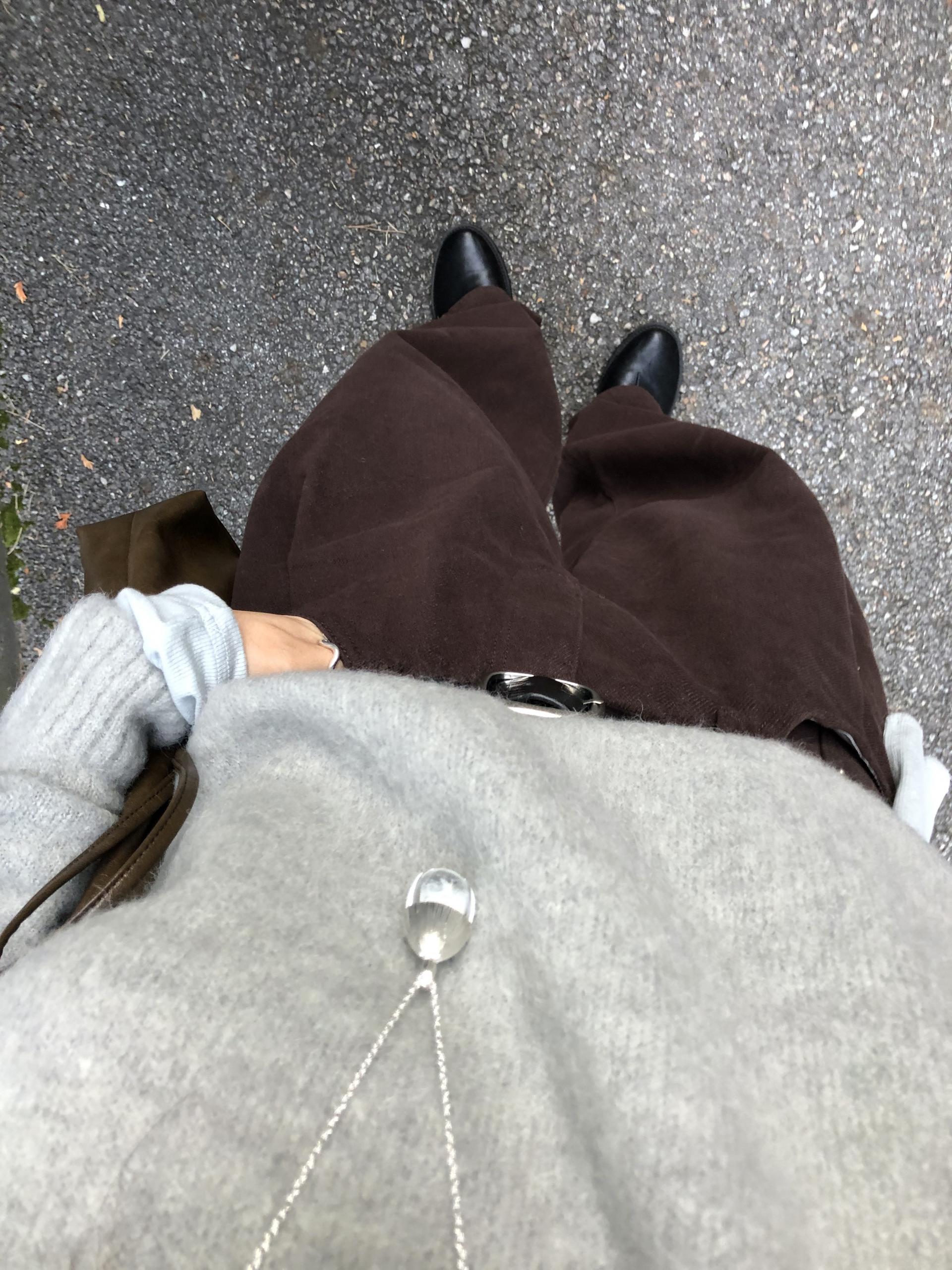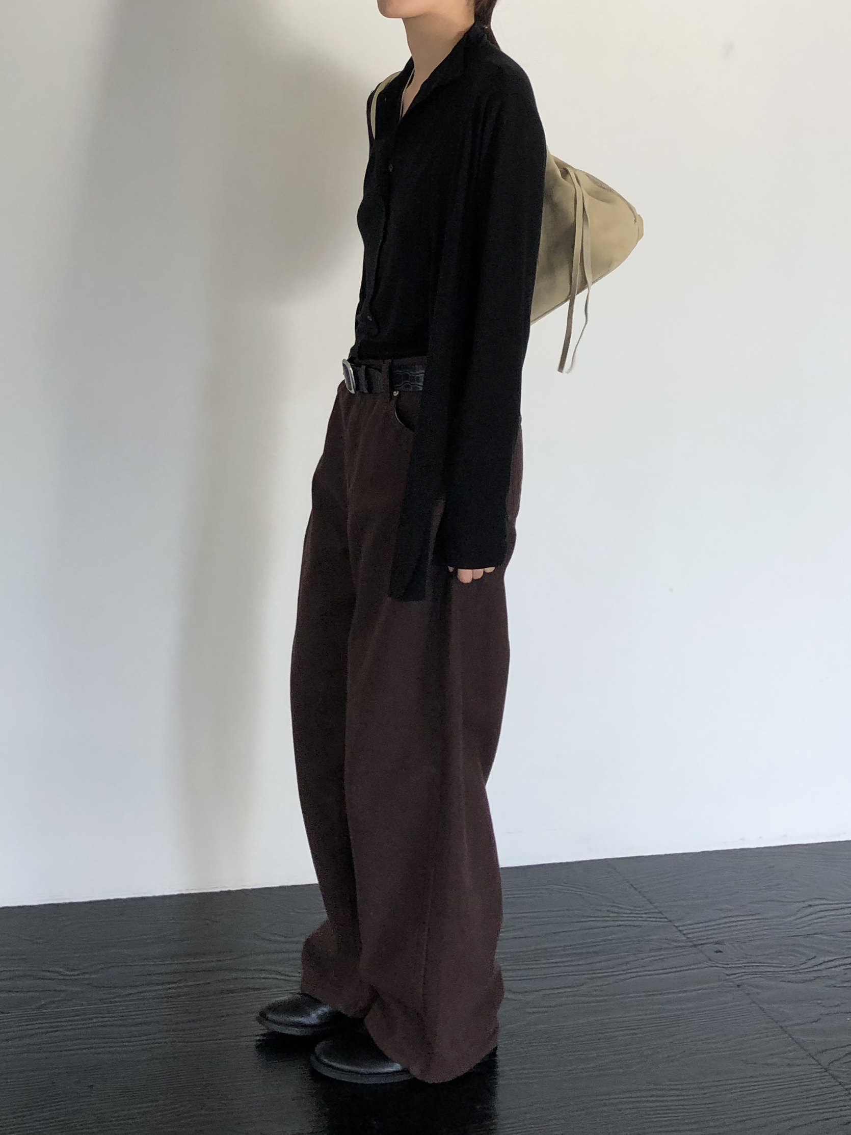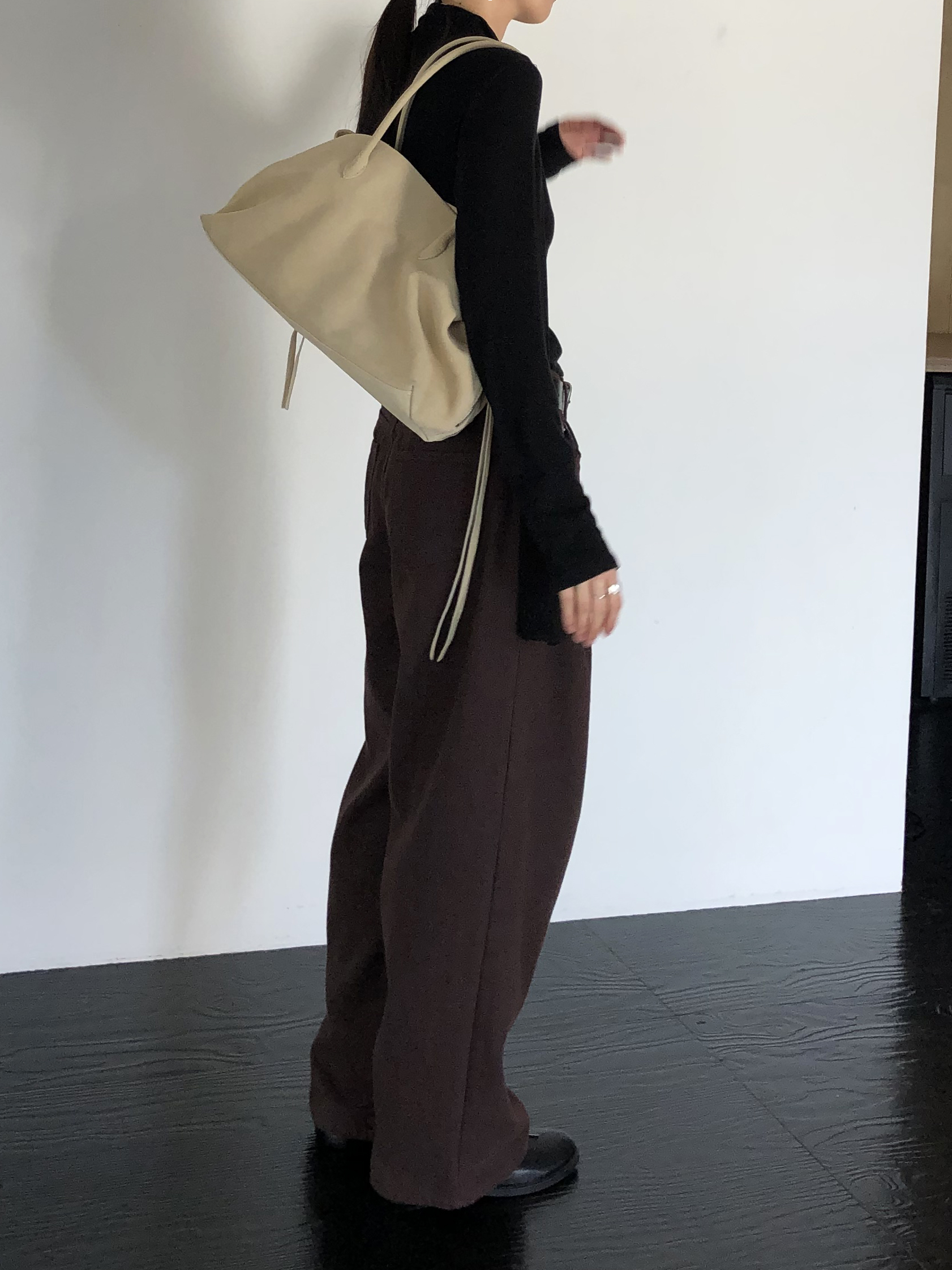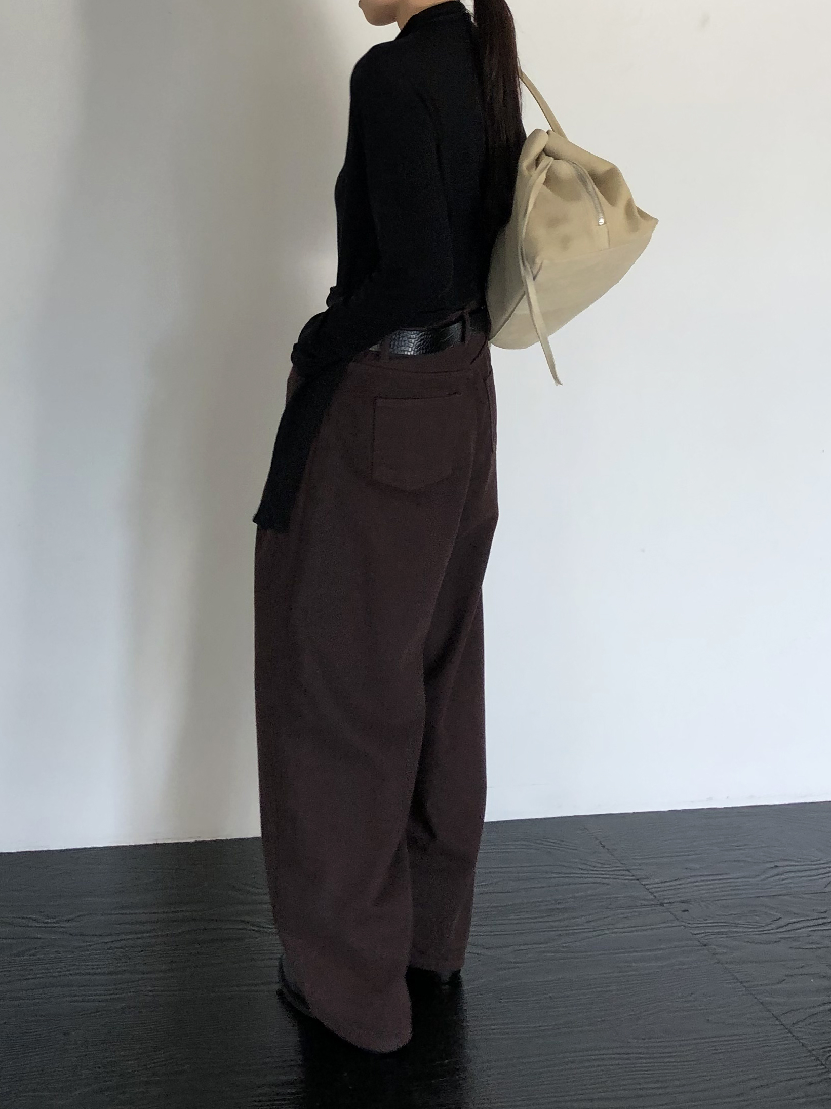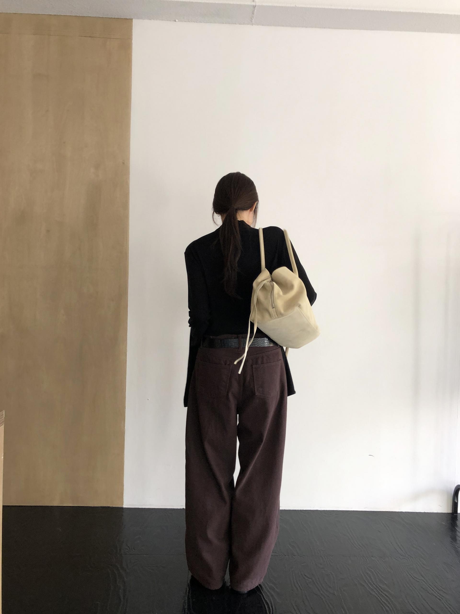 와이드하게 떨어지는 라운드 핏으로 멋스러운 실루엣을 가졌어요. 안쪽이 기모 처리되어 부드럽고 유연합니다. 추울 때는 차갑고 딱딱한 텍스쳐의 팬츠는 눈길도 가지 않는 저로서는,, 겨울내내 참 잘 입게 될 것 같아요.