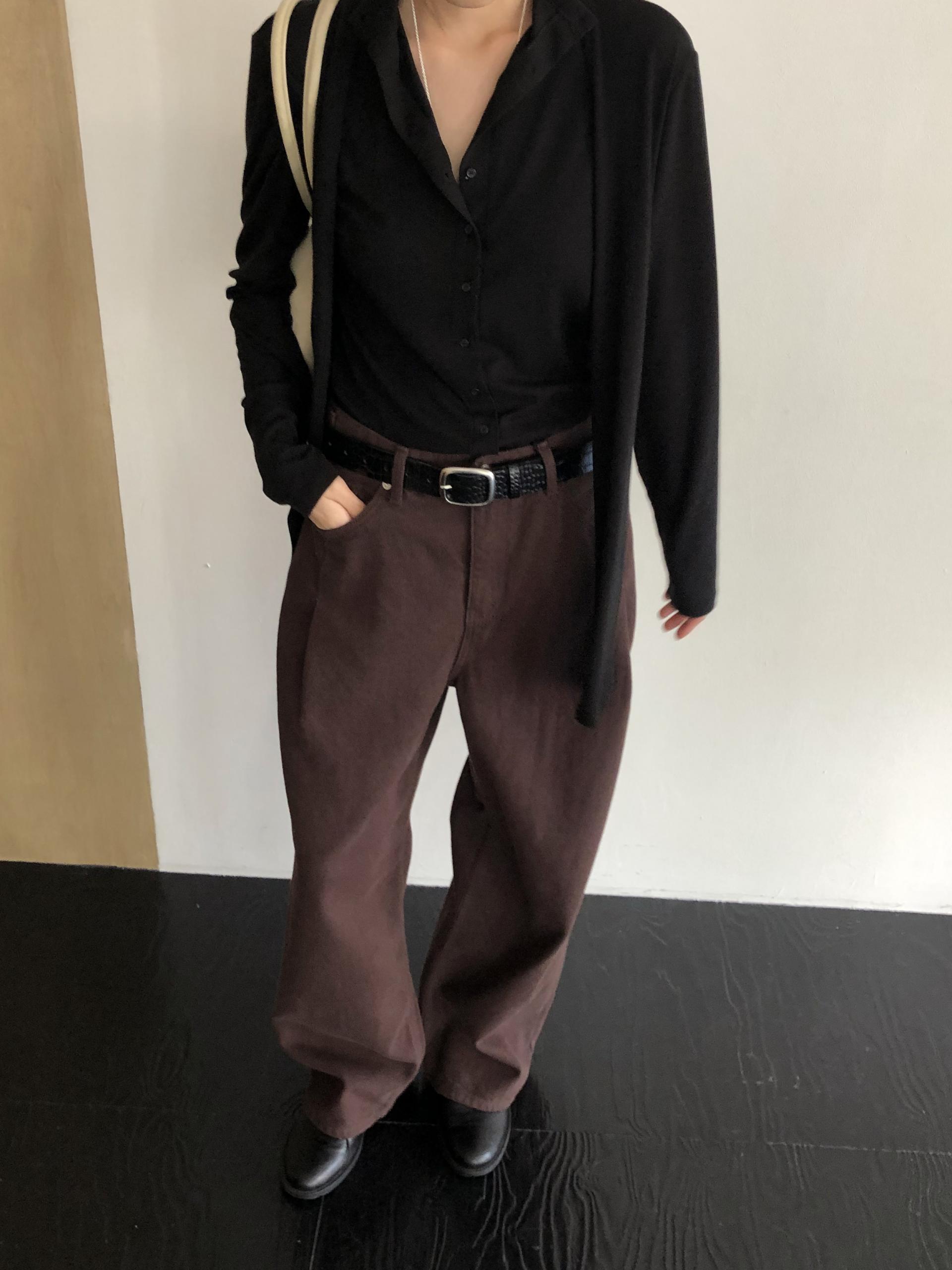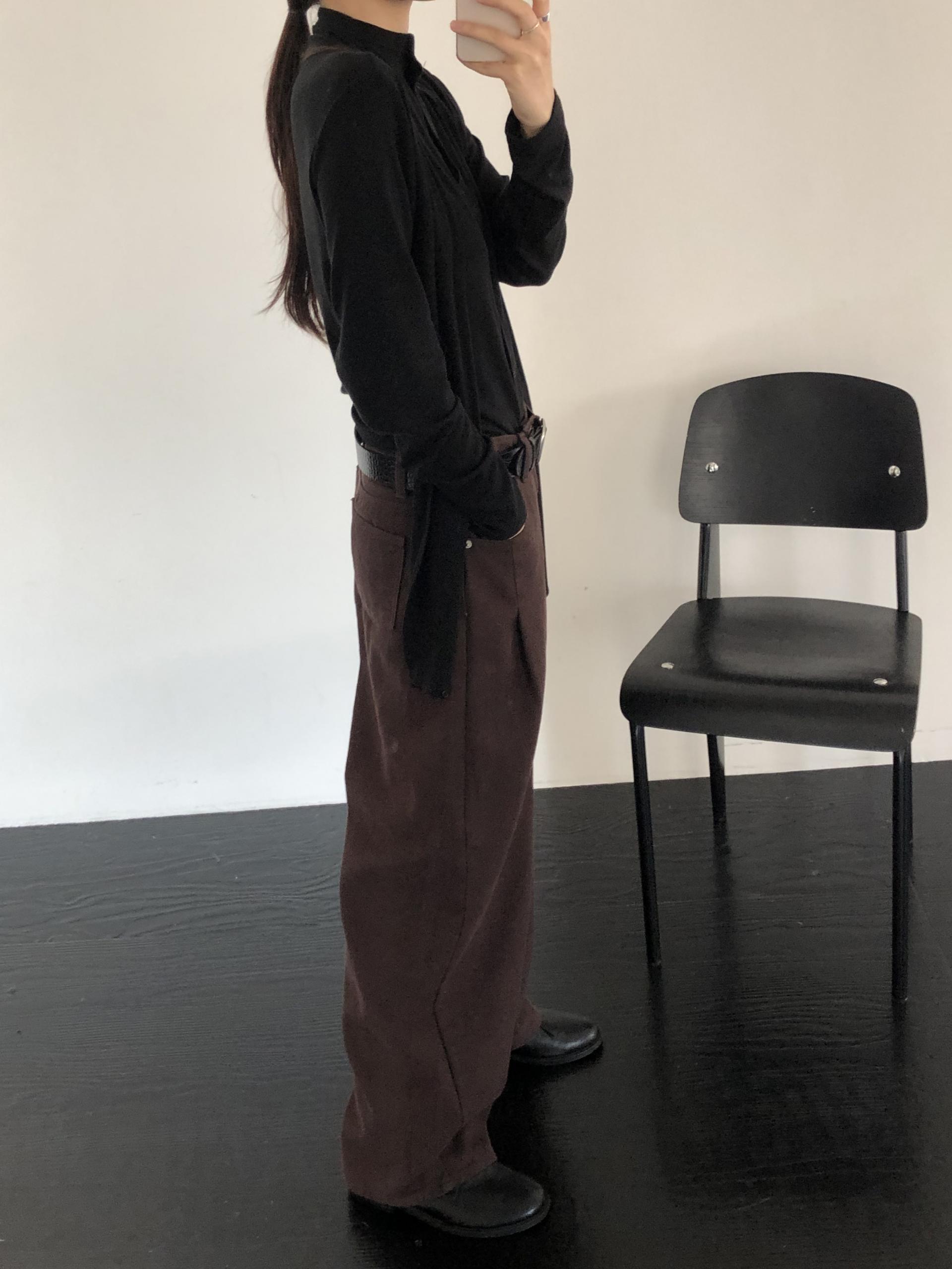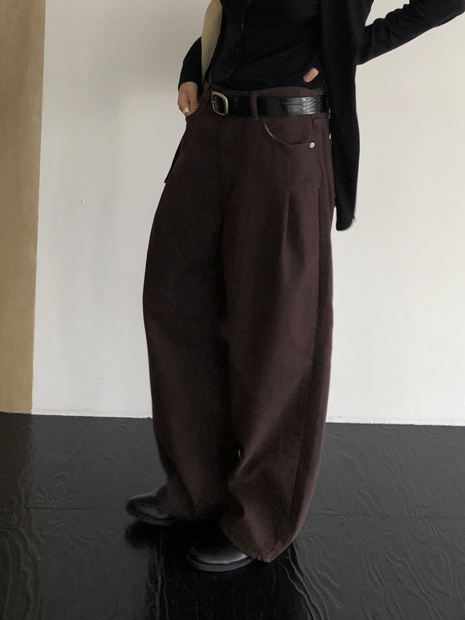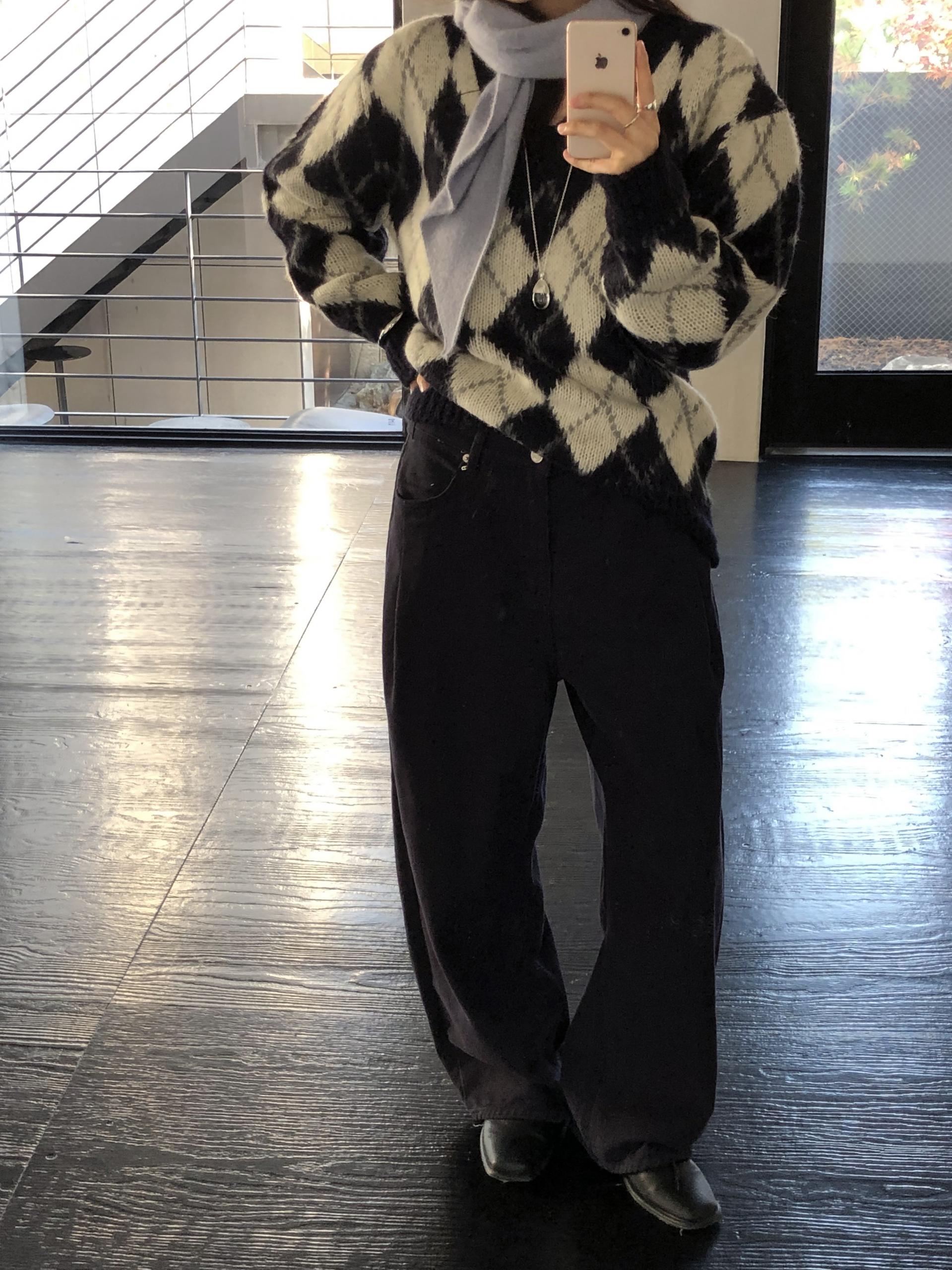 와이드하게 떨어지는 라운드 핏으로 멋스러운 실루엣을 가졌어요. 안쪽이 기모 처리되어 부드럽고 유연합니다. 추울 때는 차갑고 딱딱한 텍스쳐의 팬츠는 눈길도 가지 않는 저로서는,, 겨울내내 참 잘 입게 될 것 같아요.
