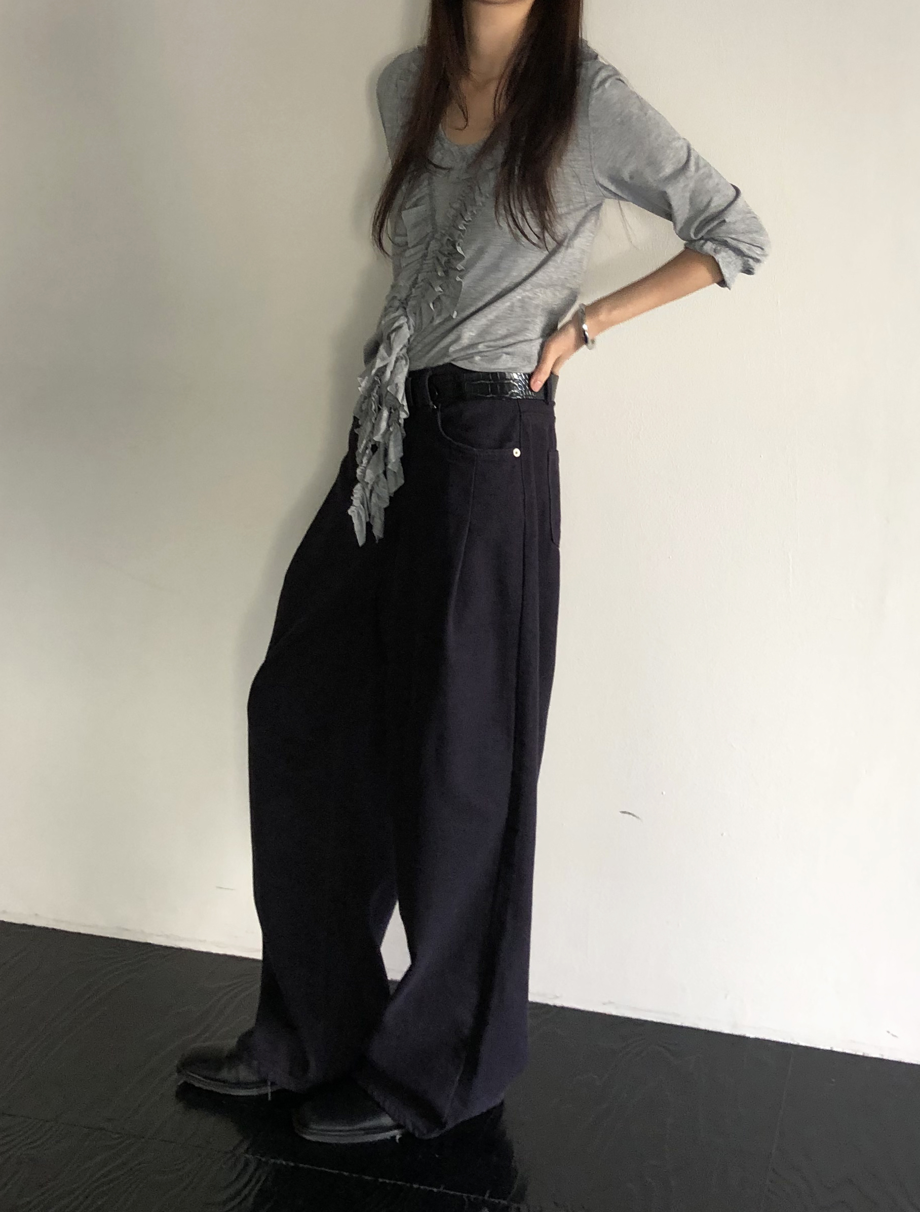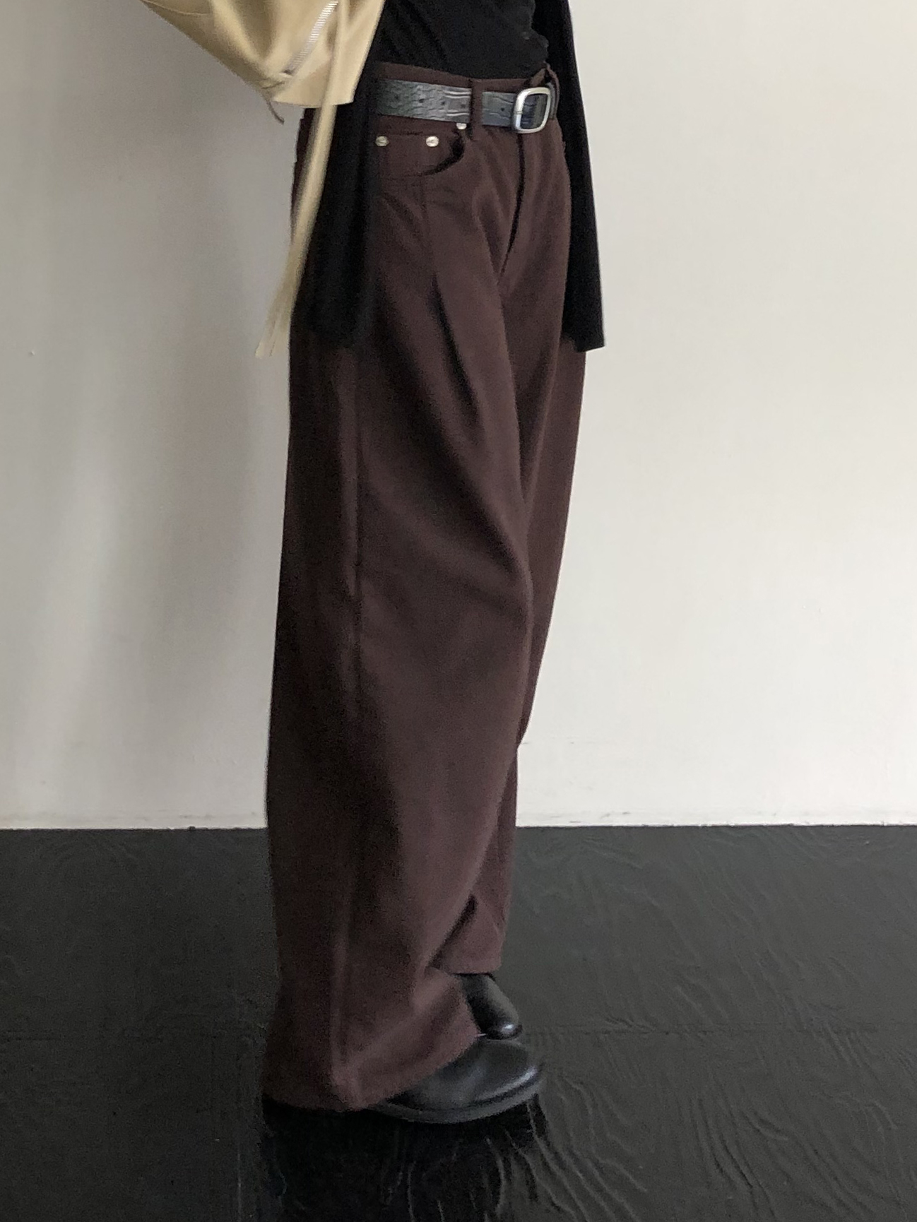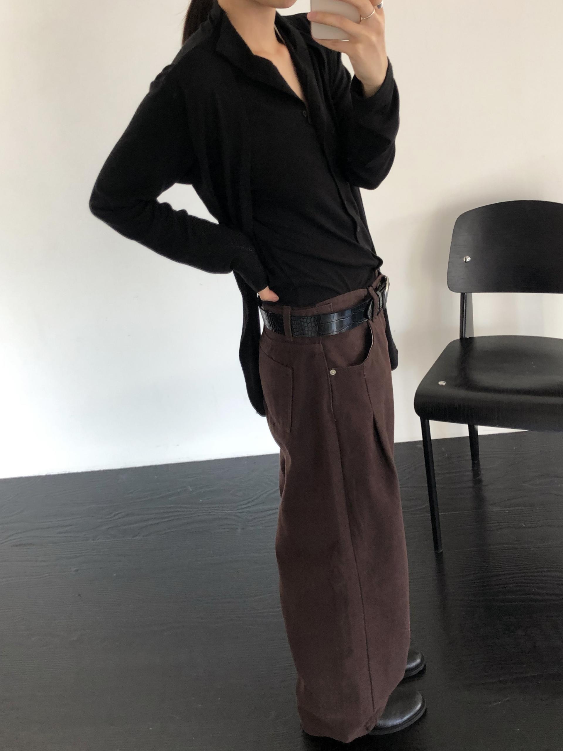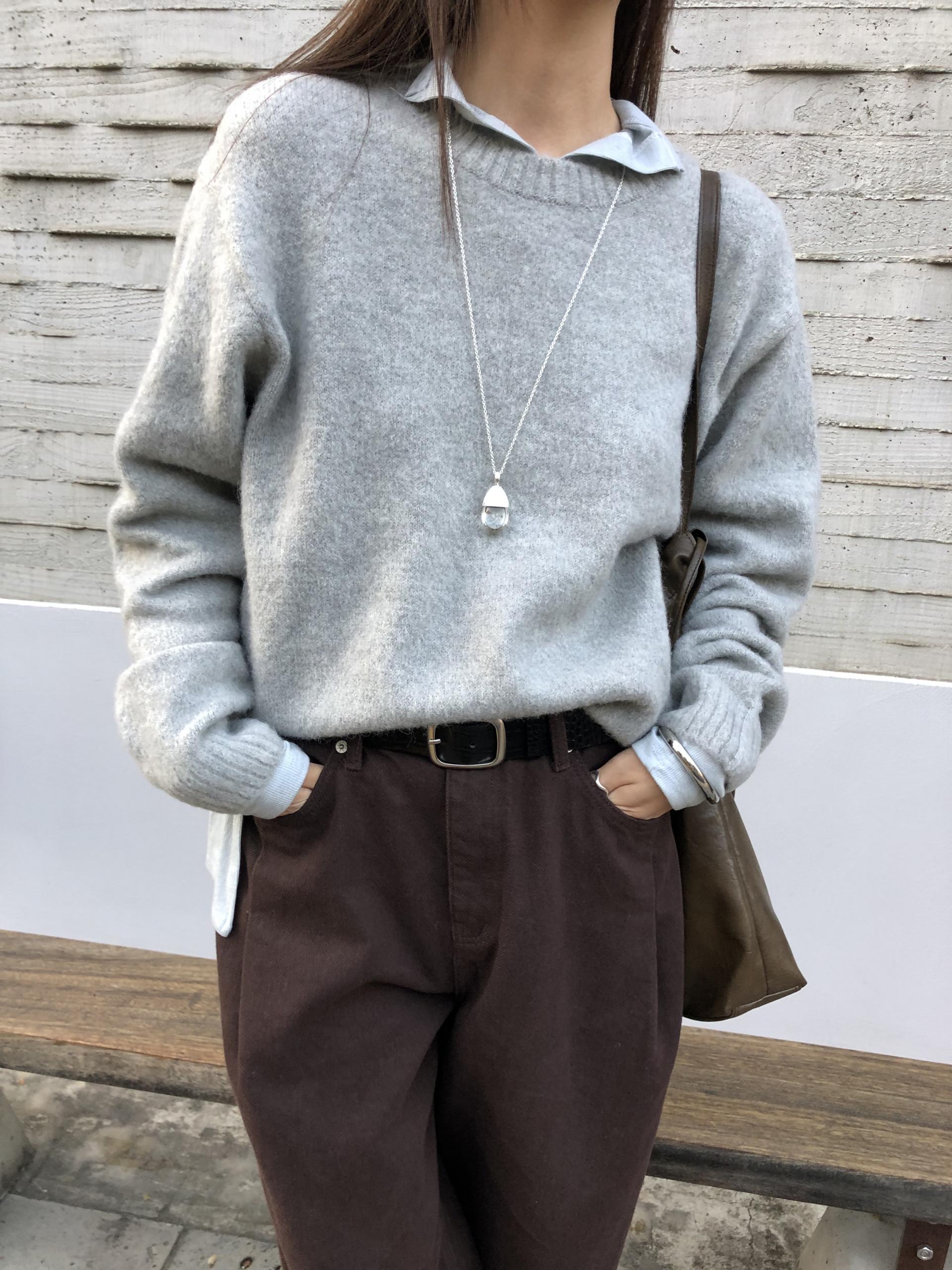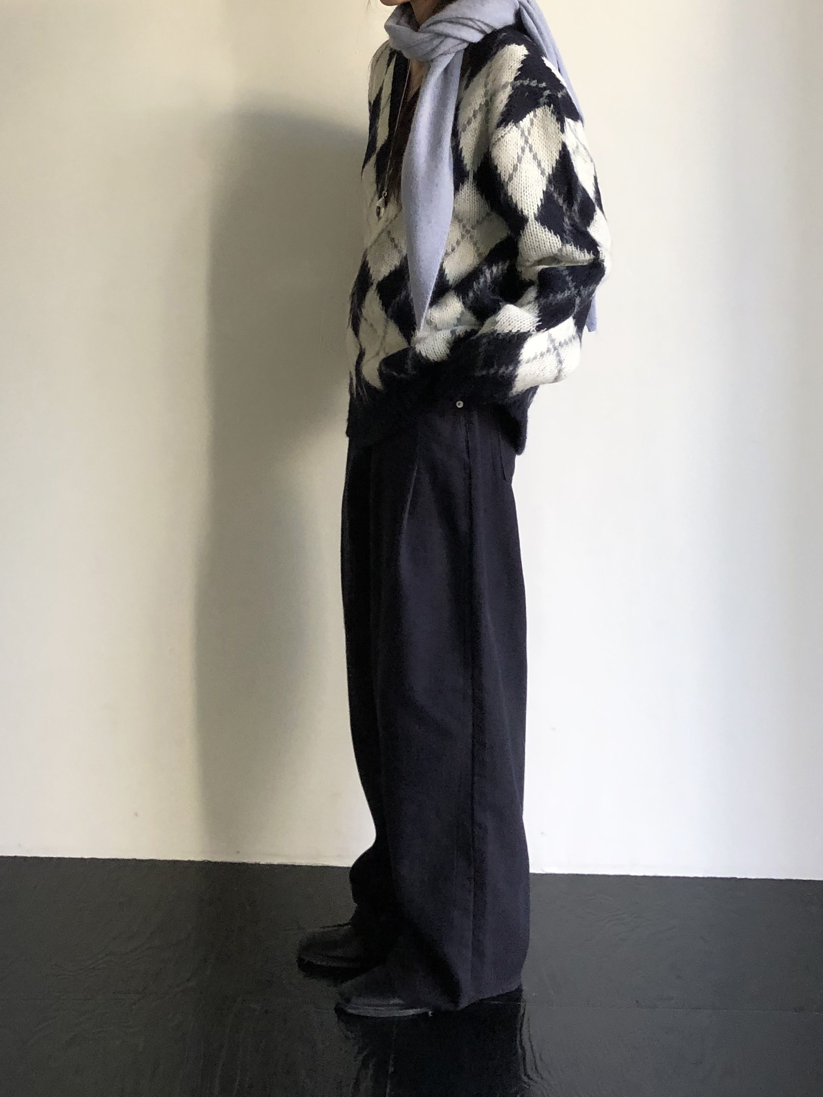 와이드하게 떨어지는 라운드 핏으로 멋스러운 실루엣을 가졌어요. 안쪽이 기모 처리되어 부드럽고 유연합니다. 추울 때는 차갑고 딱딱한 텍스쳐의 팬츠는 눈길도 가지 않는 저로서는,, 겨울내내 참 잘 입게 될 것 같아요.
