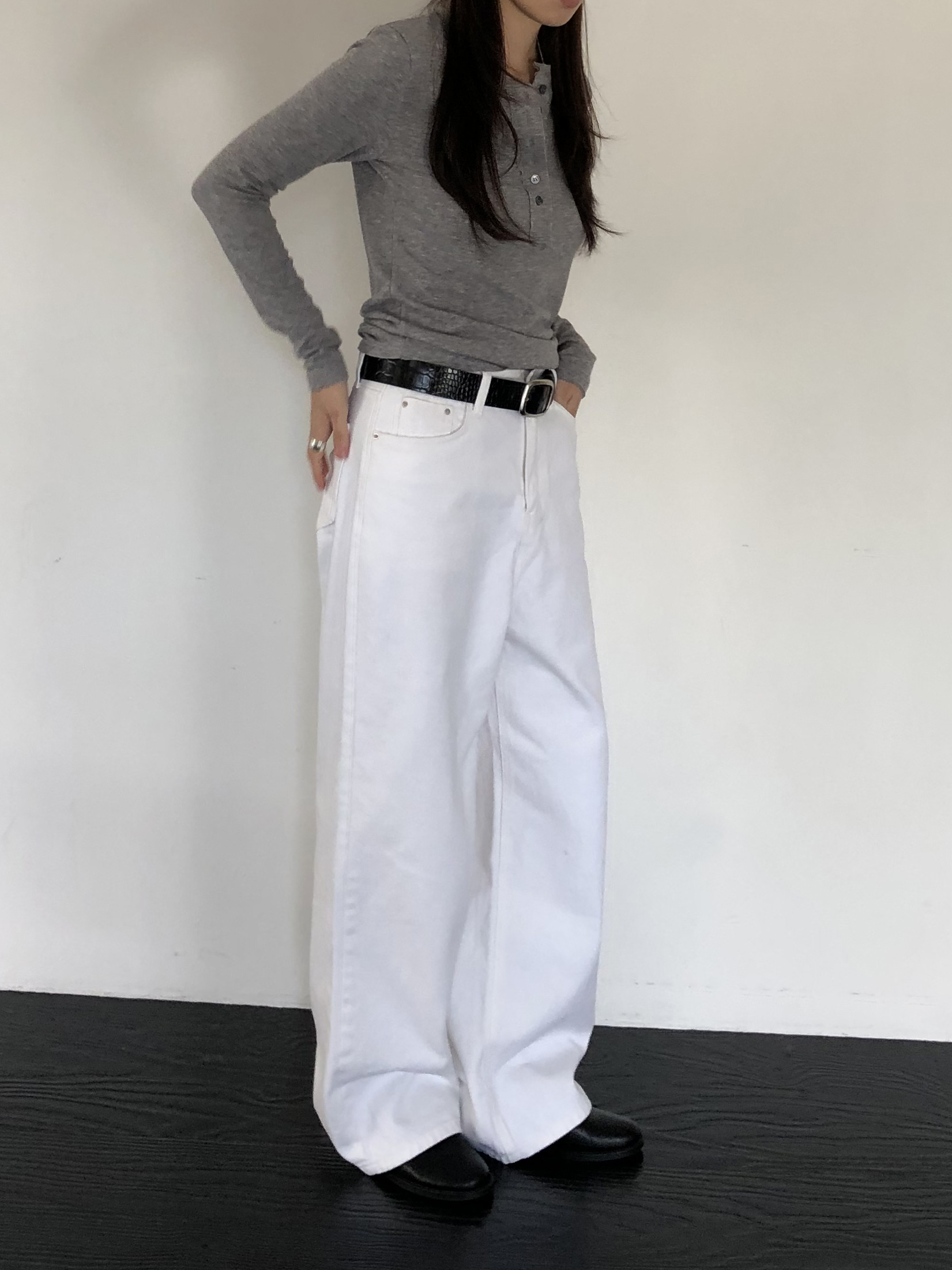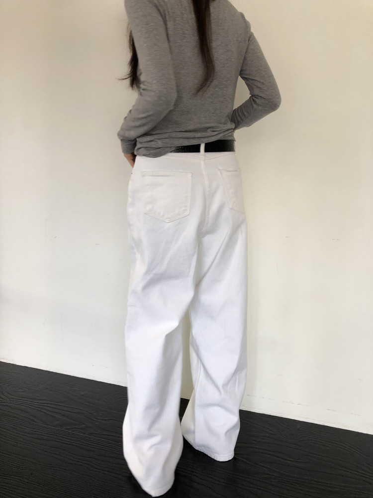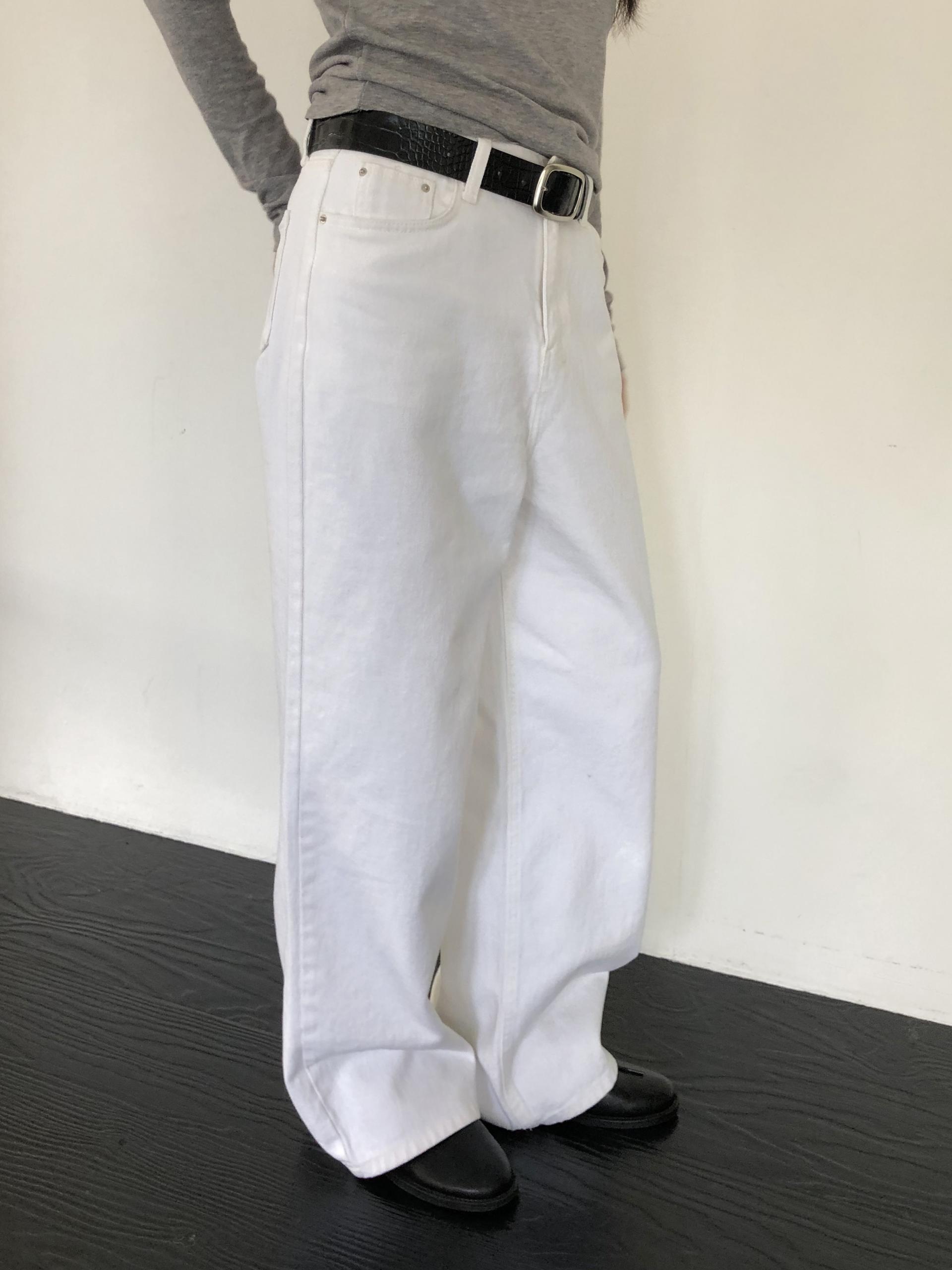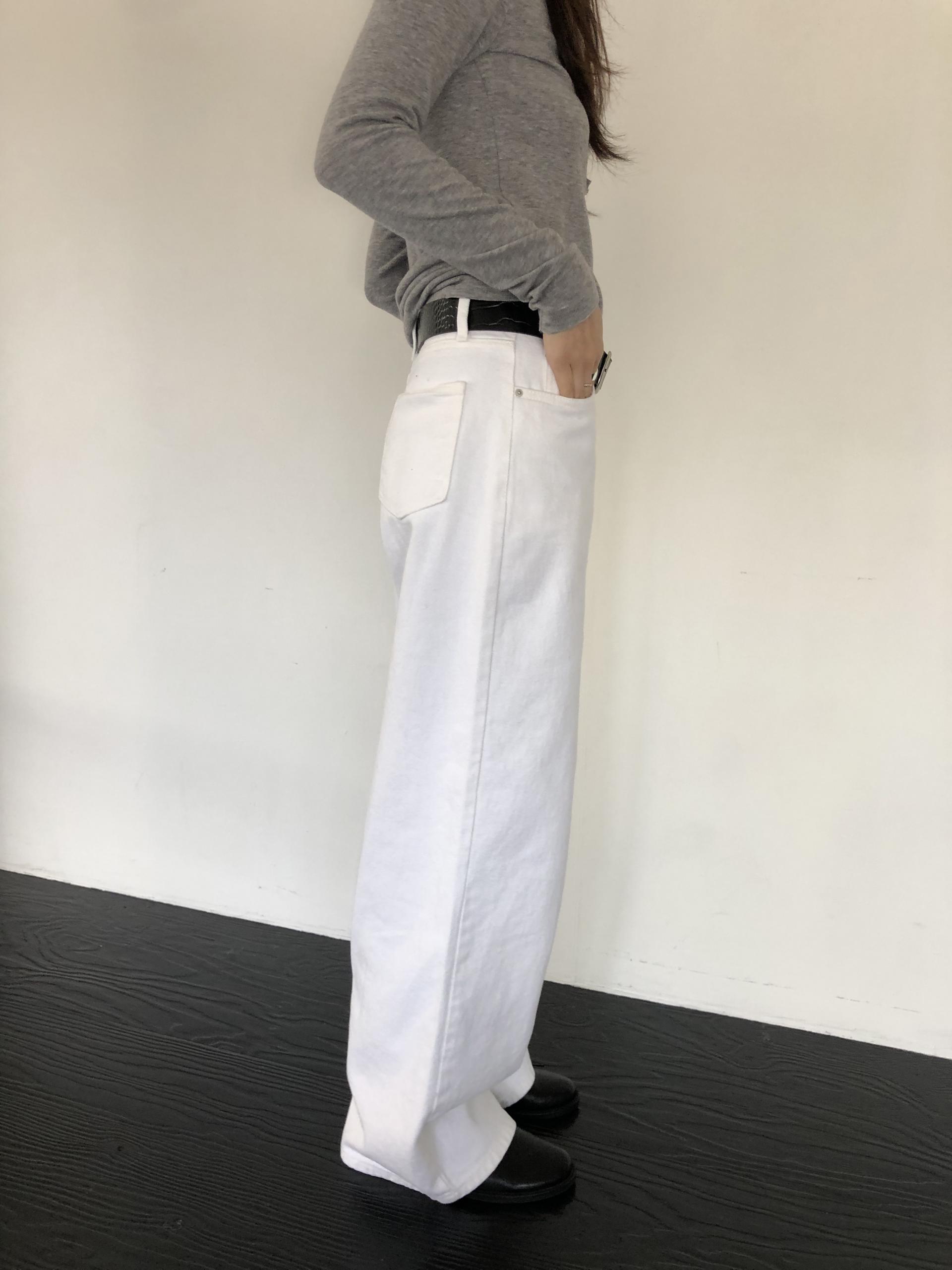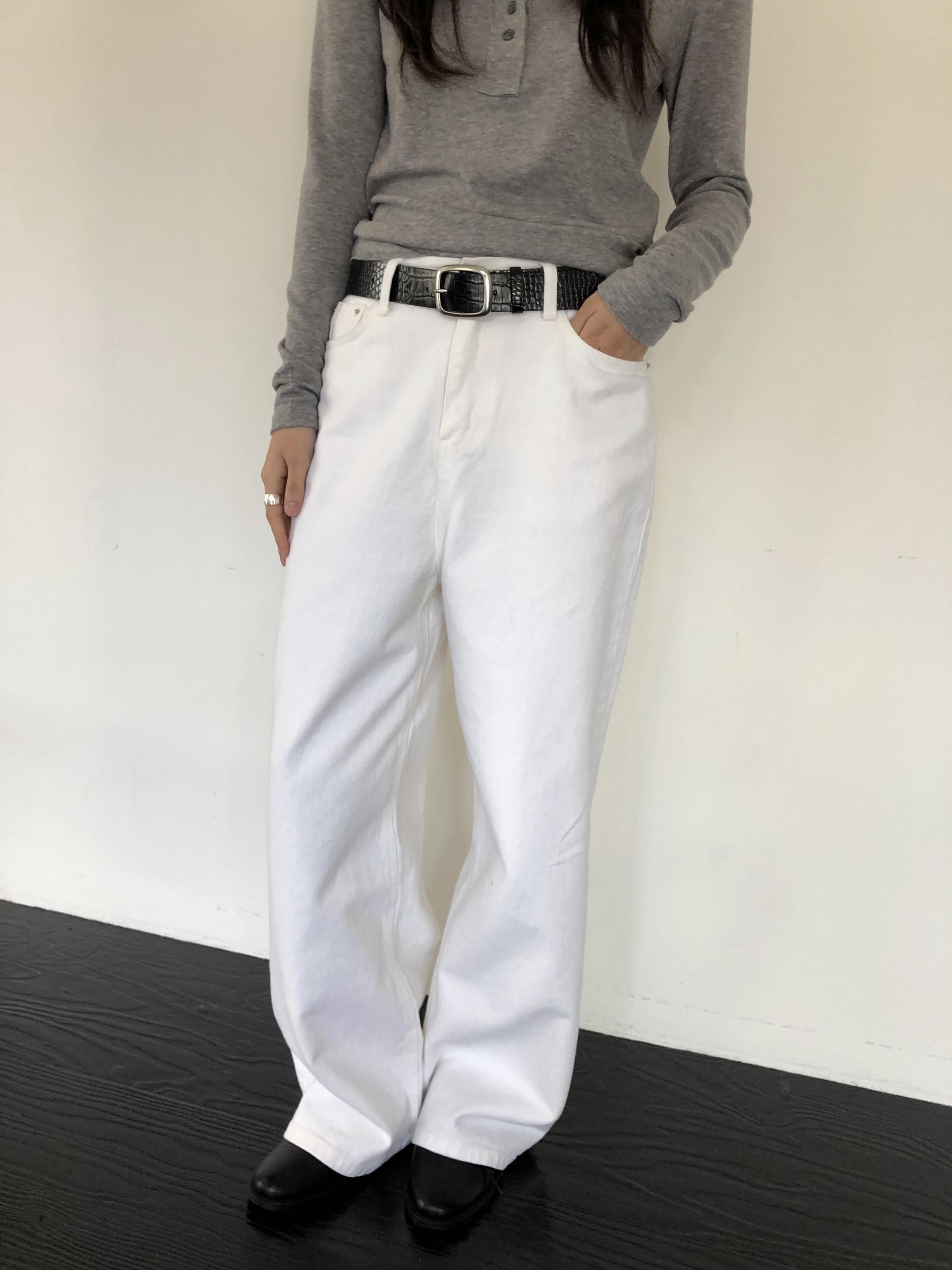 와이드한 실루엣이 자연스럽게 떨어져 편안하면서 멋스러운 라인을 만들고, 화이트 컬러 특유의 깨끗한 인상이 전체적인 룩을 산뜻하고 깔끔하게 정리해줍니다.