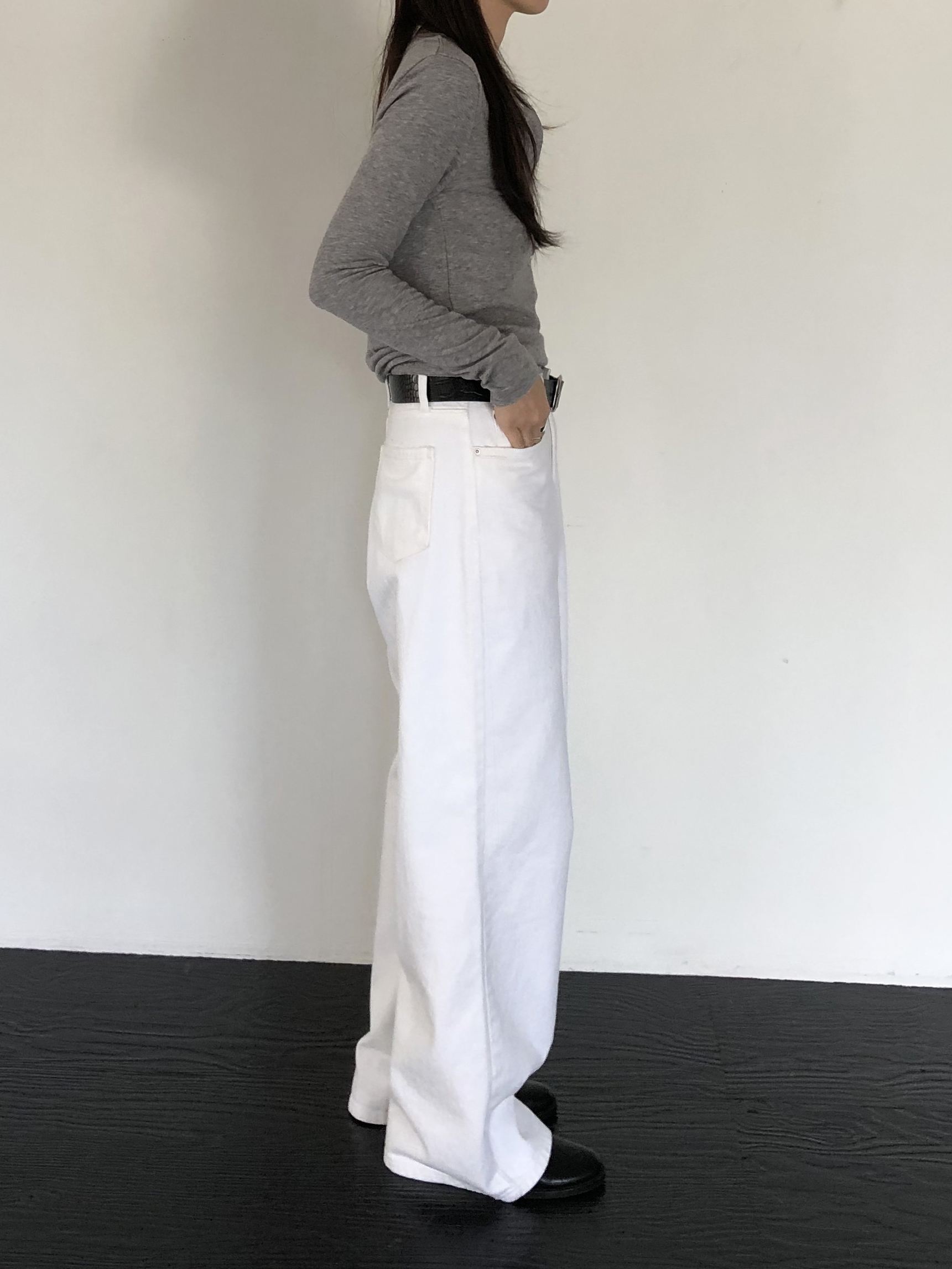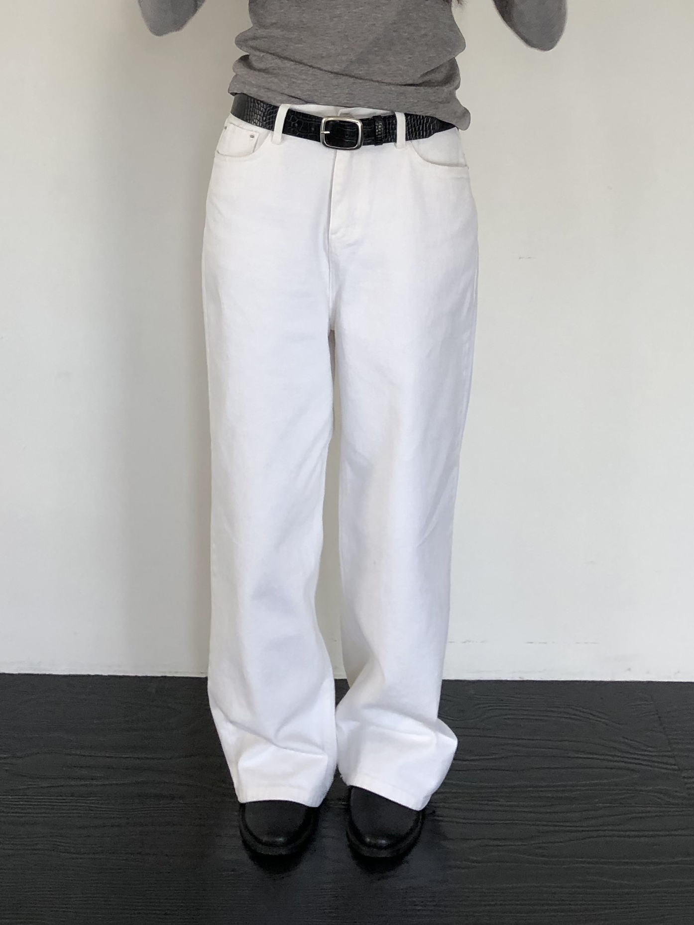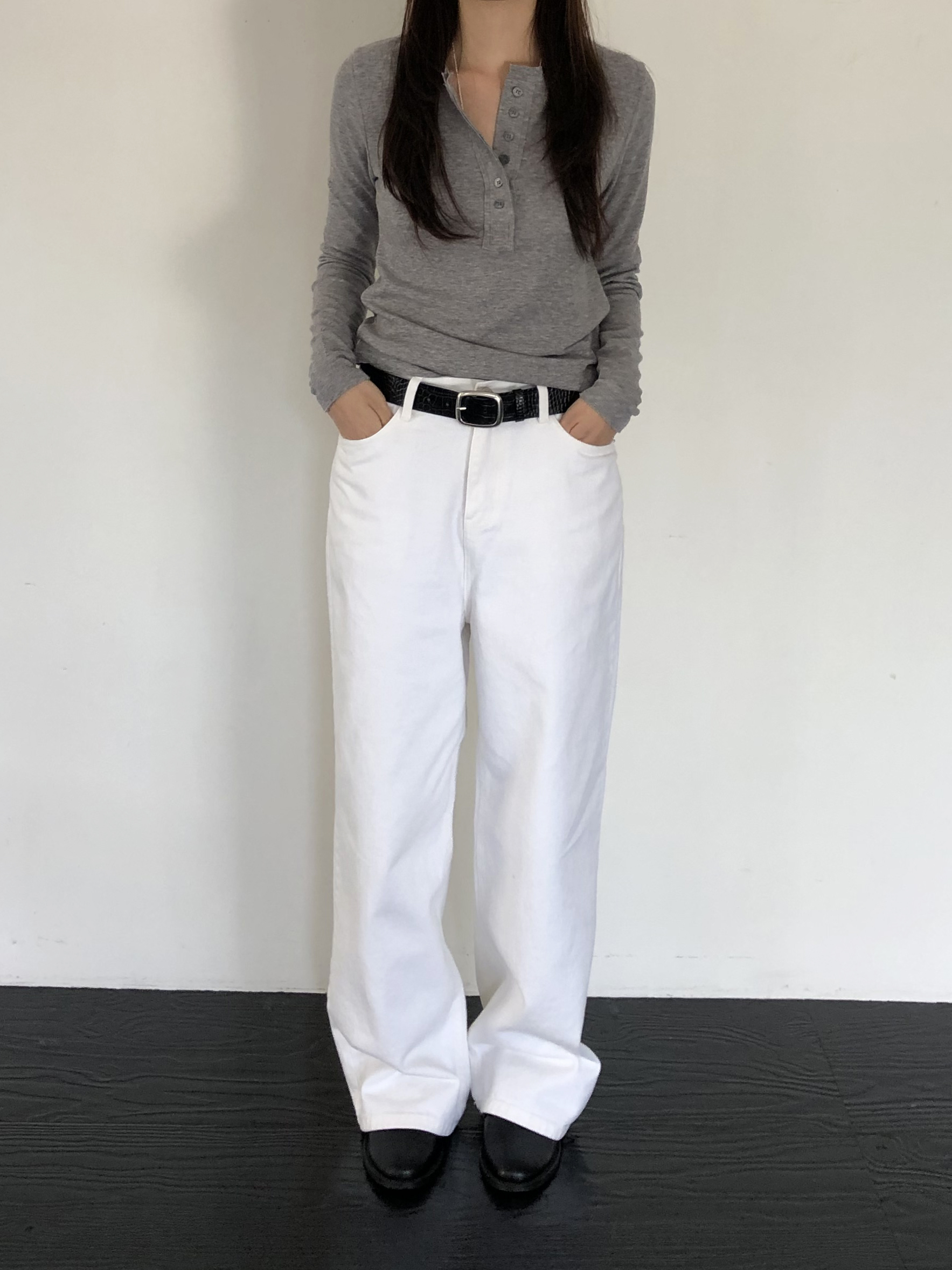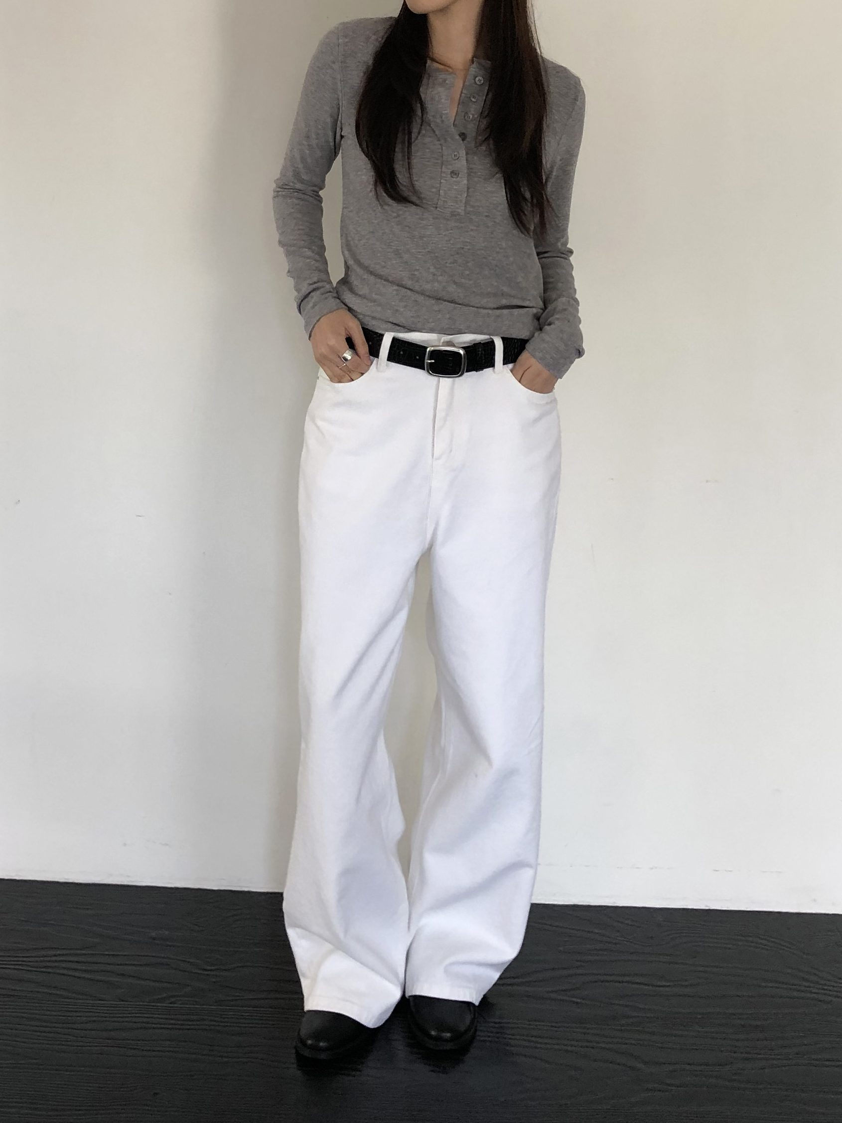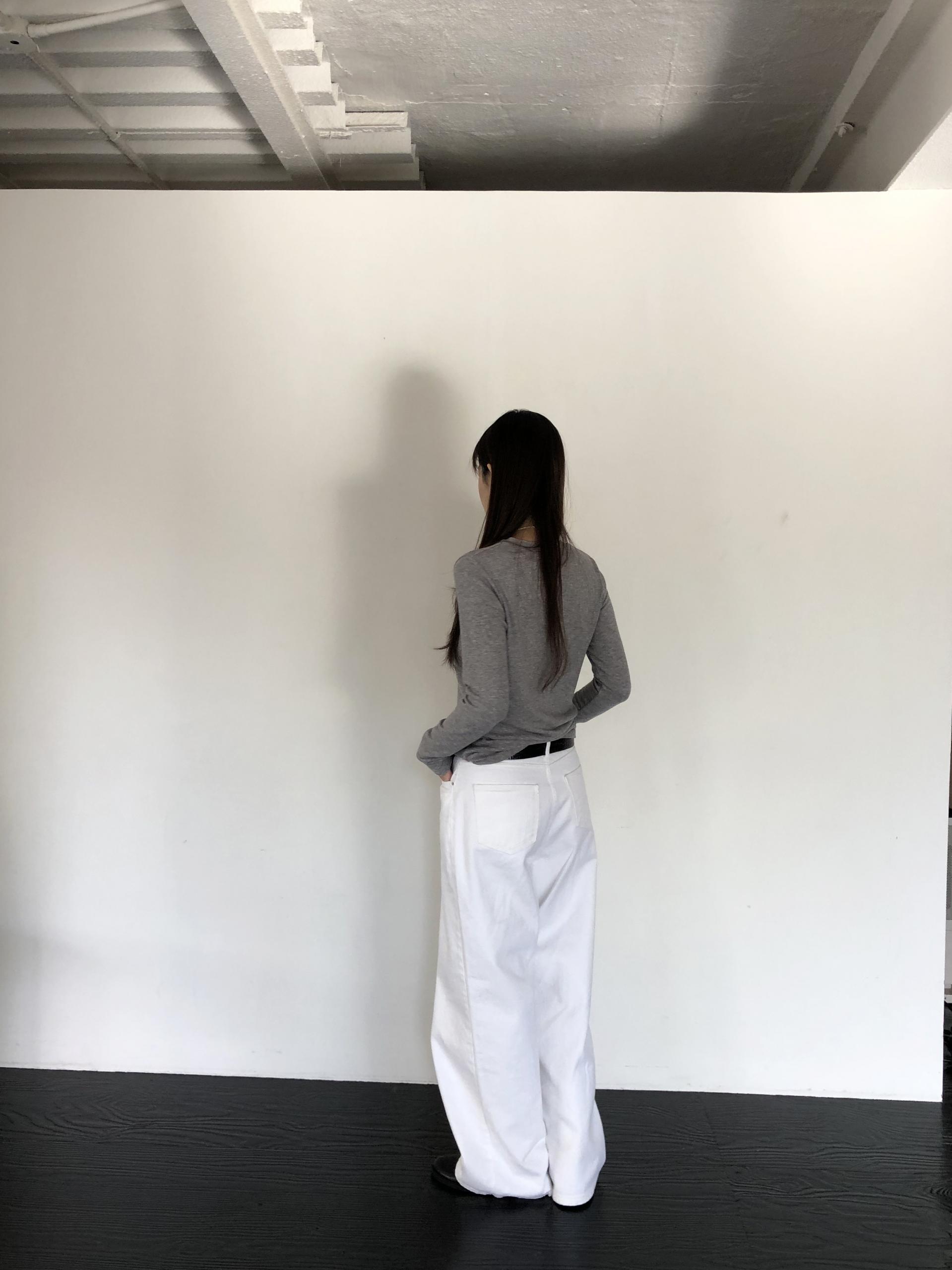 와이드한 실루엣이 자연스럽게 떨어져 편안하면서 멋스러운 라인을 만들고, 화이트 컬러 특유의 깨끗한 인상이 전체적인 룩을 산뜻하고 깔끔하게 정리해줍니다.