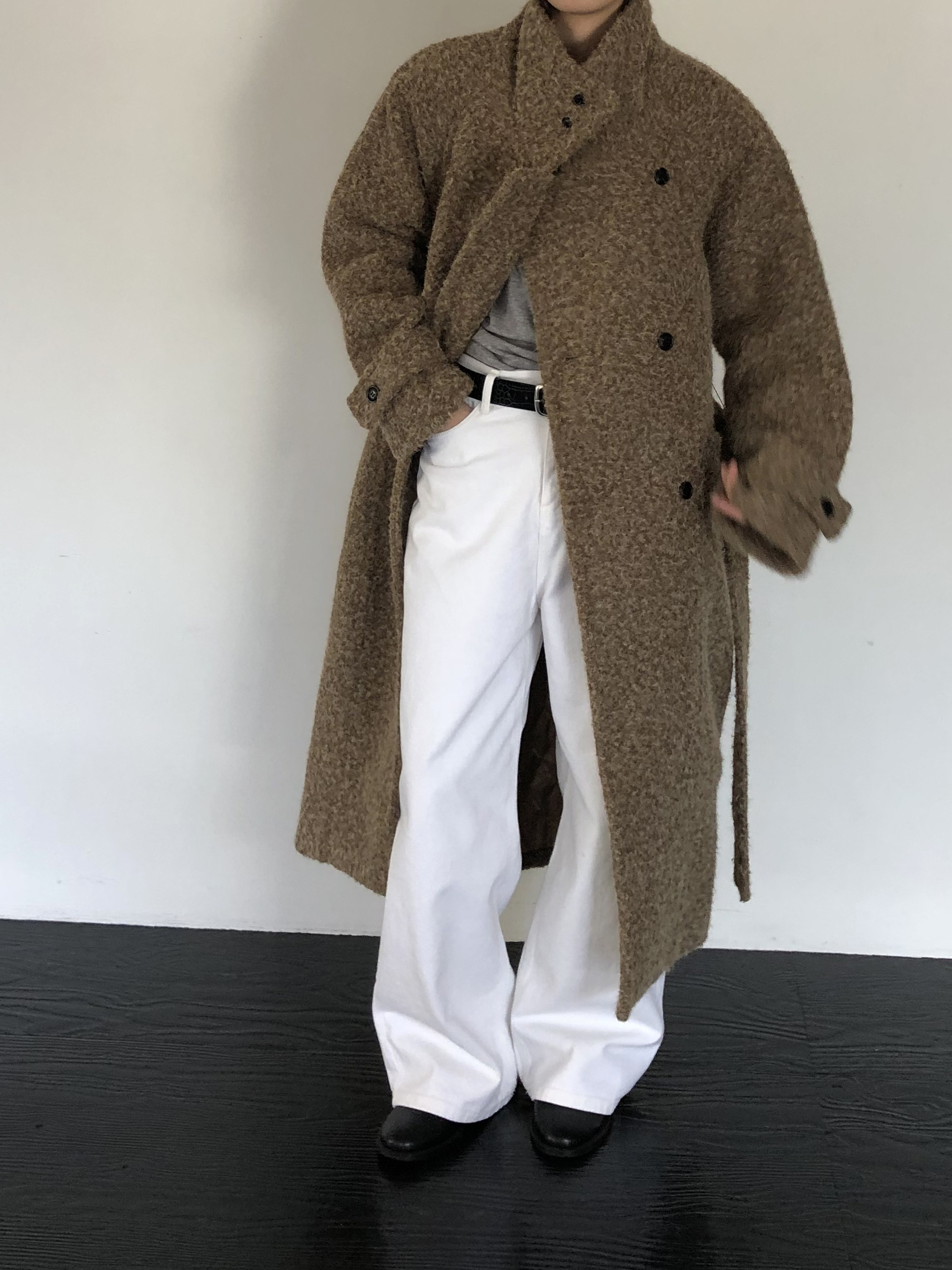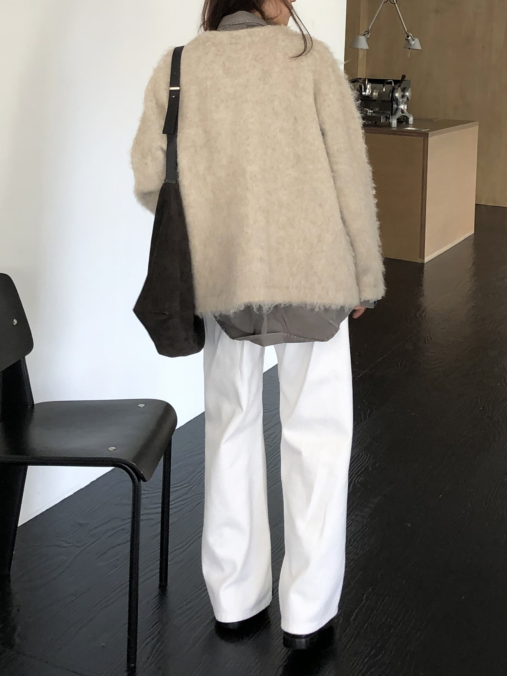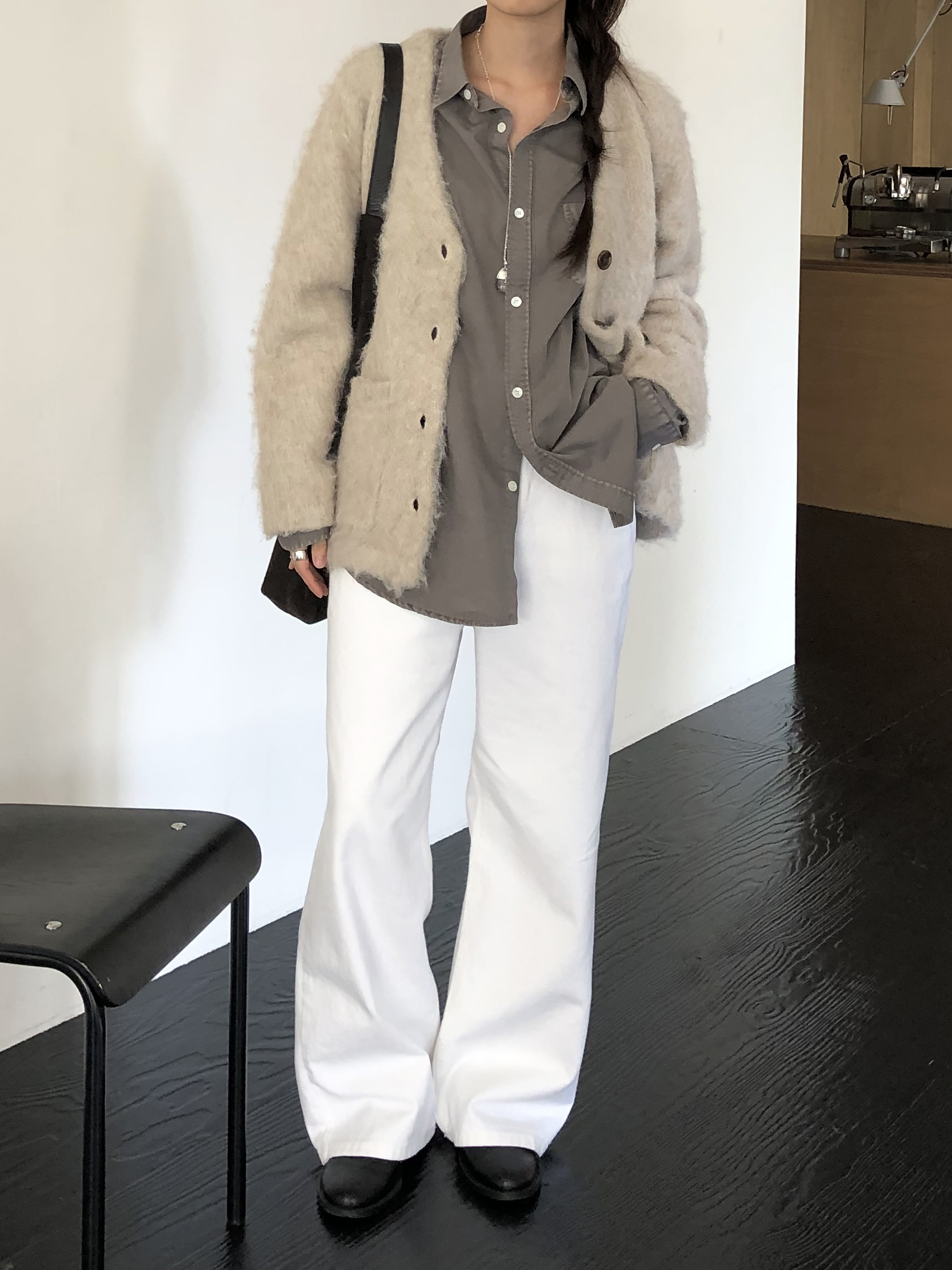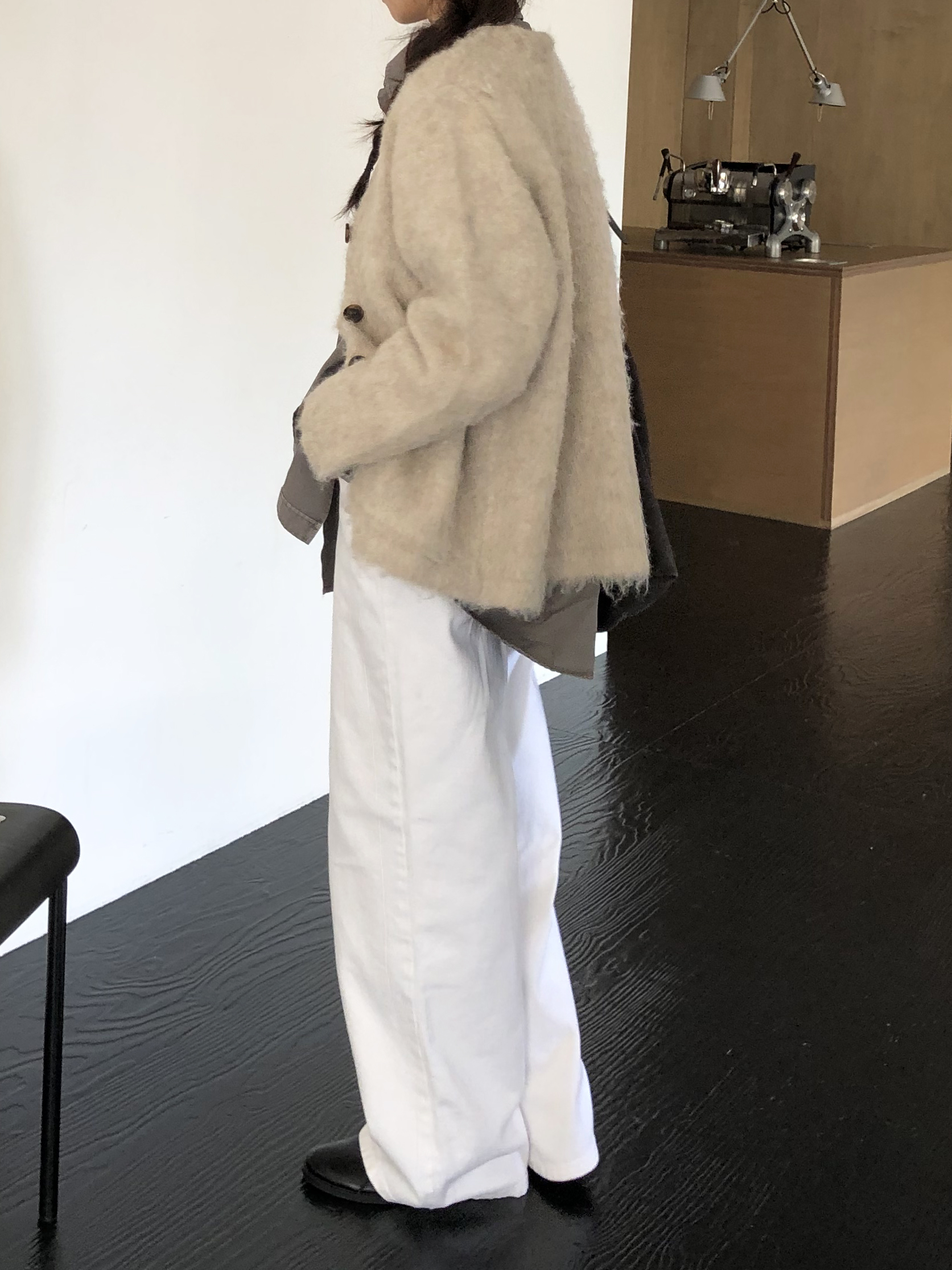 와이드한 실루엣이 자연스럽게 떨어져 편안하면서 멋스러운 라인을 만들고, 화이트 컬러 특유의 깨끗한 인상이 전체적인 룩을 산뜻하고 깔끔하게 정리해줍니다.