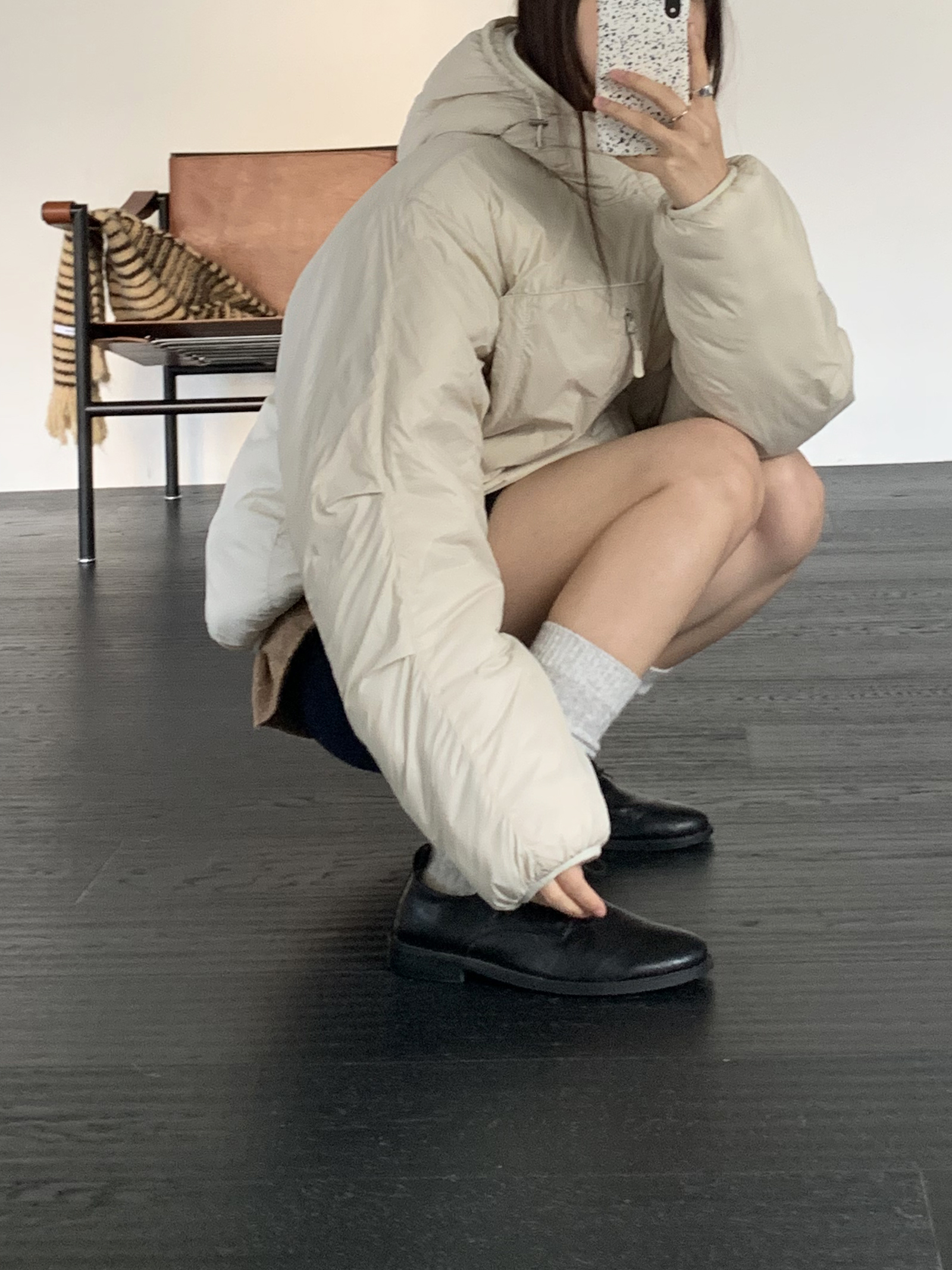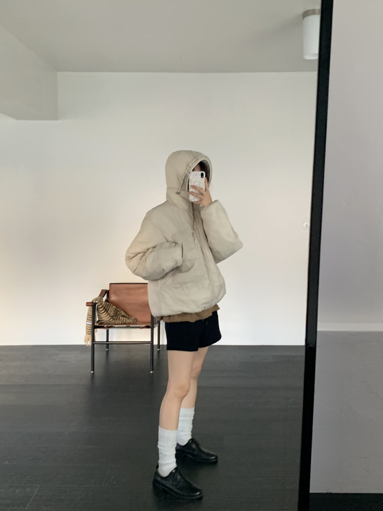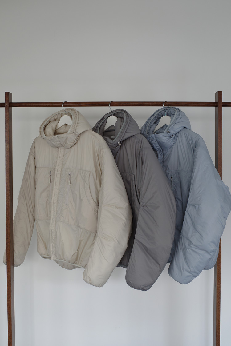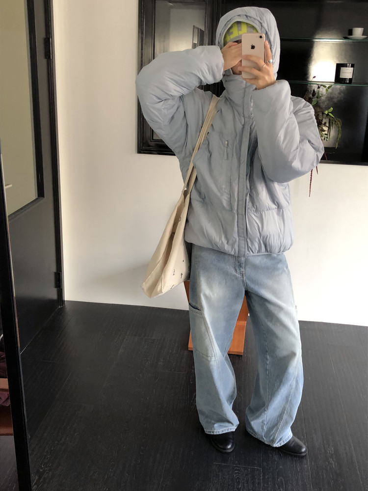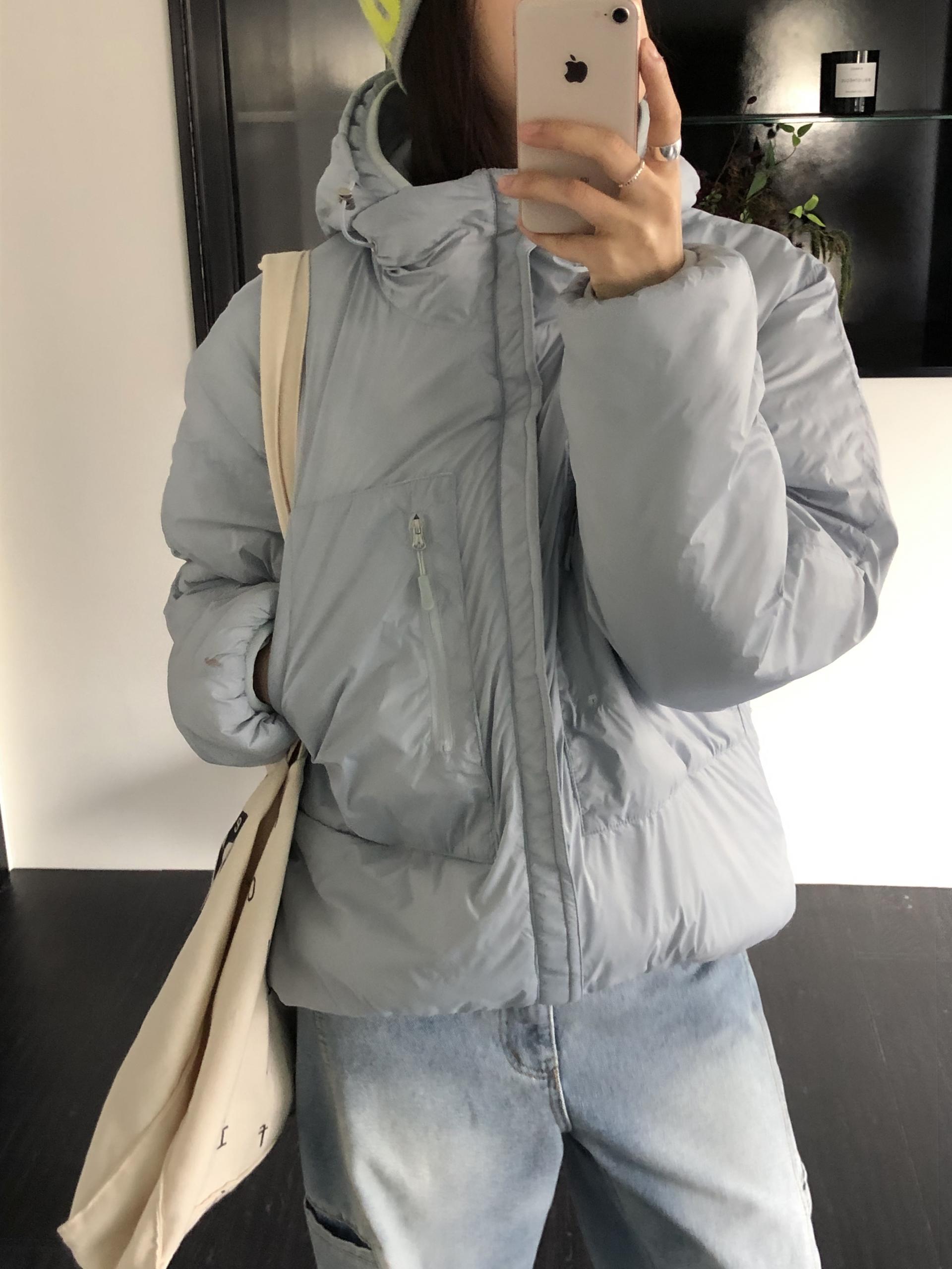 살짝 반투명하게 느껴지는 원단감이 이 패딩의 첫인상이었어요 과하게 광택이 도는 소재가 아닌, 깨끗하고 보송한 질감으로 컬러가 들어가도 전혀 부담스럽지 않았고 오히려 한 톤 부드럽게 정리됩니다. 소라색과 베이지, 그레이 - 세 컬러 모두 맑고 차분하게 표현됩니다.