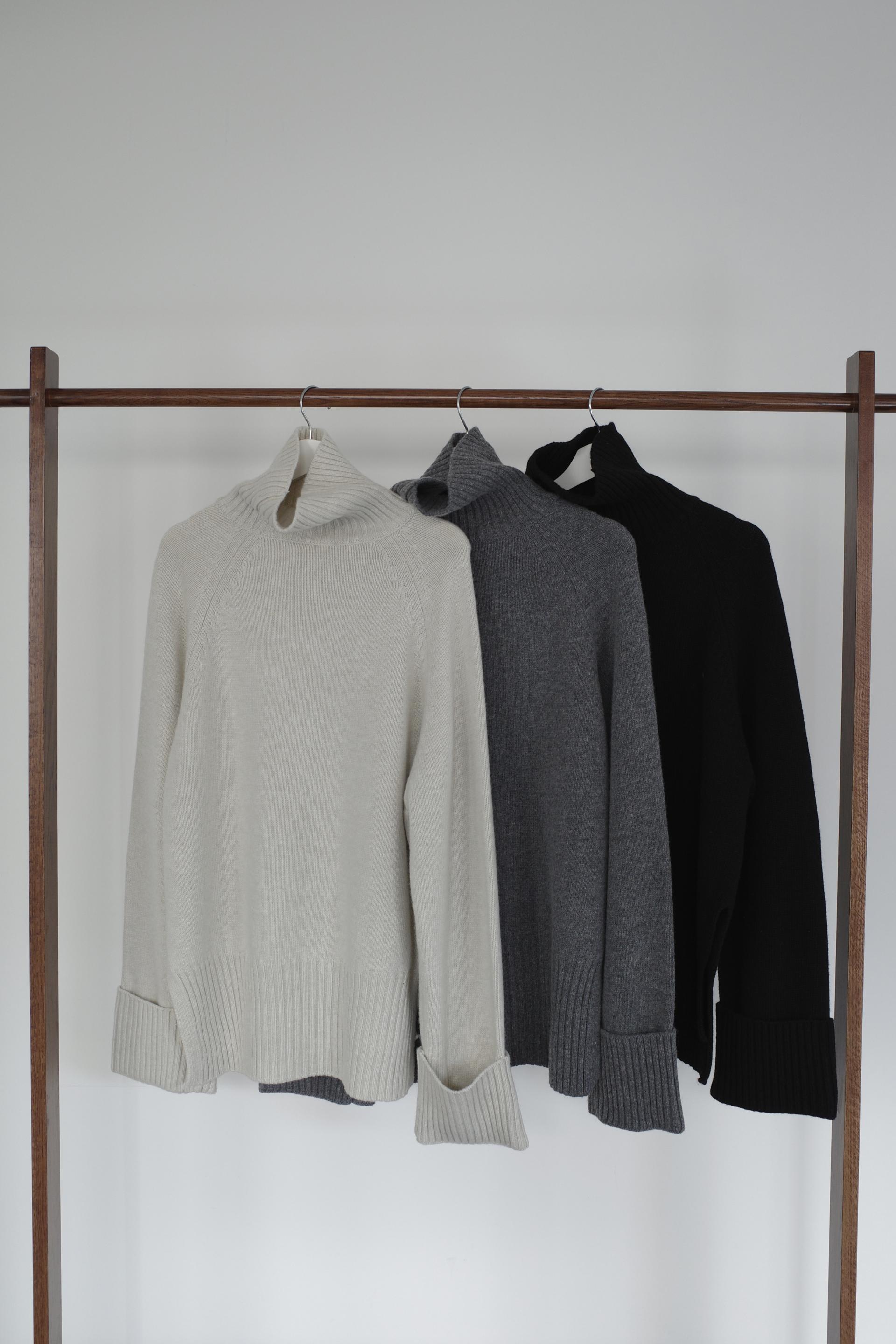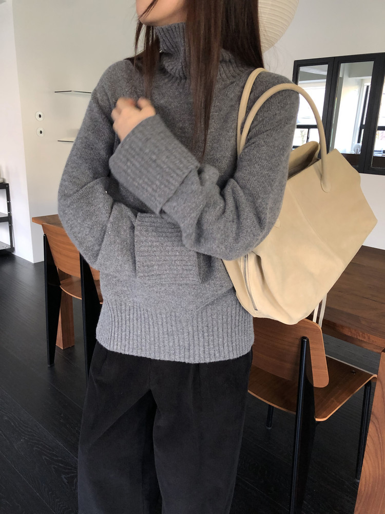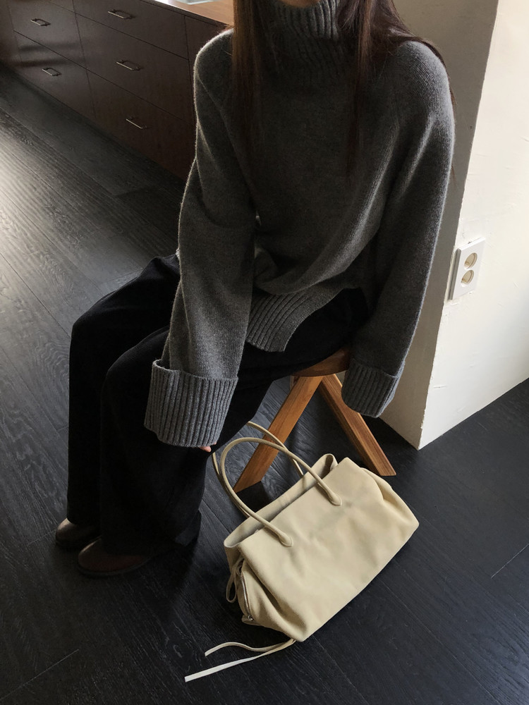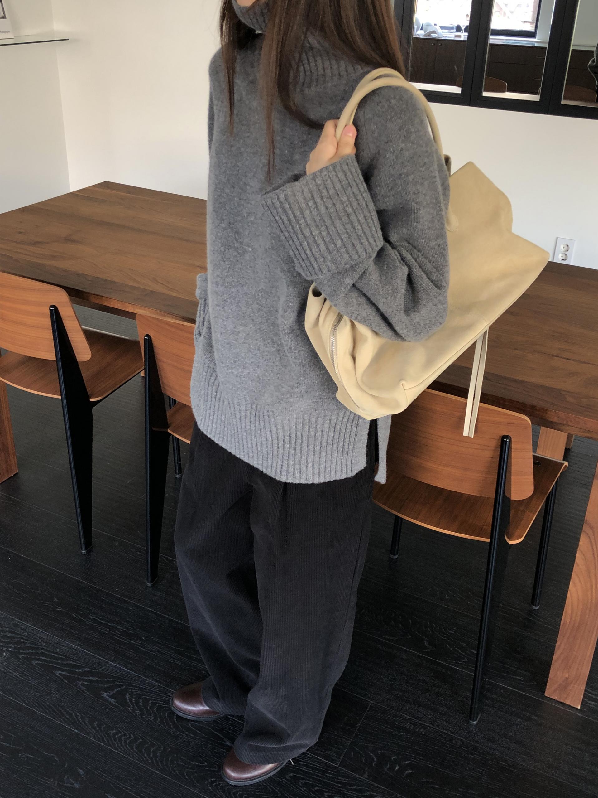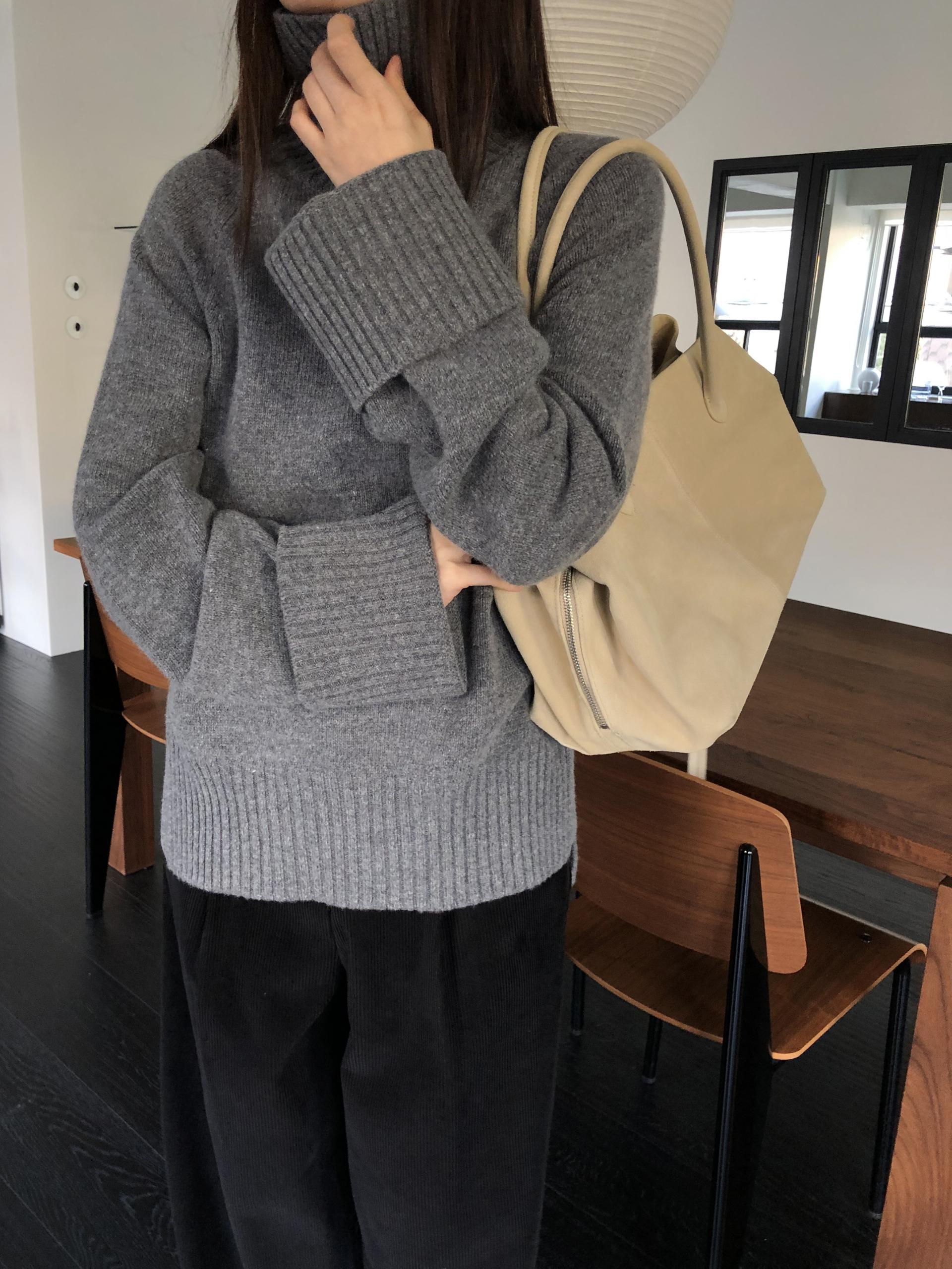 한눈에 봐도 존재감이 느껴지는, 목을 넉넉하게 감싸는 와이드한 터틀넥 라인이 겨울의 니트하면 떠오르는 장면을 그대로 담고 있어요 .소매와 밑단 역시 와이드하게 짜인 시보리가 확인됩니다. 전체적으로 포인트가 확실하면서도 담백하게 연출되어요.