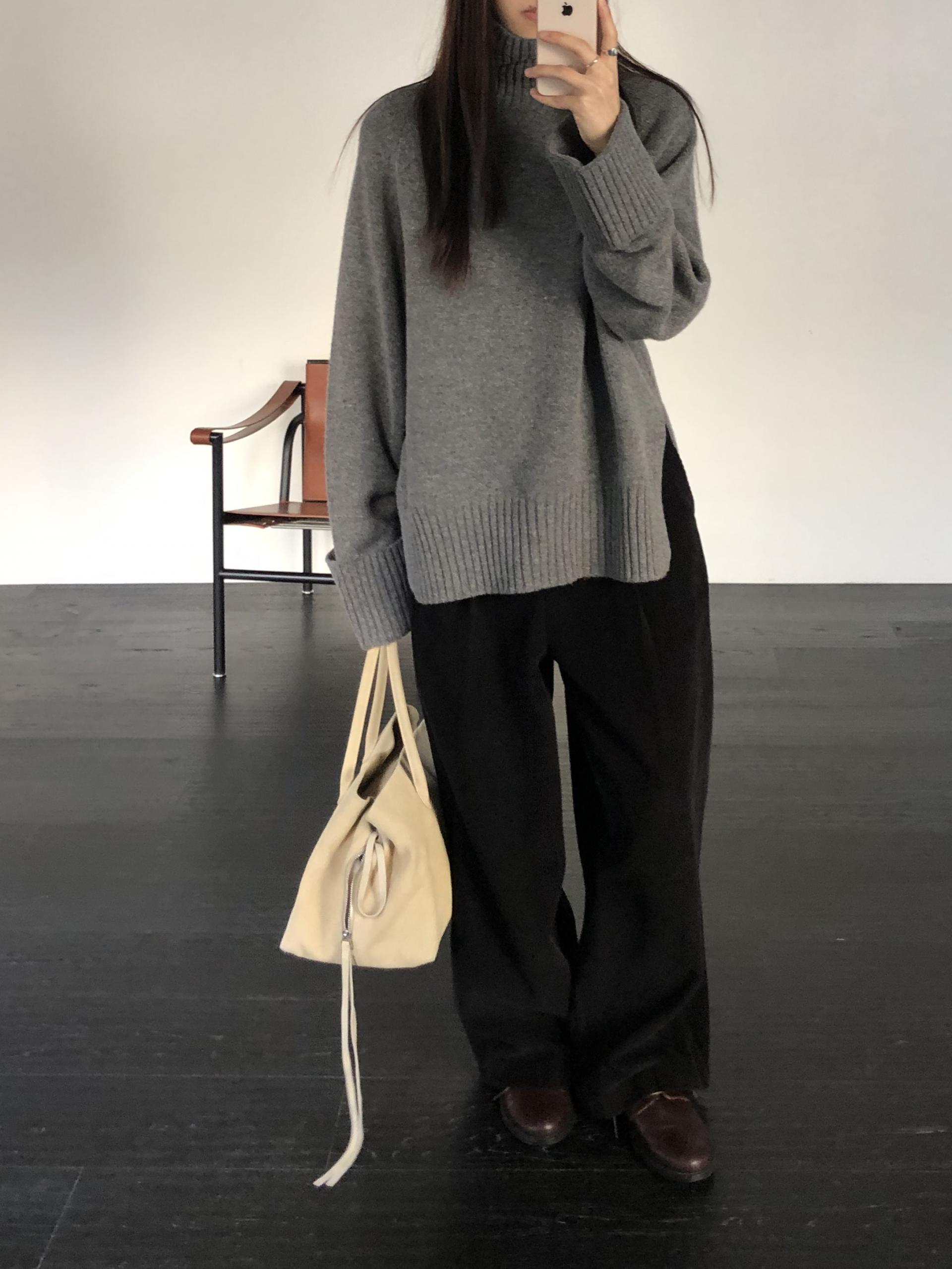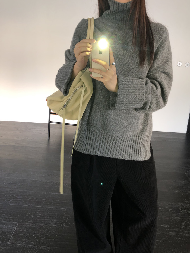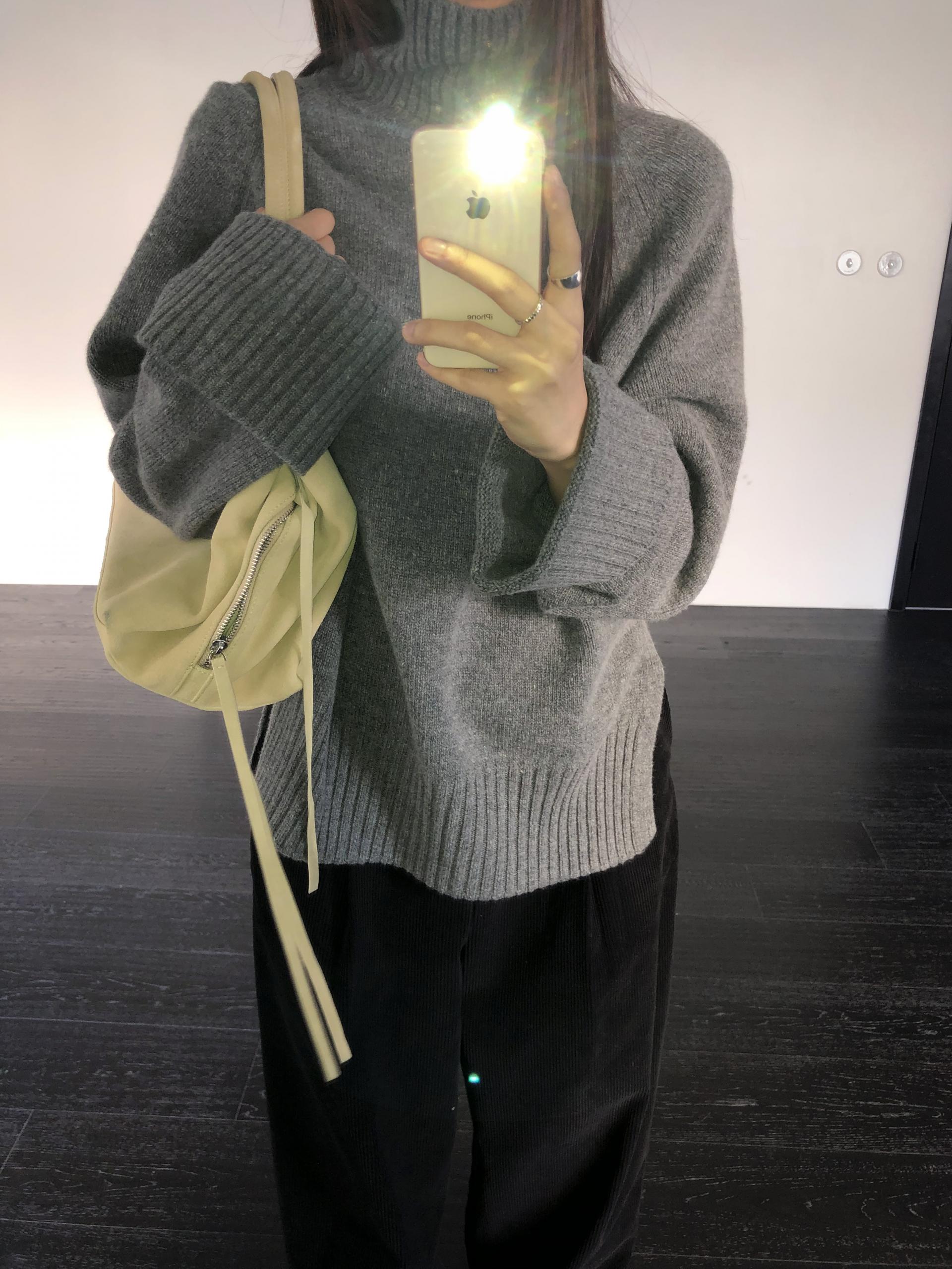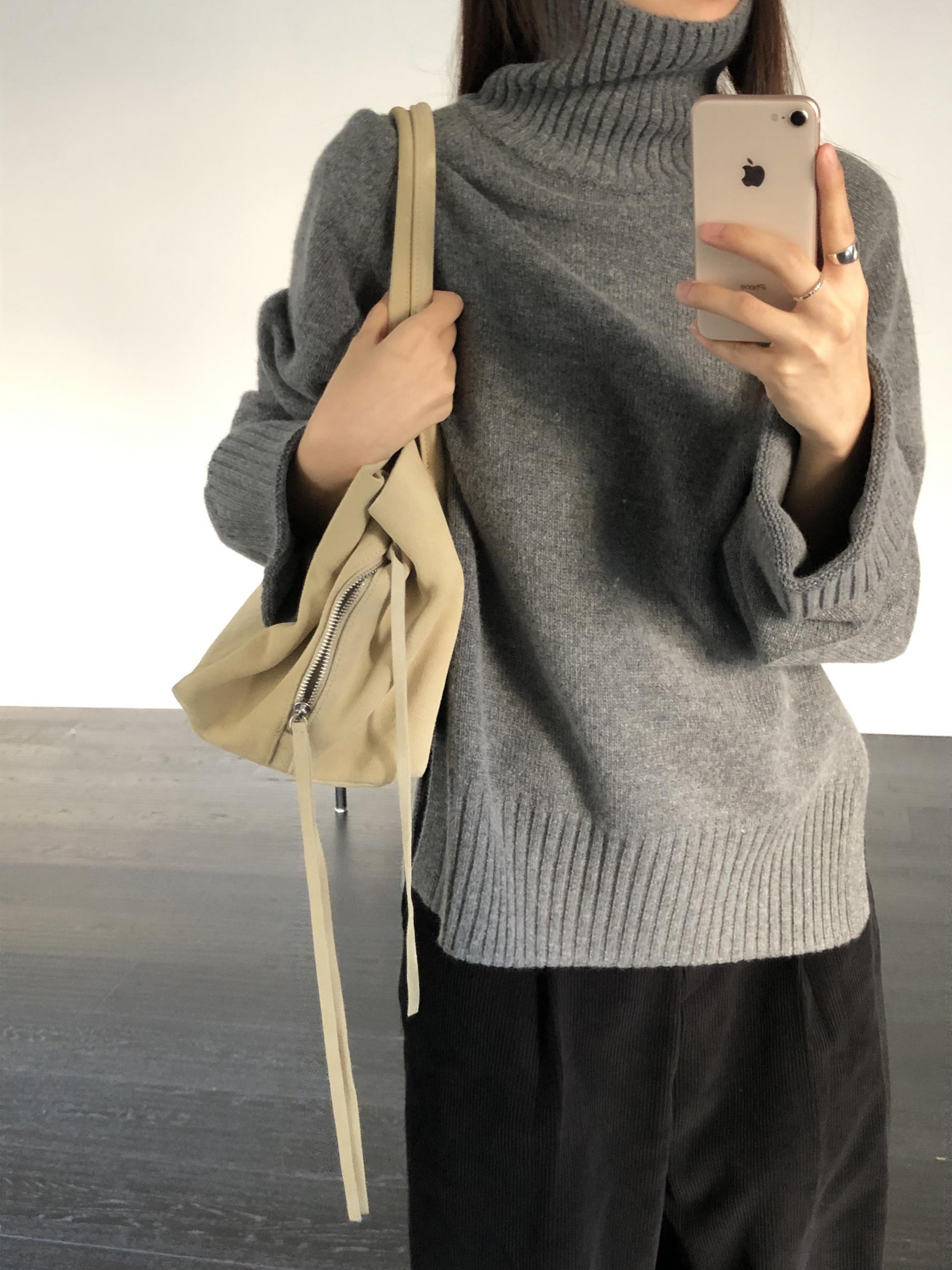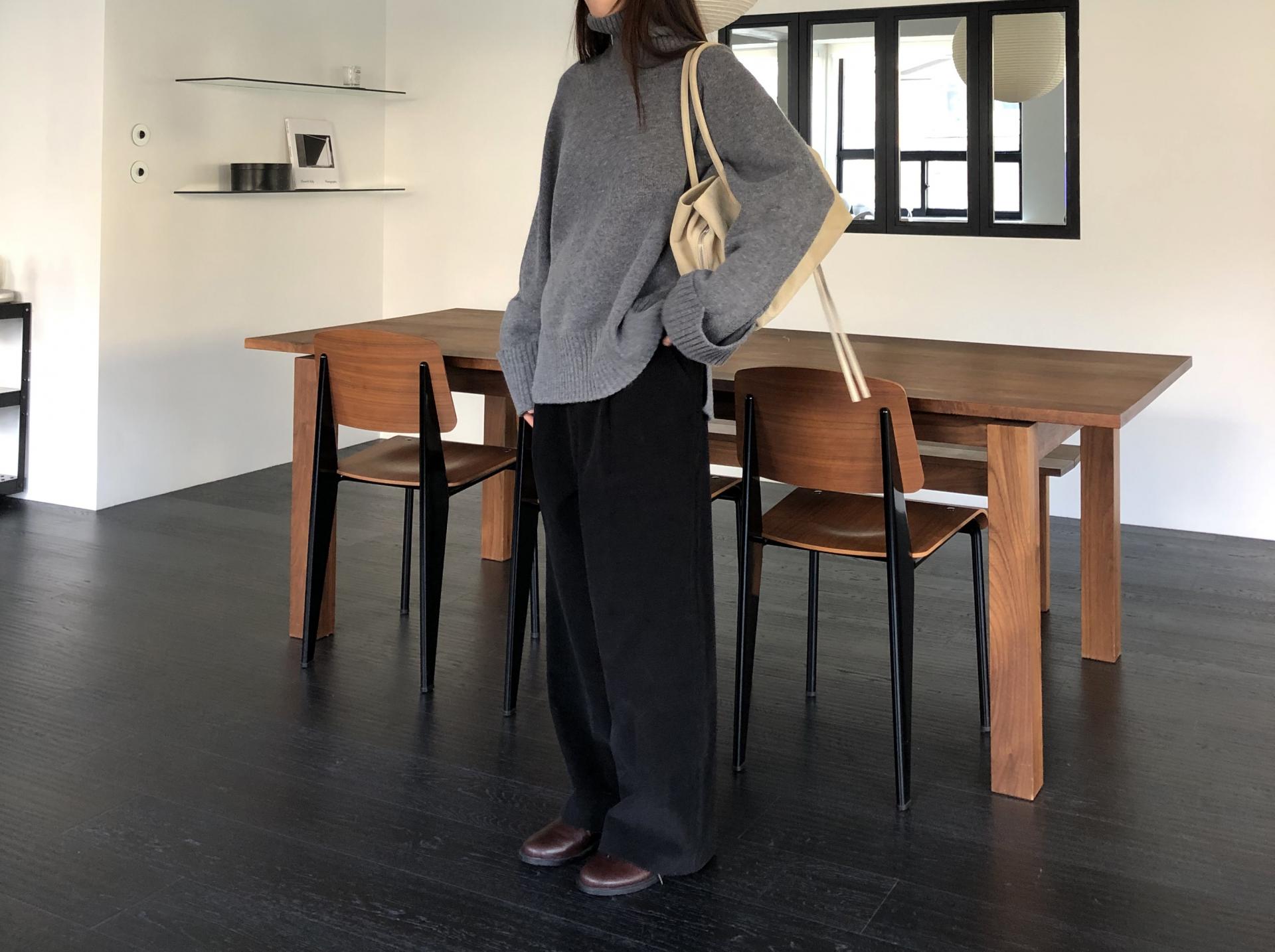 한눈에 봐도 존재감이 느껴지는, 목을 넉넉하게 감싸는 와이드한 터틀넥 라인이 겨울의 니트하면 떠오르는 장면을 그대로 담고 있어요 .소매와 밑단 역시 와이드하게 짜인 시보리가 확인됩니다. 전체적으로 포인트가 확실하면서도 담백하게 연출되어요.