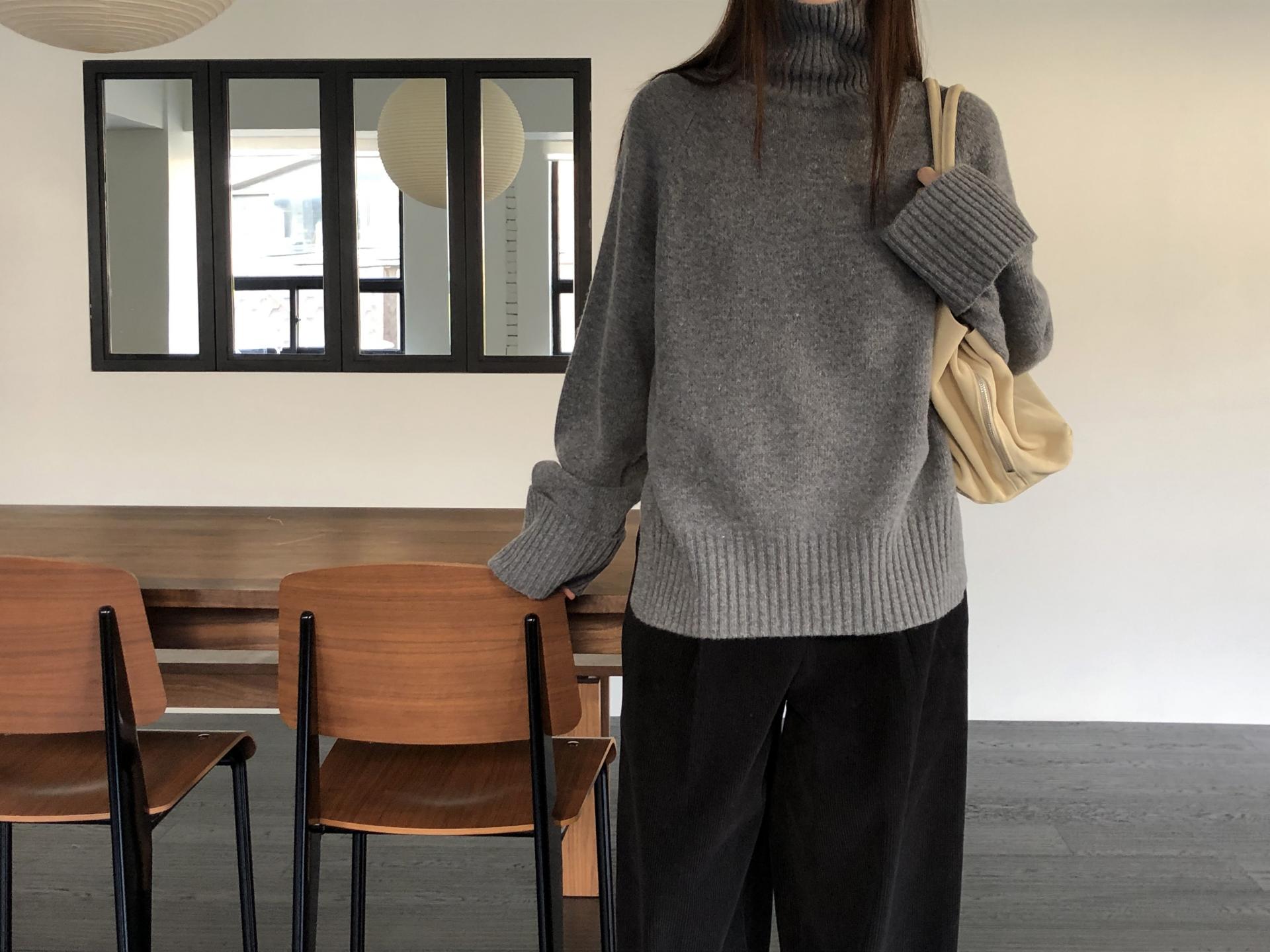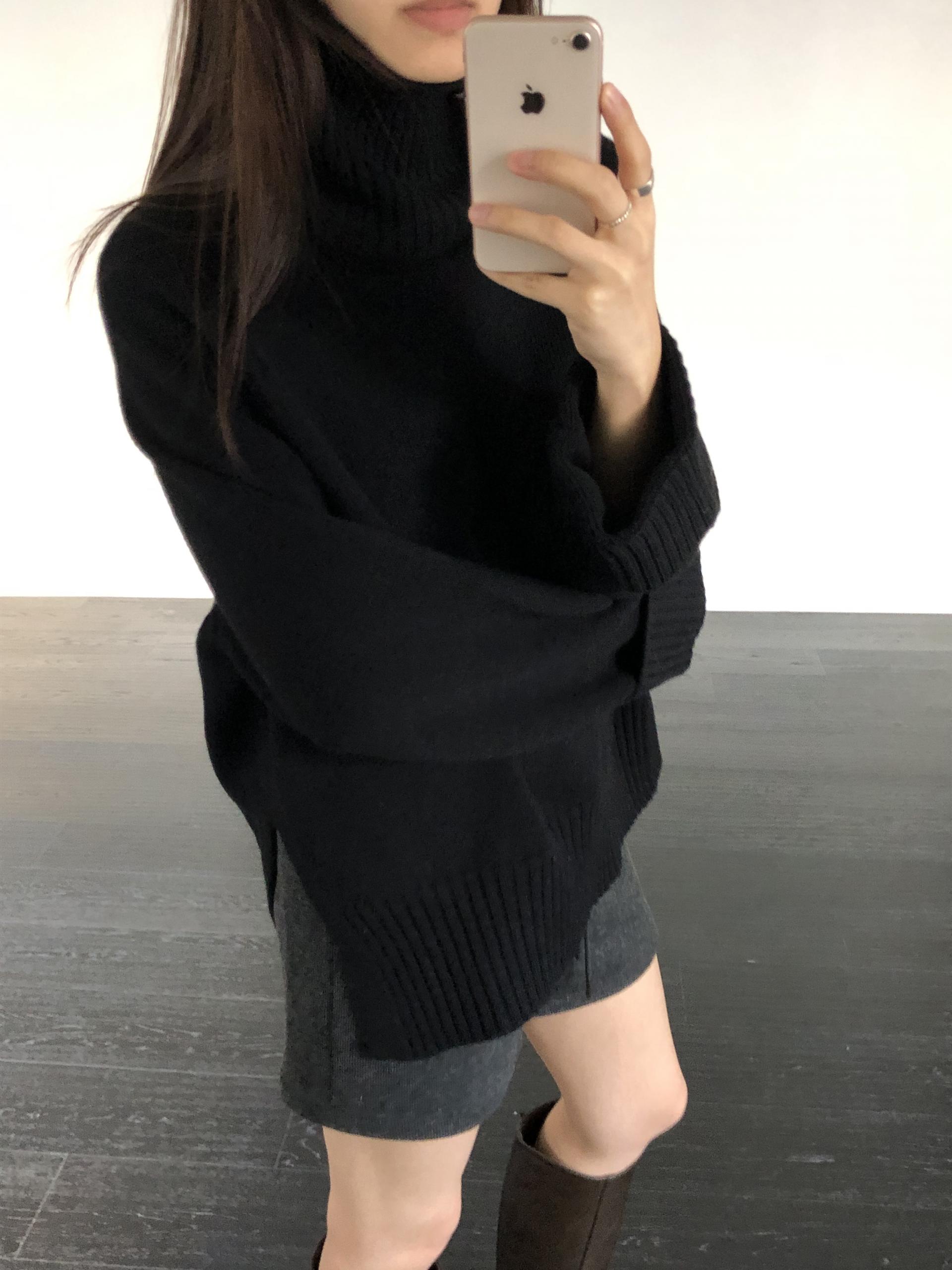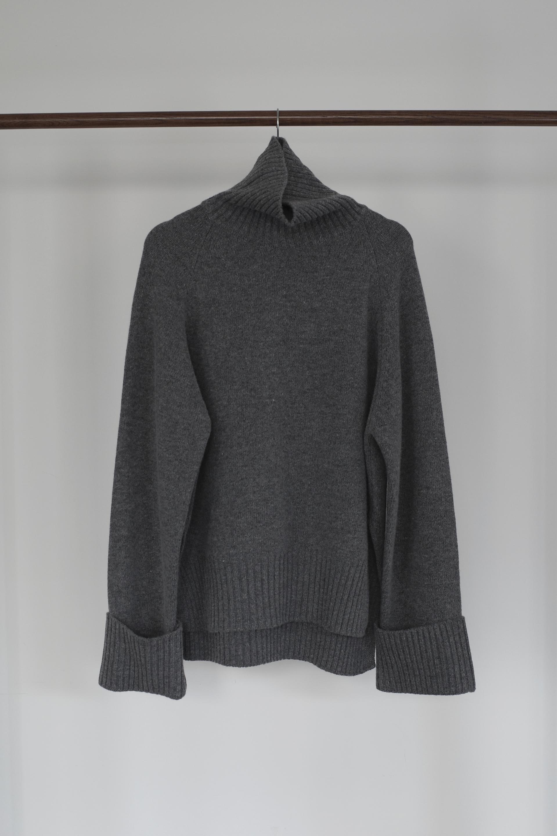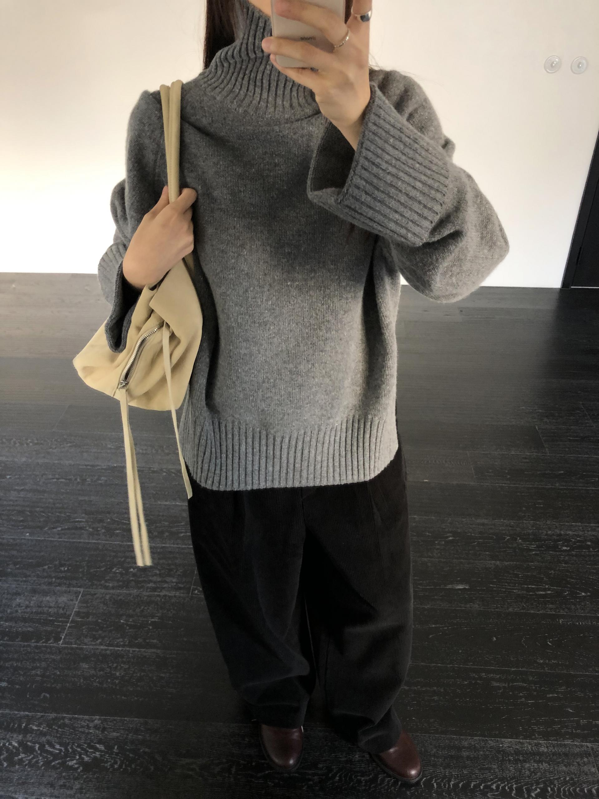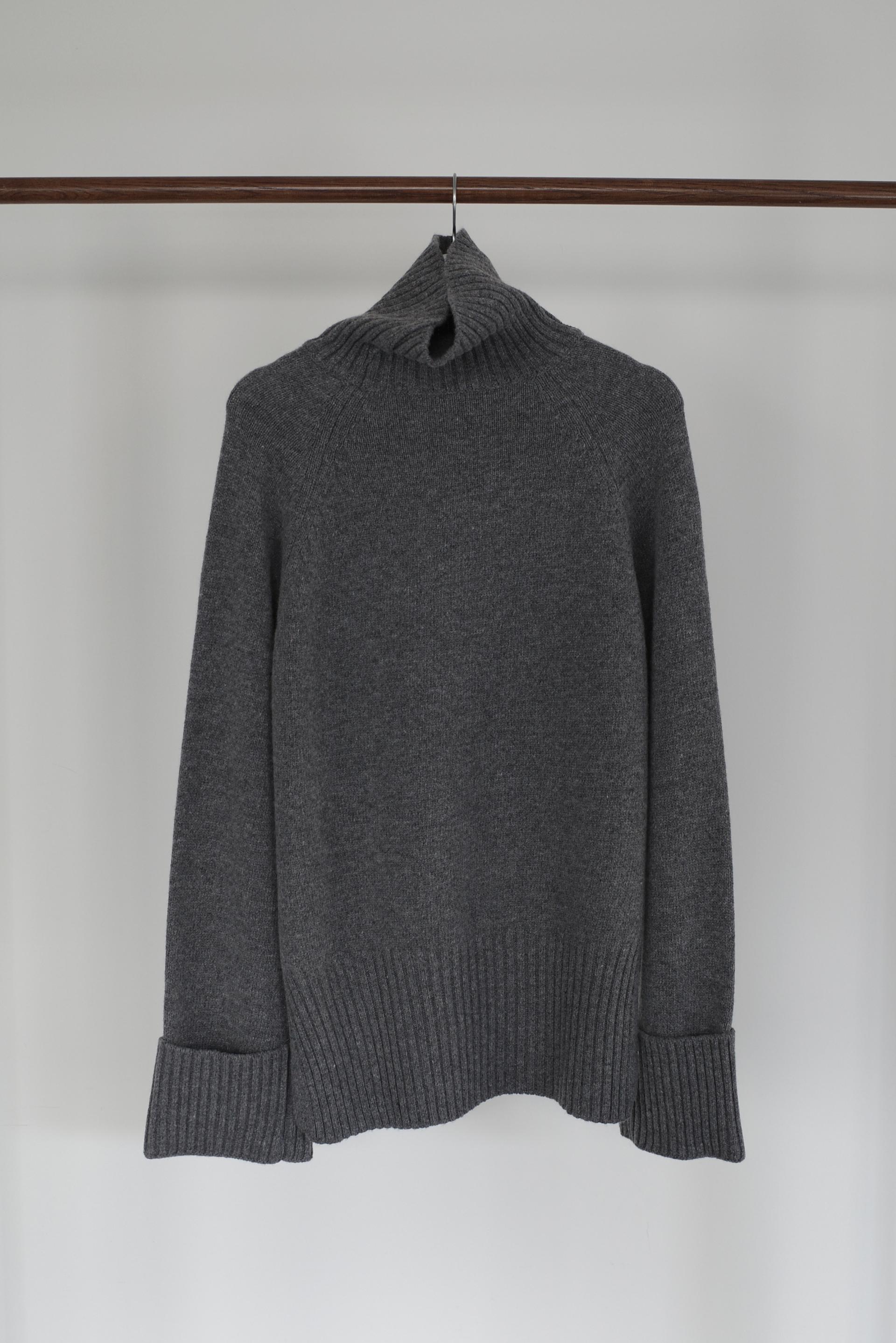 한눈에 봐도 존재감이 느껴지는, 목을 넉넉하게 감싸는 와이드한 터틀넥 라인이 겨울의 니트하면 떠오르는 장면을 그대로 담고 있어요 .소매와 밑단 역시 와이드하게 짜인 시보리가 확인됩니다. 전체적으로 포인트가 확실하면서도 담백하게 연출되어요.