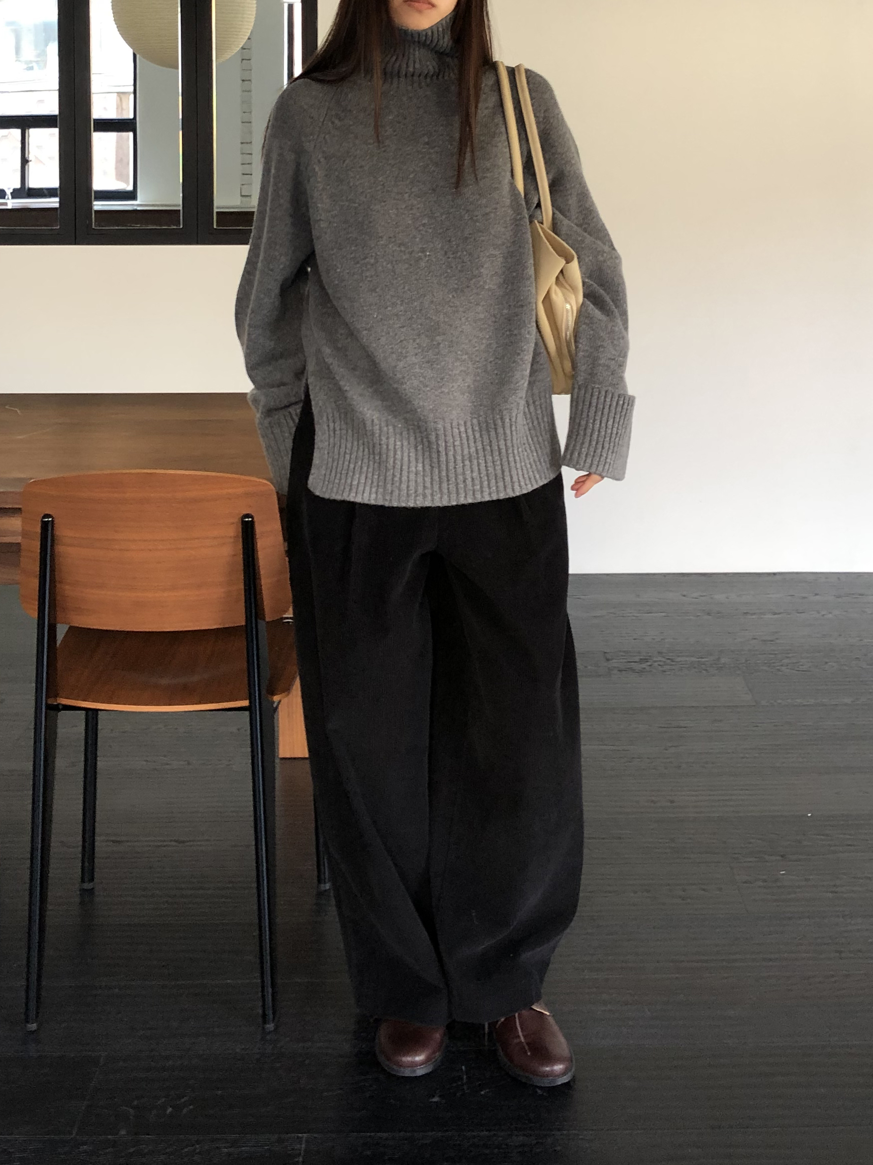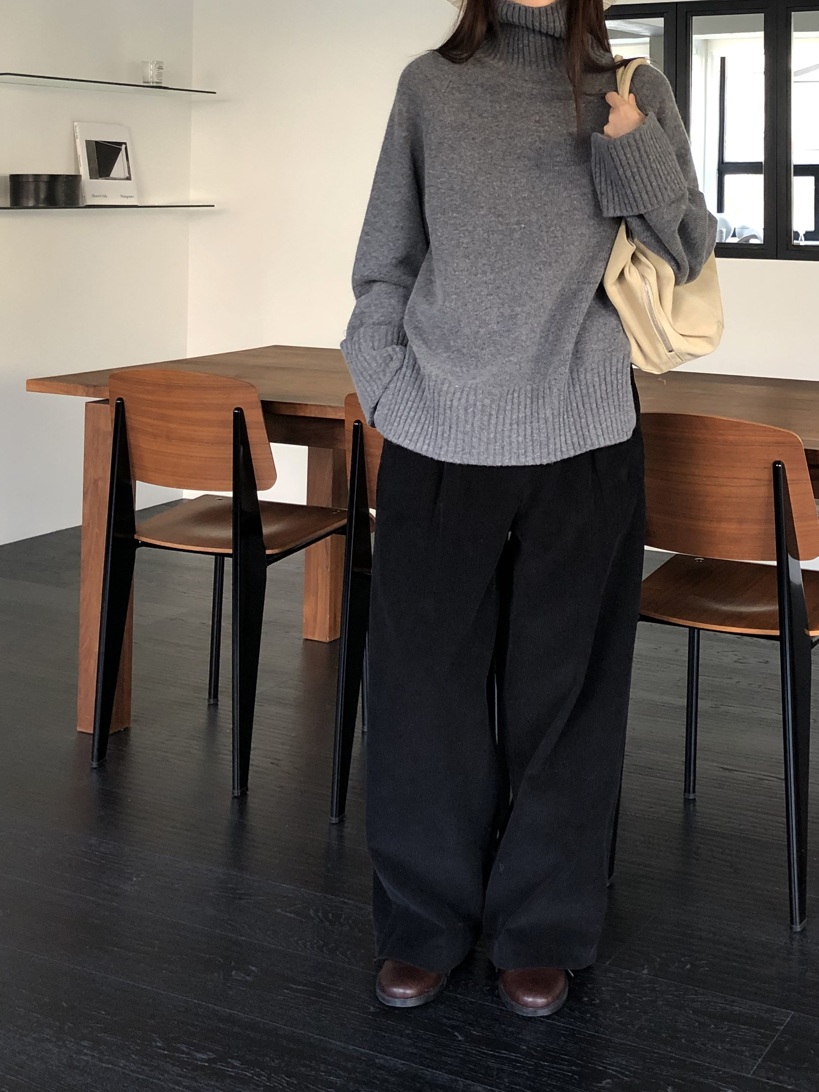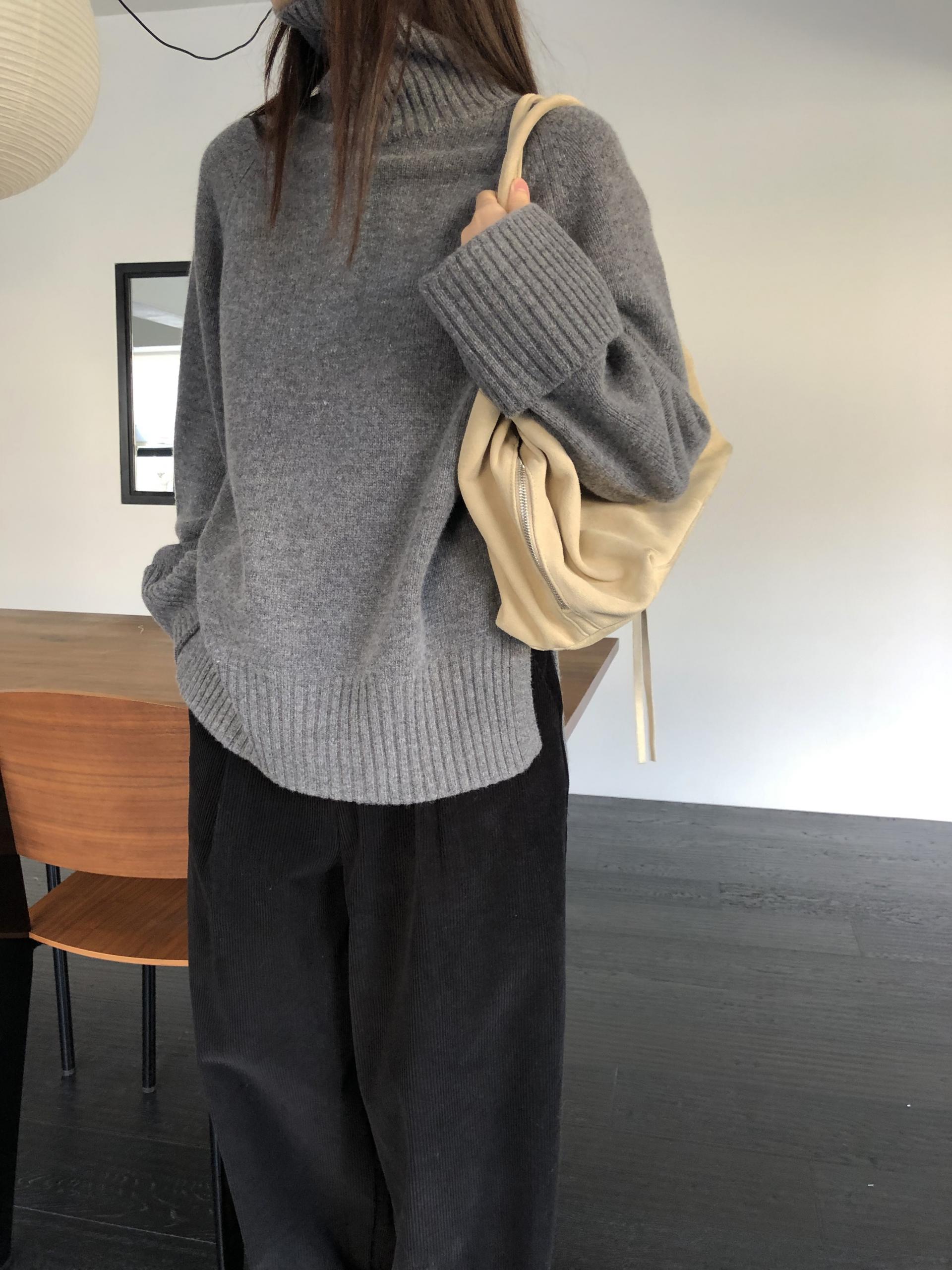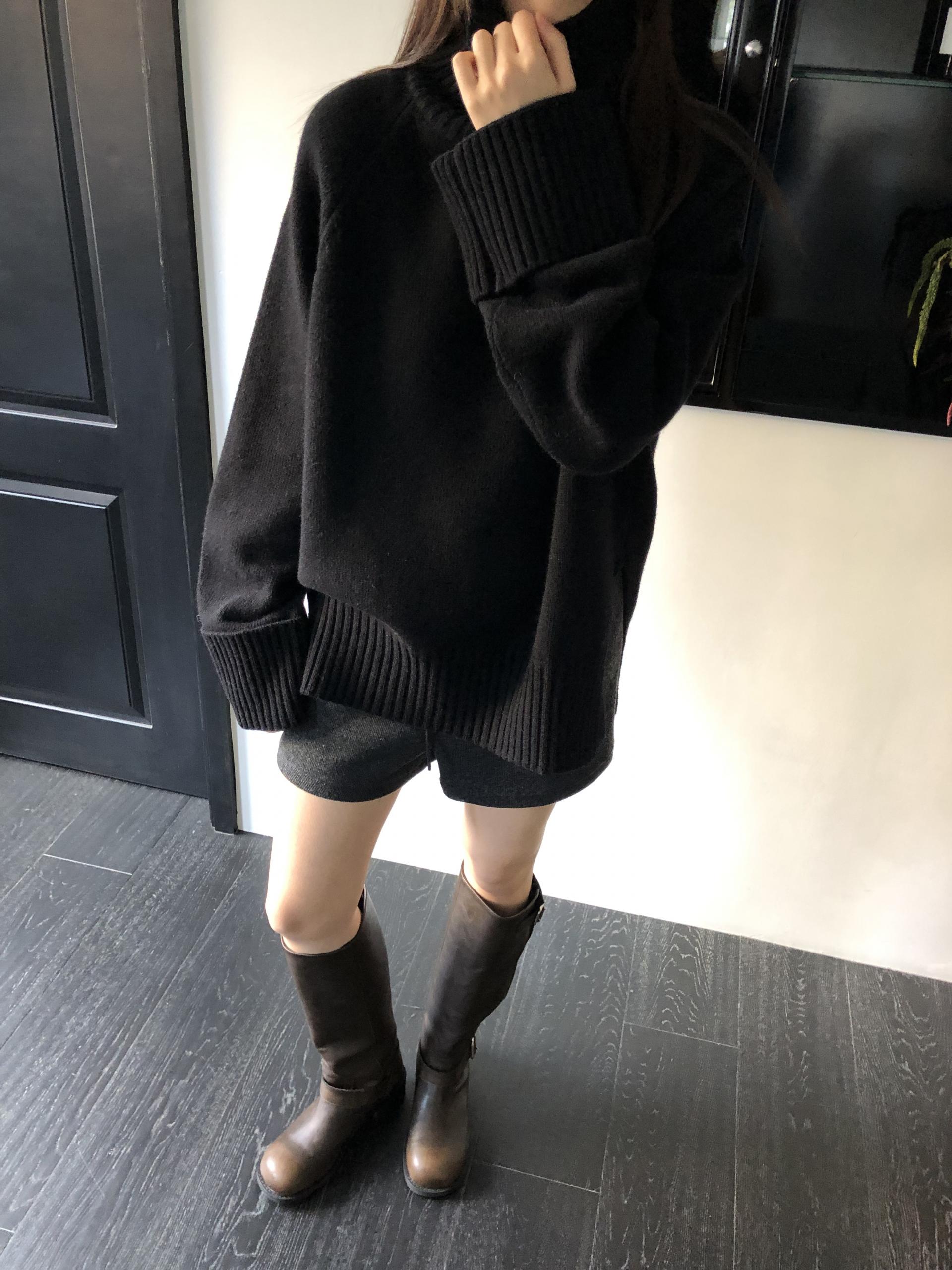 한눈에 봐도 존재감이 느껴지는, 목을 넉넉하게 감싸는 와이드한 터틀넥 라인이 겨울의 니트하면 떠오르는 장면을 그대로 담고 있어요 .소매와 밑단 역시 와이드하게 짜인 시보리가 확인됩니다. 전체적으로 포인트가 확실하면서도 담백하게 연출되어요.