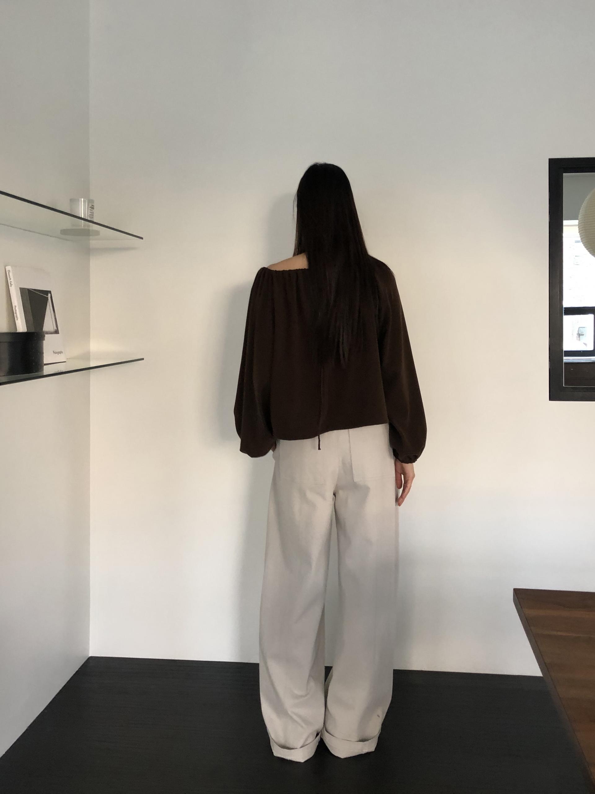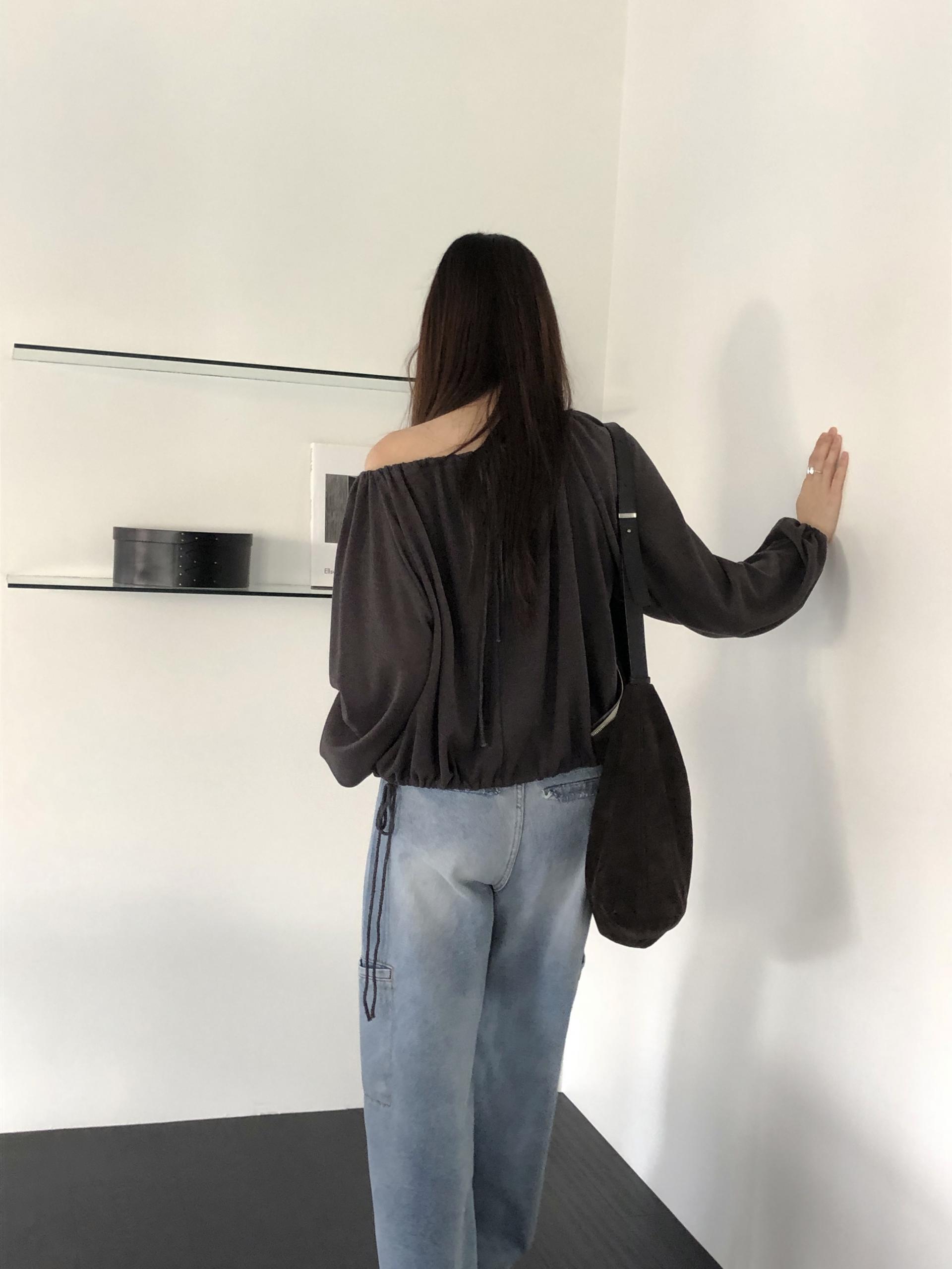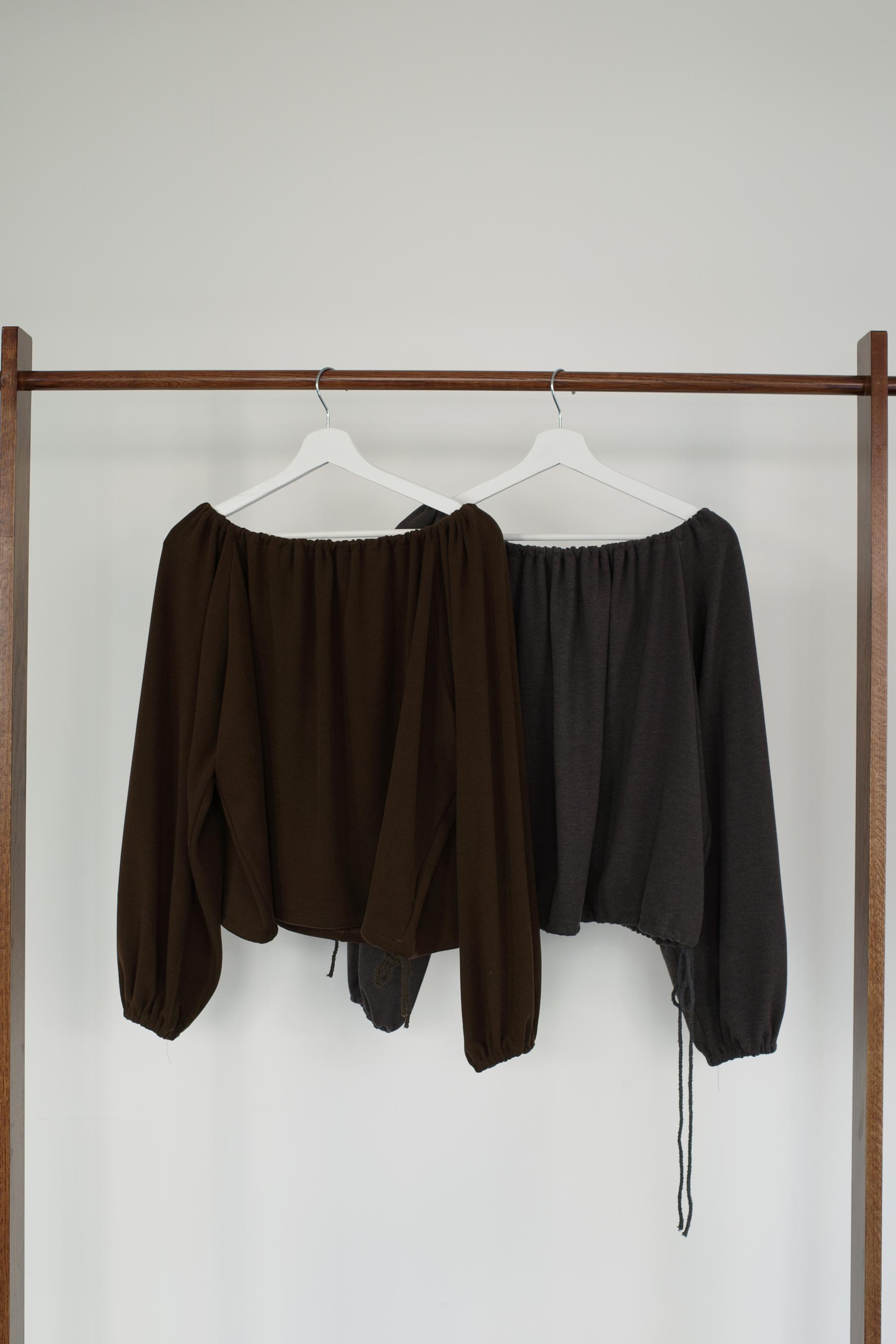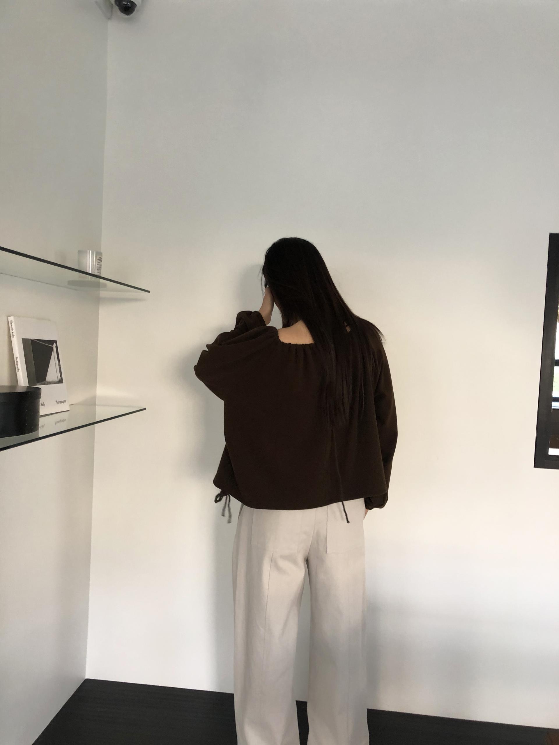 밑단 역시 스트링으로 조절이 가능해 자연스럽게 볼륨있는 핏을 만들거나 혹은 셔링이 잡힌 네크라인과 대비되도록 느슨하게 연출해도 좋았어요. 카키와 카멜빛이 잘 섞인 브라운과 차콜 두가지 컬러입니다. 과하지 않게, 적당히 신경쓴 듯한 분위기를 낼 수 있는 아이템입니다.