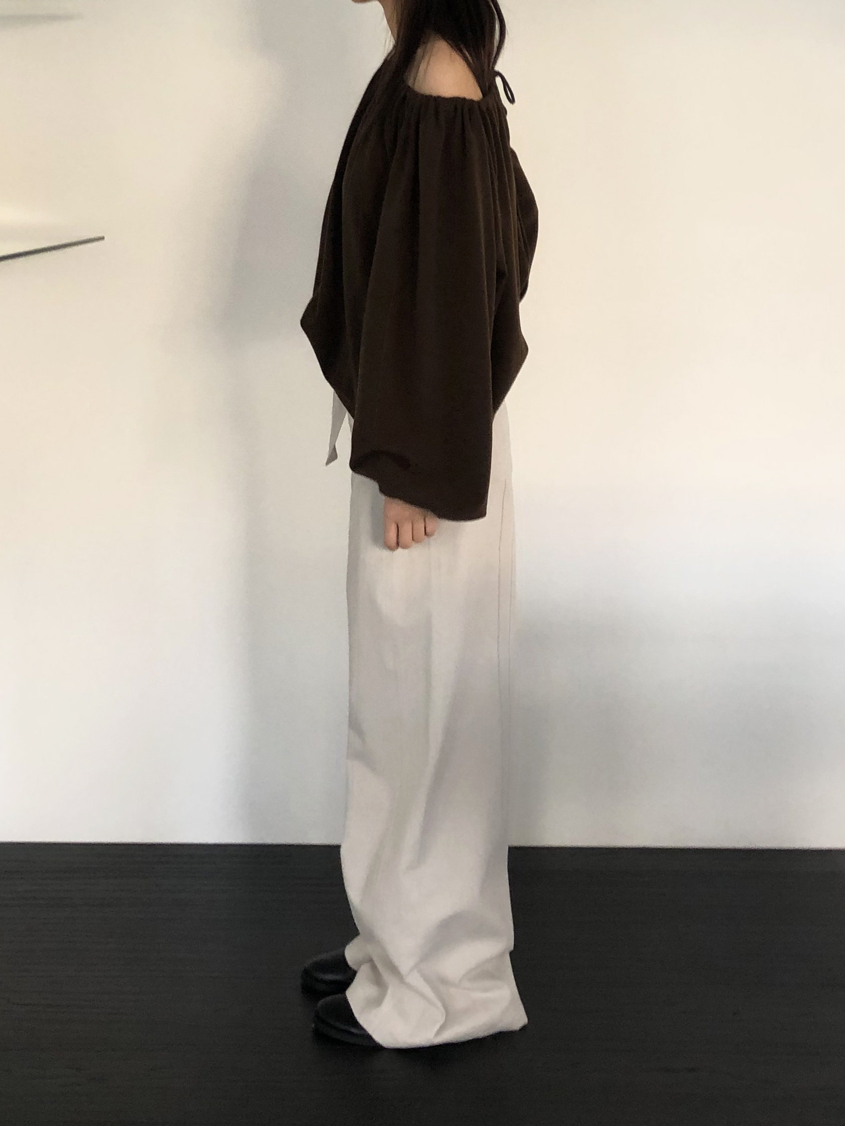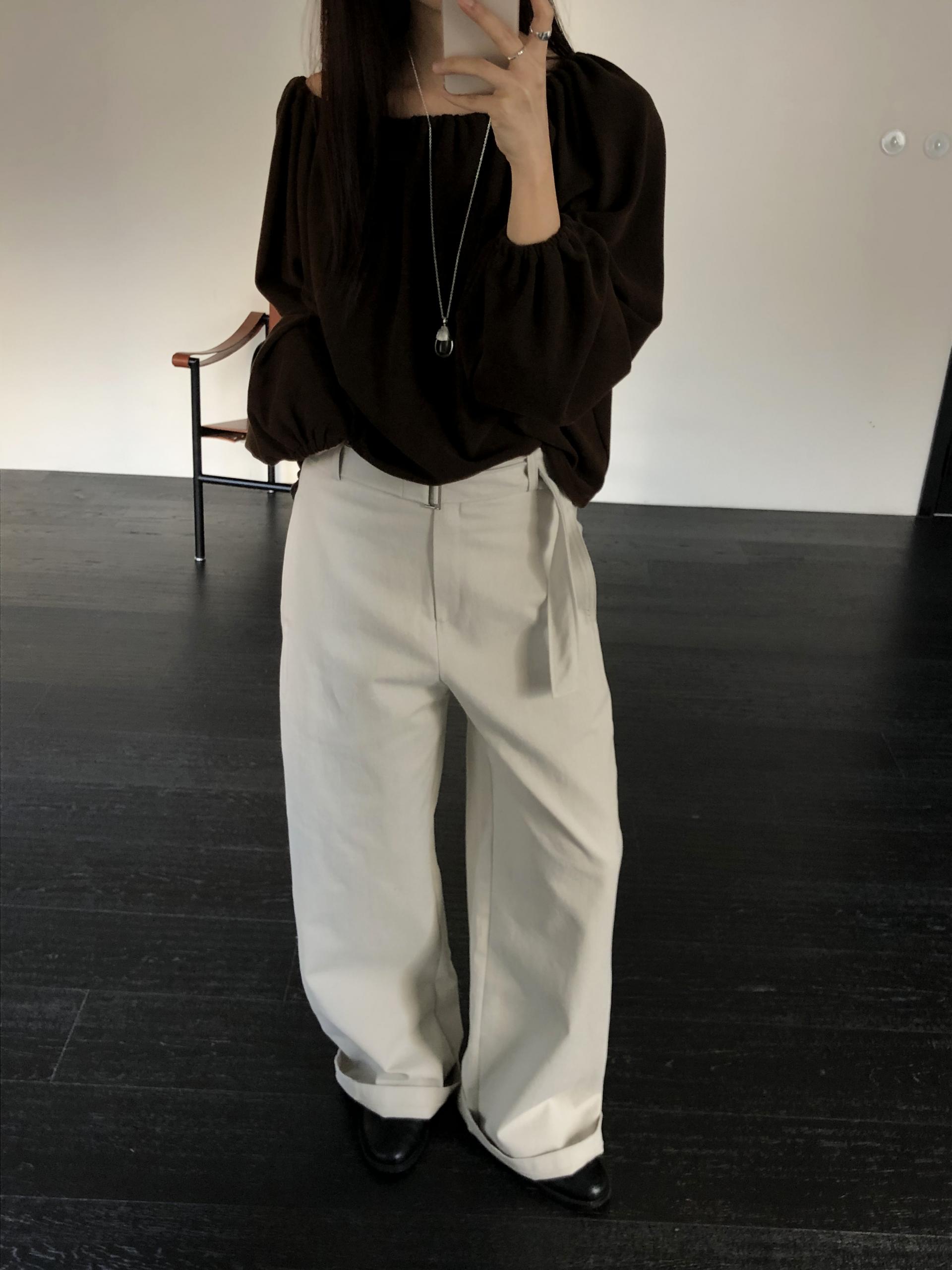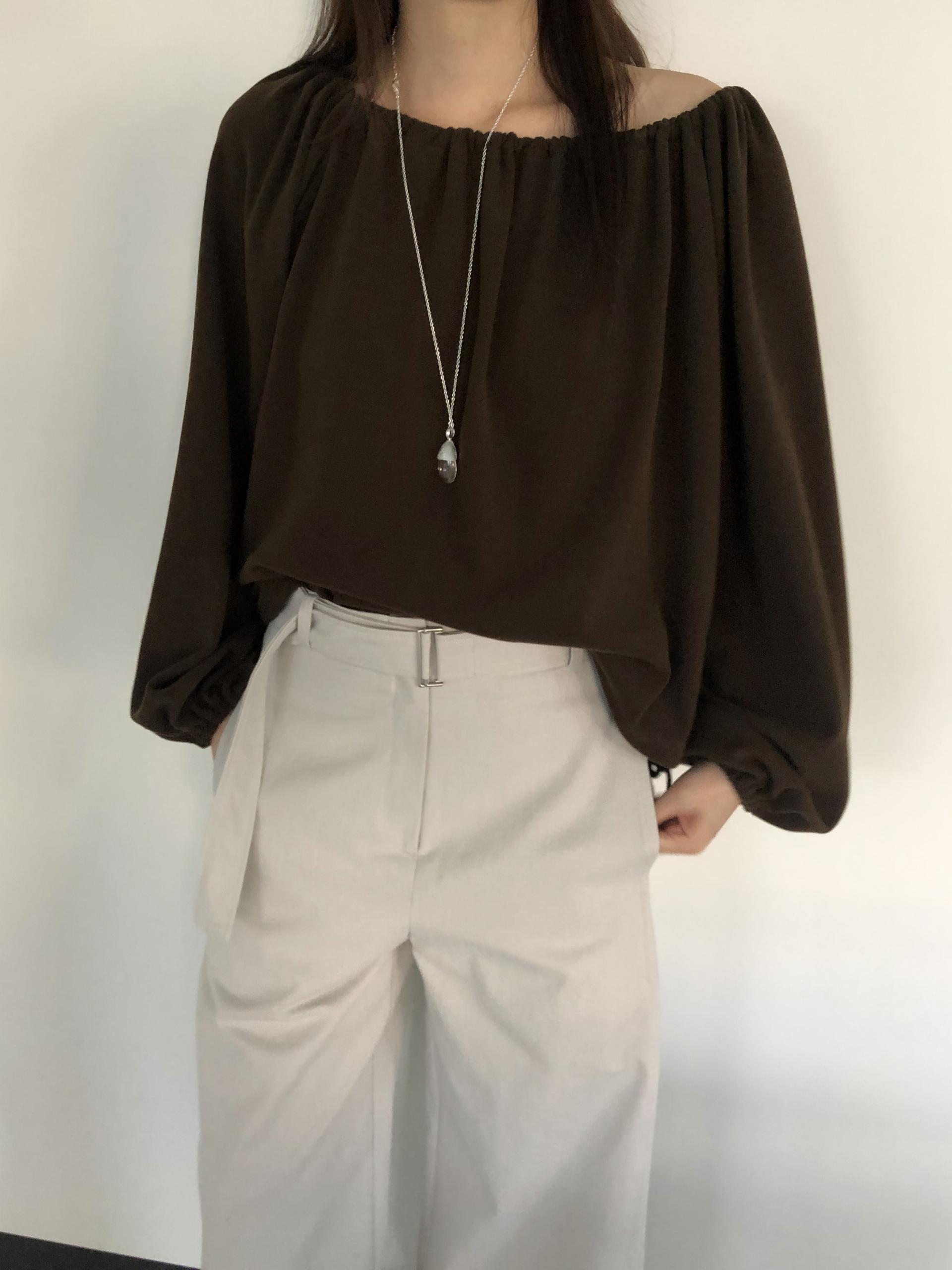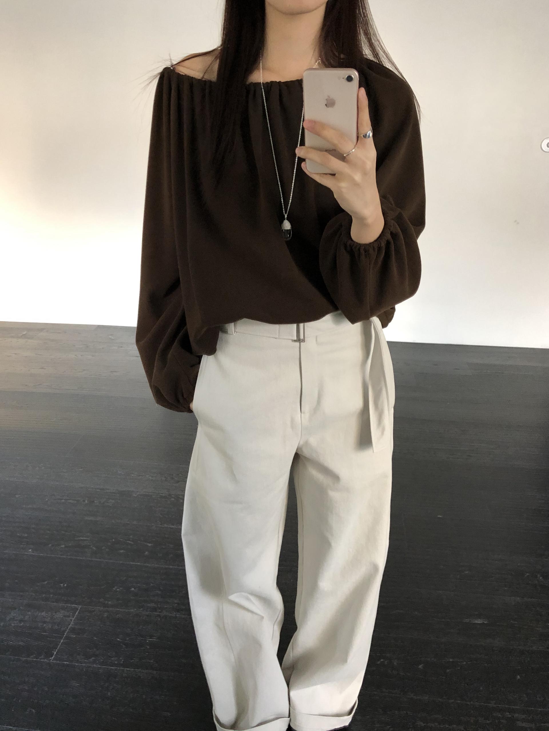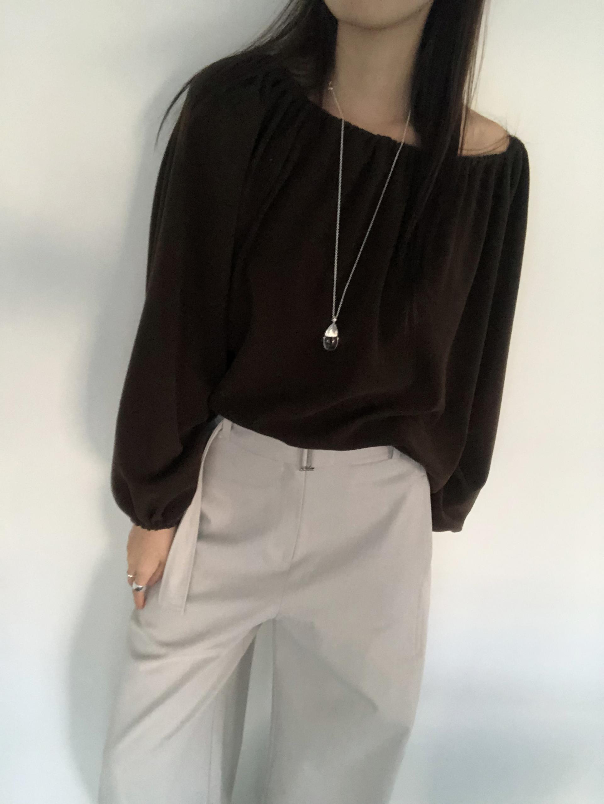 밑단 역시 스트링으로 조절이 가능해 자연스럽게 볼륨있는 핏을 만들거나 혹은 셔링이 잡힌 네크라인과 대비되도록 느슨하게 연출해도 좋았어요. 카키와 카멜빛이 잘 섞인 브라운과 차콜 두가지 컬러입니다. 과하지 않게, 적당히 신경쓴 듯한 분위기를 낼 수 있는 아이템입니다.