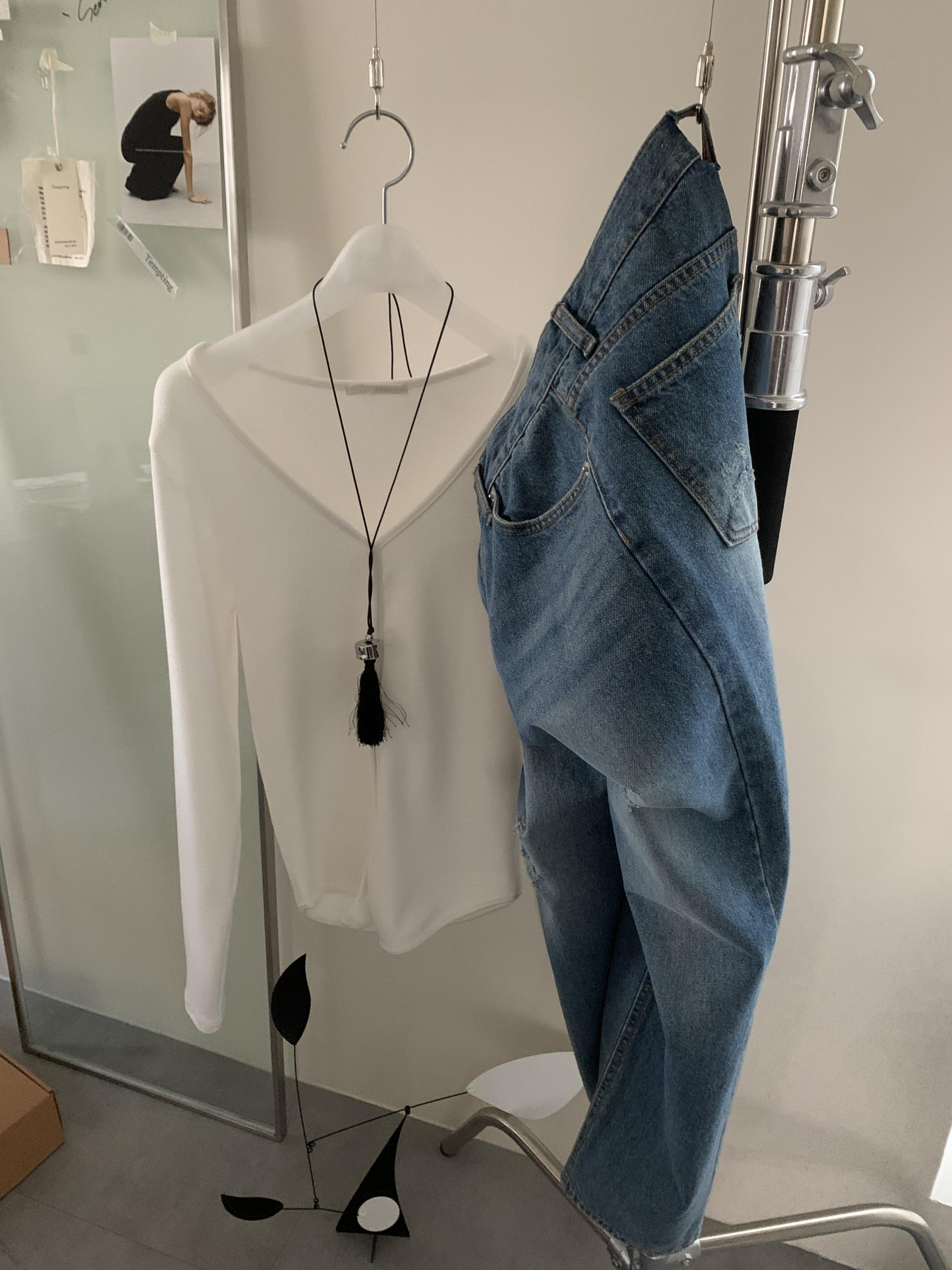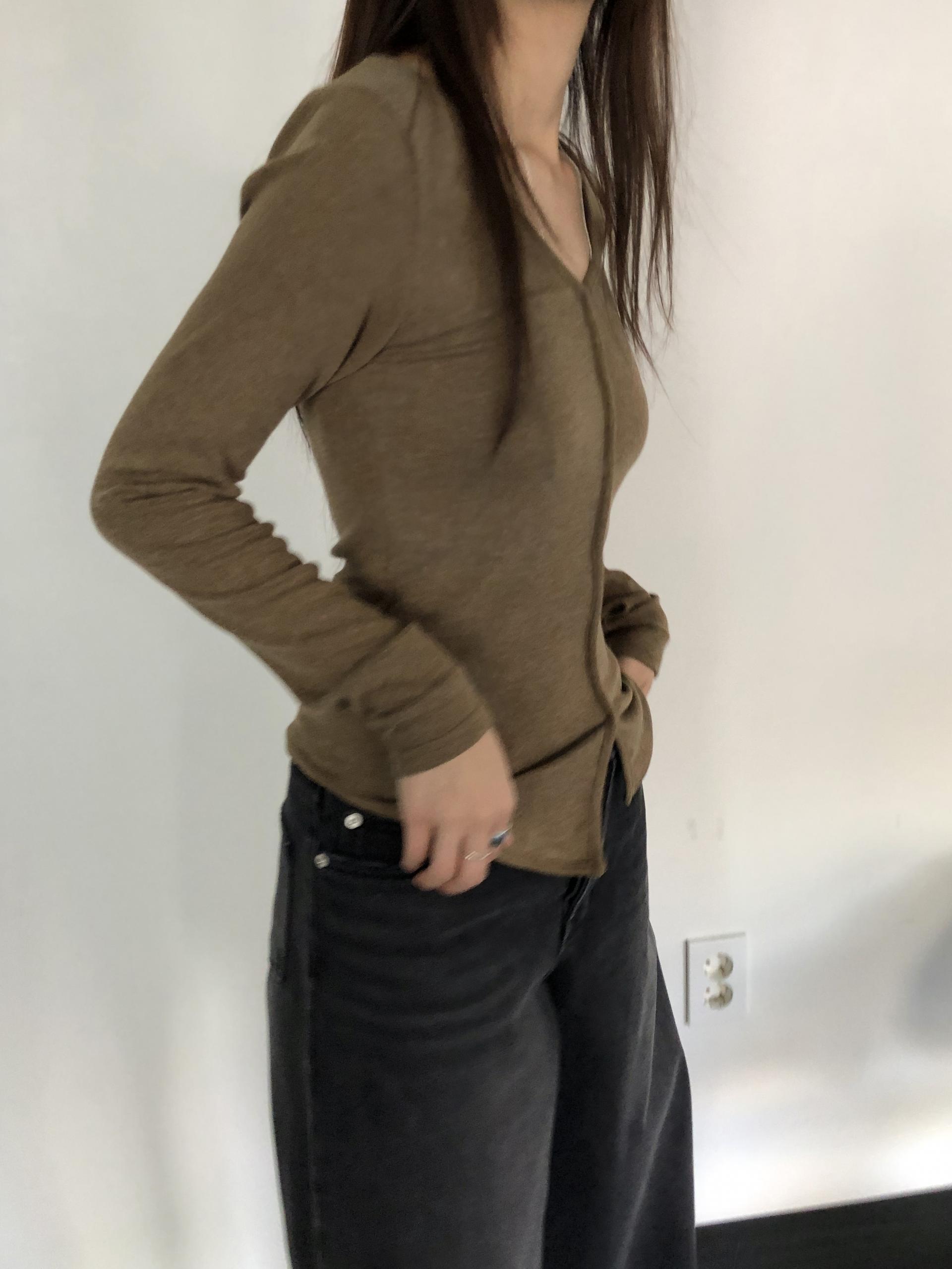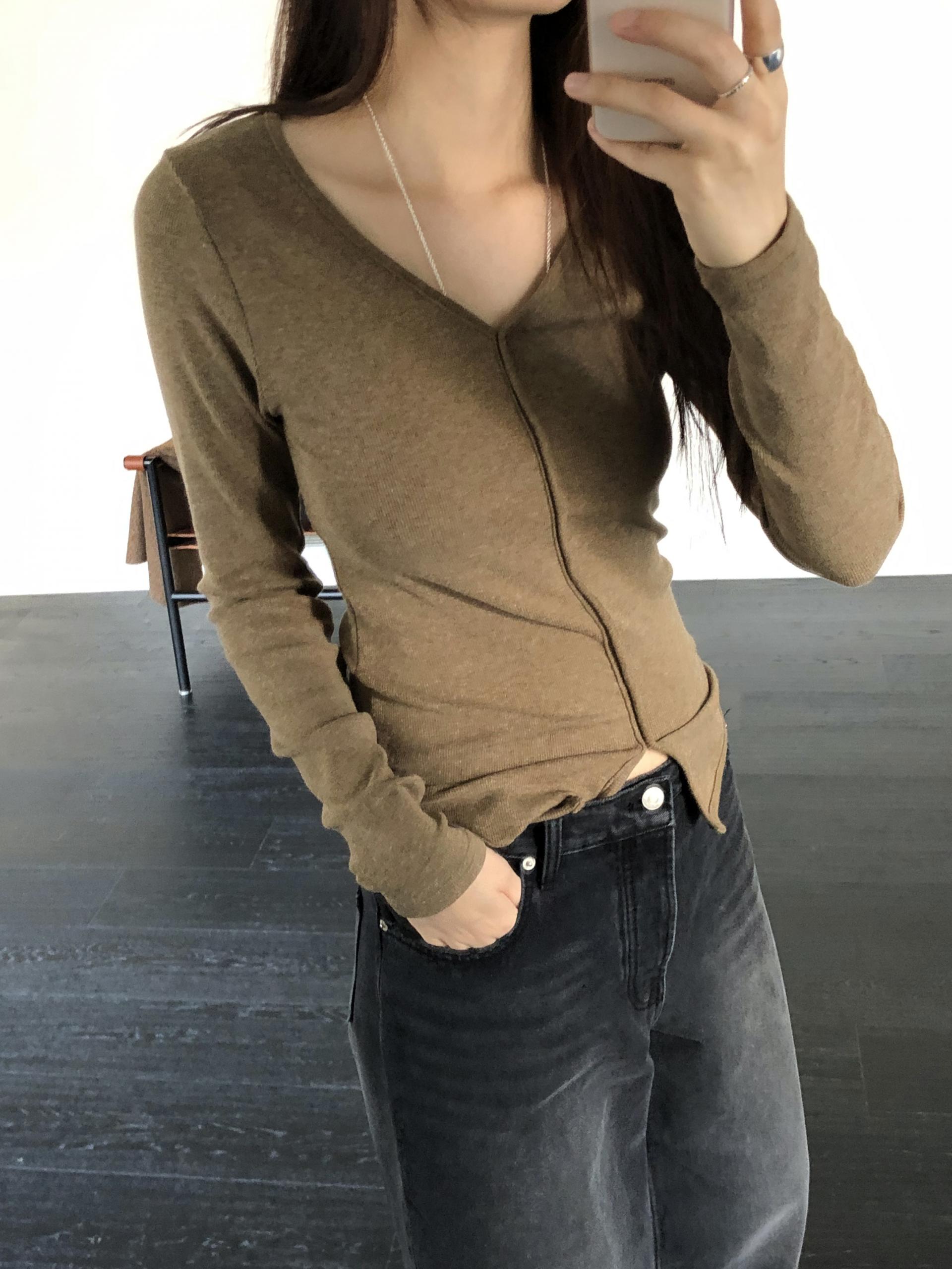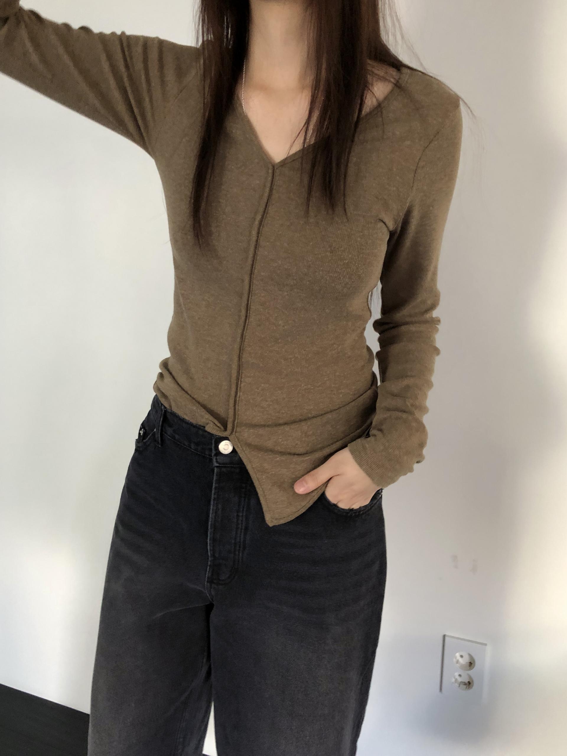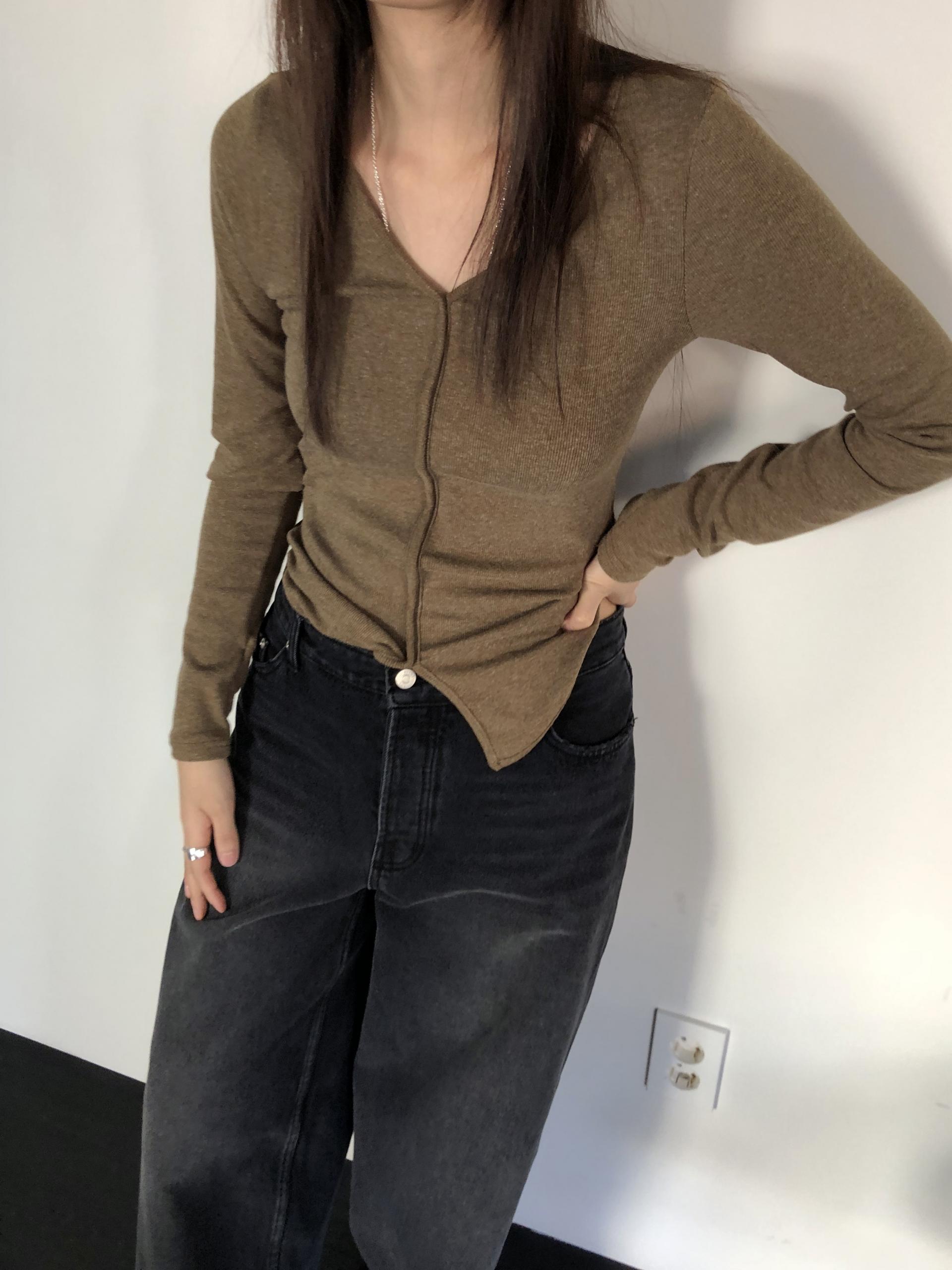 과하지 않은 브이 네크라인으로 헤비한 아우터를 걸쳐도 답답해 보이지 않게 균형을 잡아주고, 목선과 쇄골 라인을 자연스럽게 드러냅니다.