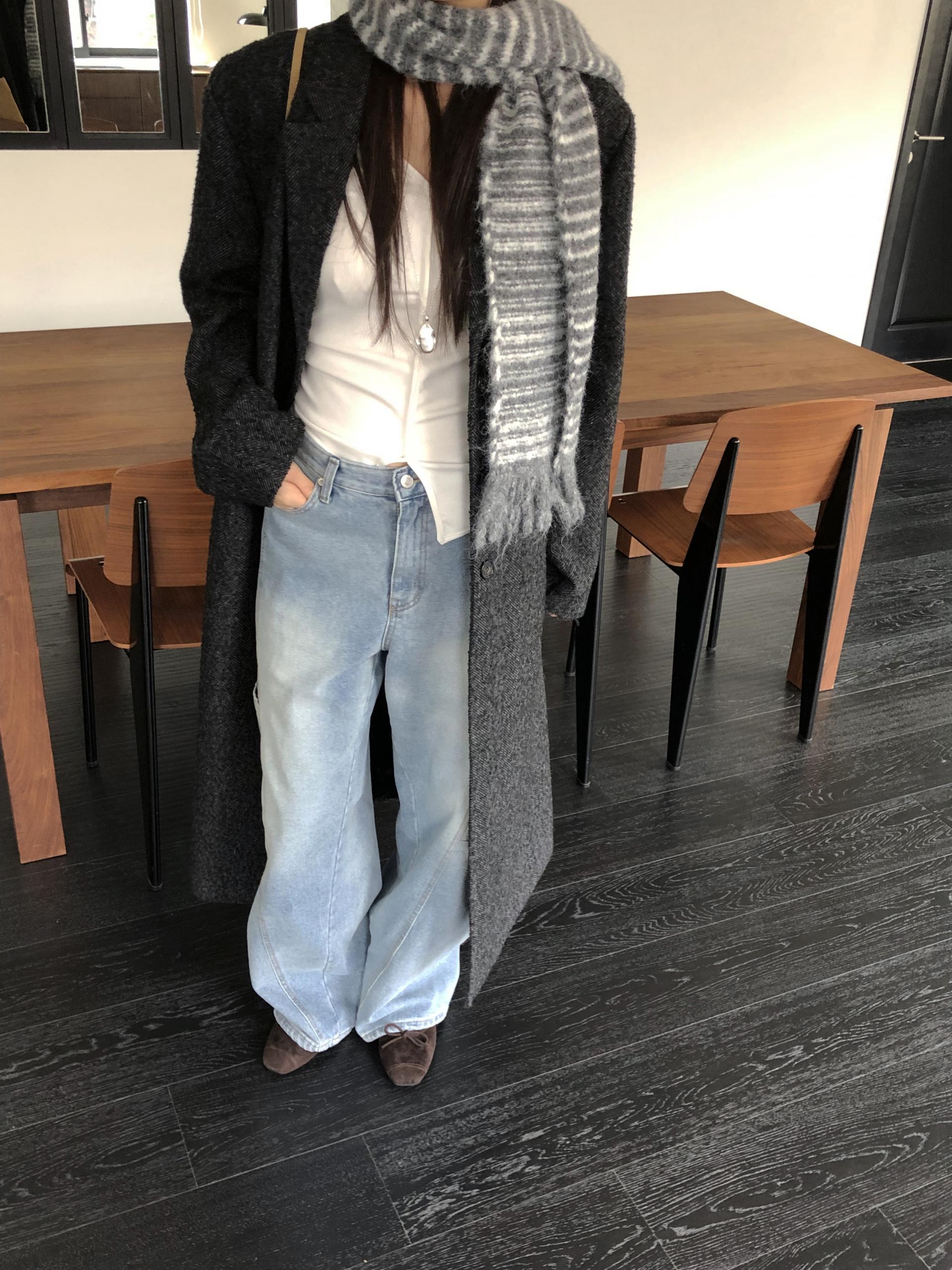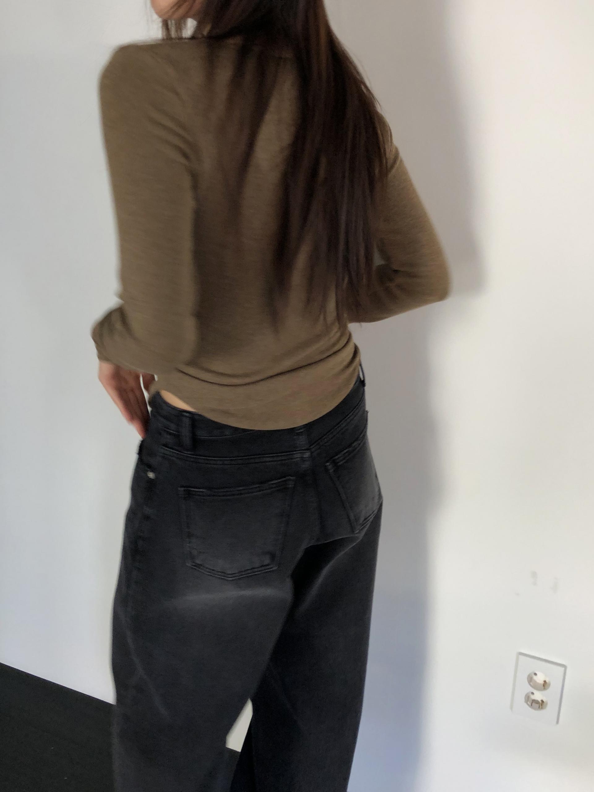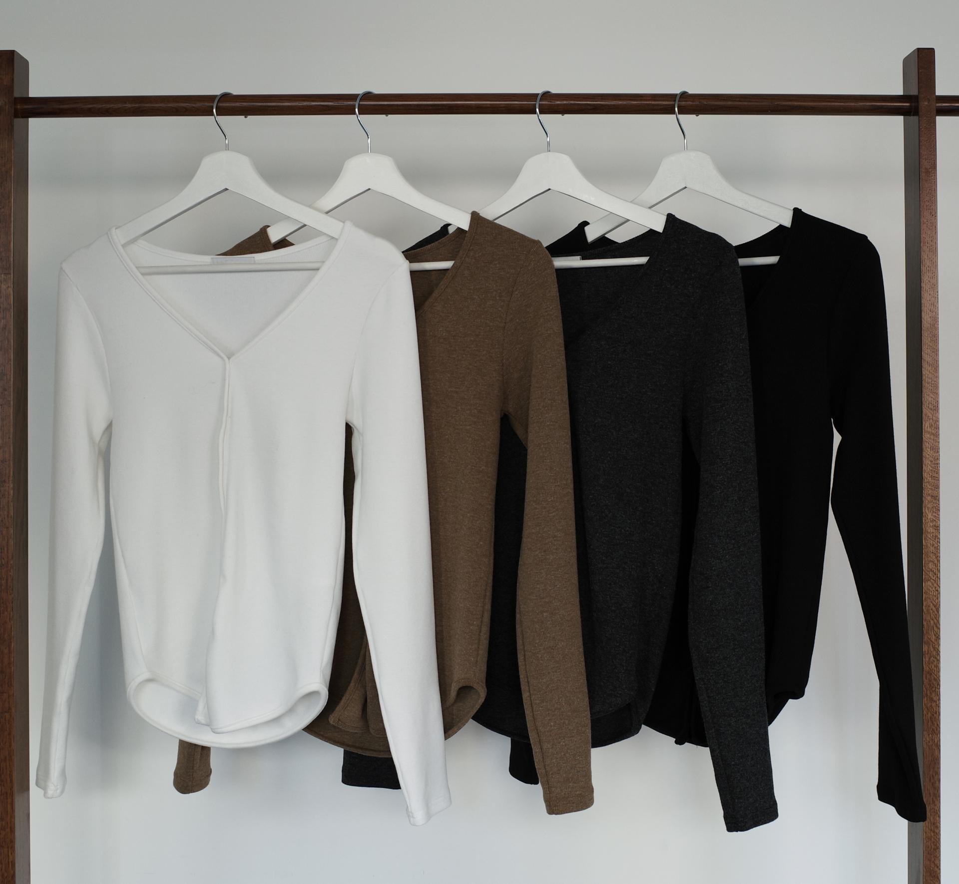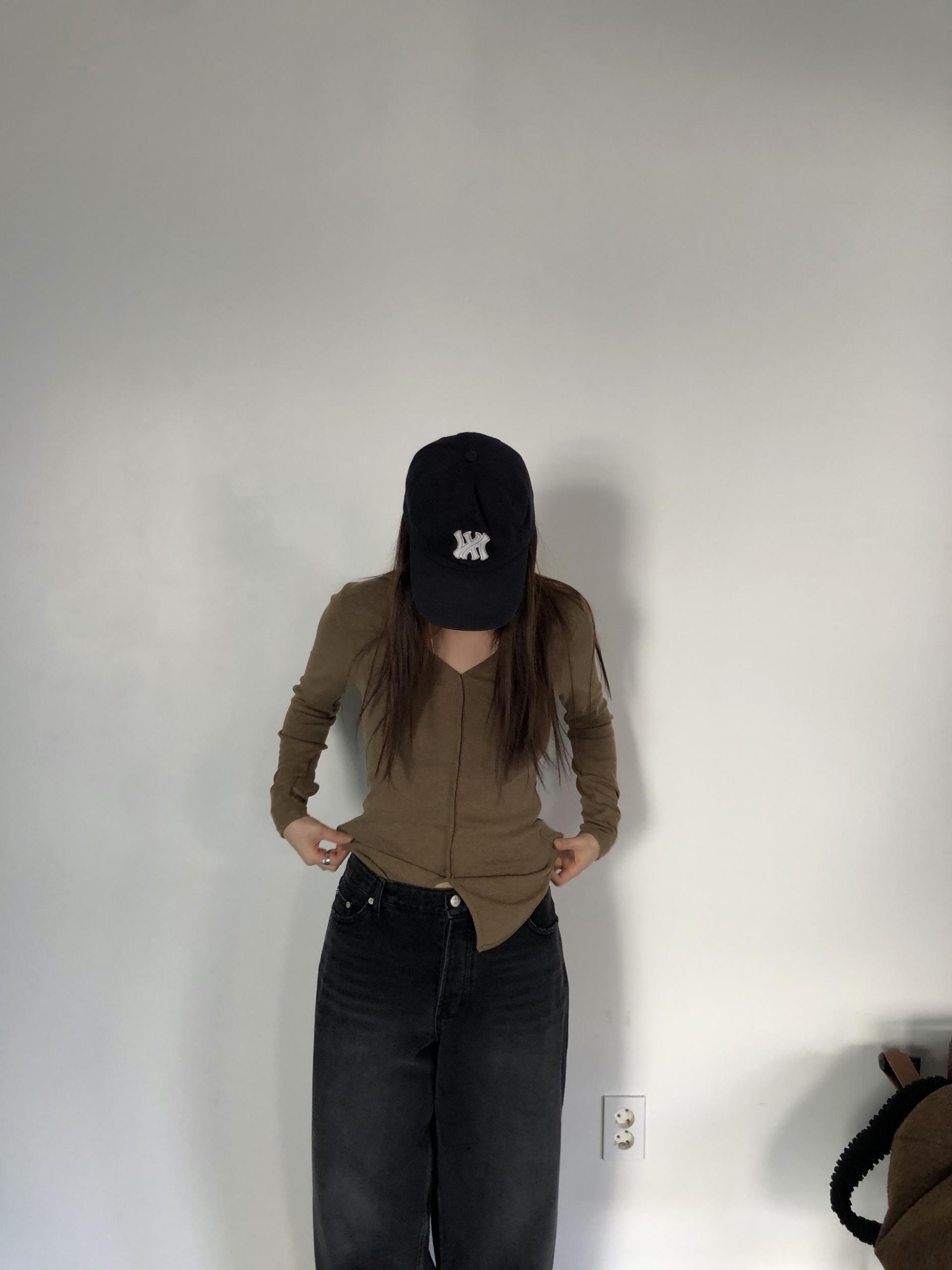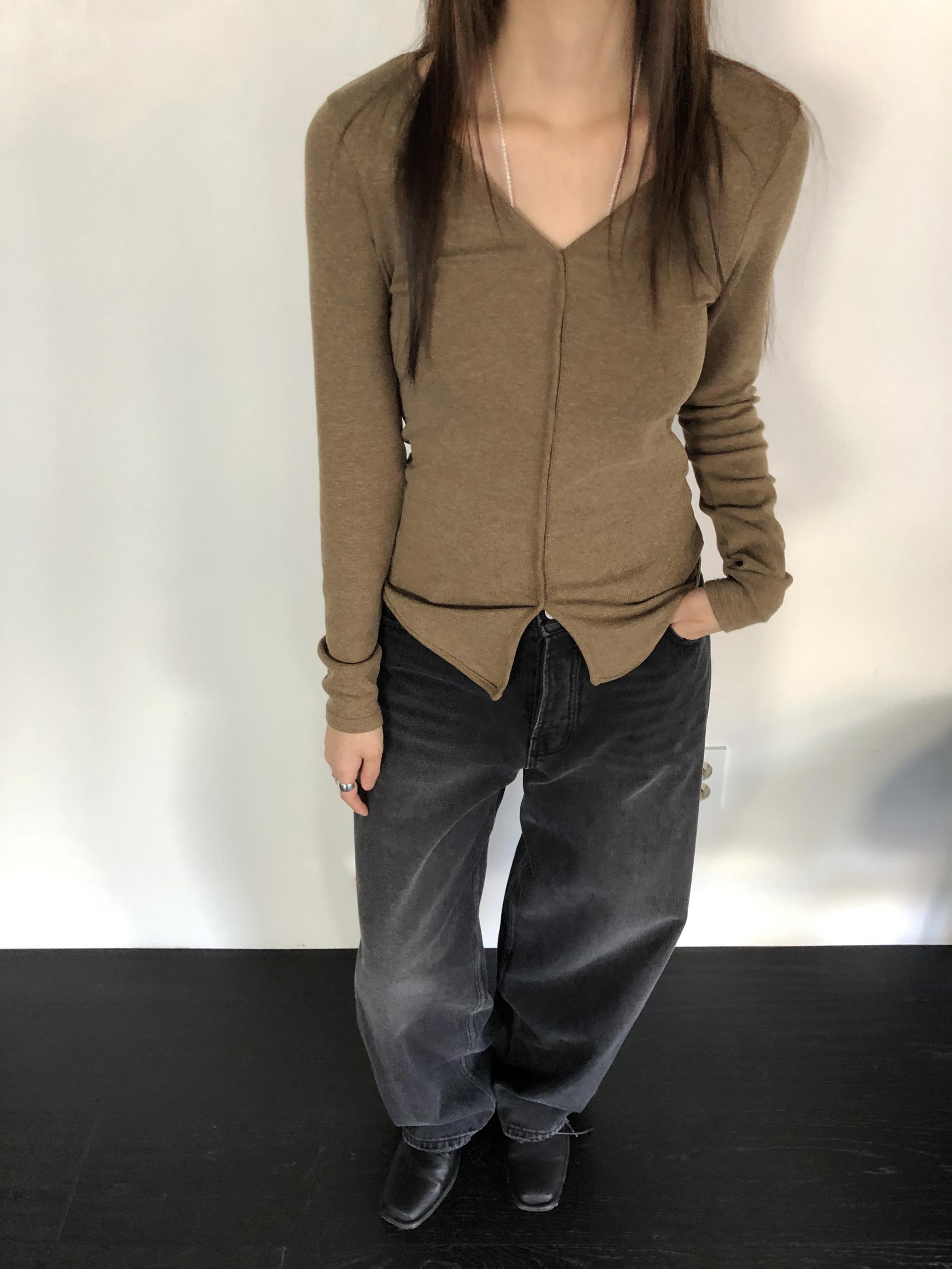 과하지 않은 브이 네크라인으로 헤비한 아우터를 걸쳐도 답답해 보이지 않게 균형을 잡아주고, 목선과 쇄골 라인을 자연스럽게 드러냅니다.