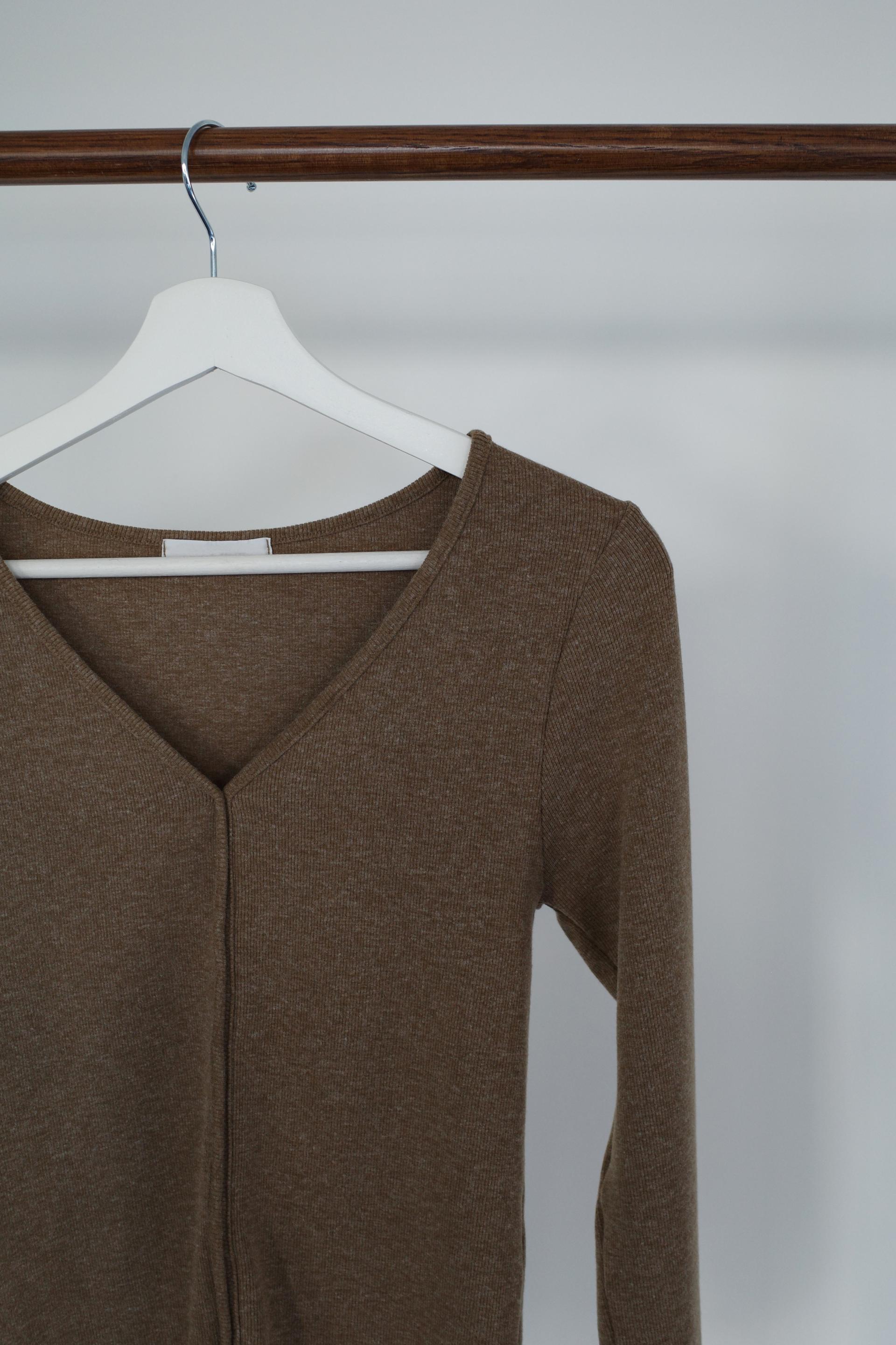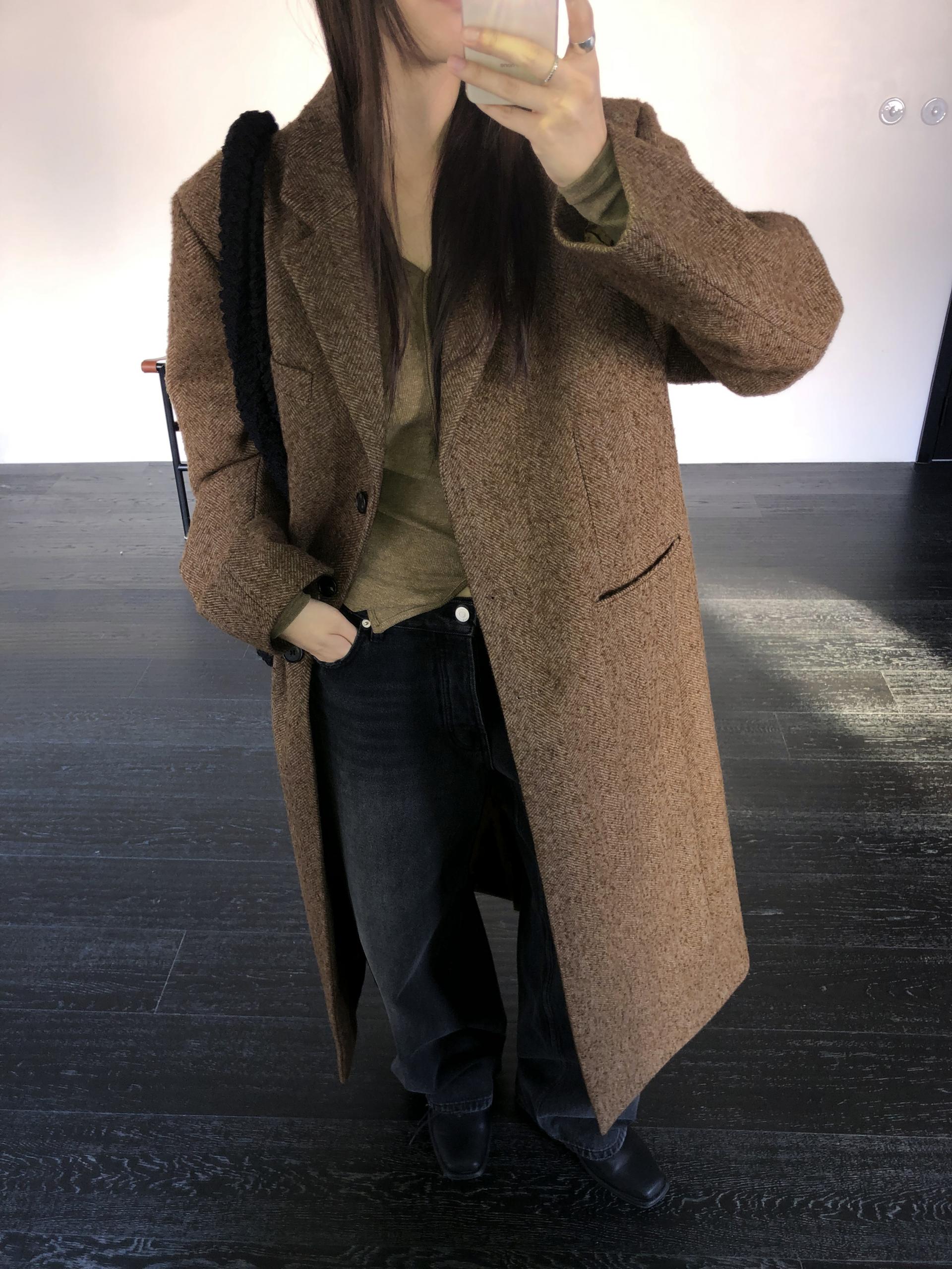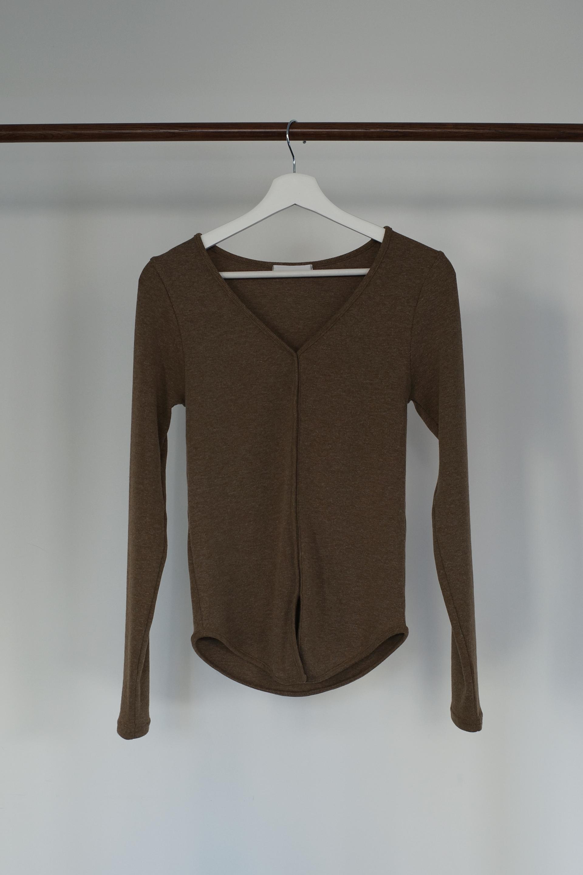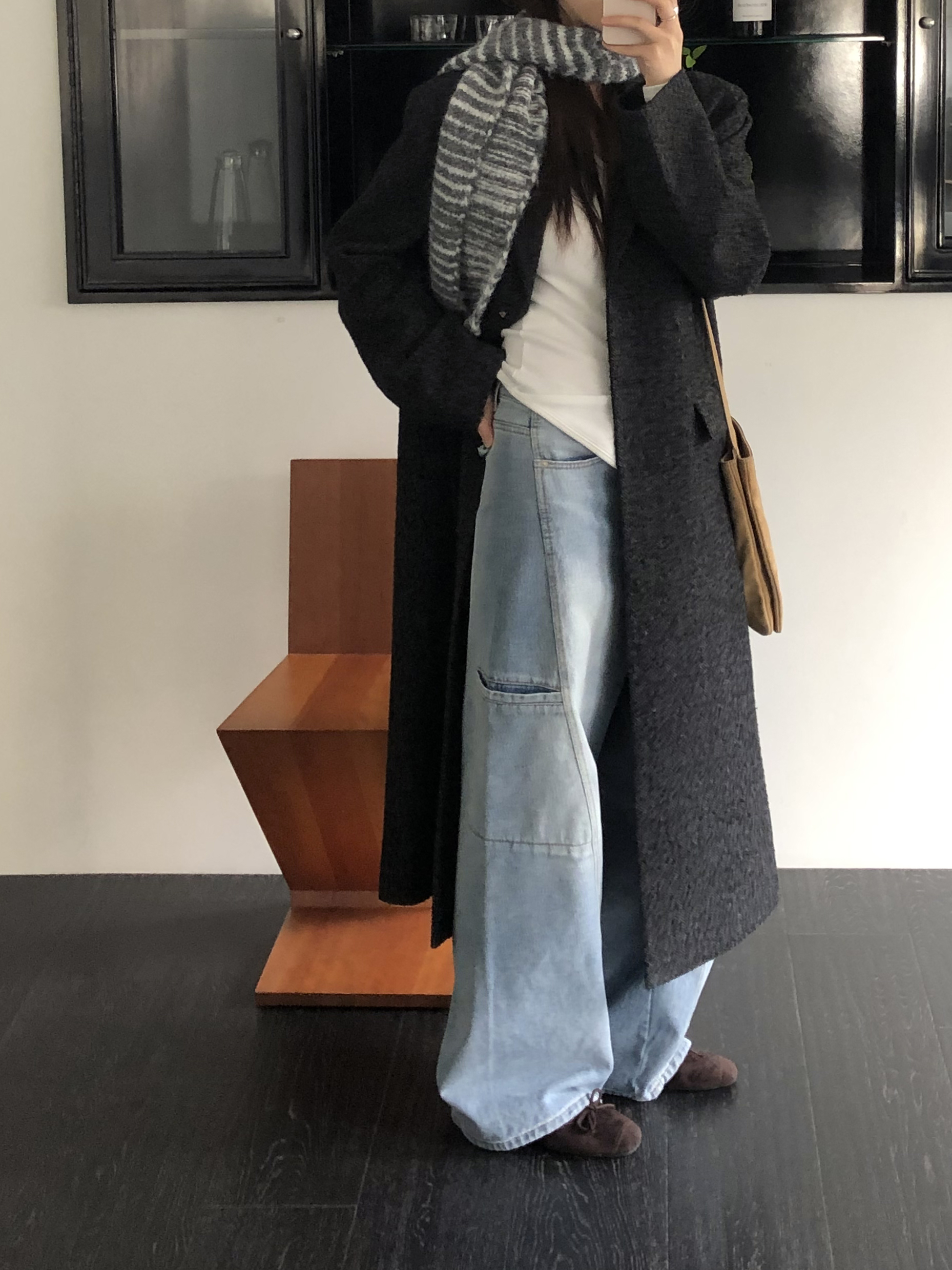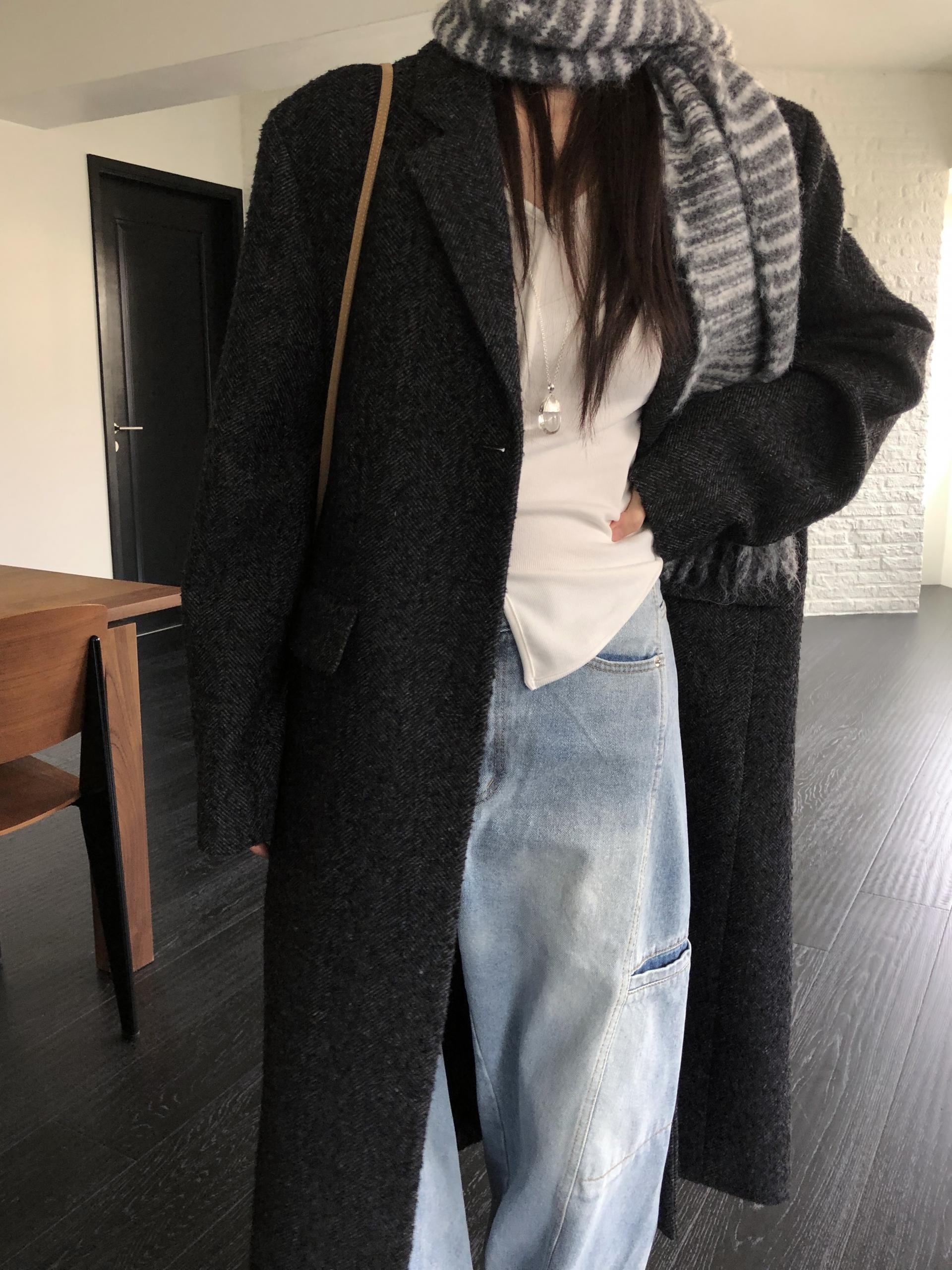 과하지 않은 브이 네크라인으로 헤비한 아우터를 걸쳐도 답답해 보이지 않게 균형을 잡아주고, 목선과 쇄골 라인을 자연스럽게 드러냅니다.